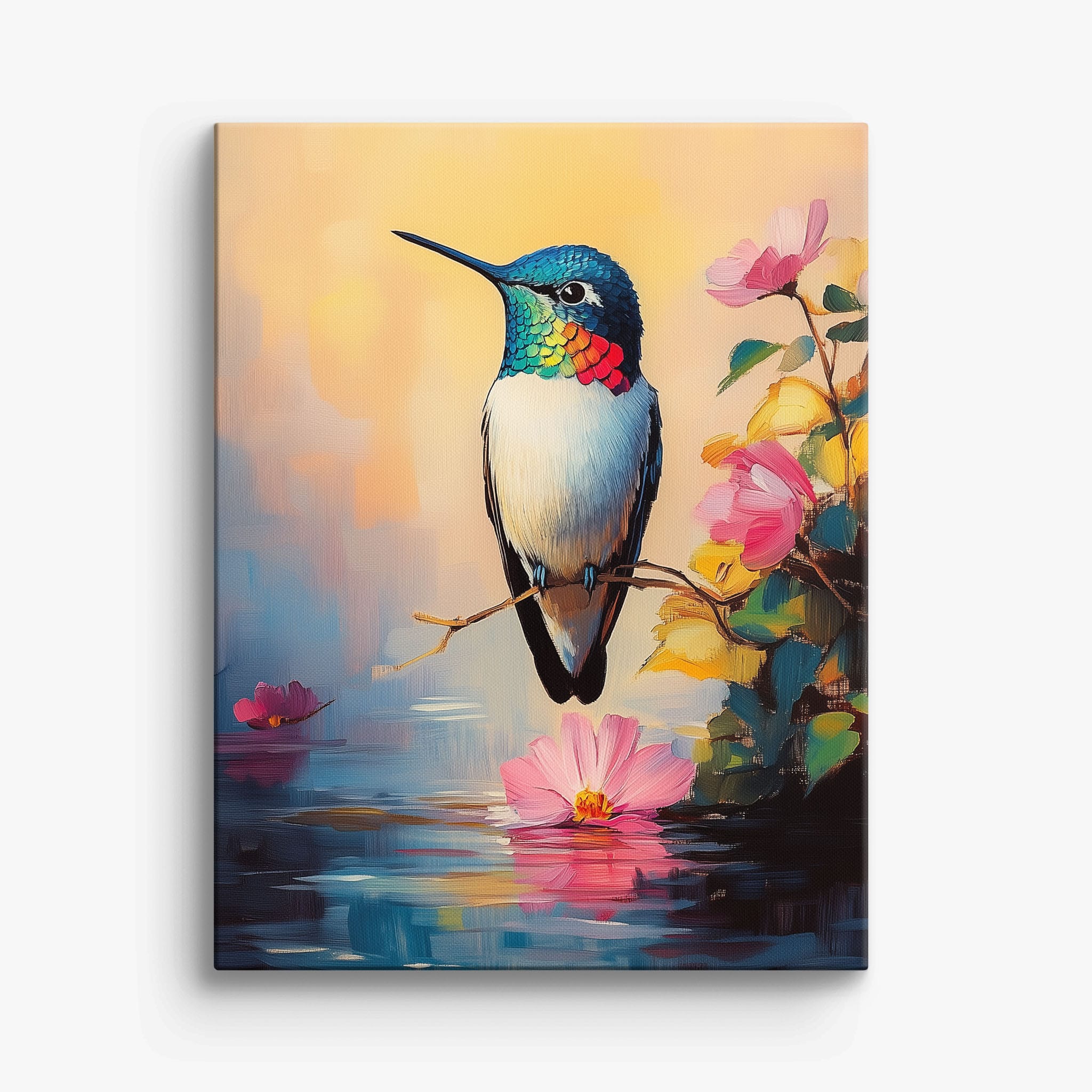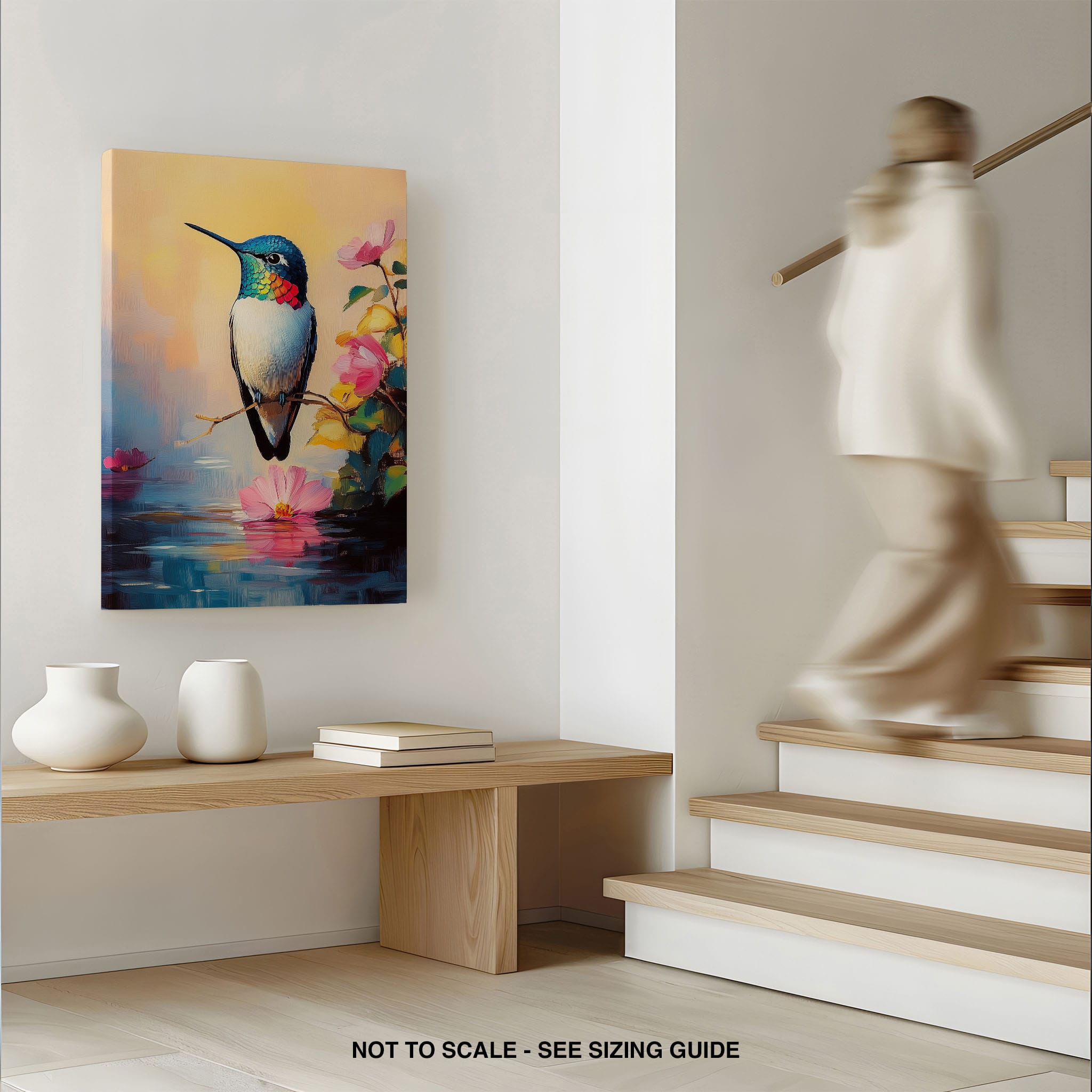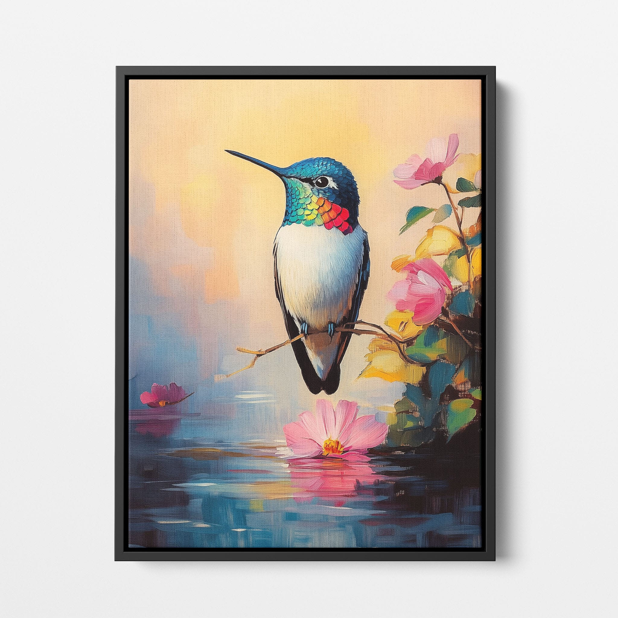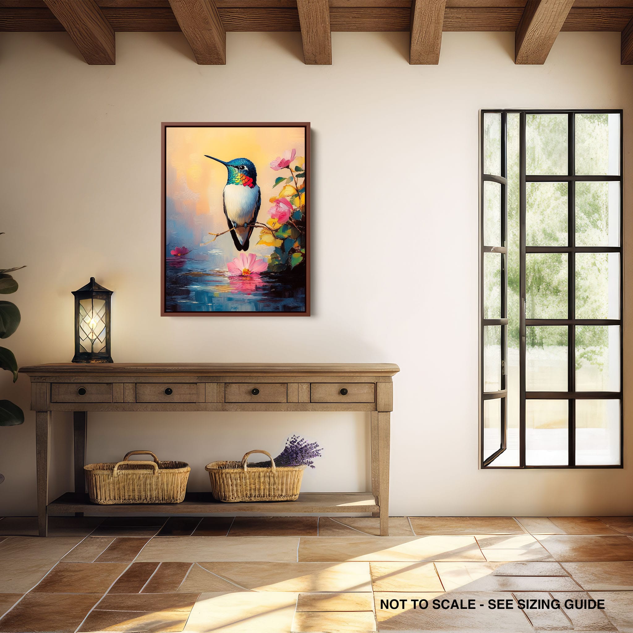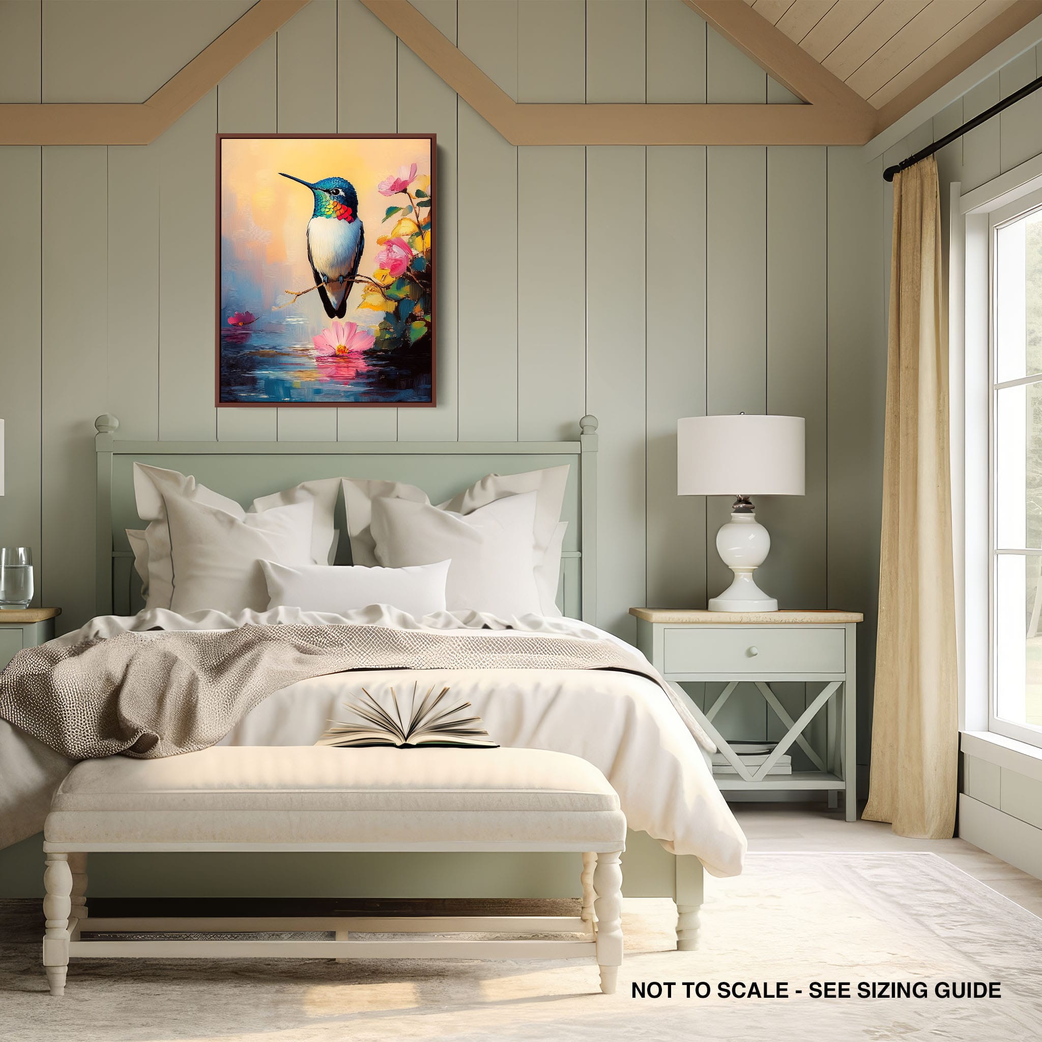 This enchanting digital illustration captures the vibrant essence of a hummingbird gracefully perched amongst blooming flowers. The artwork’s dynamic use of colors, from the iridescent feathers to the vivid pink flowers, creates a mesmerizing visual spectacle. Ideal for nature enthusiasts and art collectors alike, it blends the precision of digital artistry with the charm of impressionistic influences, giving it a timeless appeal. Add a touch of natural beauty and tranquility to any space with this striking piece that celebrates the harmony of wildlife and flora. Perfect for enhancing modern or classic decor, it’s a testament to the elegance of the natural world captured through innovative digital techniques.