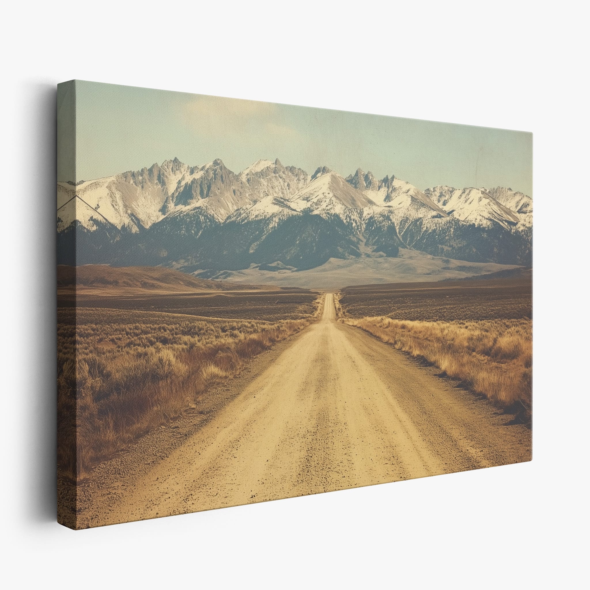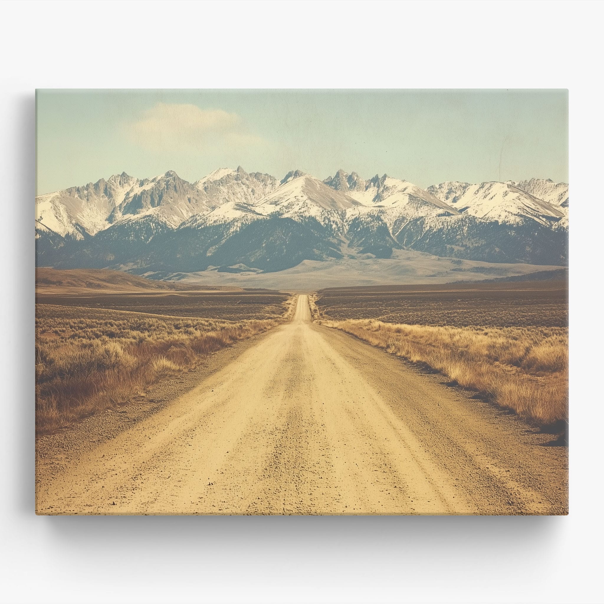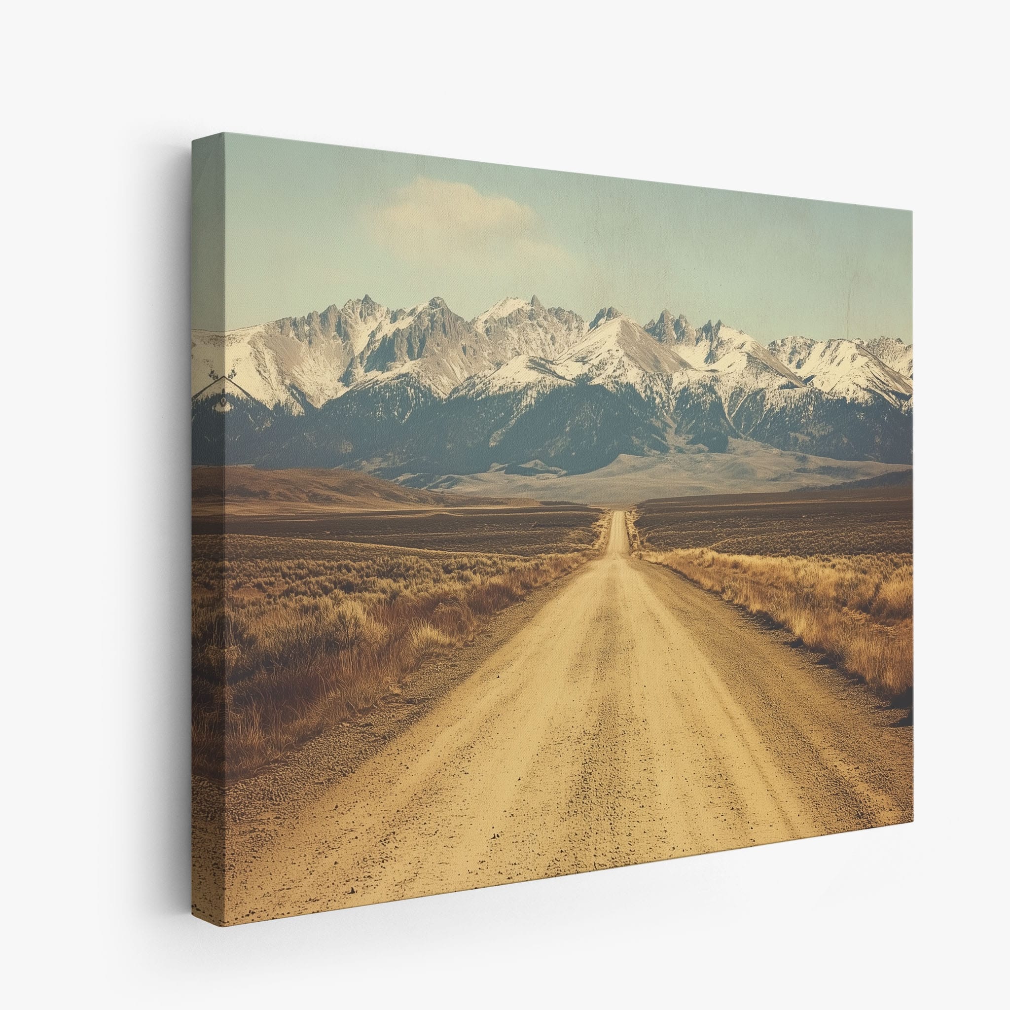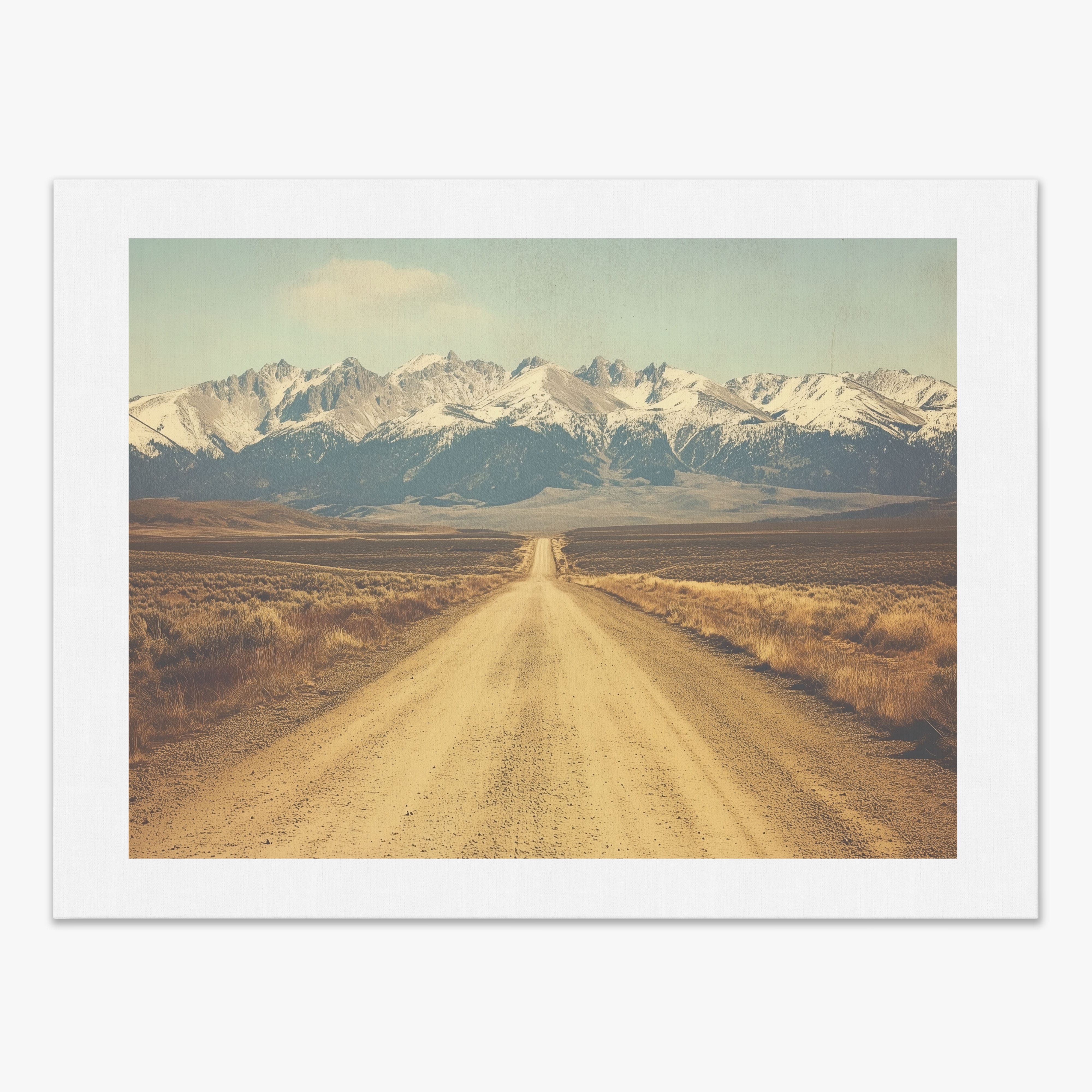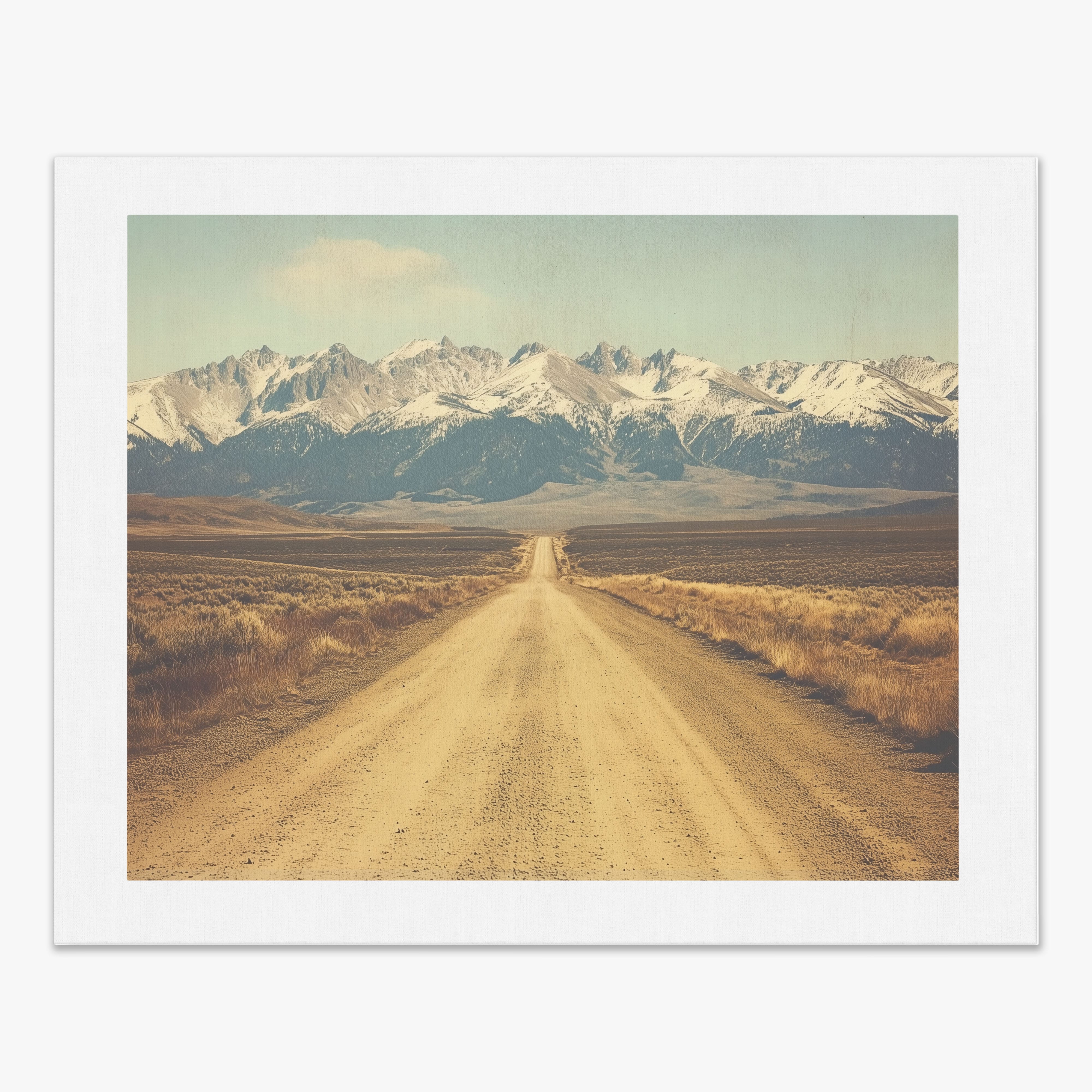 A captivating vintage photograph of a dirt road stretches endlessly toward a majestic mountain range, capturing the spirit of freedom and adventure. The muted earthy tones and the subtle grainy texture evoke a nostalgic feel, inviting viewers to ponder life's journey against the backdrop of sprawling natural beauty. This minimalistic landscape artwork is ideal for those seeking to add a touch of vintage charm and wide-open tranquility to their space. Perfect for rustic or modern interiors, this piece provides a serene yet inspiring focal point.