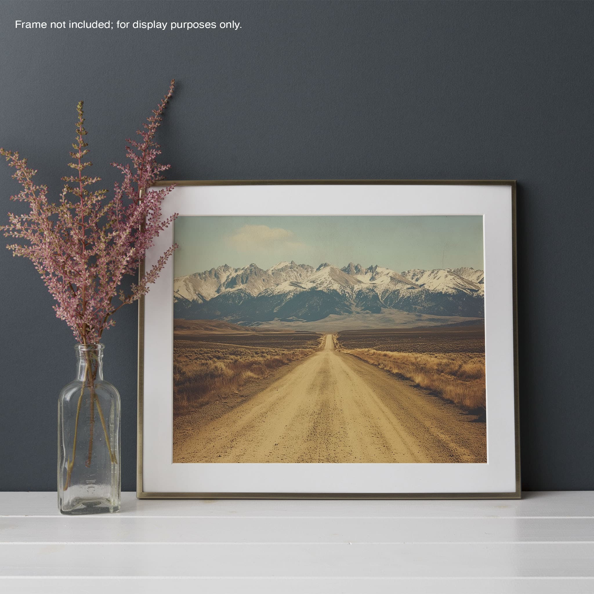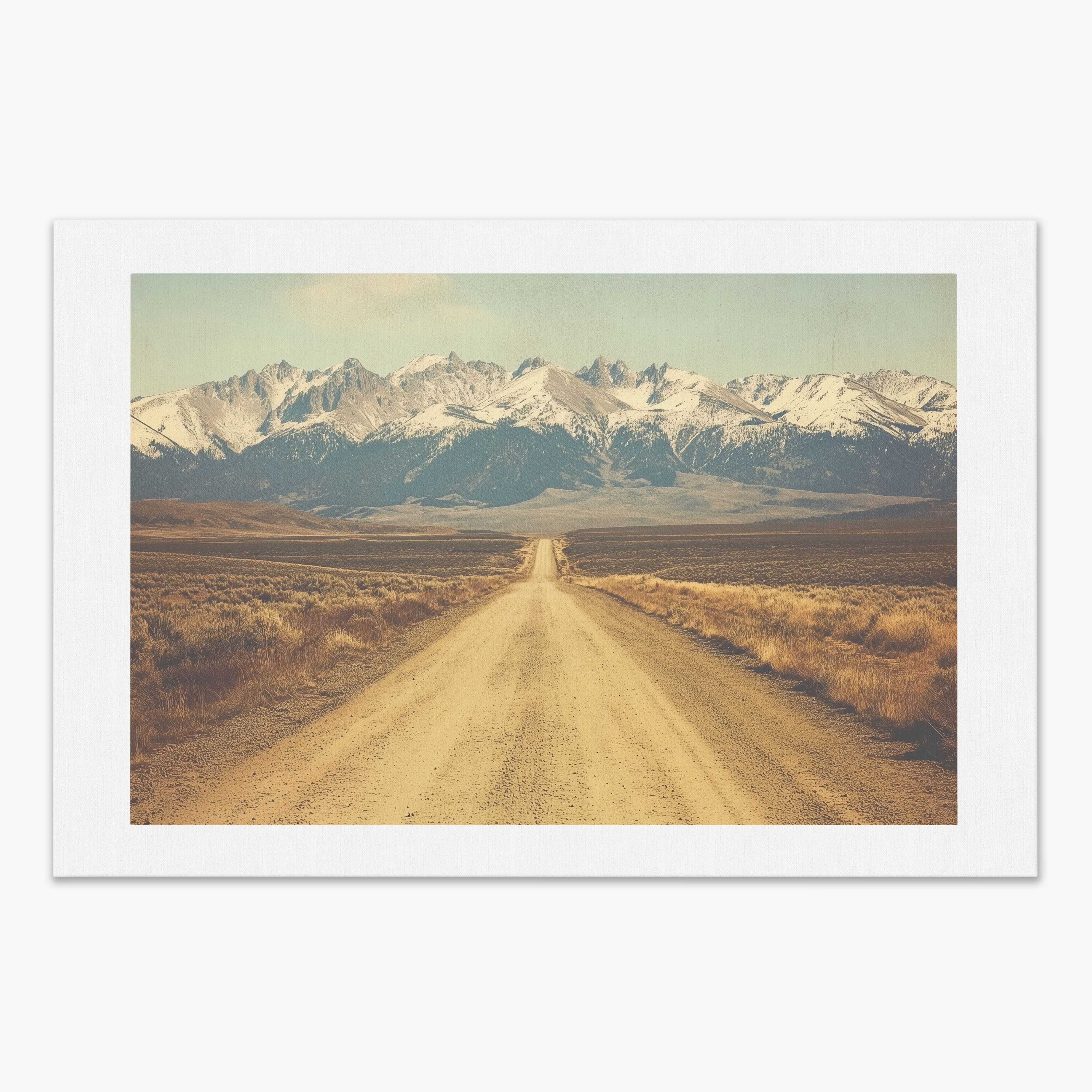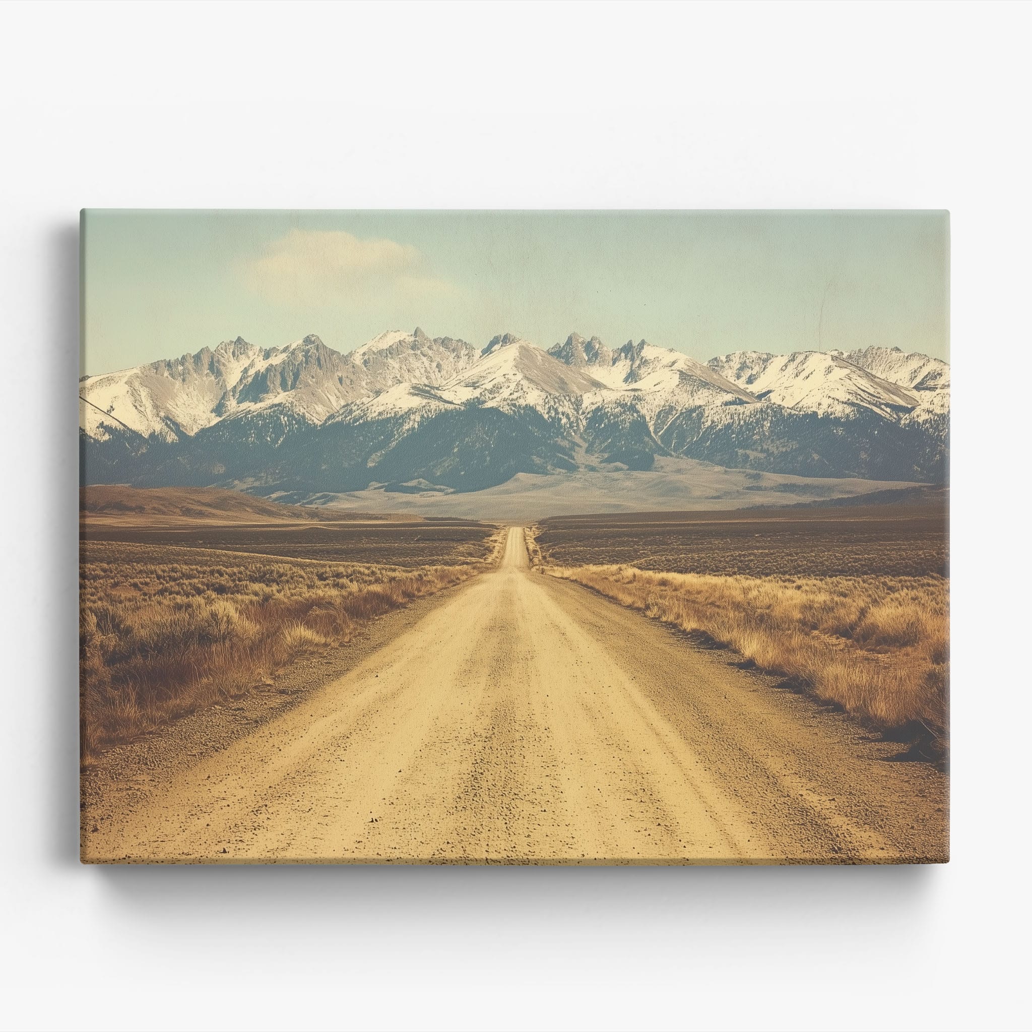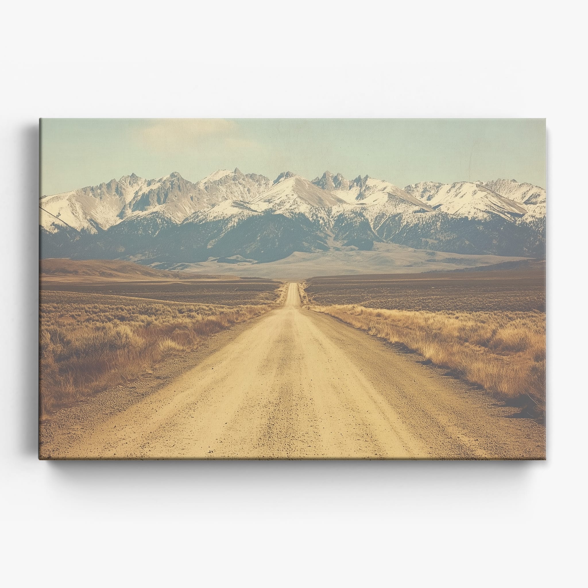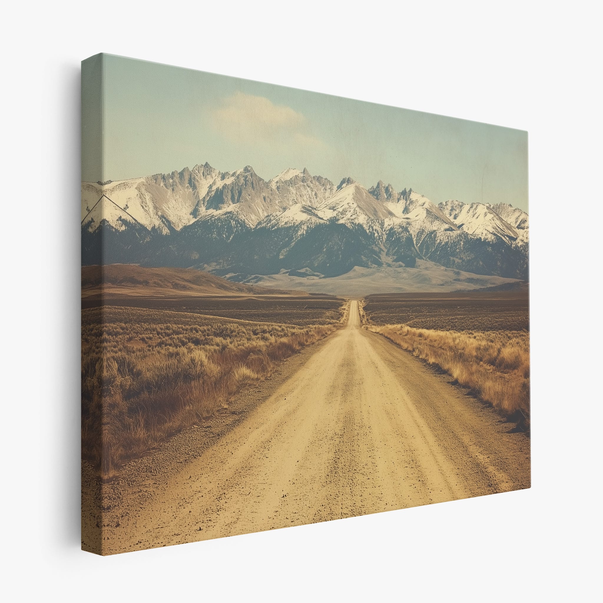 A captivating vintage photograph of a dirt road stretches endlessly toward a majestic mountain range, capturing the spirit of freedom and adventure. The muted earthy tones and the subtle grainy texture evoke a nostalgic feel, inviting viewers to ponder life's journey against the backdrop of sprawling natural beauty. This minimalistic landscape artwork is ideal for those seeking to add a touch of vintage charm and wide-open tranquility to their space. Perfect for rustic or modern interiors, this piece provides a serene yet inspiring focal point.