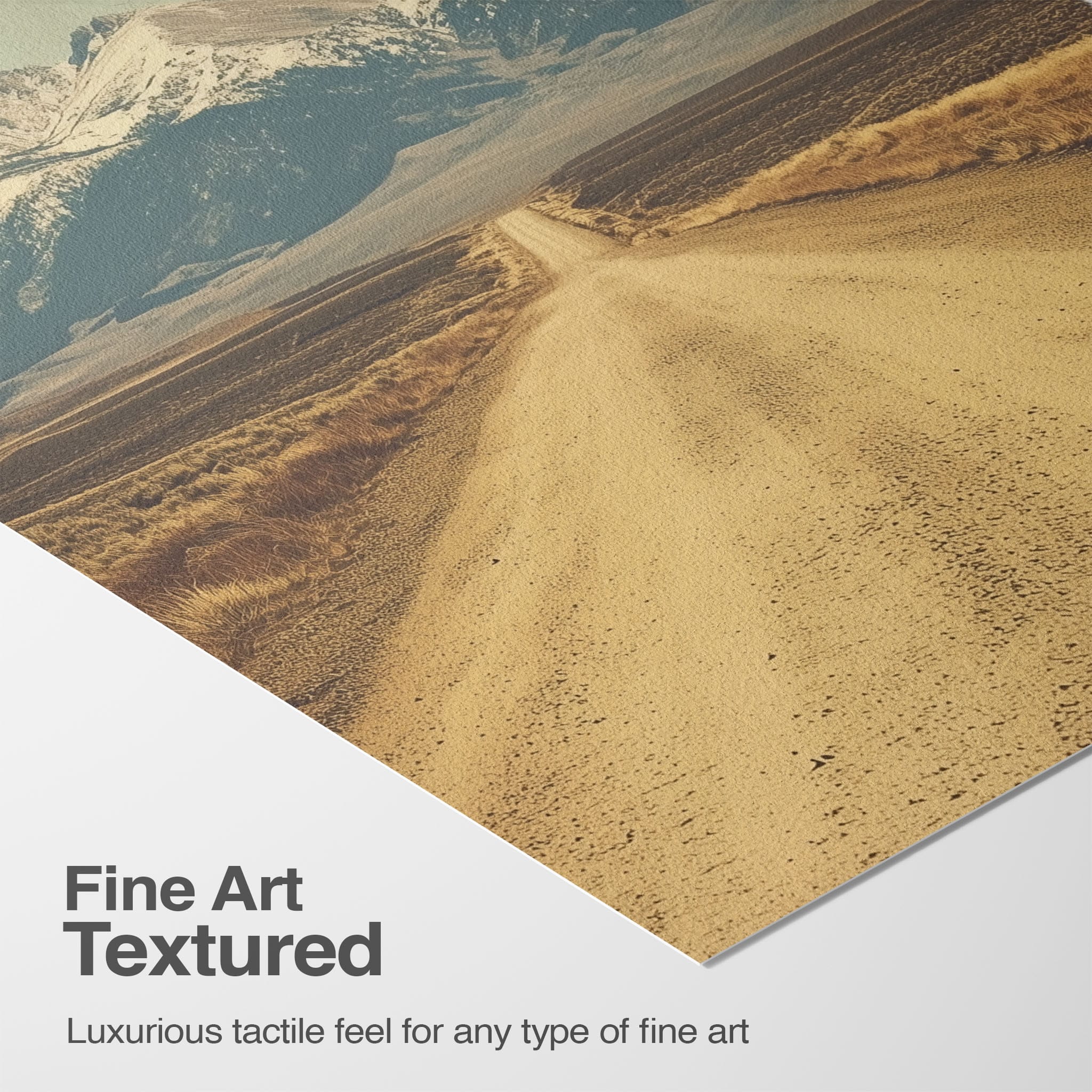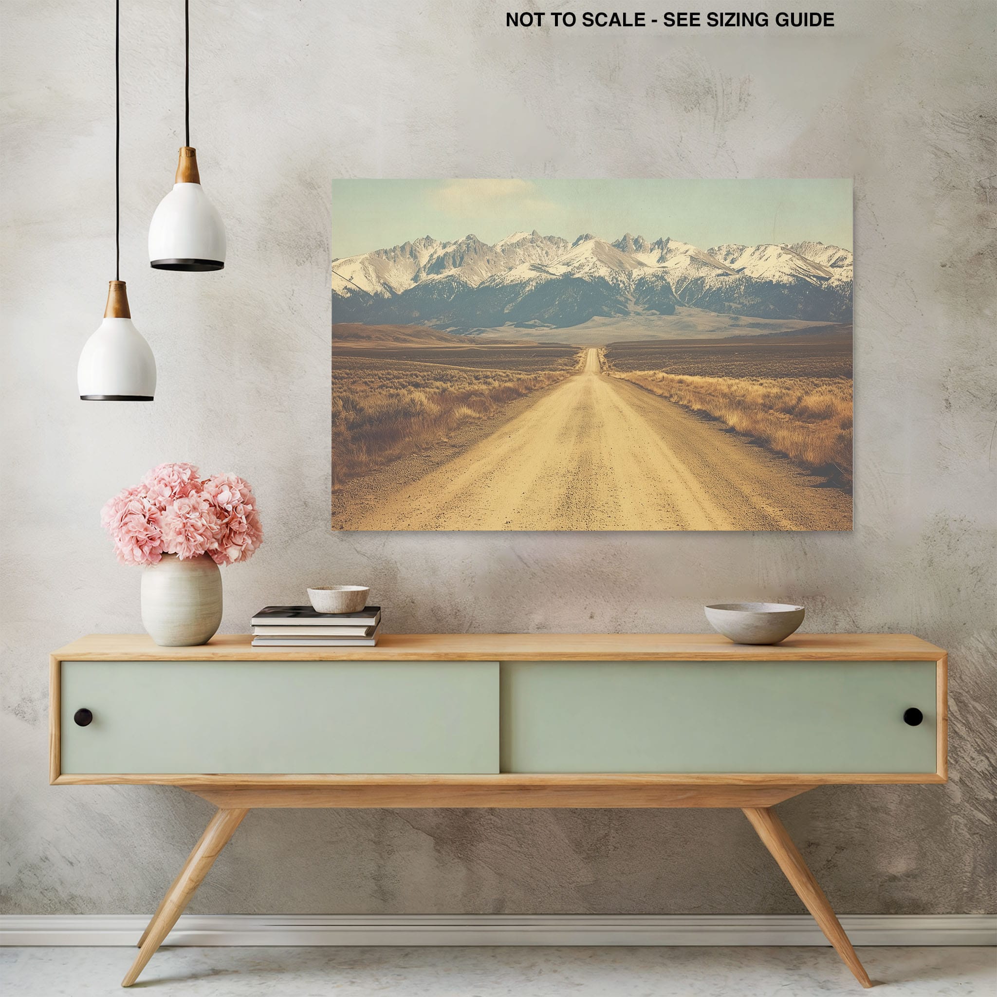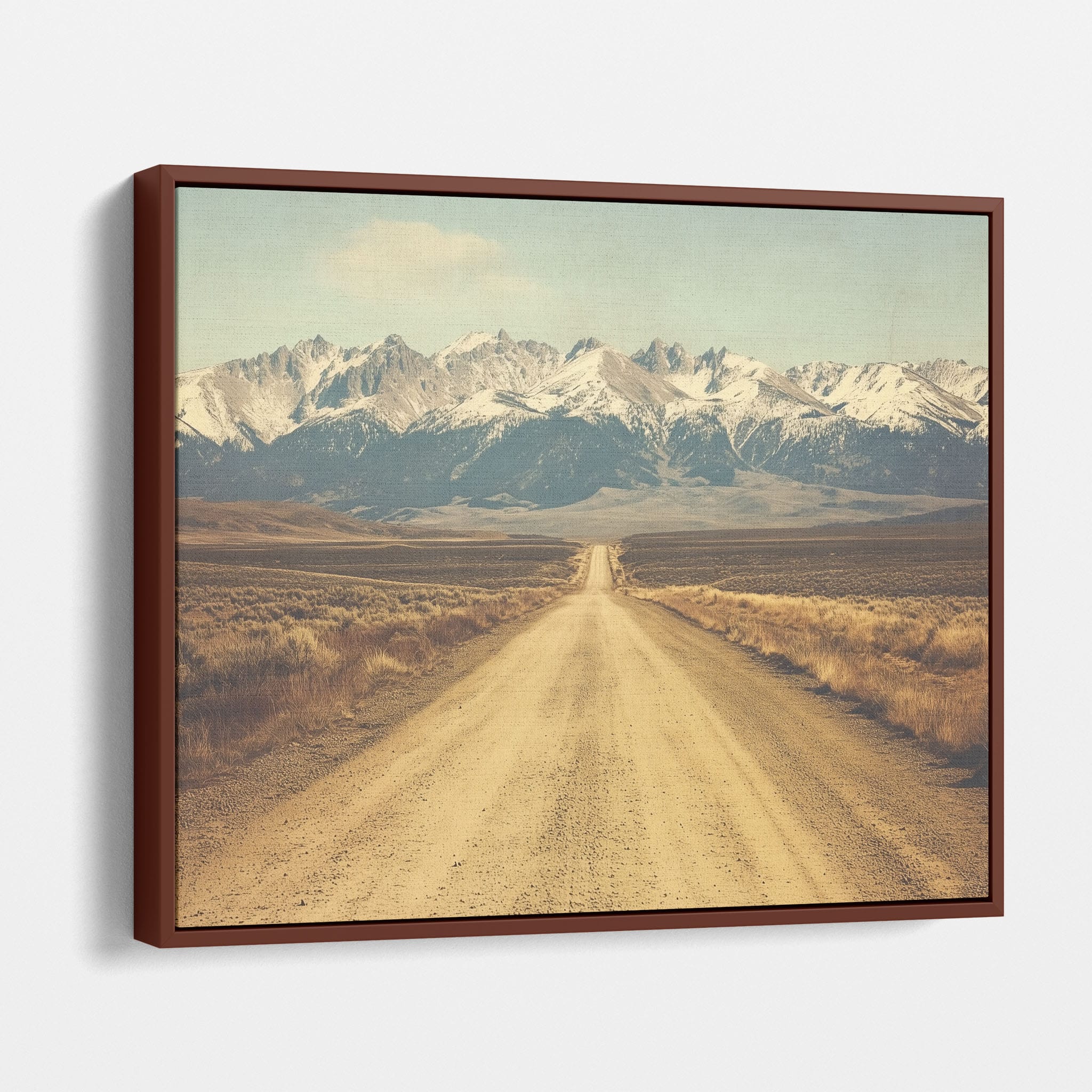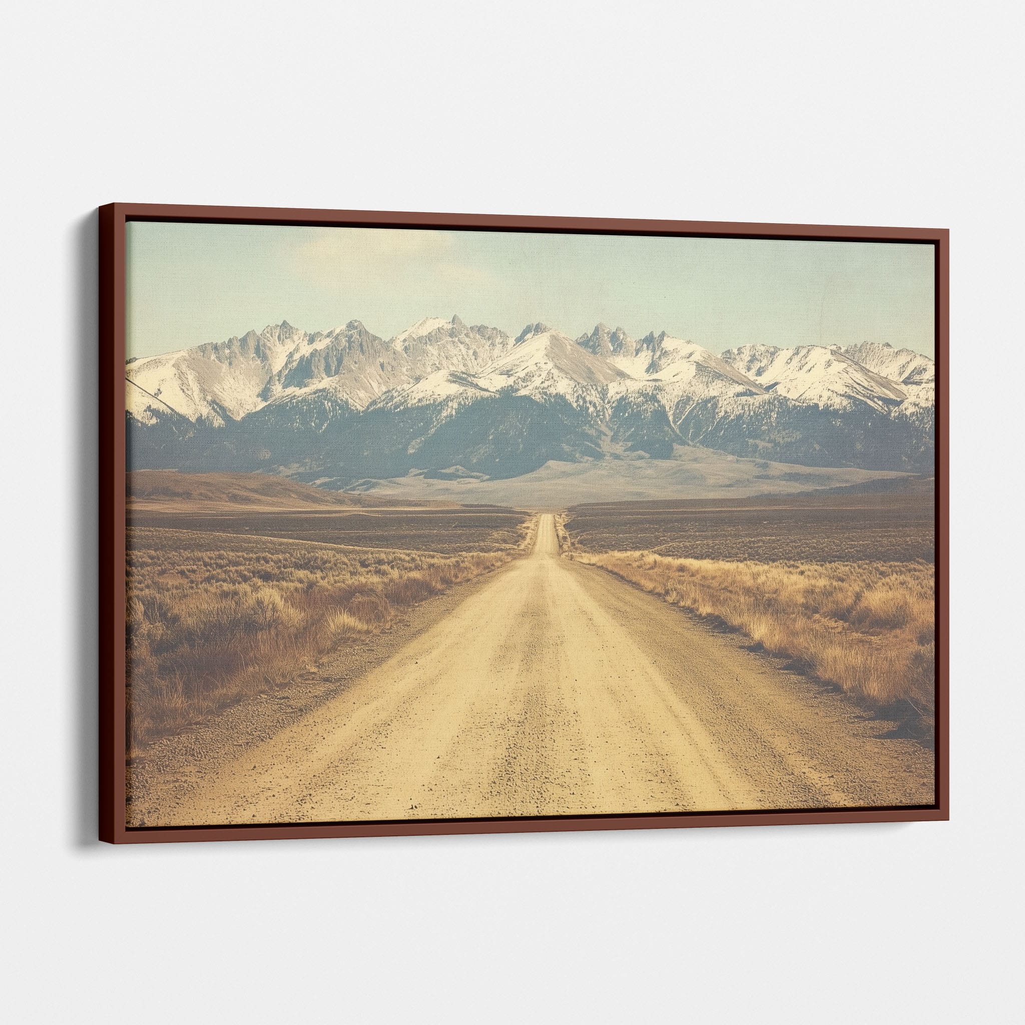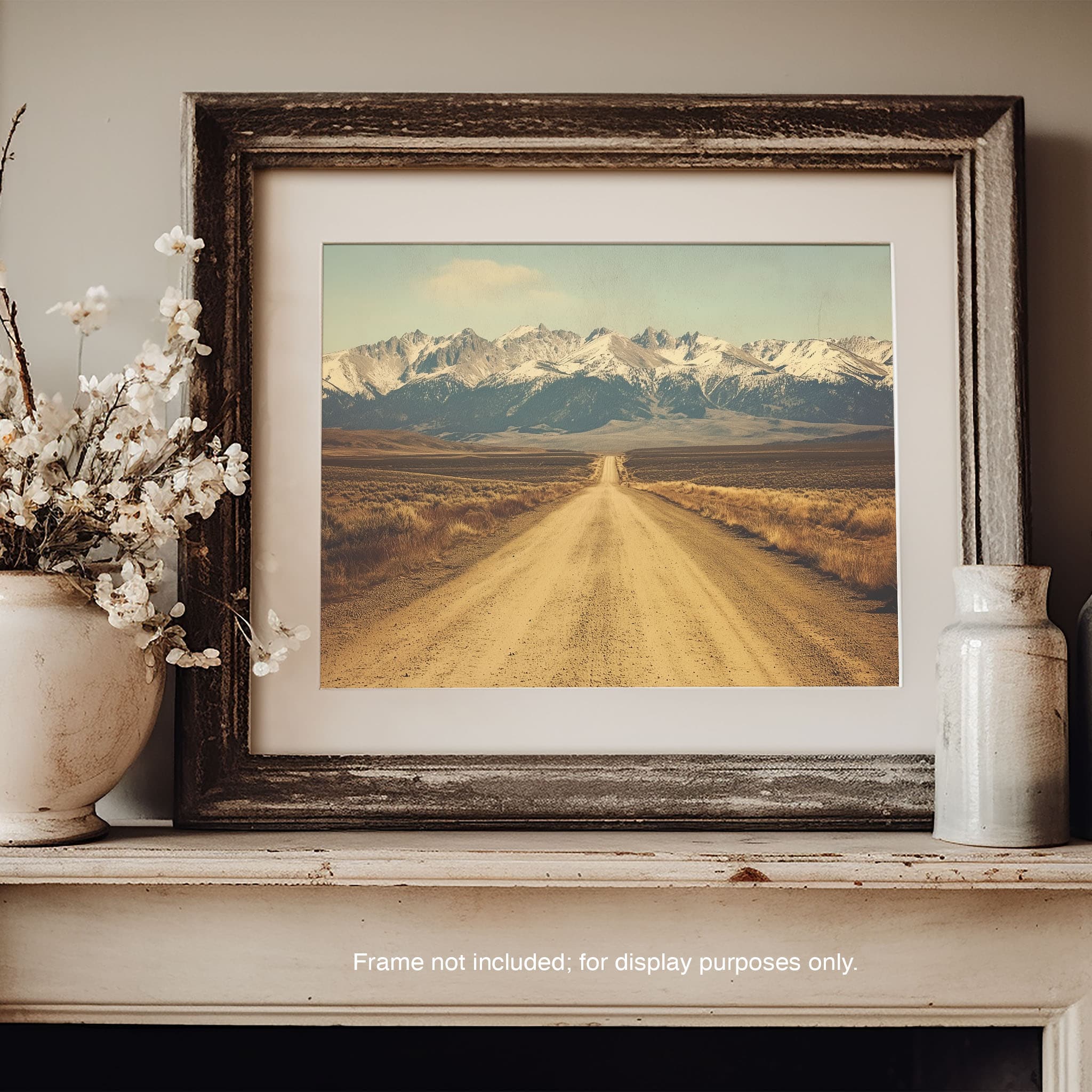 A captivating vintage photograph of a dirt road stretches endlessly toward a majestic mountain range, capturing the spirit of freedom and adventure. The muted earthy tones and the subtle grainy texture evoke a nostalgic feel, inviting viewers to ponder life's journey against the backdrop of sprawling natural beauty. This minimalistic landscape artwork is ideal for those seeking to add a touch of vintage charm and wide-open tranquility to their space. Perfect for rustic or modern interiors, this piece provides a serene yet inspiring focal point.