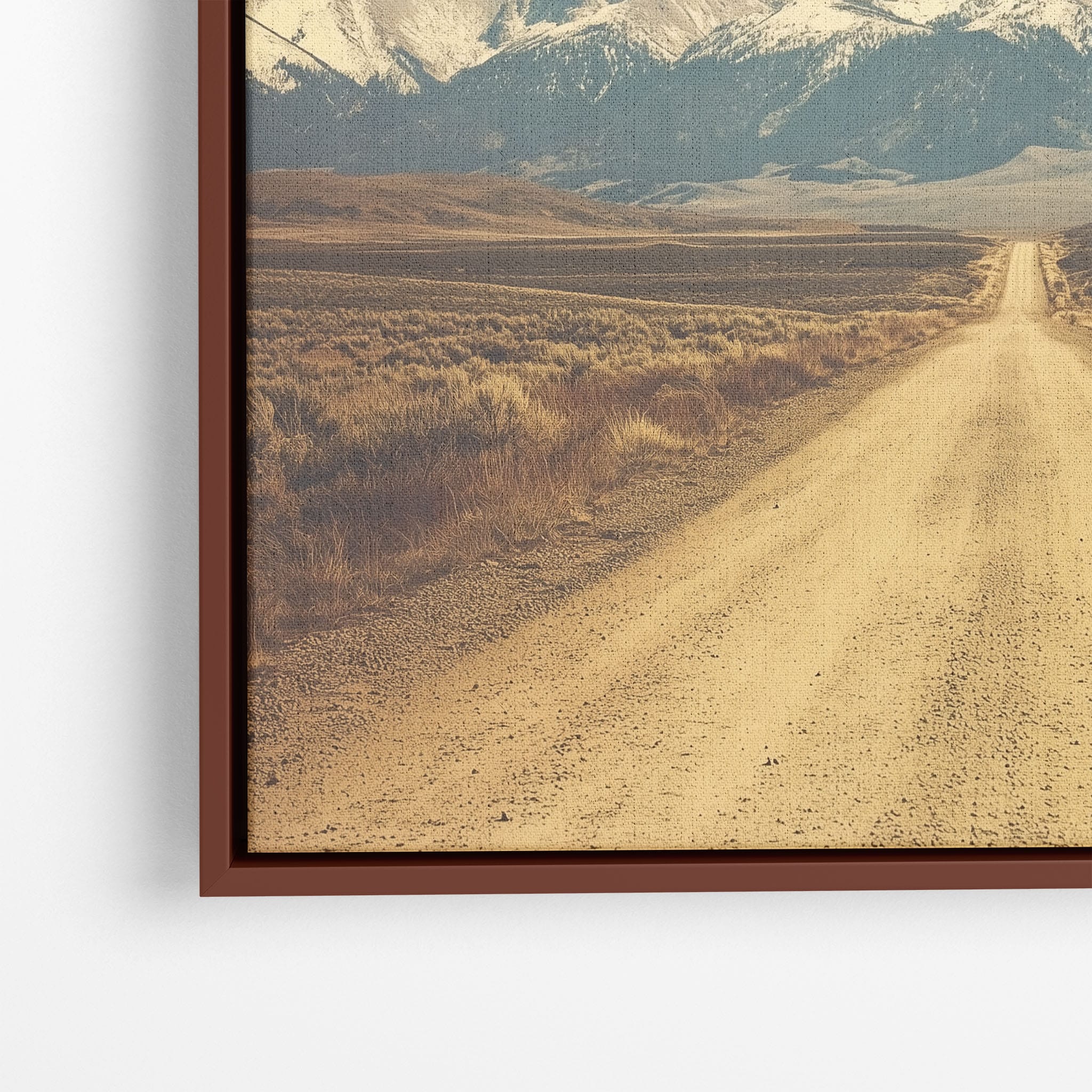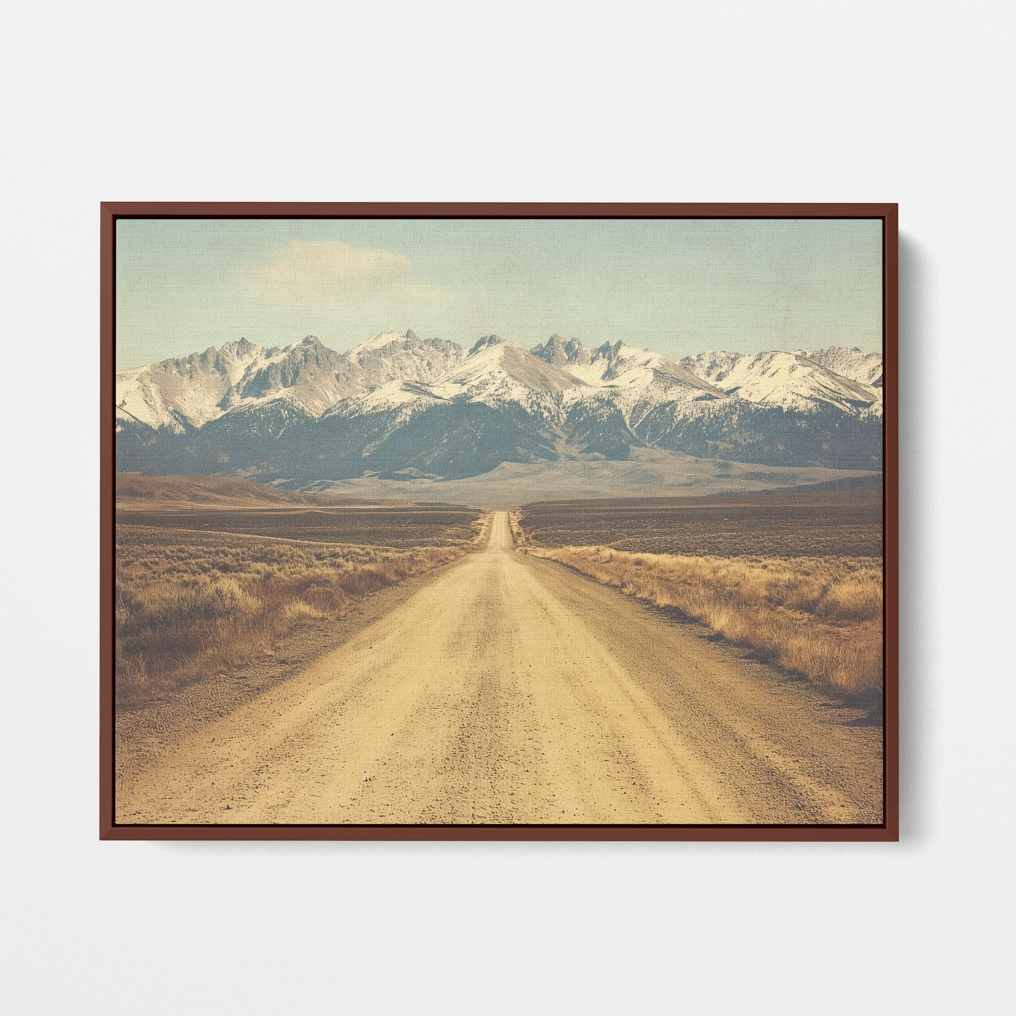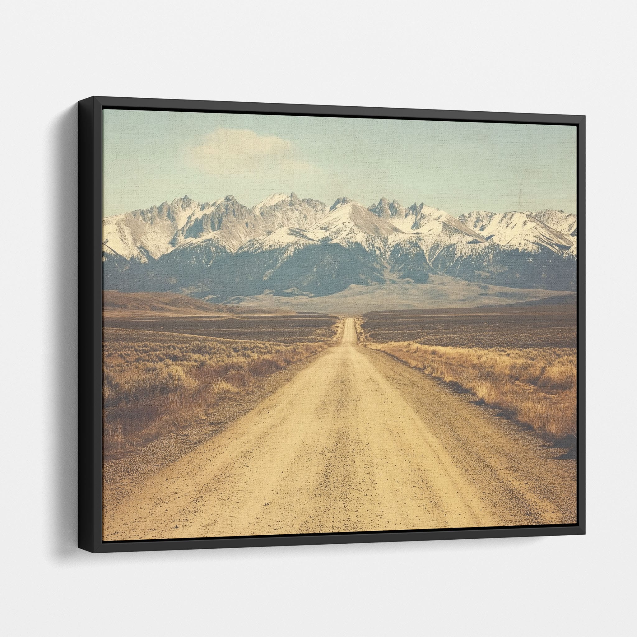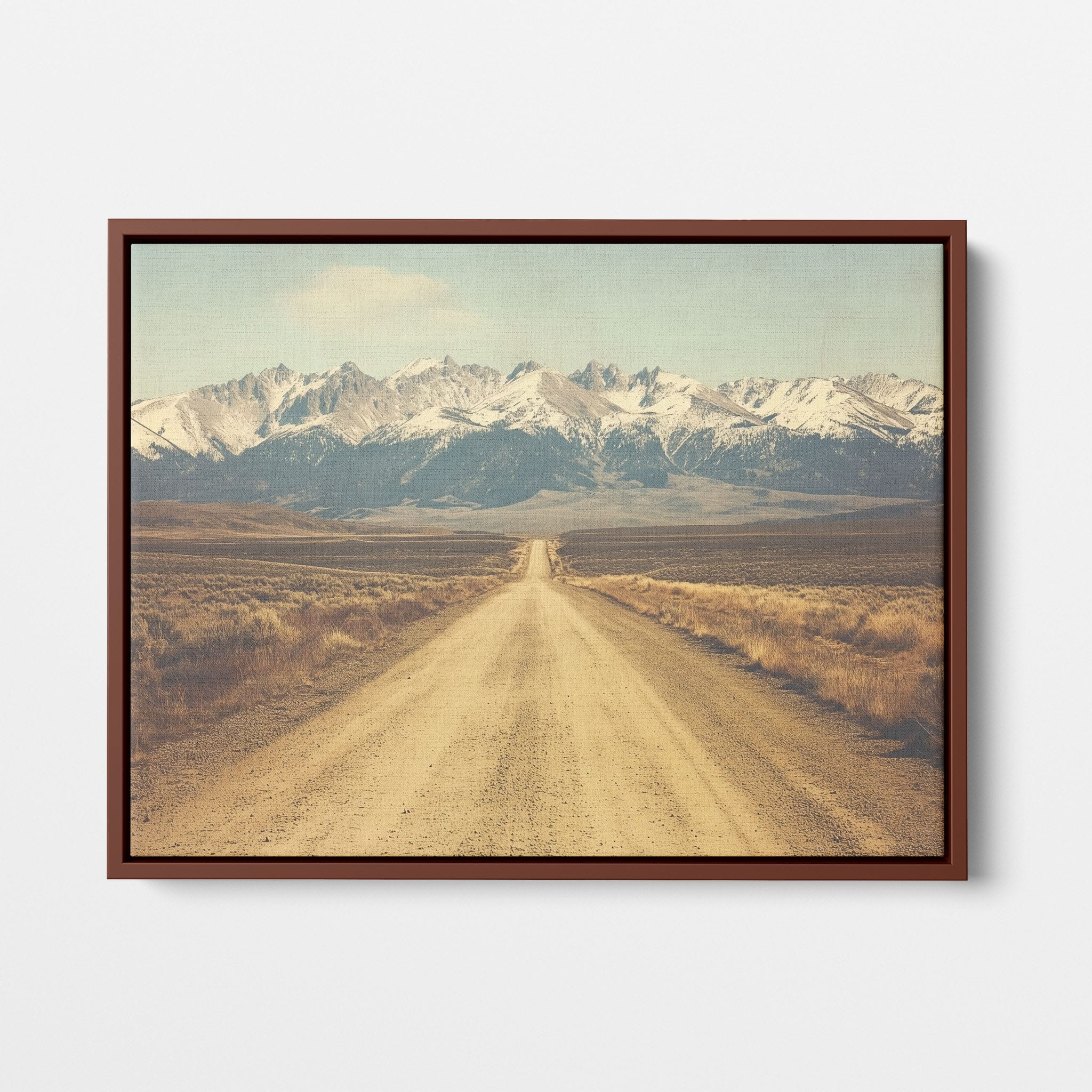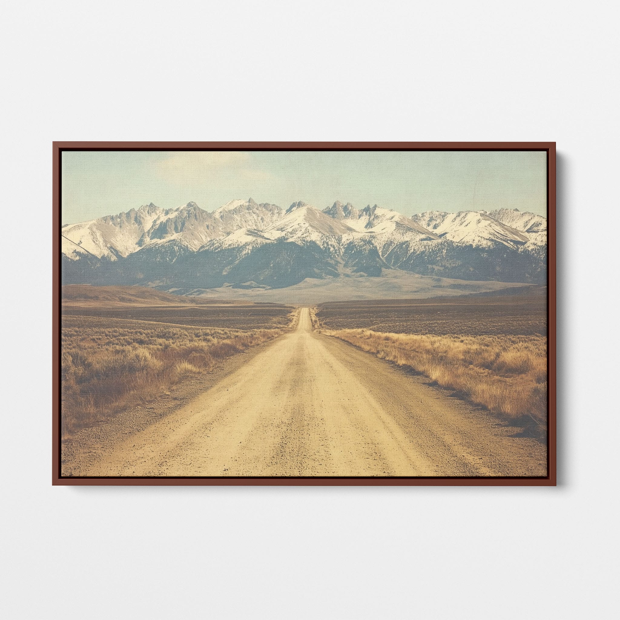 A captivating vintage photograph of a dirt road stretches endlessly toward a majestic mountain range, capturing the spirit of freedom and adventure. The muted earthy tones and the subtle grainy texture evoke a nostalgic feel, inviting viewers to ponder life's journey against the backdrop of sprawling natural beauty. This minimalistic landscape artwork is ideal for those seeking to add a touch of vintage charm and wide-open tranquility to their space. Perfect for rustic or modern interiors, this piece provides a serene yet inspiring focal point.