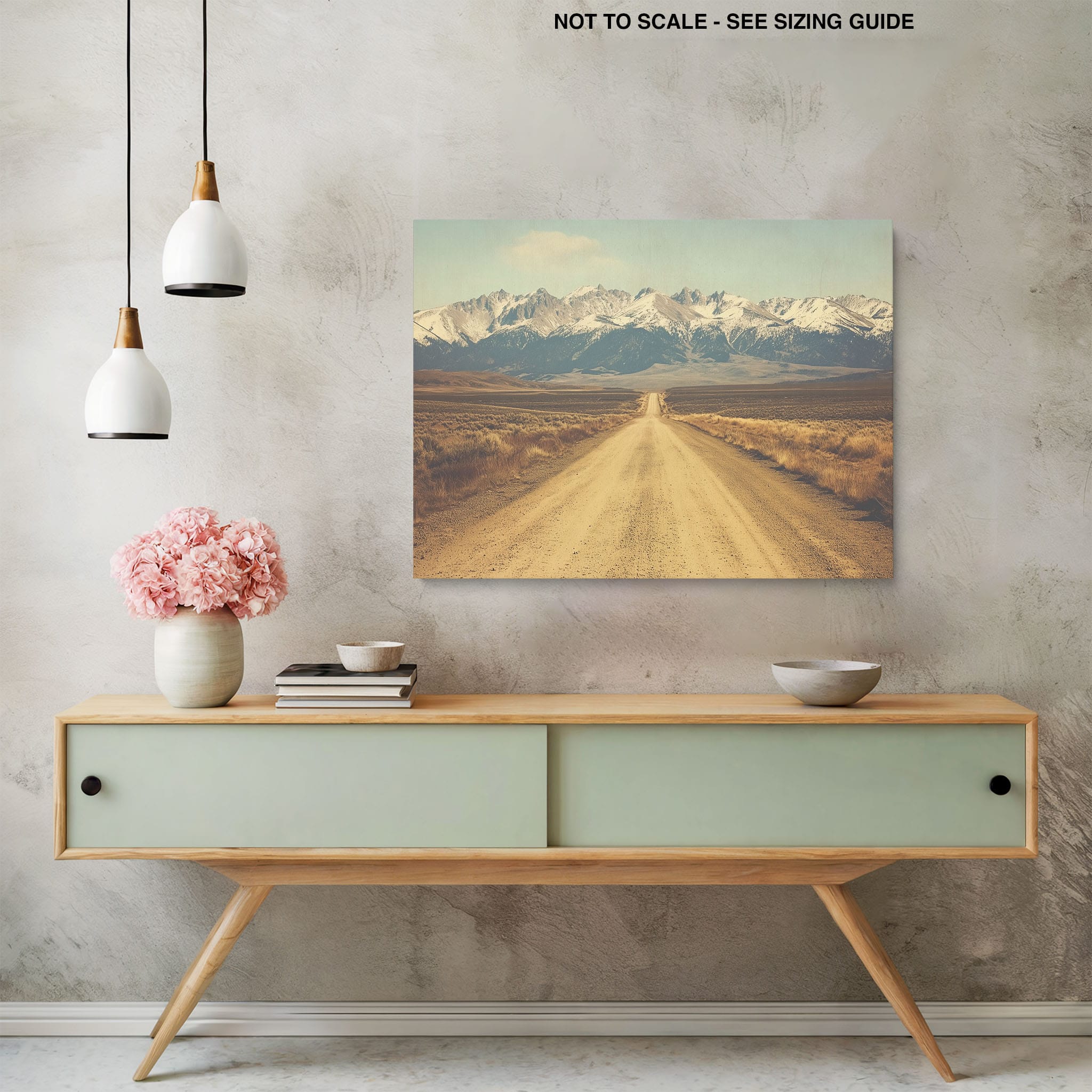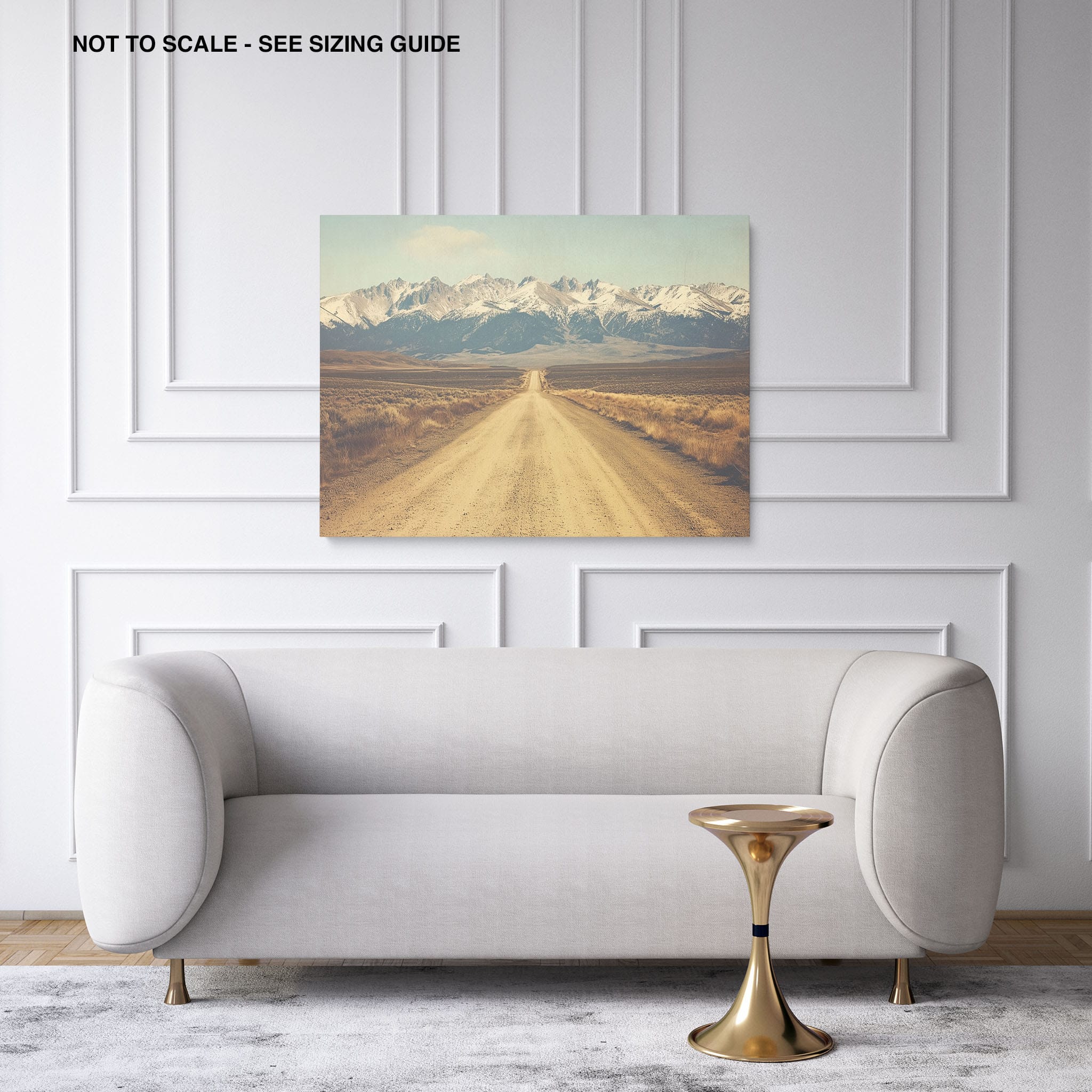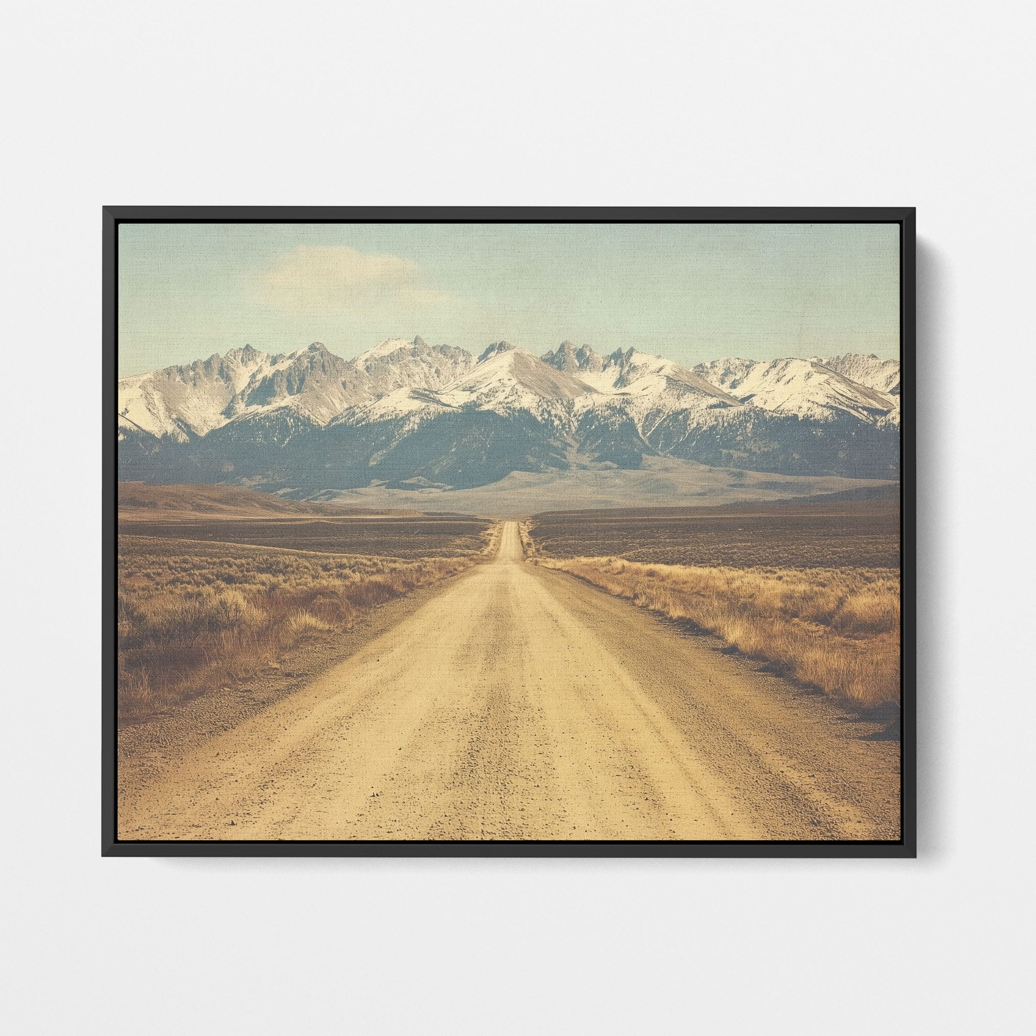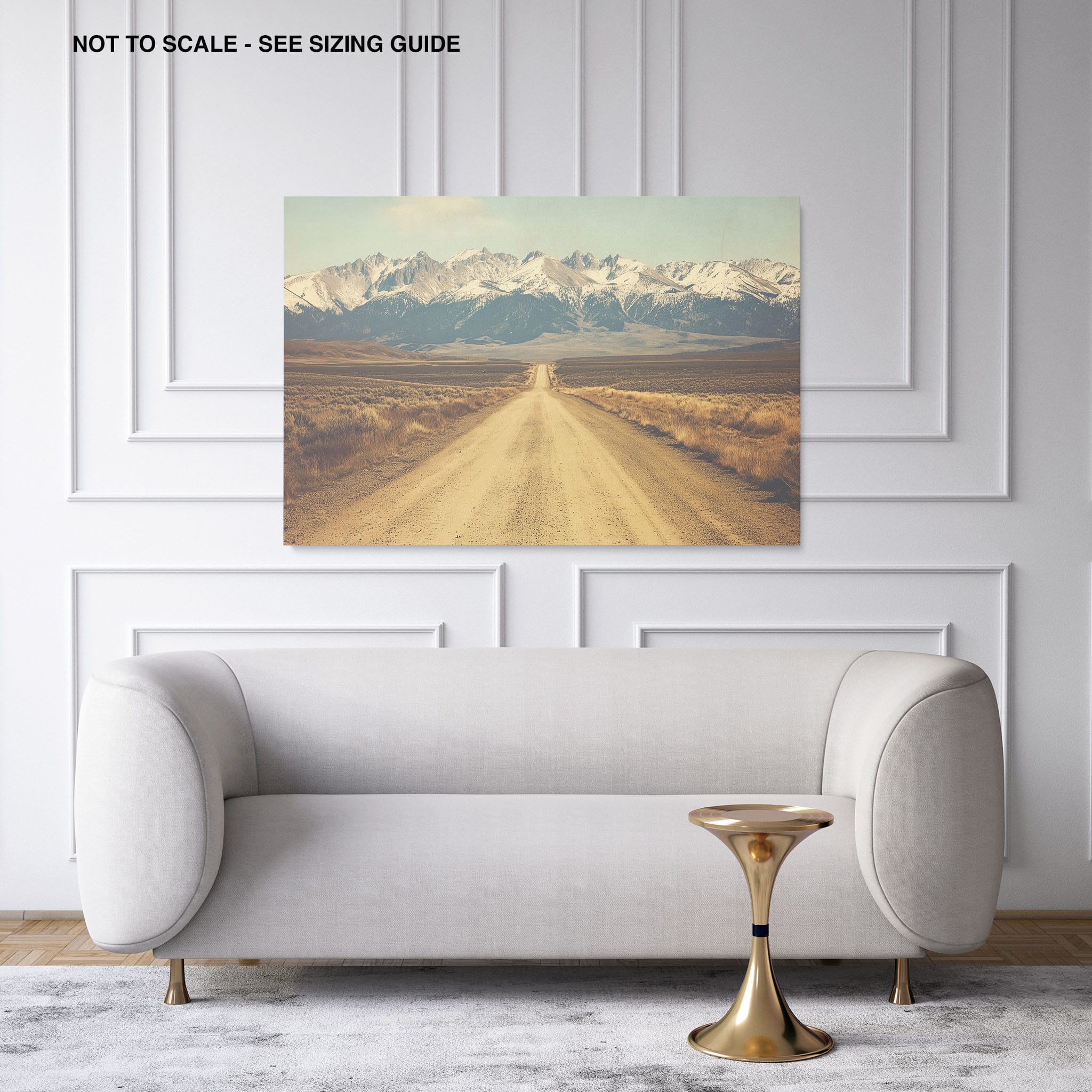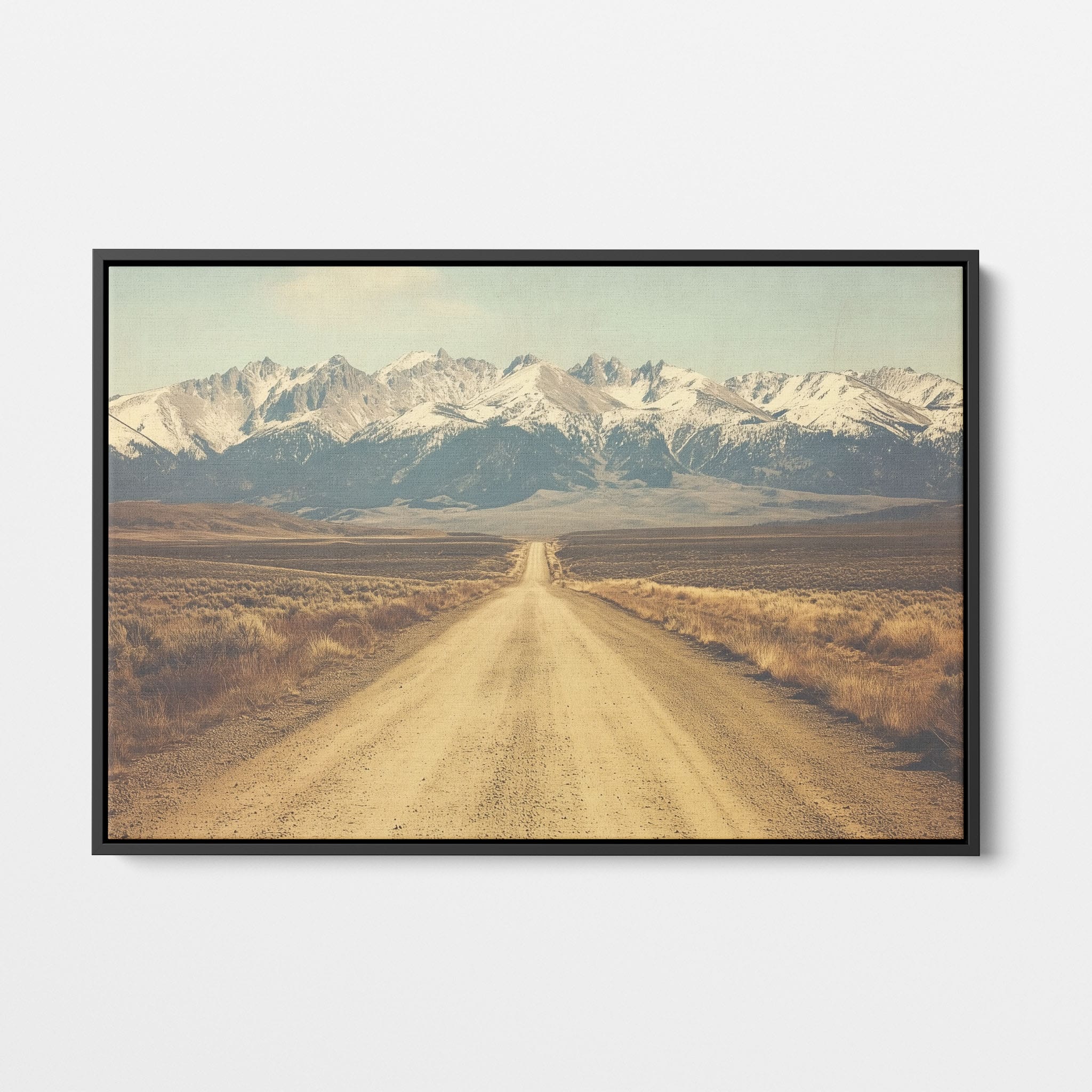 A captivating vintage photograph of a dirt road stretches endlessly toward a majestic mountain range, capturing the spirit of freedom and adventure. The muted earthy tones and the subtle grainy texture evoke a nostalgic feel, inviting viewers to ponder life's journey against the backdrop of sprawling natural beauty. This minimalistic landscape artwork is ideal for those seeking to add a touch of vintage charm and wide-open tranquility to their space. Perfect for rustic or modern interiors, this piece provides a serene yet inspiring focal point.