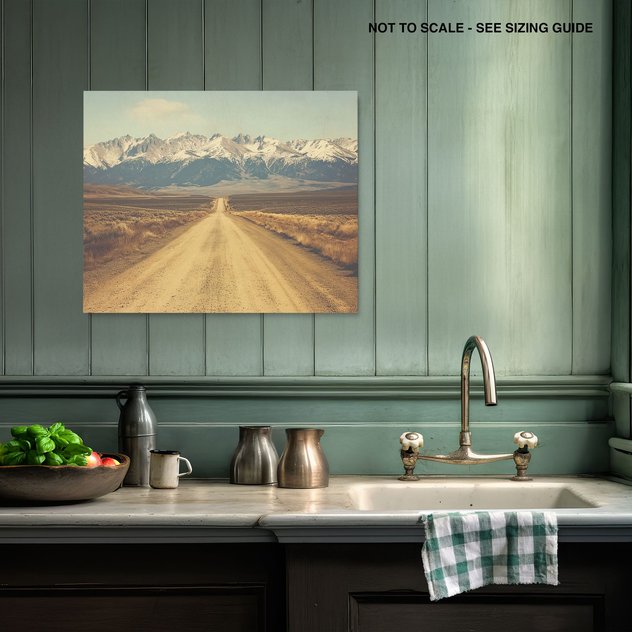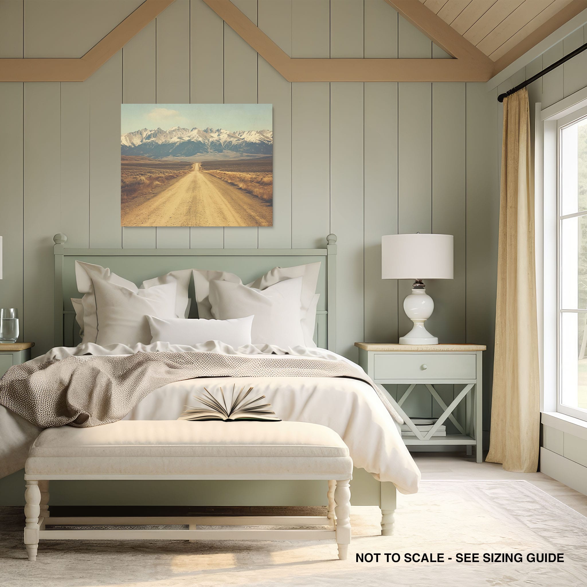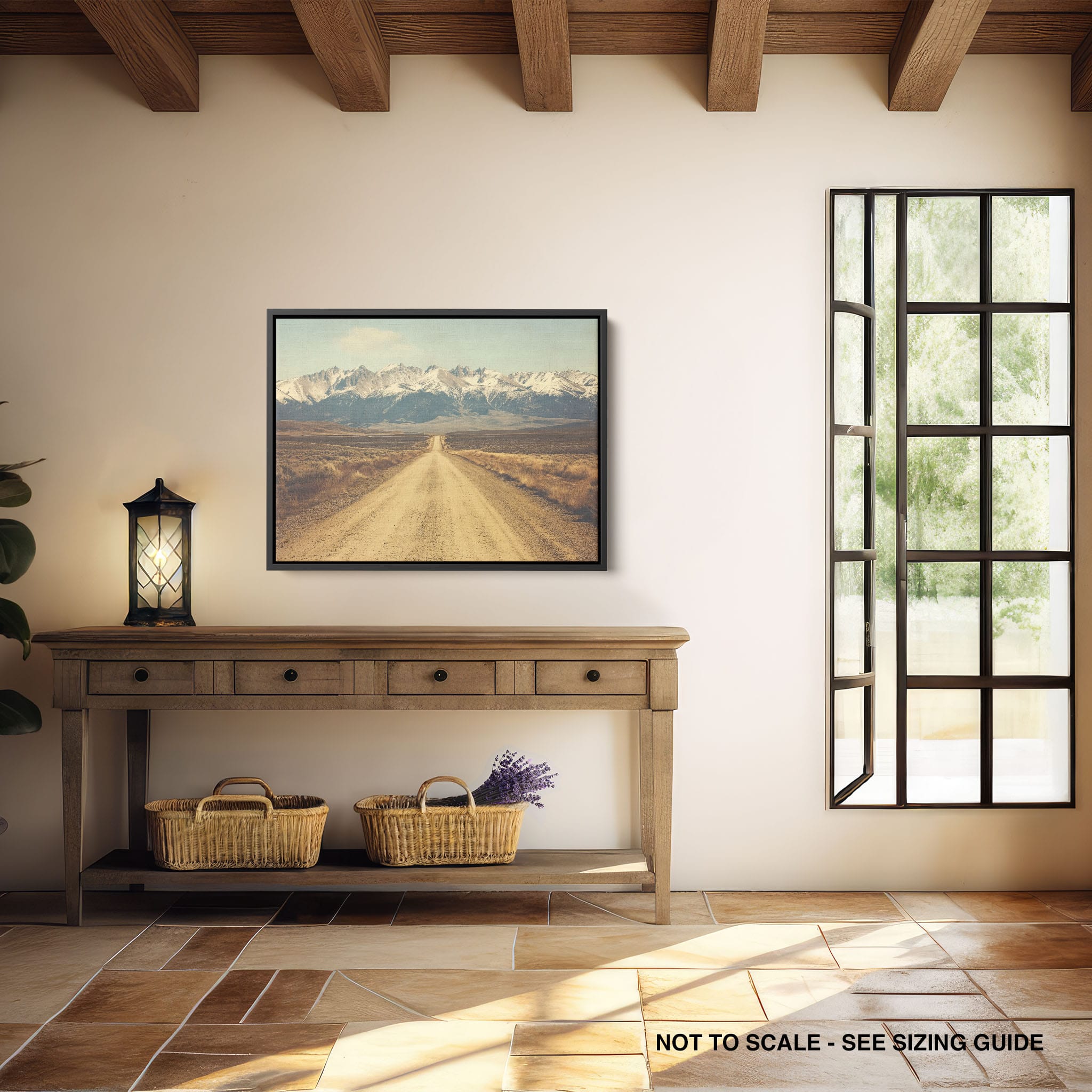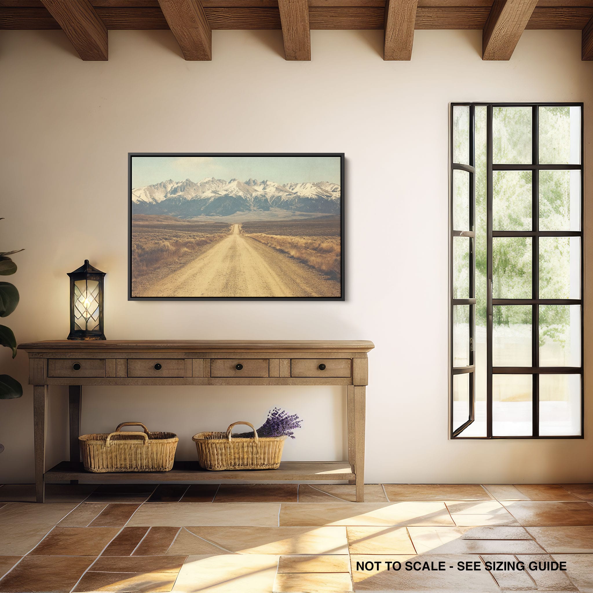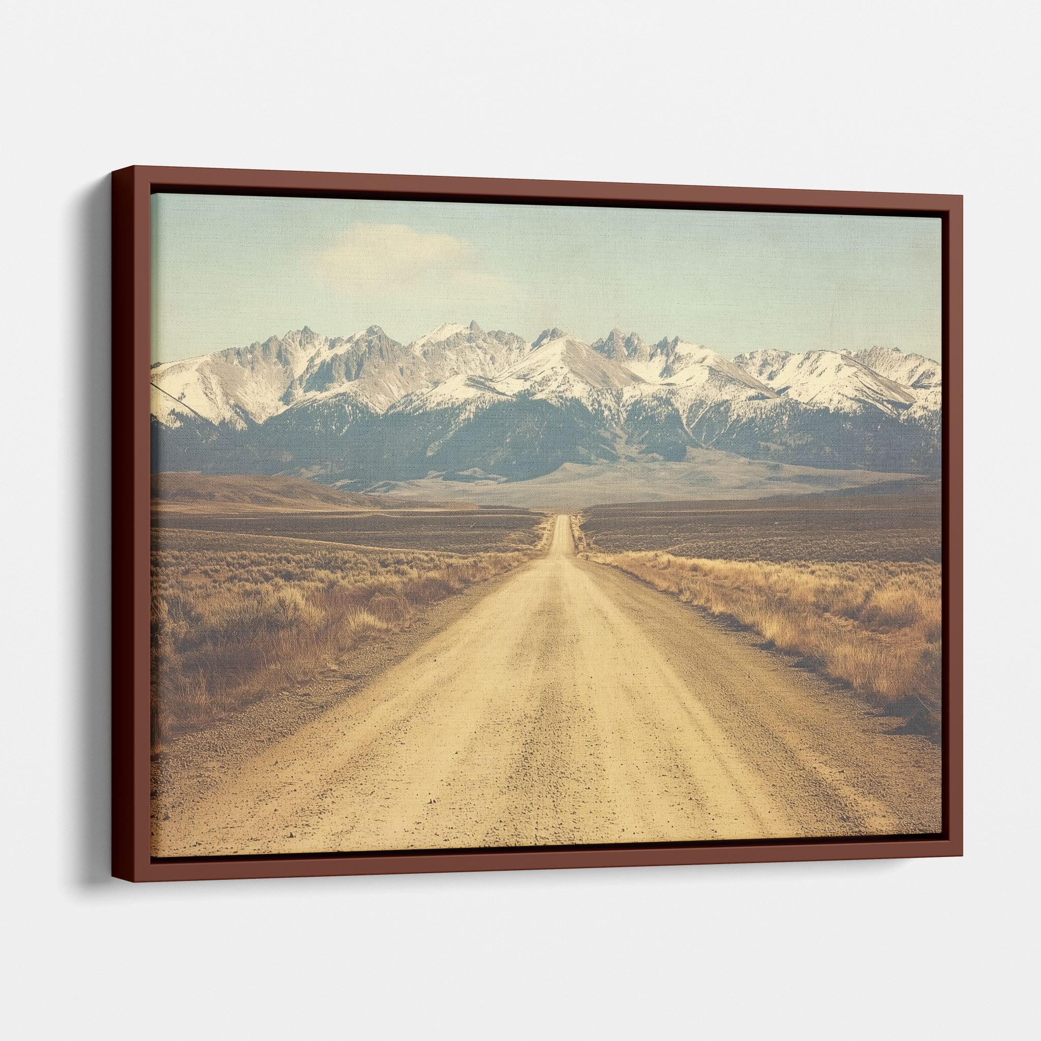 A captivating vintage photograph of a dirt road stretches endlessly toward a majestic mountain range, capturing the spirit of freedom and adventure. The muted earthy tones and the subtle grainy texture evoke a nostalgic feel, inviting viewers to ponder life's journey against the backdrop of sprawling natural beauty. This minimalistic landscape artwork is ideal for those seeking to add a touch of vintage charm and wide-open tranquility to their space. Perfect for rustic or modern interiors, this piece provides a serene yet inspiring focal point.