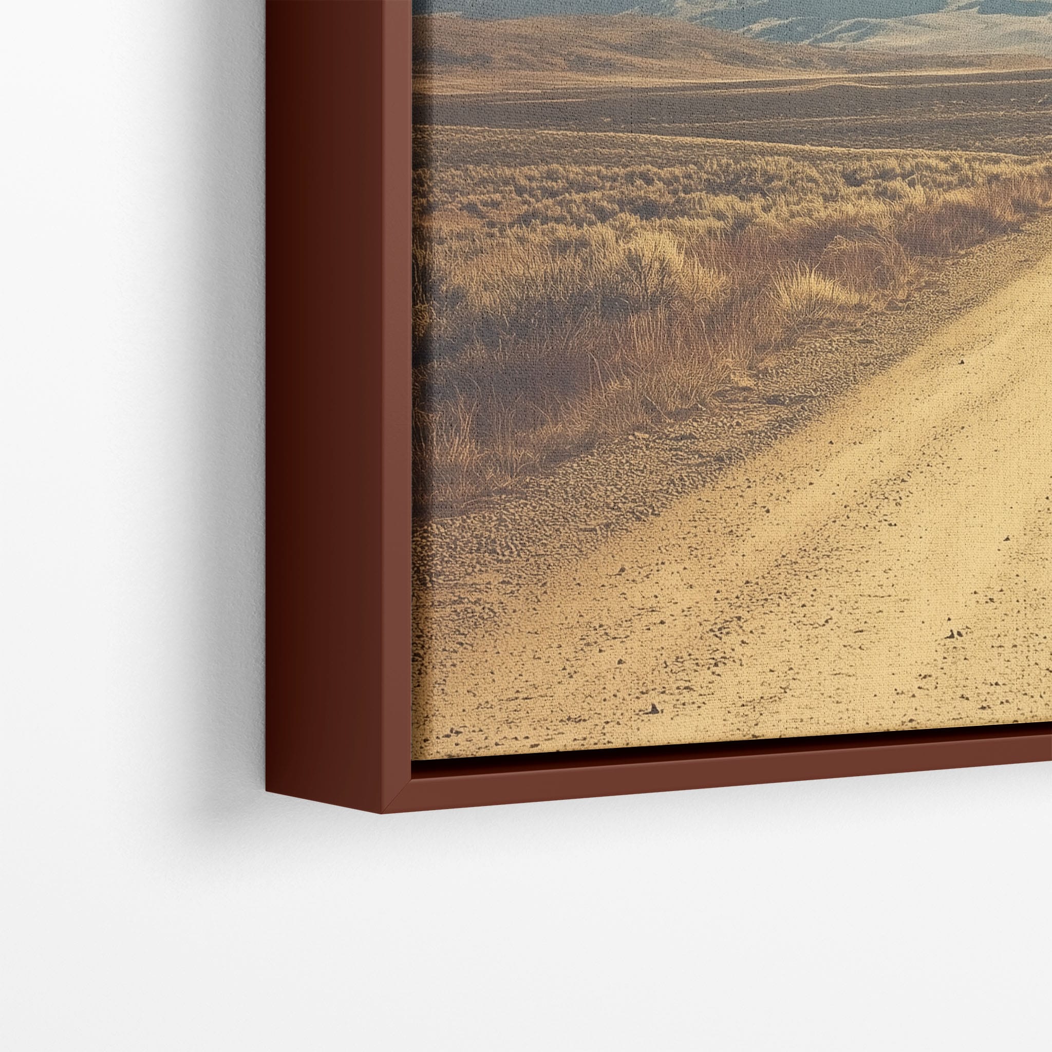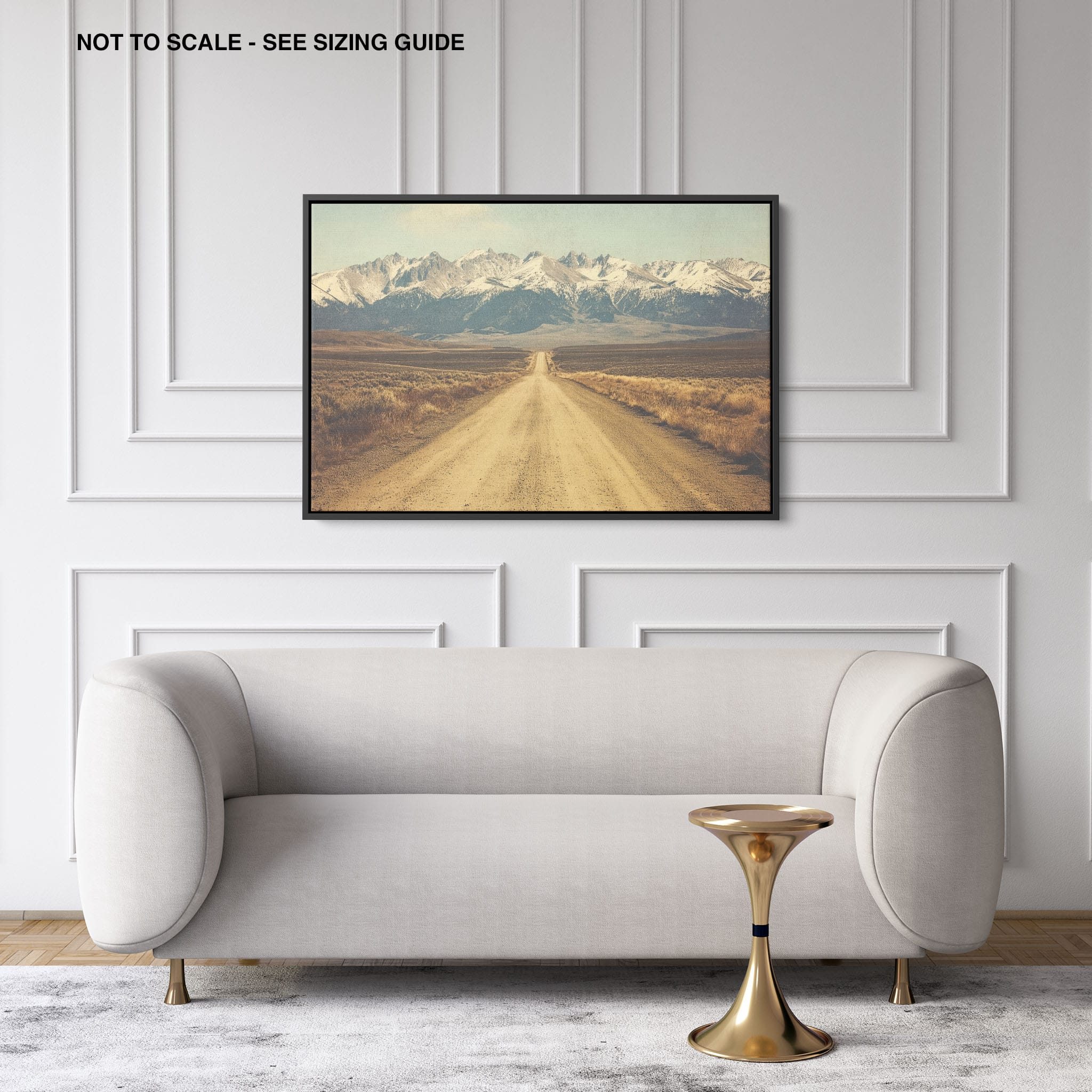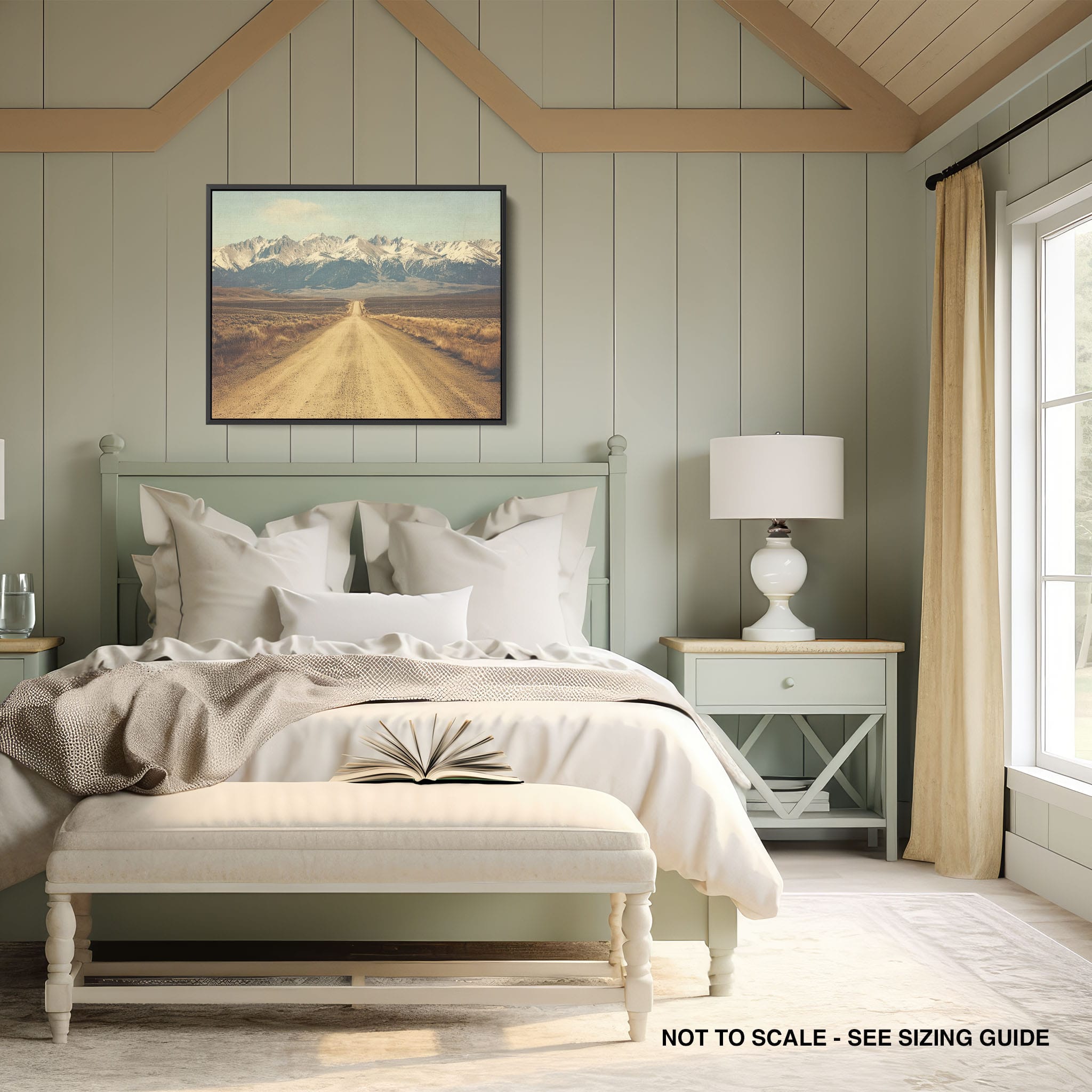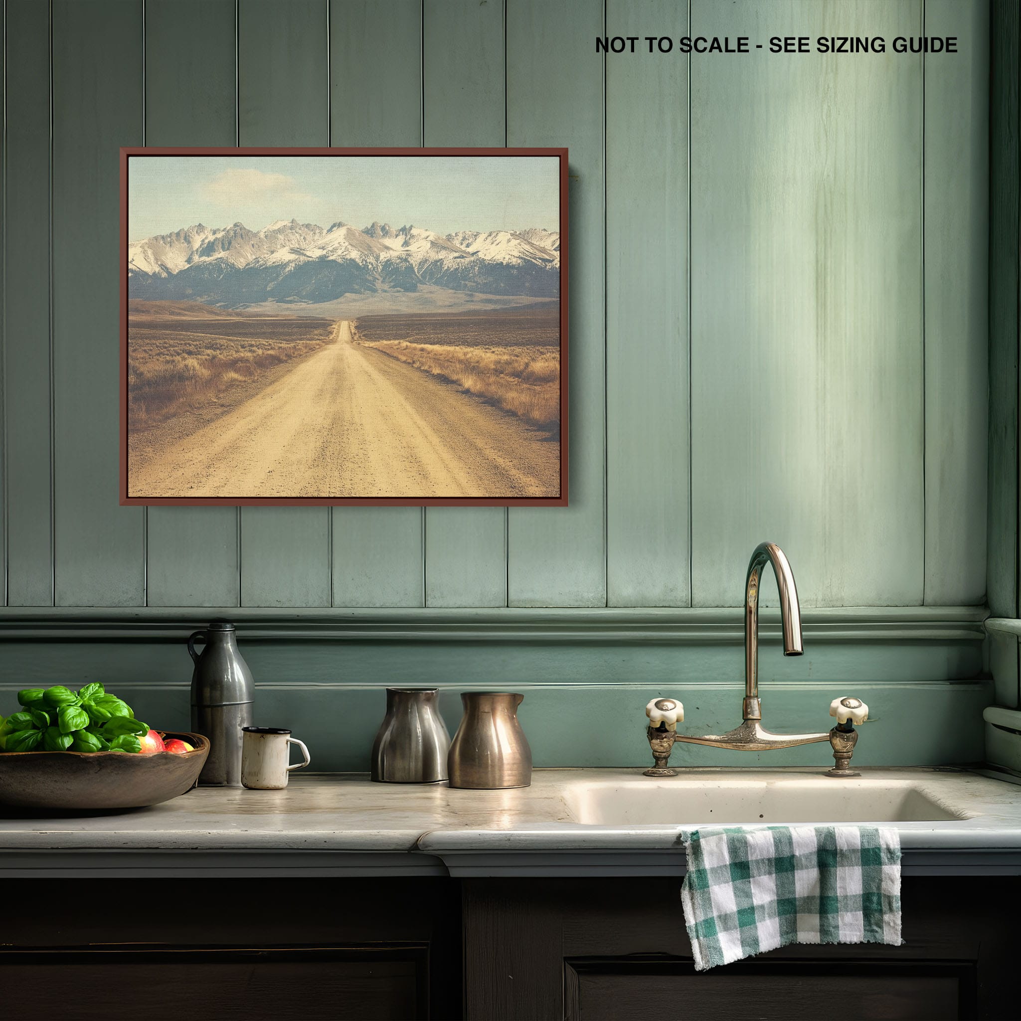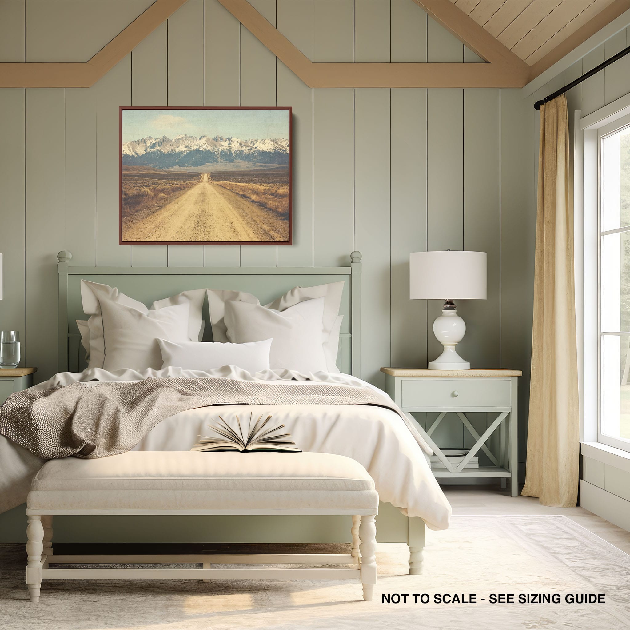 A captivating vintage photograph of a dirt road stretches endlessly toward a majestic mountain range, capturing the spirit of freedom and adventure. The muted earthy tones and the subtle grainy texture evoke a nostalgic feel, inviting viewers to ponder life's journey against the backdrop of sprawling natural beauty. This minimalistic landscape artwork is ideal for those seeking to add a touch of vintage charm and wide-open tranquility to their space. Perfect for rustic or modern interiors, this piece provides a serene yet inspiring focal point.