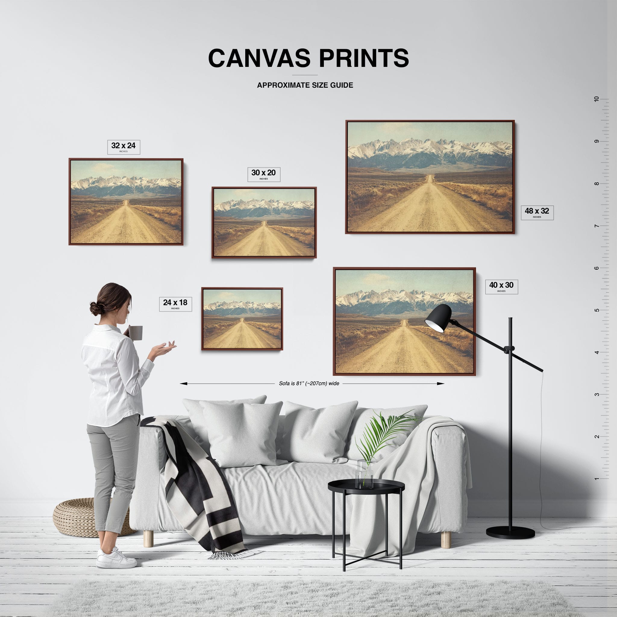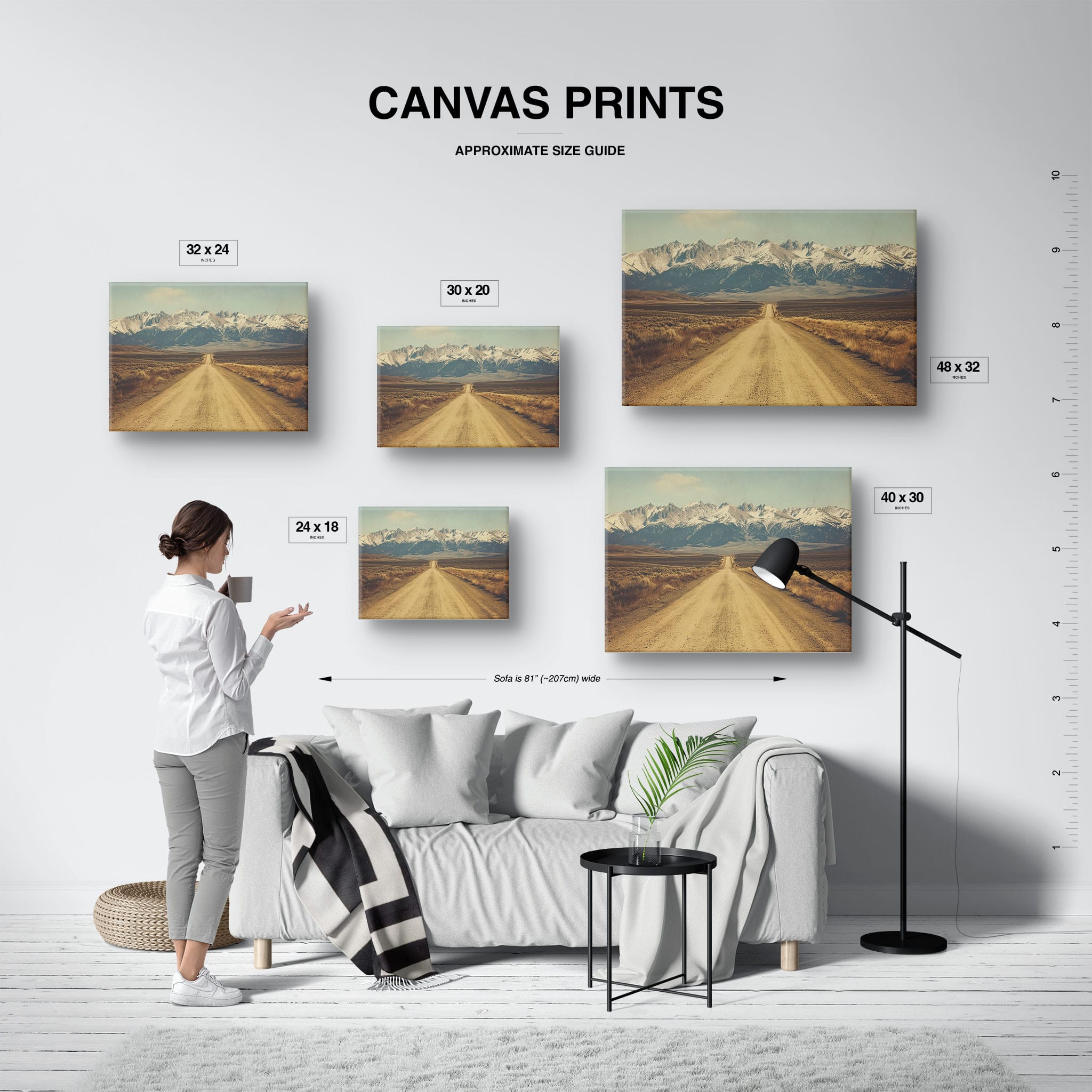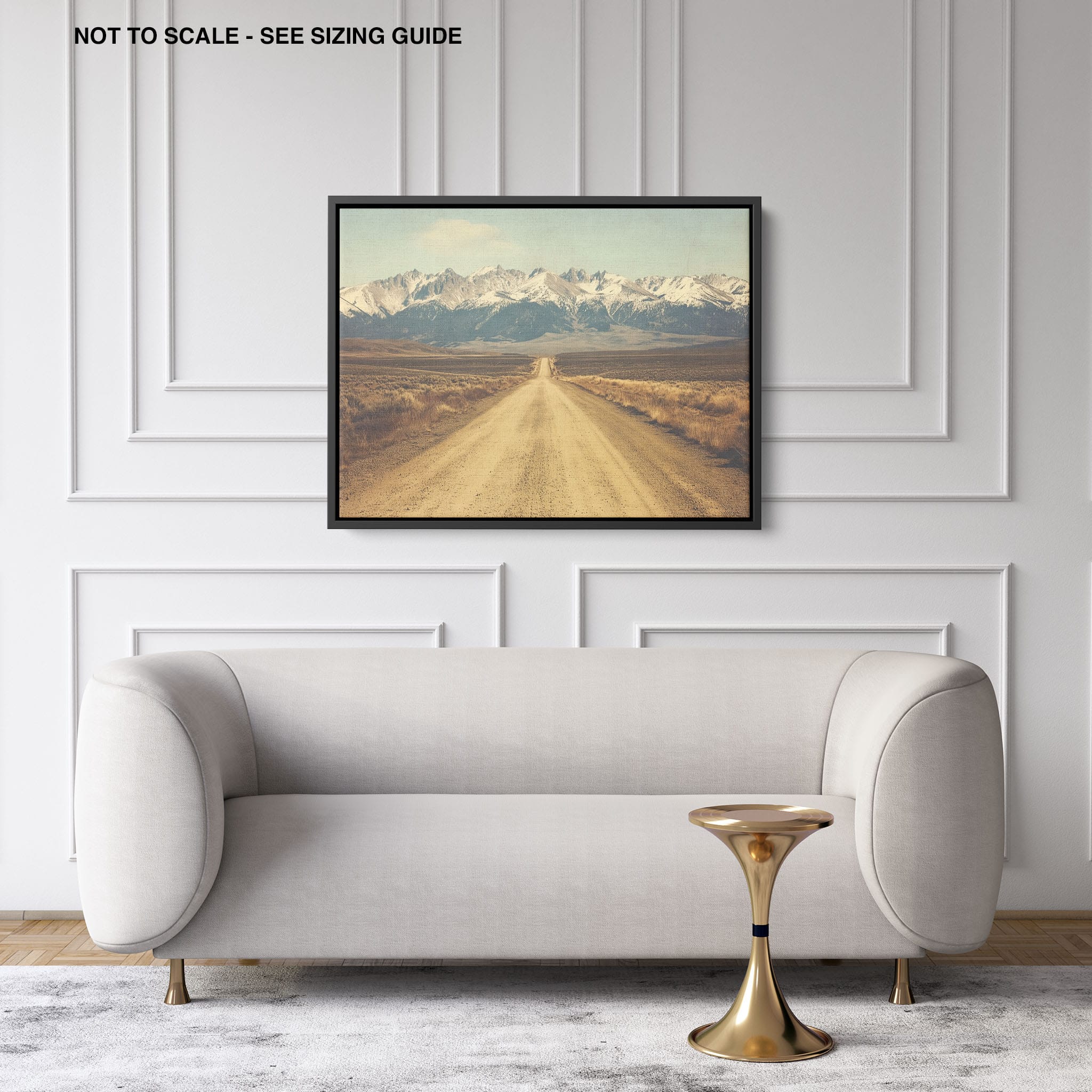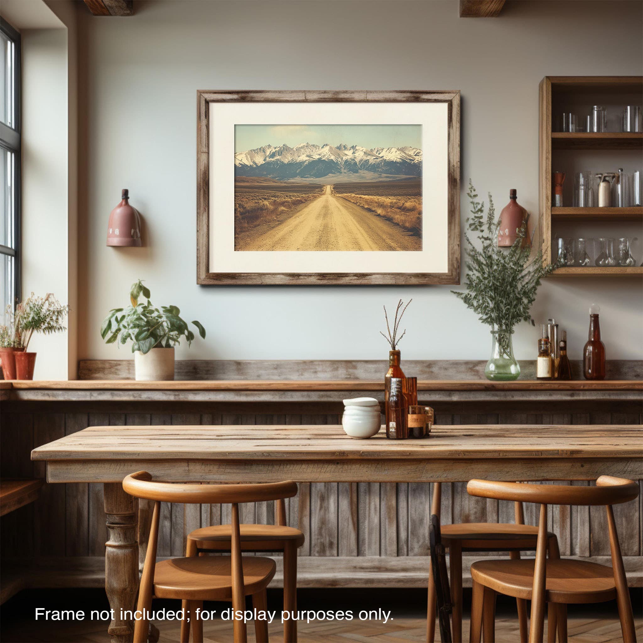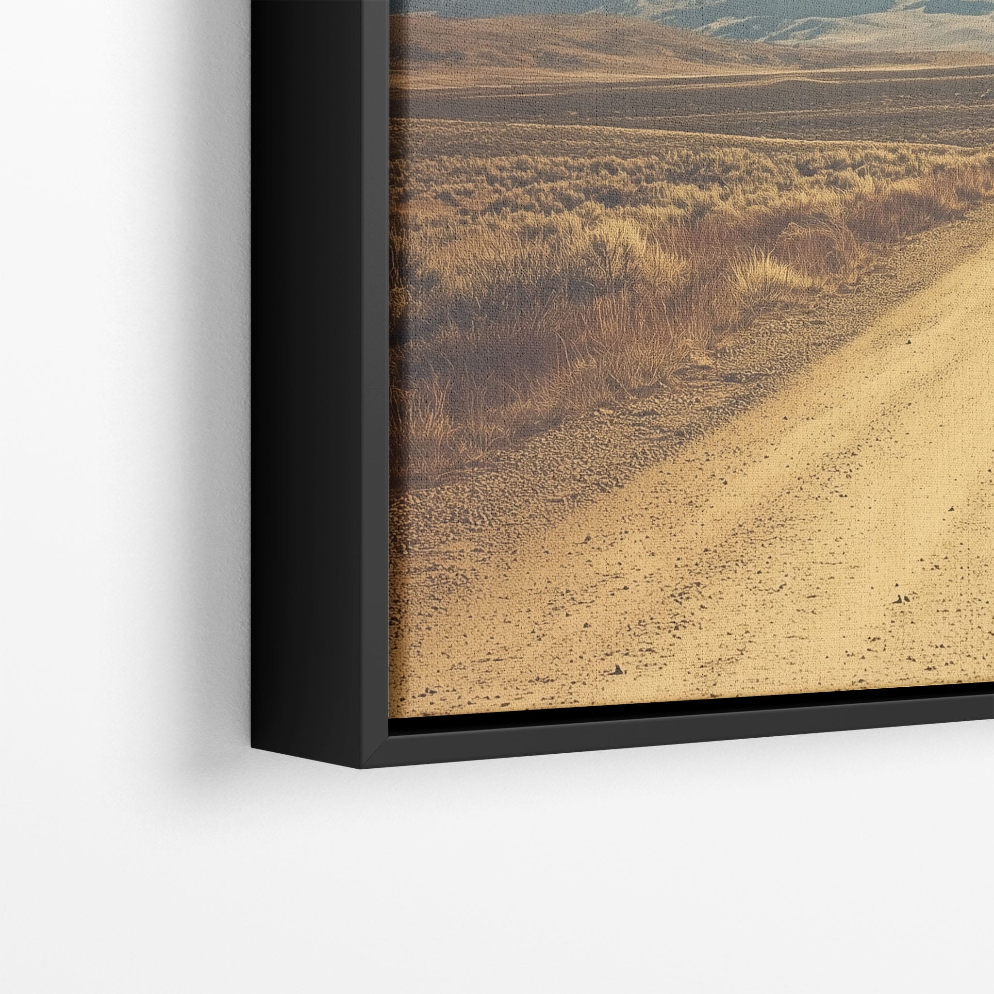 A captivating vintage photograph of a dirt road stretches endlessly toward a majestic mountain range, capturing the spirit of freedom and adventure. The muted earthy tones and the subtle grainy texture evoke a nostalgic feel, inviting viewers to ponder life's journey against the backdrop of sprawling natural beauty. This minimalistic landscape artwork is ideal for those seeking to add a touch of vintage charm and wide-open tranquility to their space. Perfect for rustic or modern interiors, this piece provides a serene yet inspiring focal point.