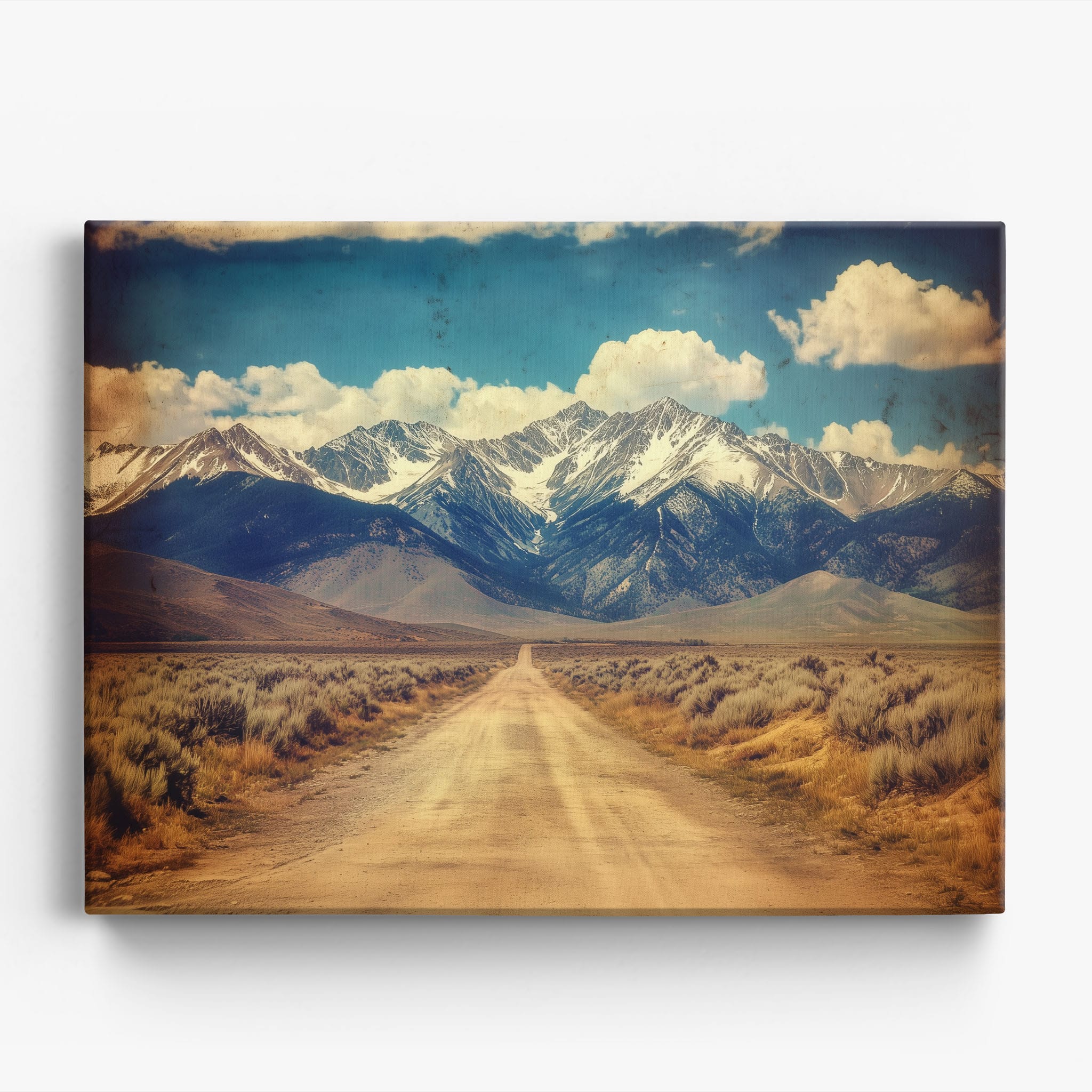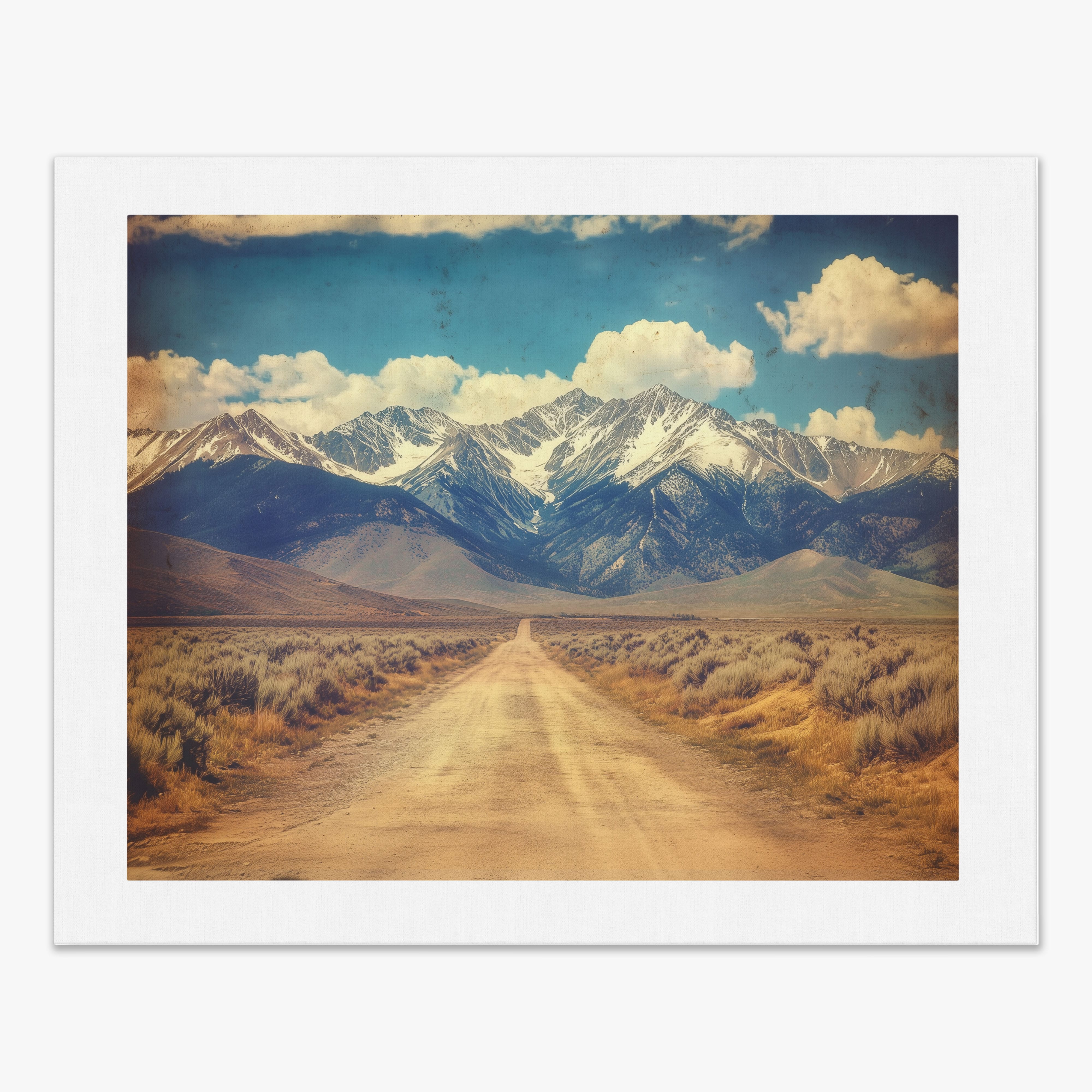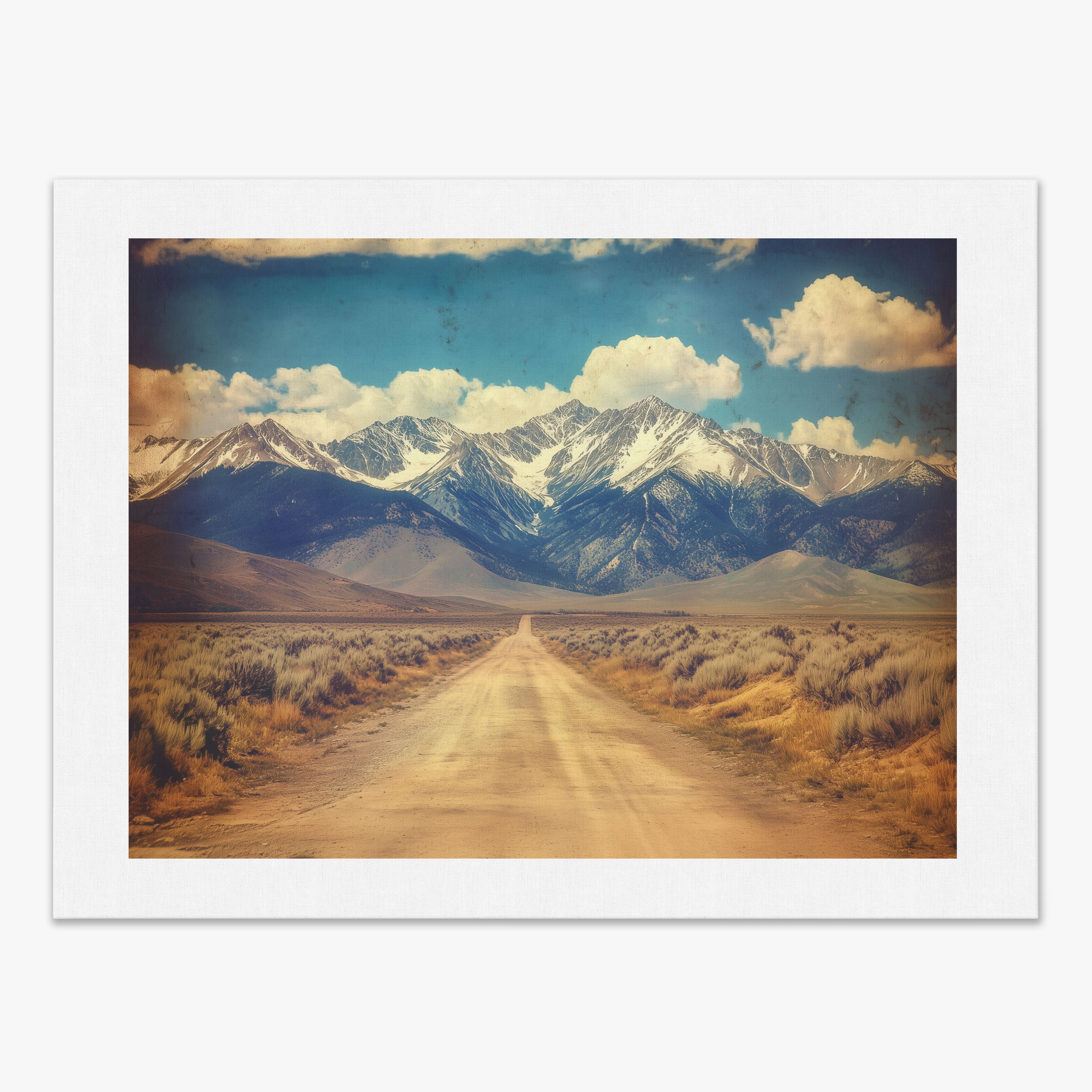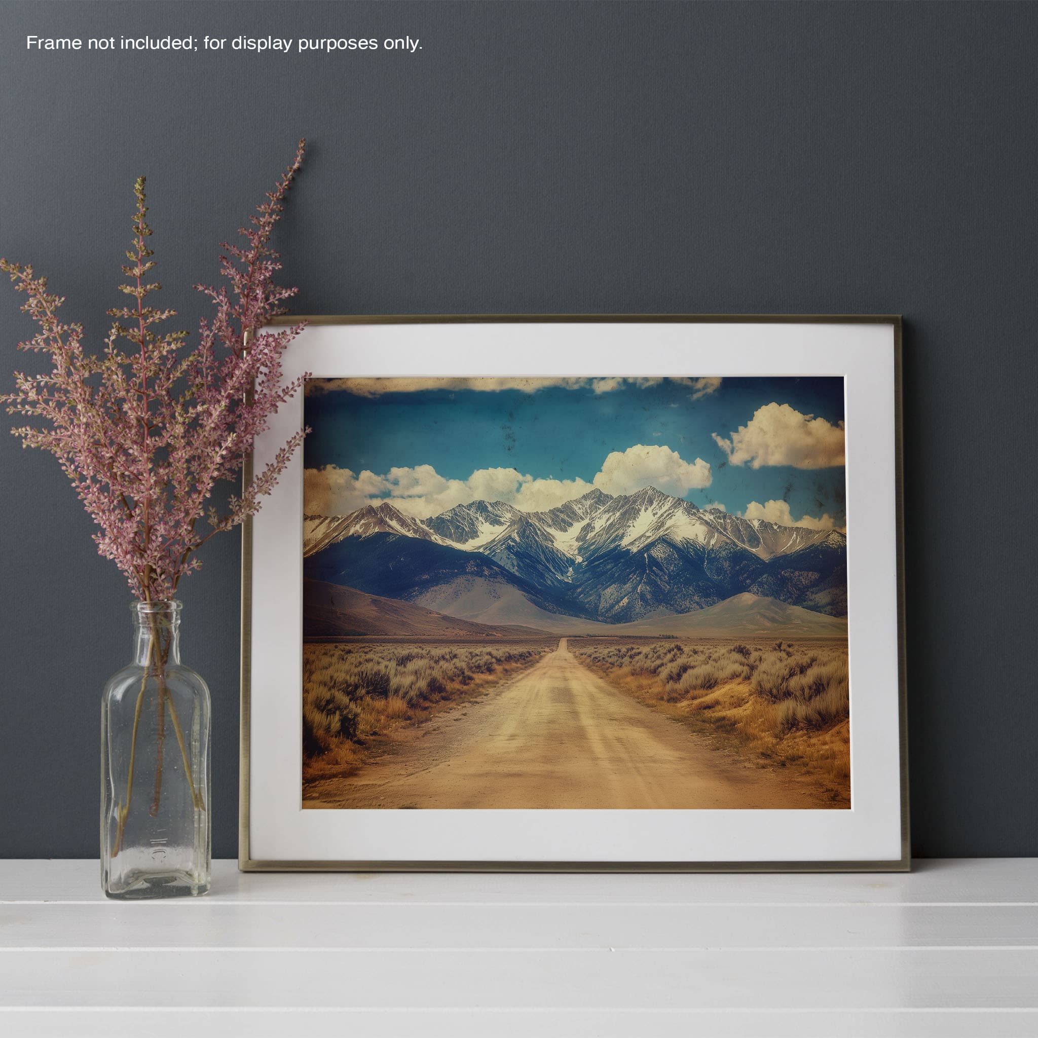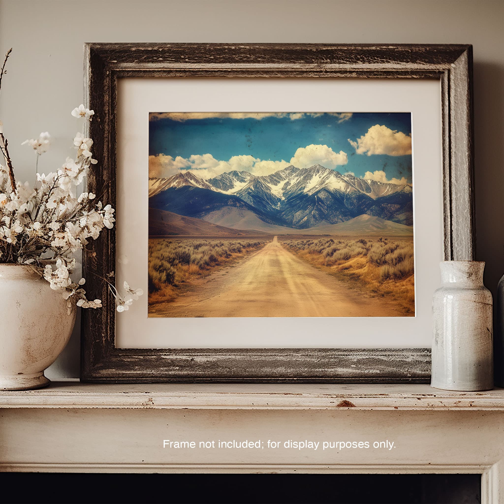 This breathtaking artwork captures a majestic view of a winding dirt path leading to a range of snow-capped mountains under a vibrant, cloudy sky. Highlighting the serenity of the wilderness, the image blends the rugged textures of the landscape with the dramatic beauty of the Sierra Nevada mountain range. With a subtle vintage filter, this digital photography piece evokes a nostalgic feel, perfect for those who cherish the natural world's untouched splendor. Ideal for adding a touch of rustic charm to any space, this landscape photography will transport you to the tranquil beauty of nature’s grandeur.