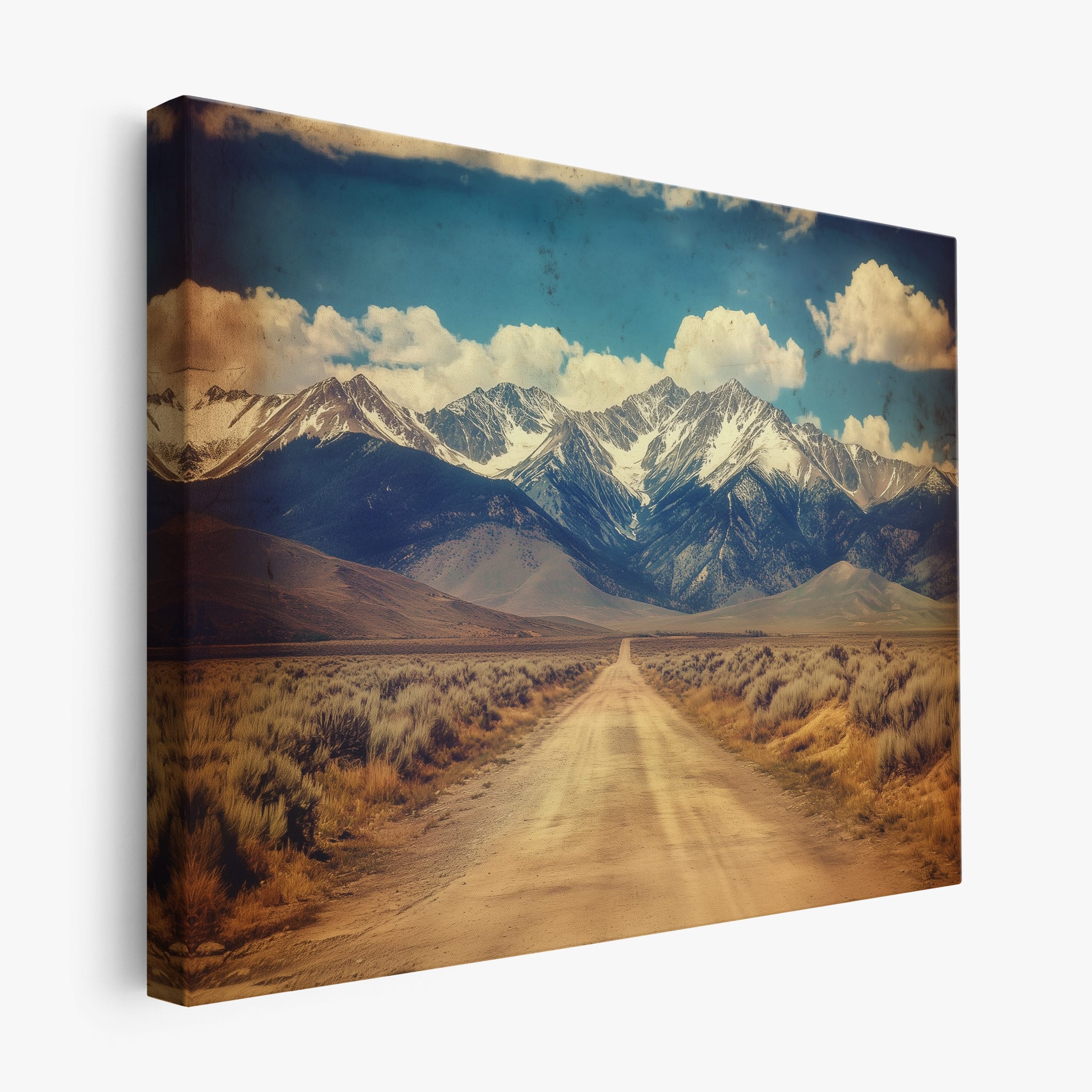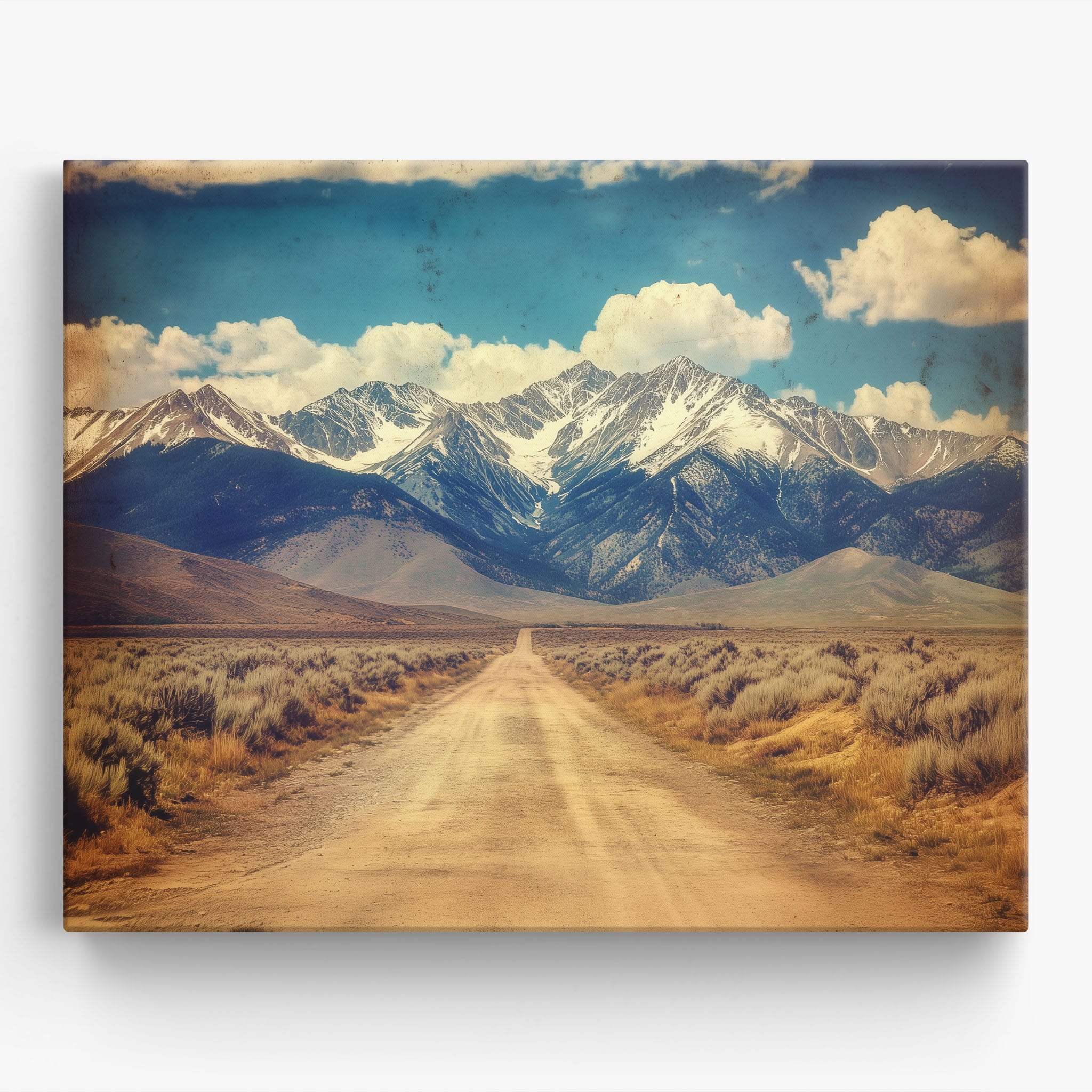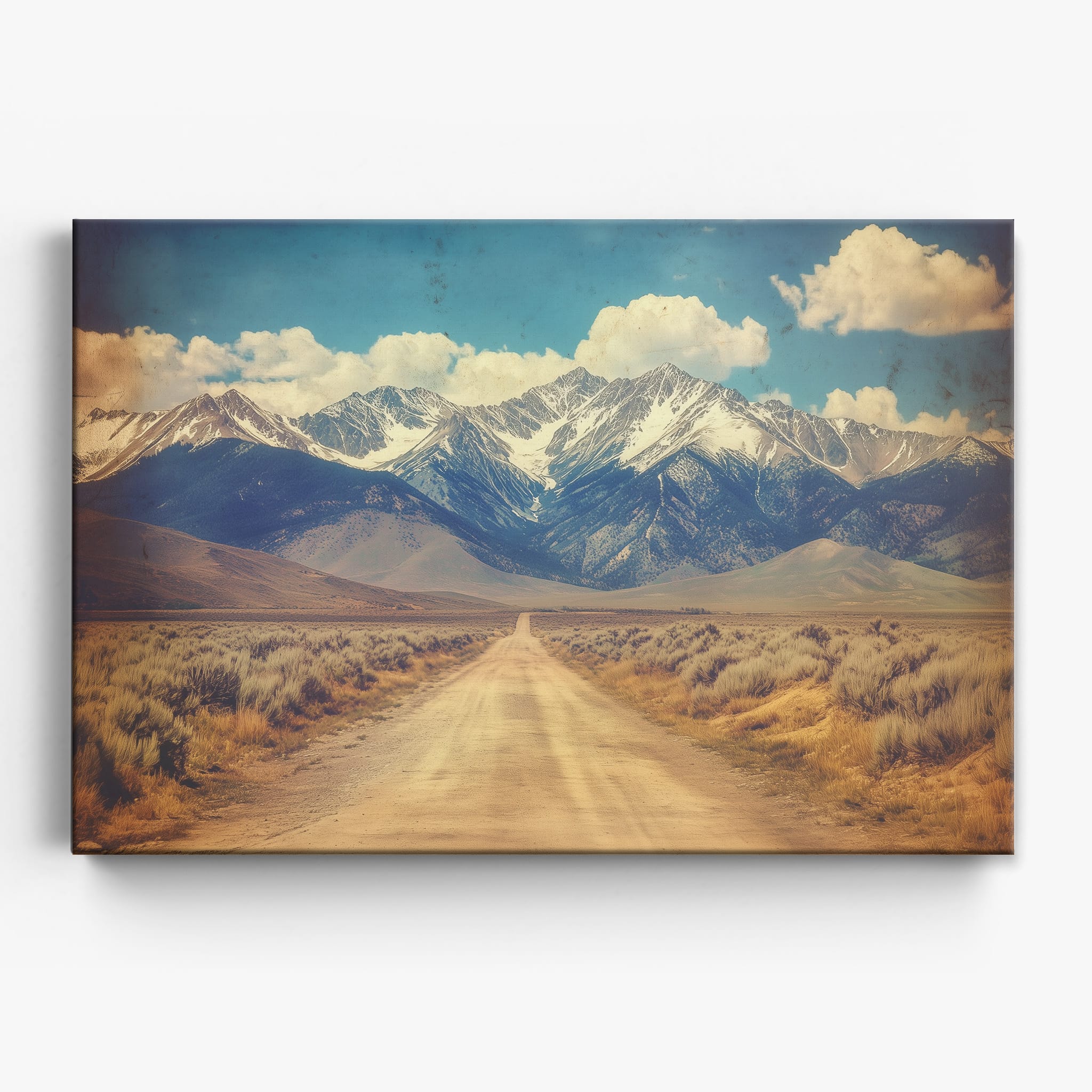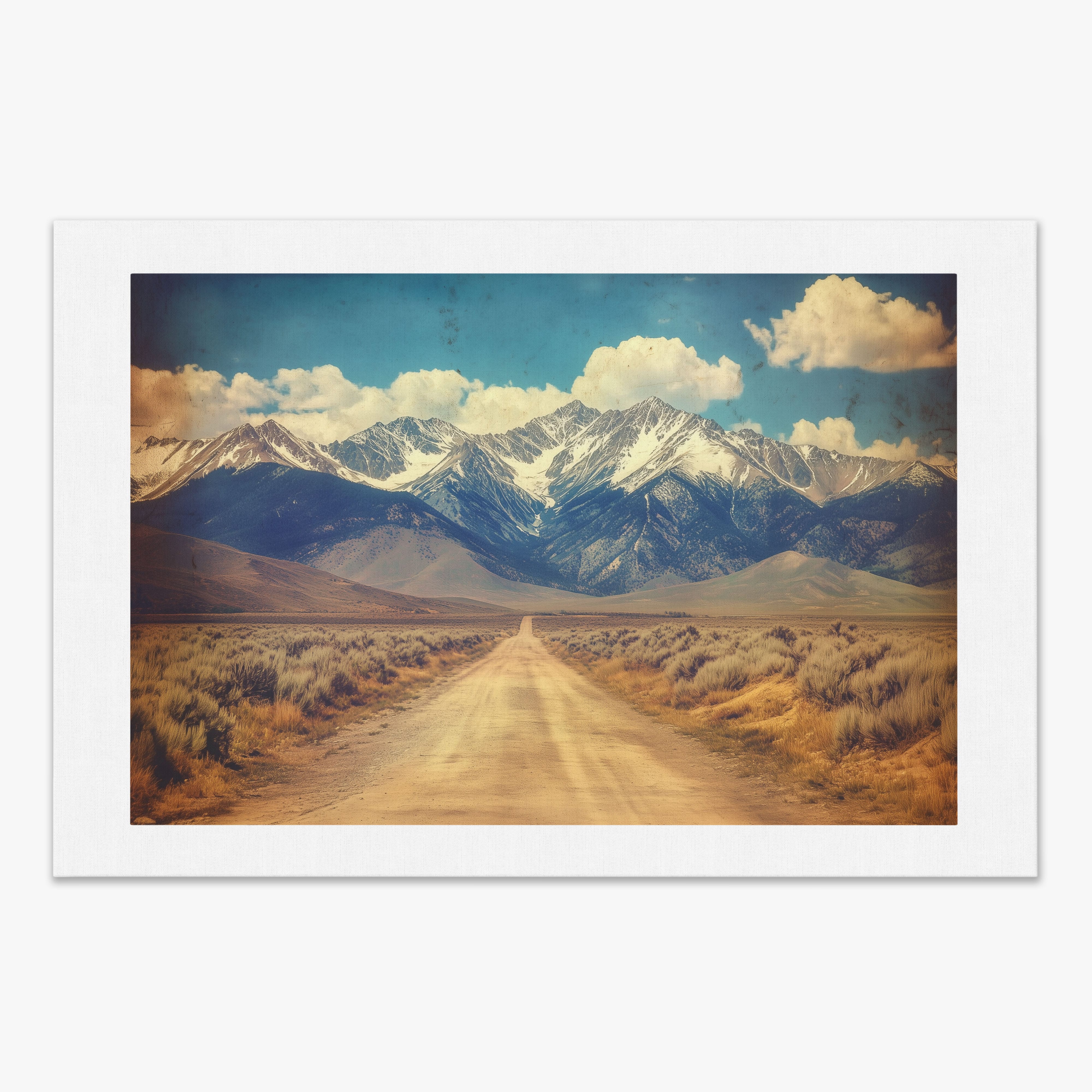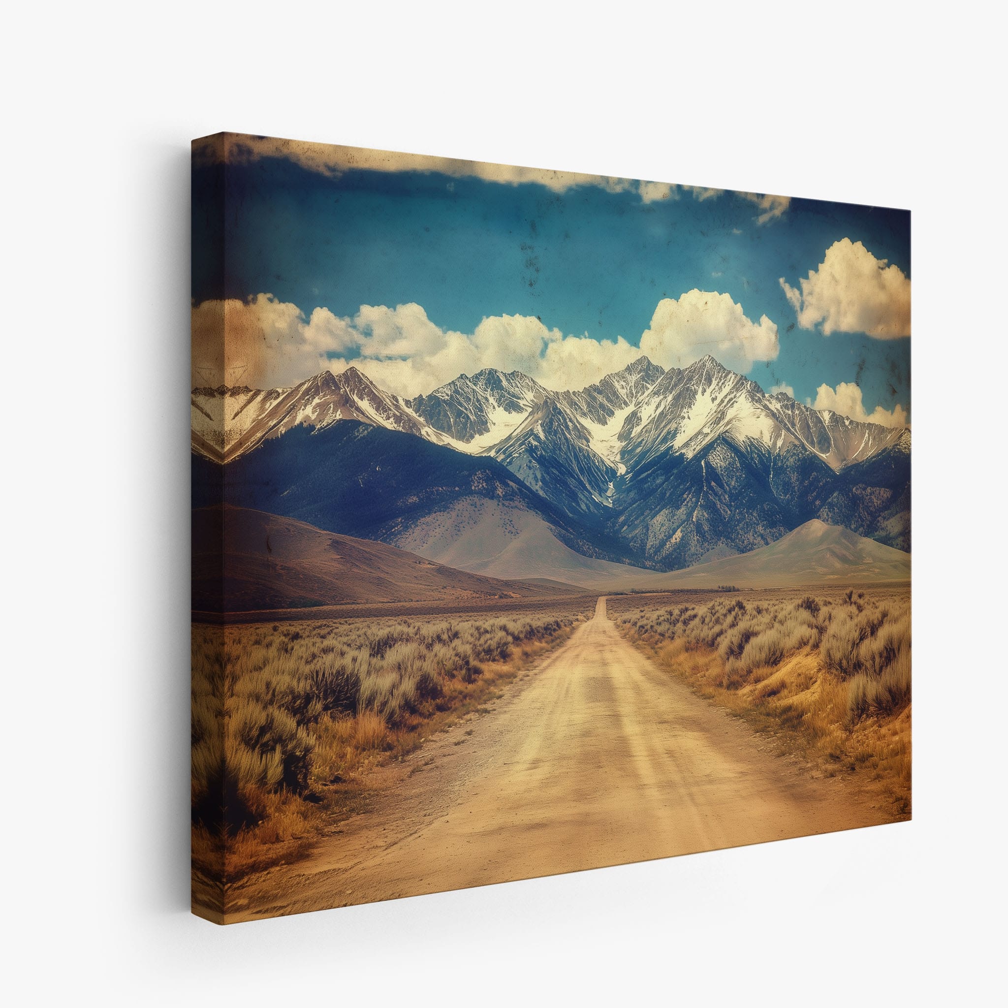 This breathtaking artwork captures a majestic view of a winding dirt path leading to a range of snow-capped mountains under a vibrant, cloudy sky. Highlighting the serenity of the wilderness, the image blends the rugged textures of the landscape with the dramatic beauty of the Sierra Nevada mountain range. With a subtle vintage filter, this digital photography piece evokes a nostalgic feel, perfect for those who cherish the natural world's untouched splendor. Ideal for adding a touch of rustic charm to any space, this landscape photography will transport you to the tranquil beauty of nature’s grandeur.