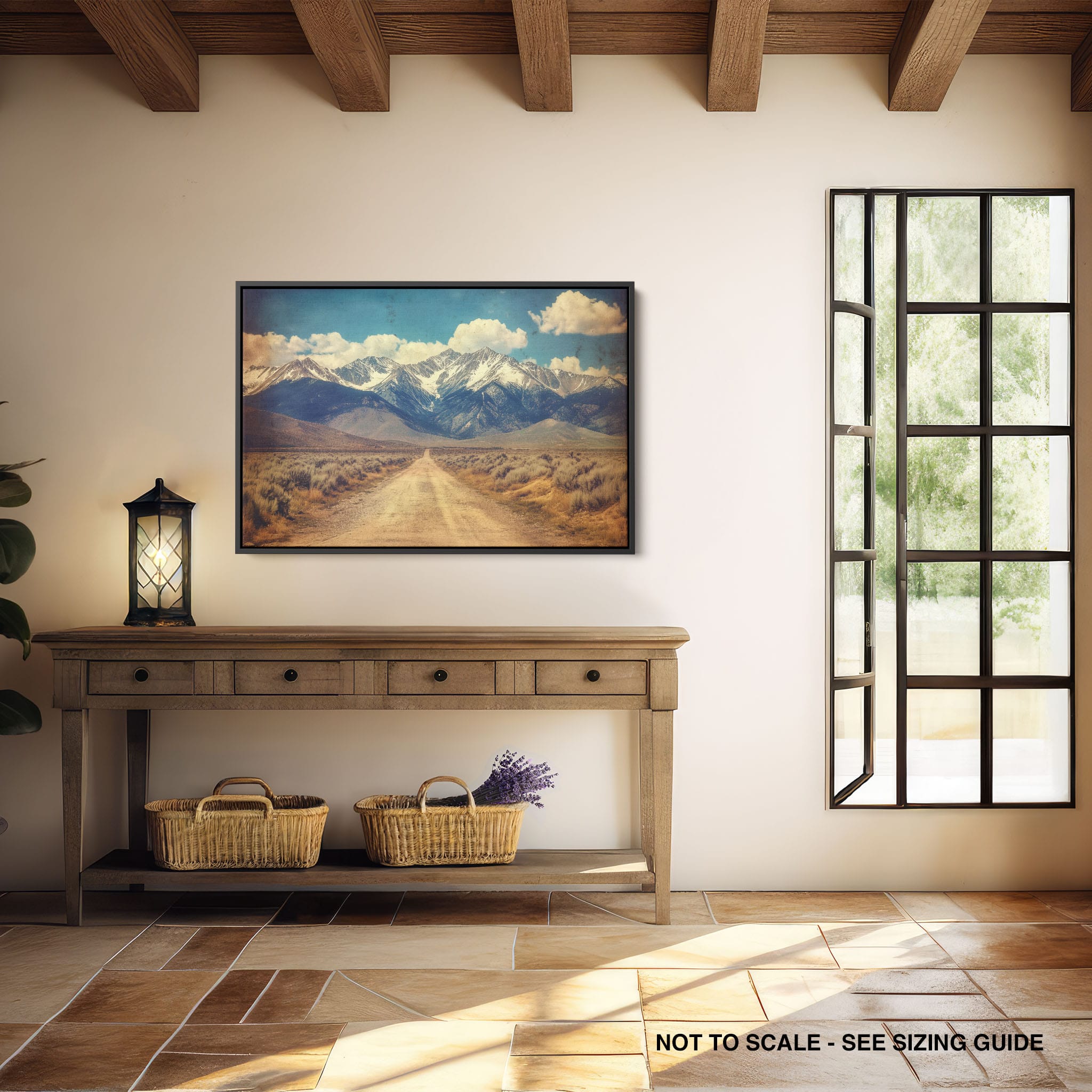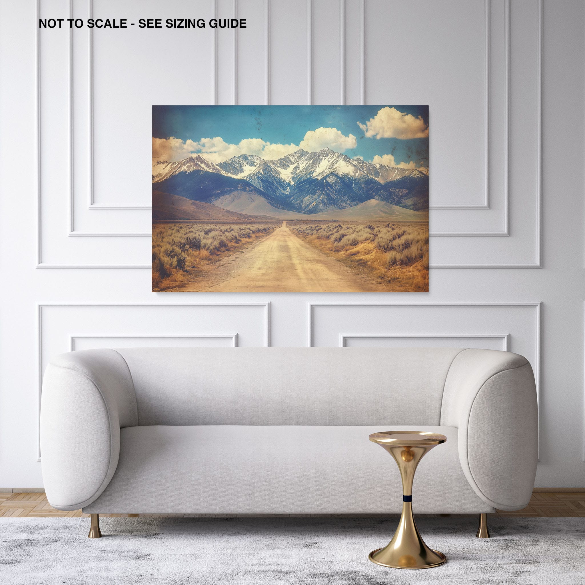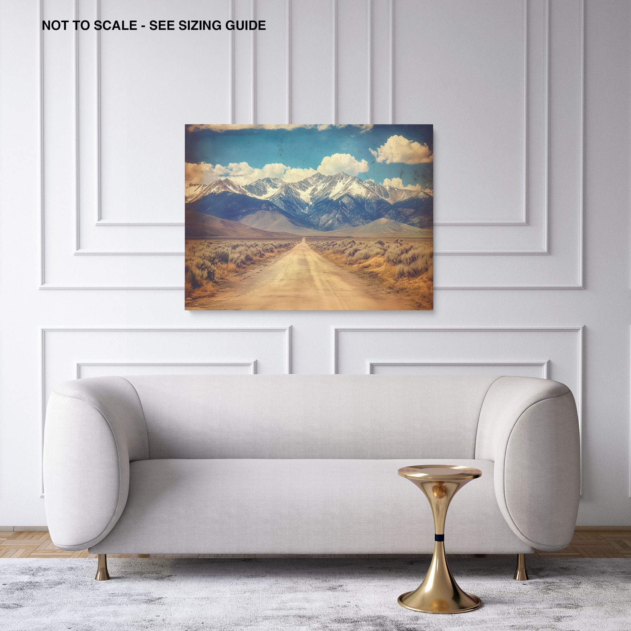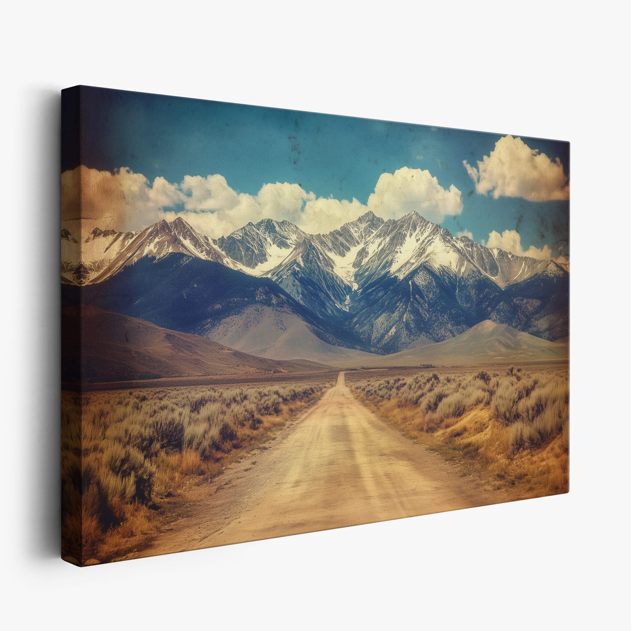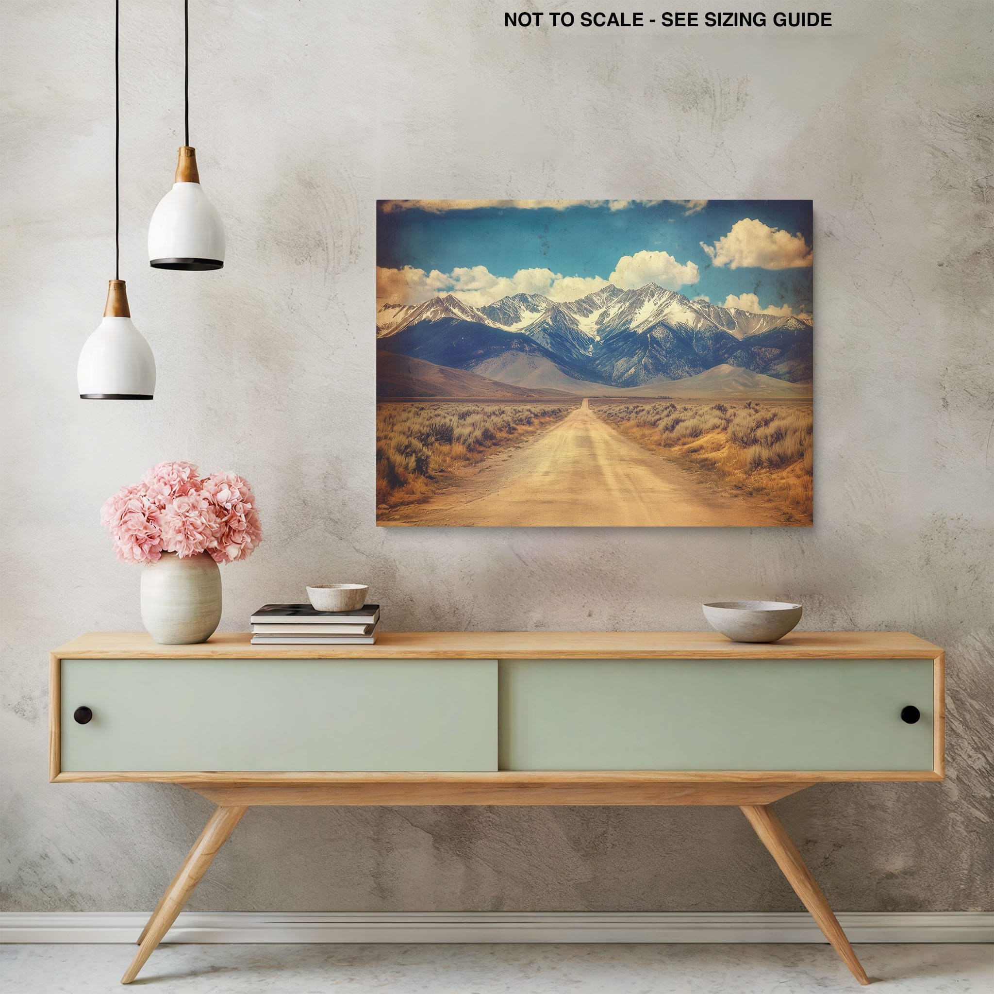 This breathtaking artwork captures a majestic view of a winding dirt path leading to a range of snow-capped mountains under a vibrant, cloudy sky. Highlighting the serenity of the wilderness, the image blends the rugged textures of the landscape with the dramatic beauty of the Sierra Nevada mountain range. With a subtle vintage filter, this digital photography piece evokes a nostalgic feel, perfect for those who cherish the natural world's untouched splendor. Ideal for adding a touch of rustic charm to any space, this landscape photography will transport you to the tranquil beauty of nature’s grandeur.