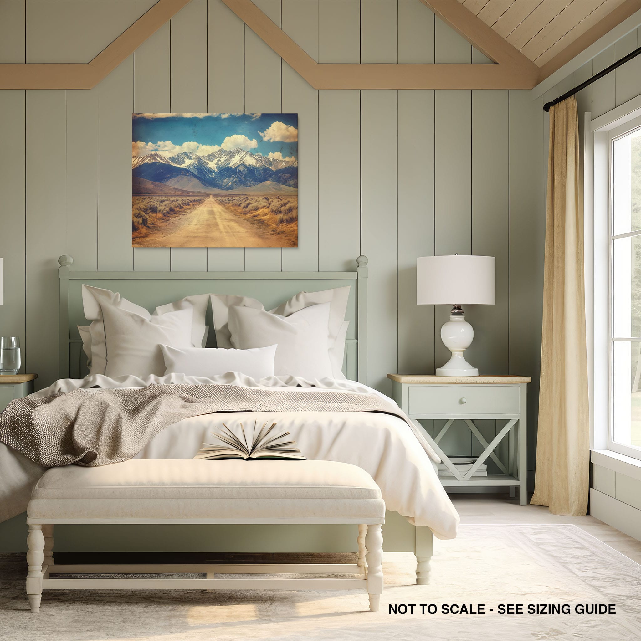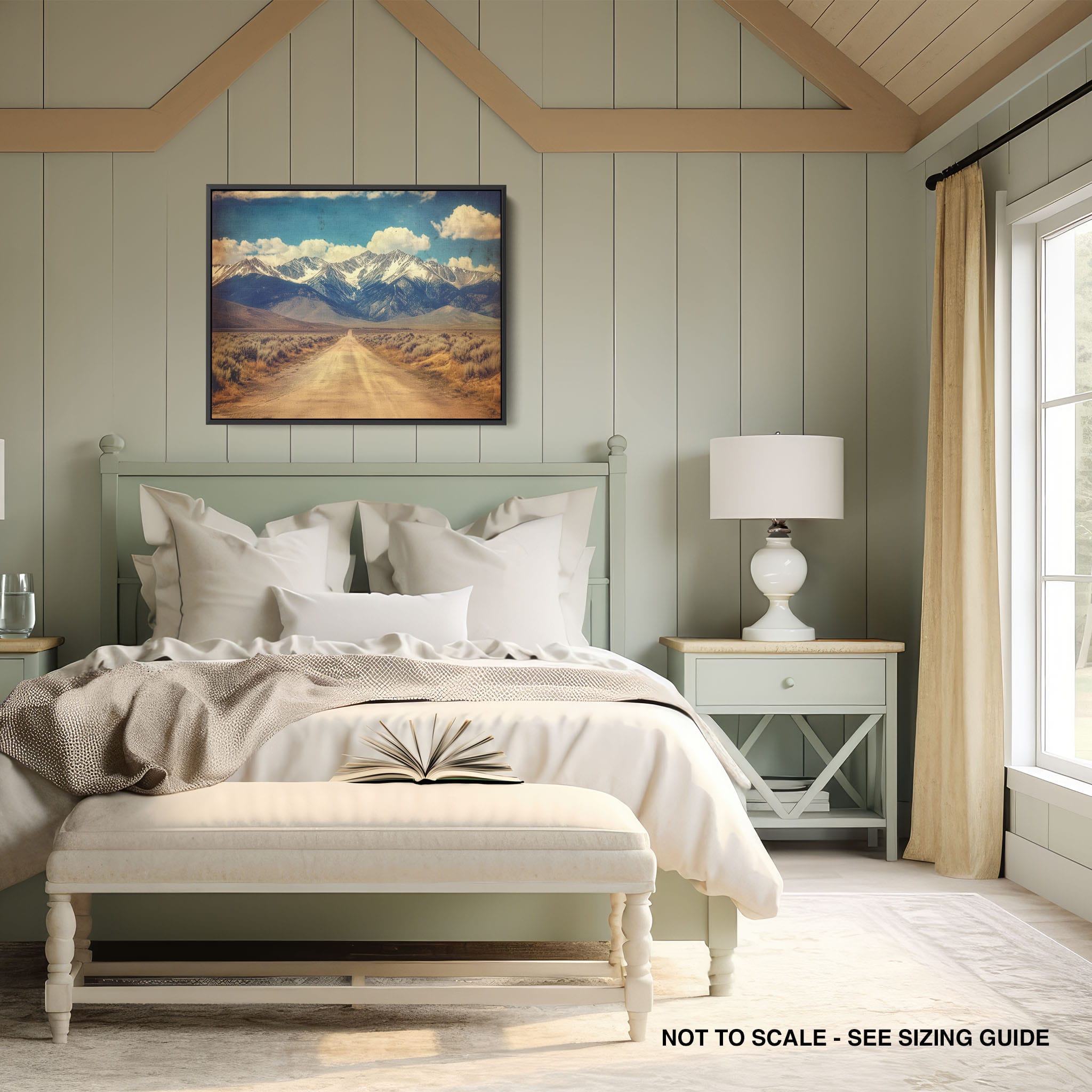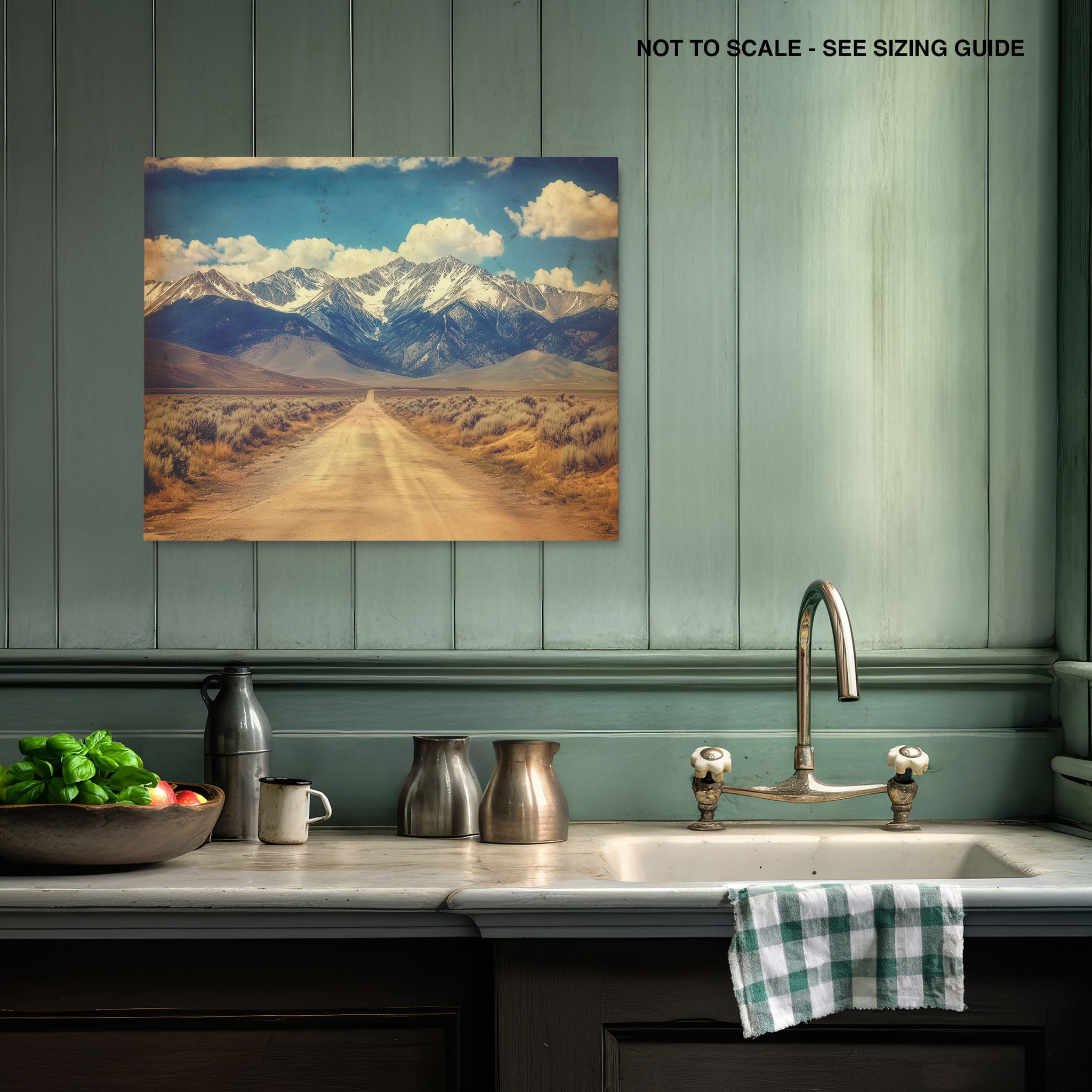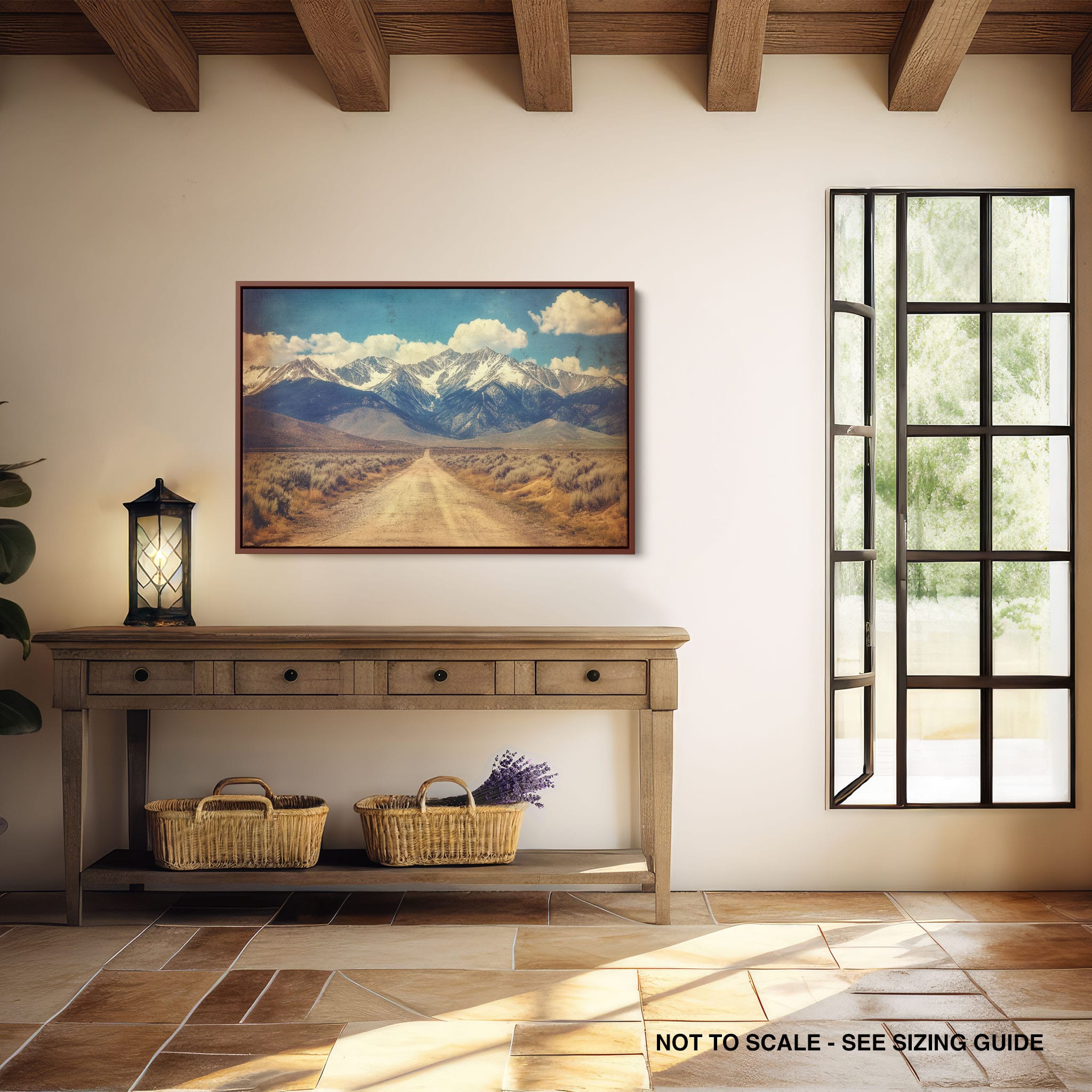 This breathtaking artwork captures a majestic view of a winding dirt path leading to a range of snow-capped mountains under a vibrant, cloudy sky. Highlighting the serenity of the wilderness, the image blends the rugged textures of the landscape with the dramatic beauty of the Sierra Nevada mountain range. With a subtle vintage filter, this digital photography piece evokes a nostalgic feel, perfect for those who cherish the natural world's untouched splendor. Ideal for adding a touch of rustic charm to any space, this landscape photography will transport you to the tranquil beauty of nature’s grandeur.