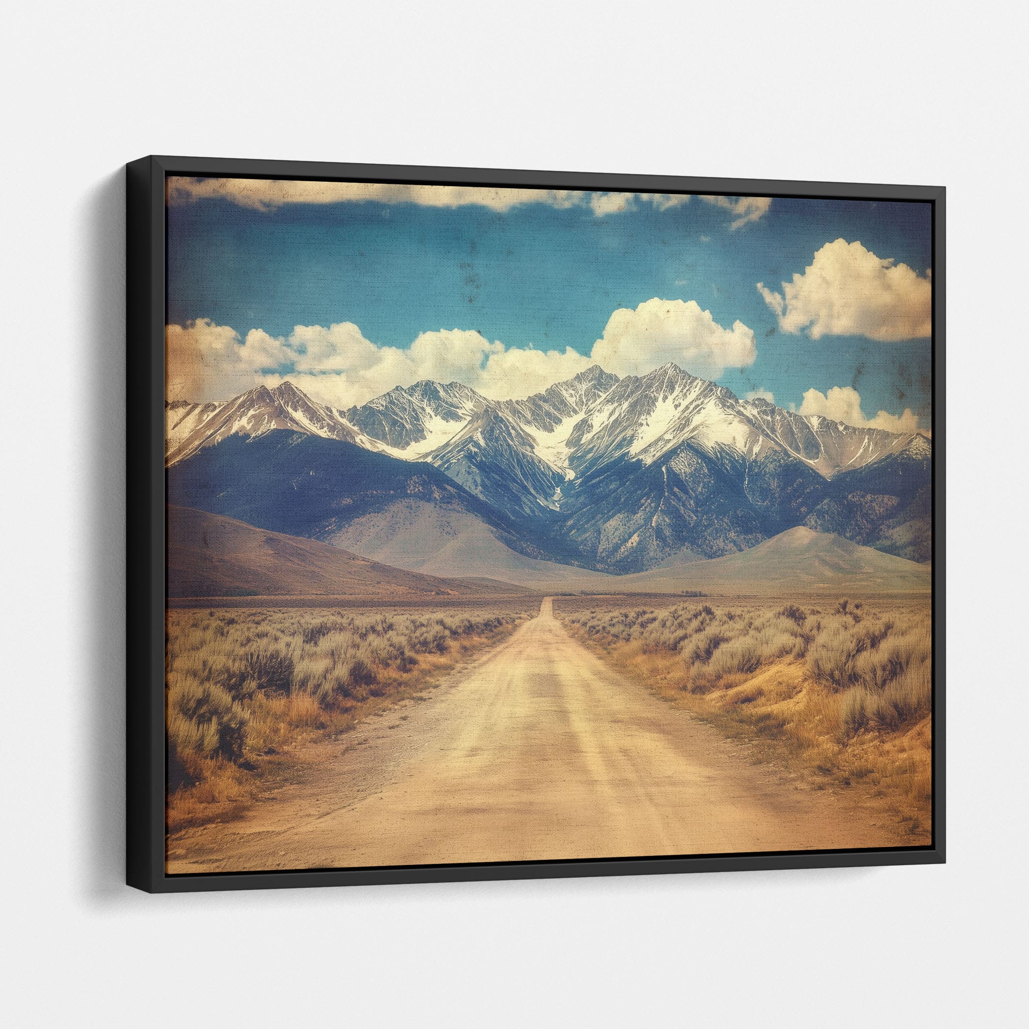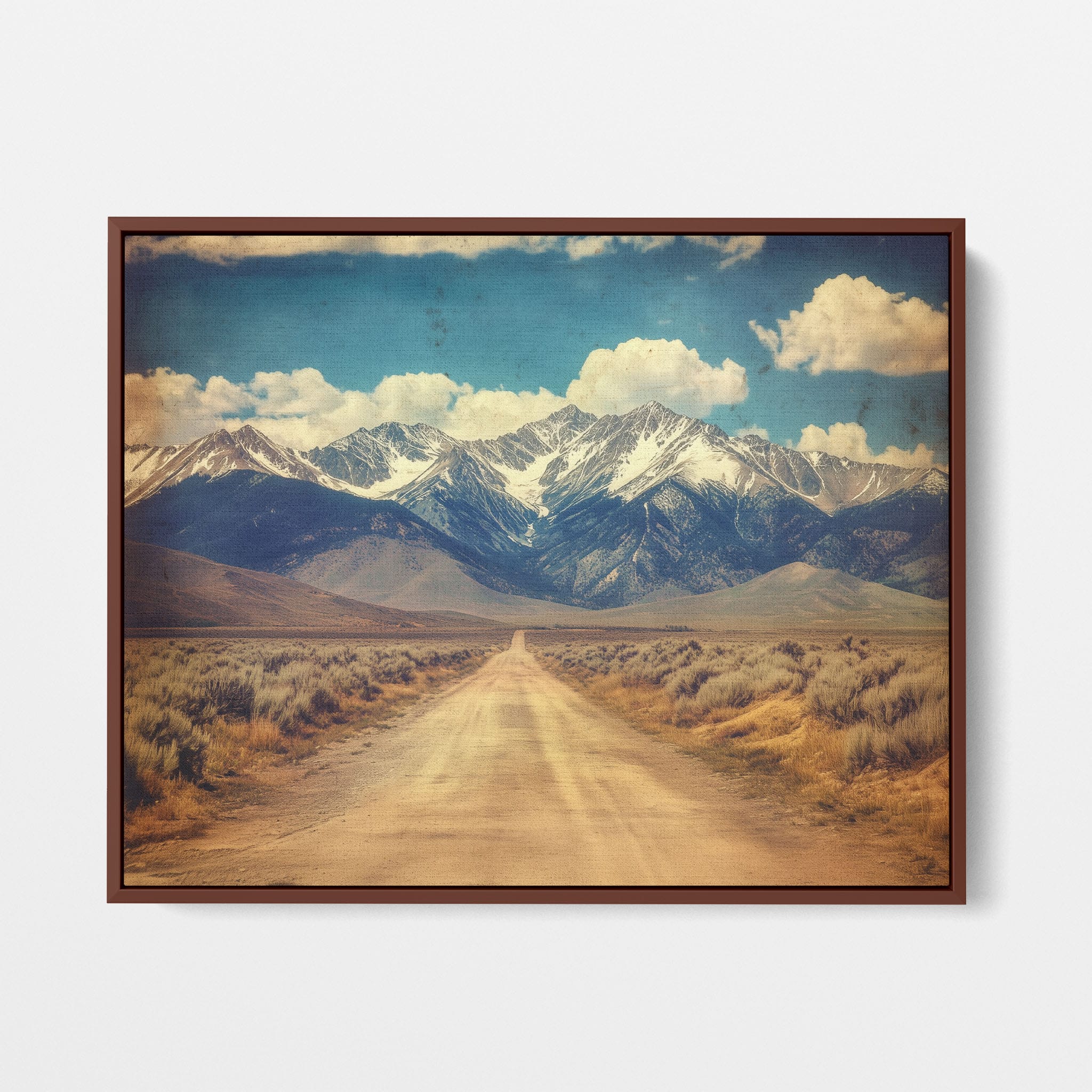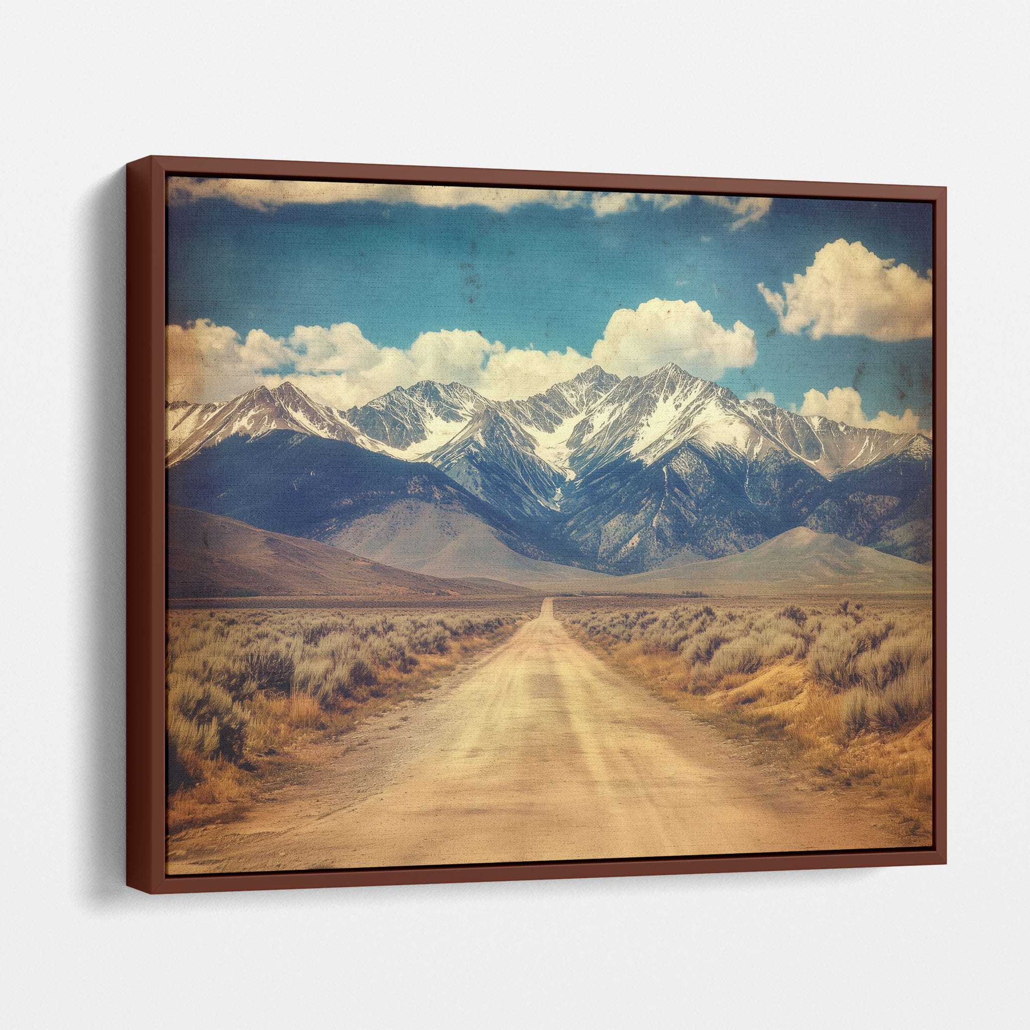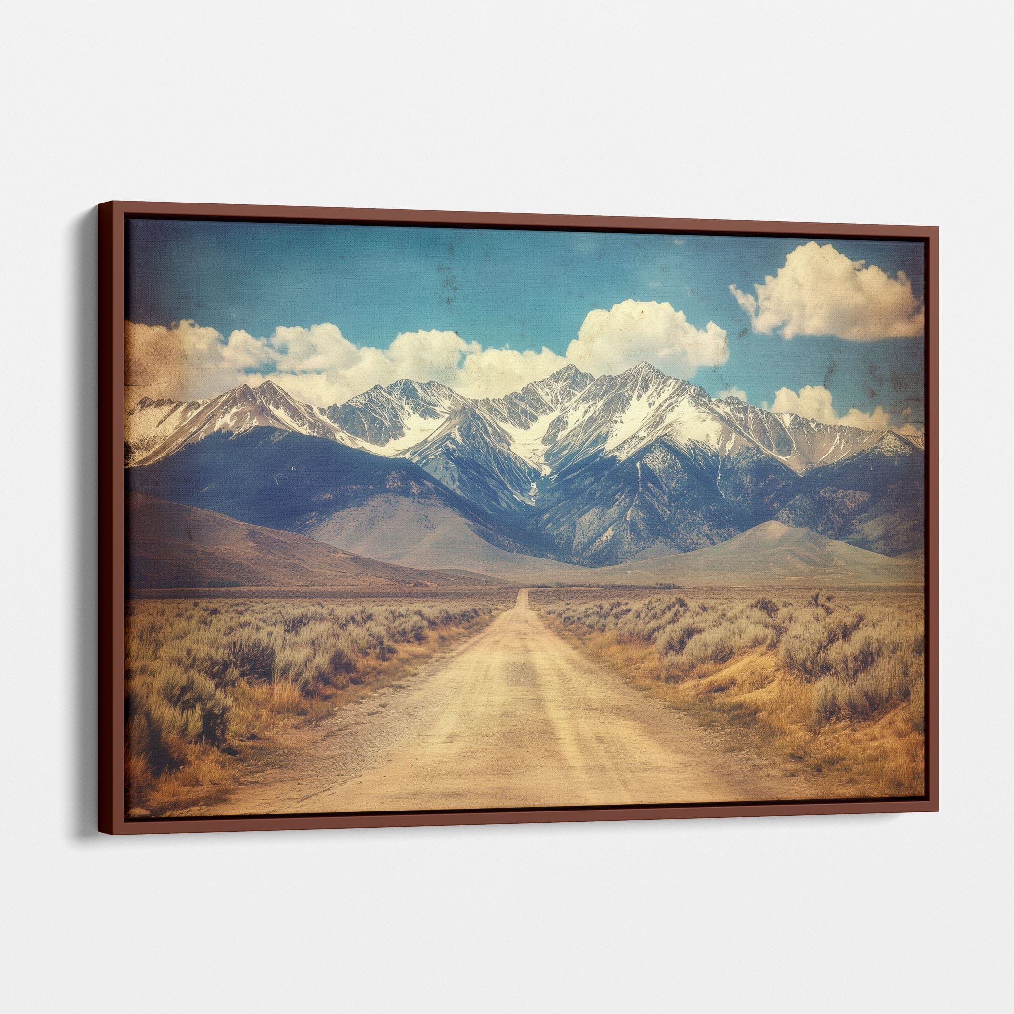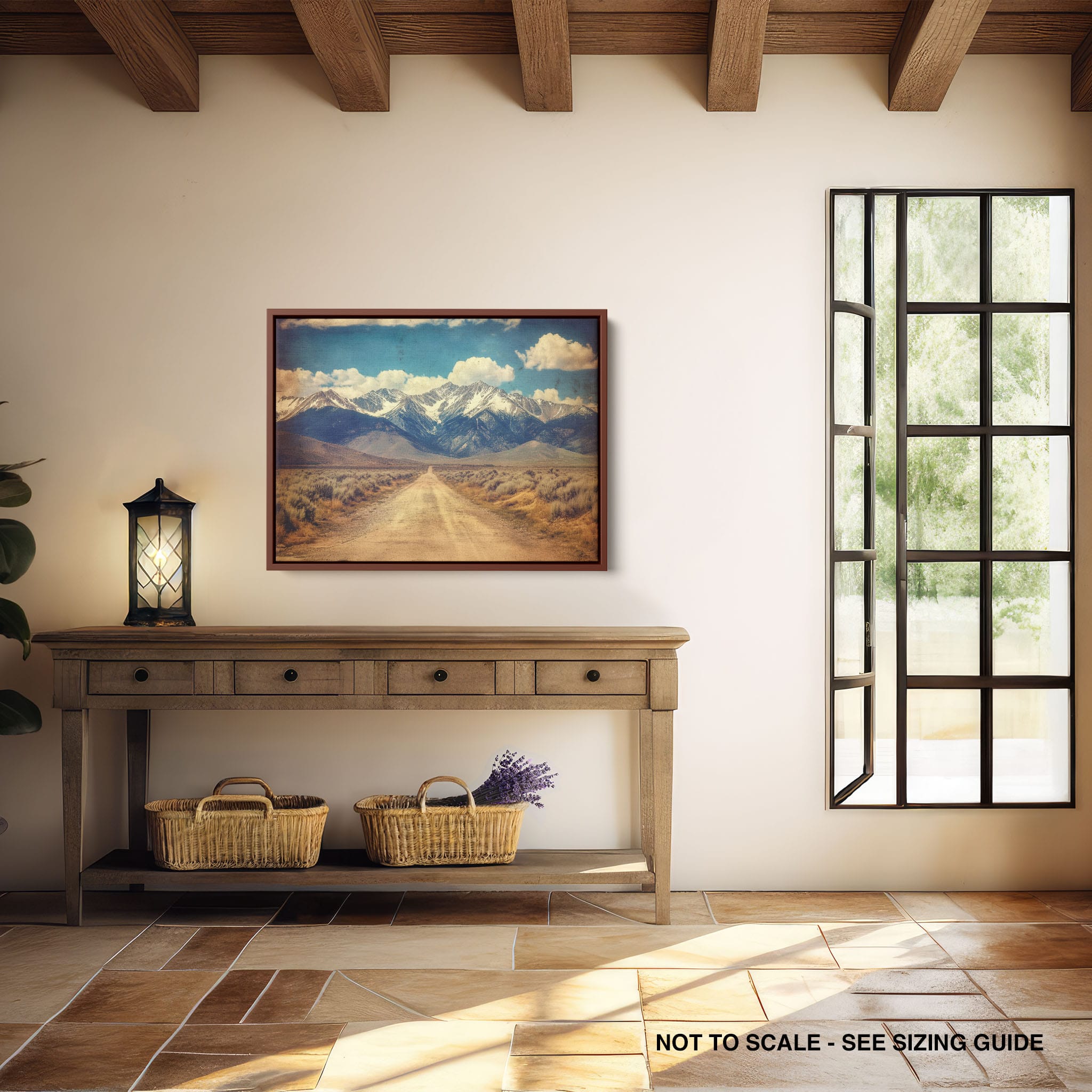 This breathtaking artwork captures a majestic view of a winding dirt path leading to a range of snow-capped mountains under a vibrant, cloudy sky. Highlighting the serenity of the wilderness, the image blends the rugged textures of the landscape with the dramatic beauty of the Sierra Nevada mountain range. With a subtle vintage filter, this digital photography piece evokes a nostalgic feel, perfect for those who cherish the natural world's untouched splendor. Ideal for adding a touch of rustic charm to any space, this landscape photography will transport you to the tranquil beauty of nature’s grandeur.