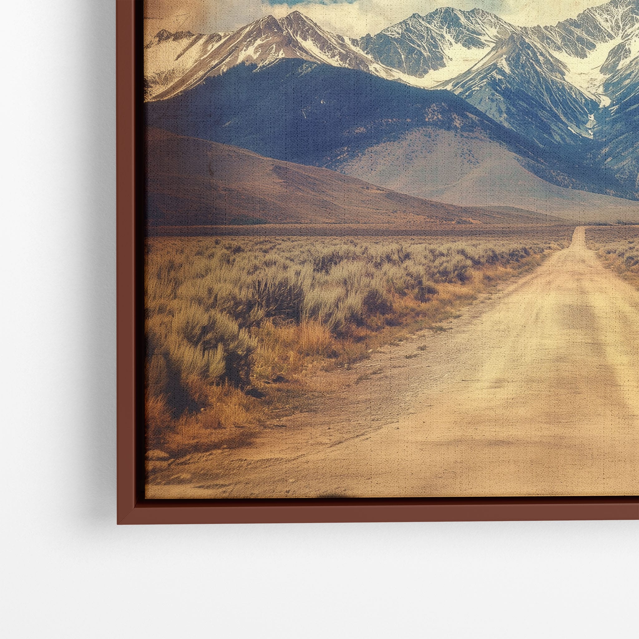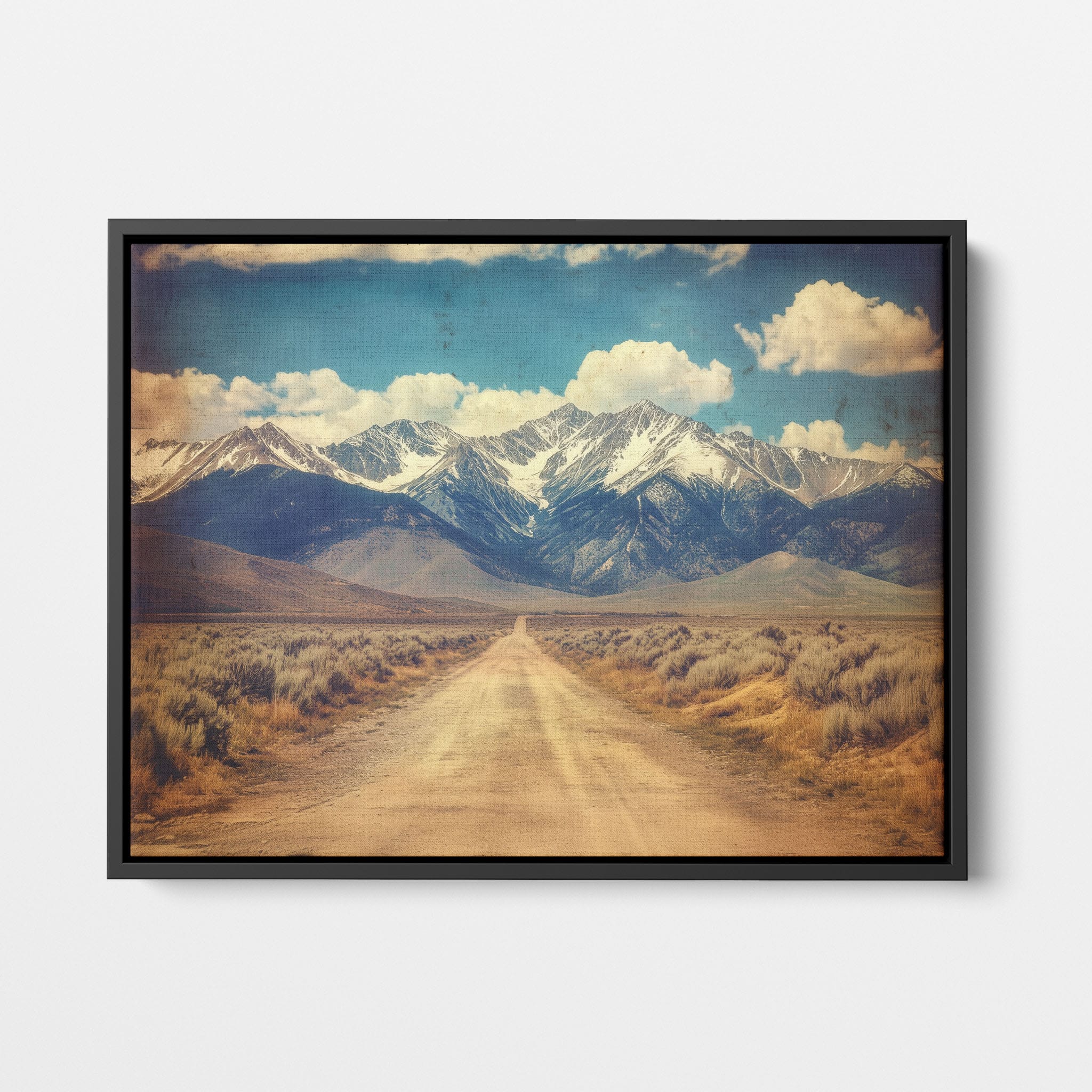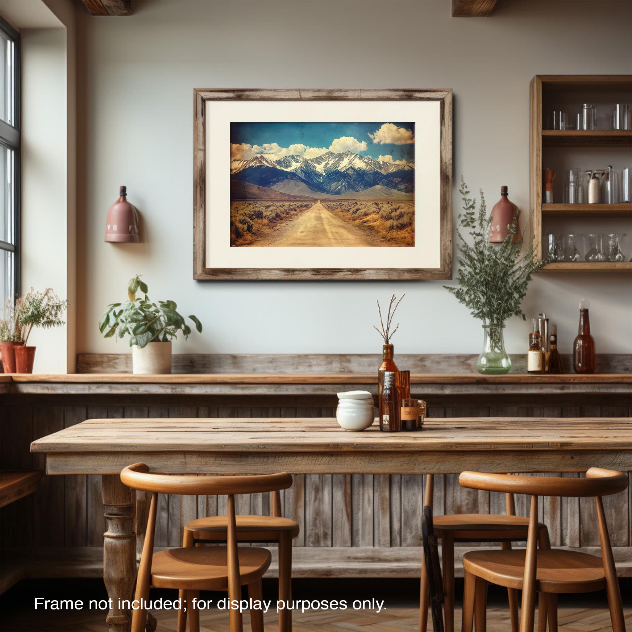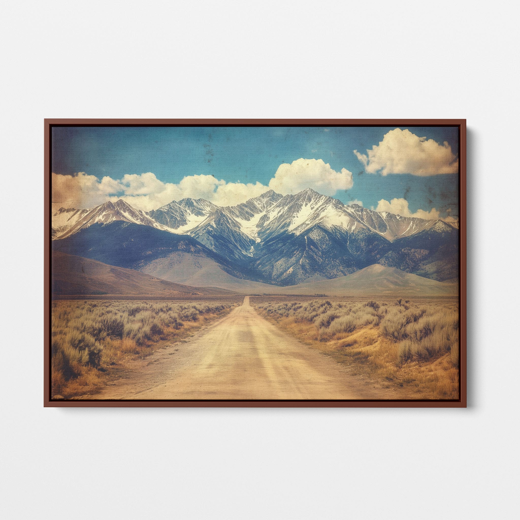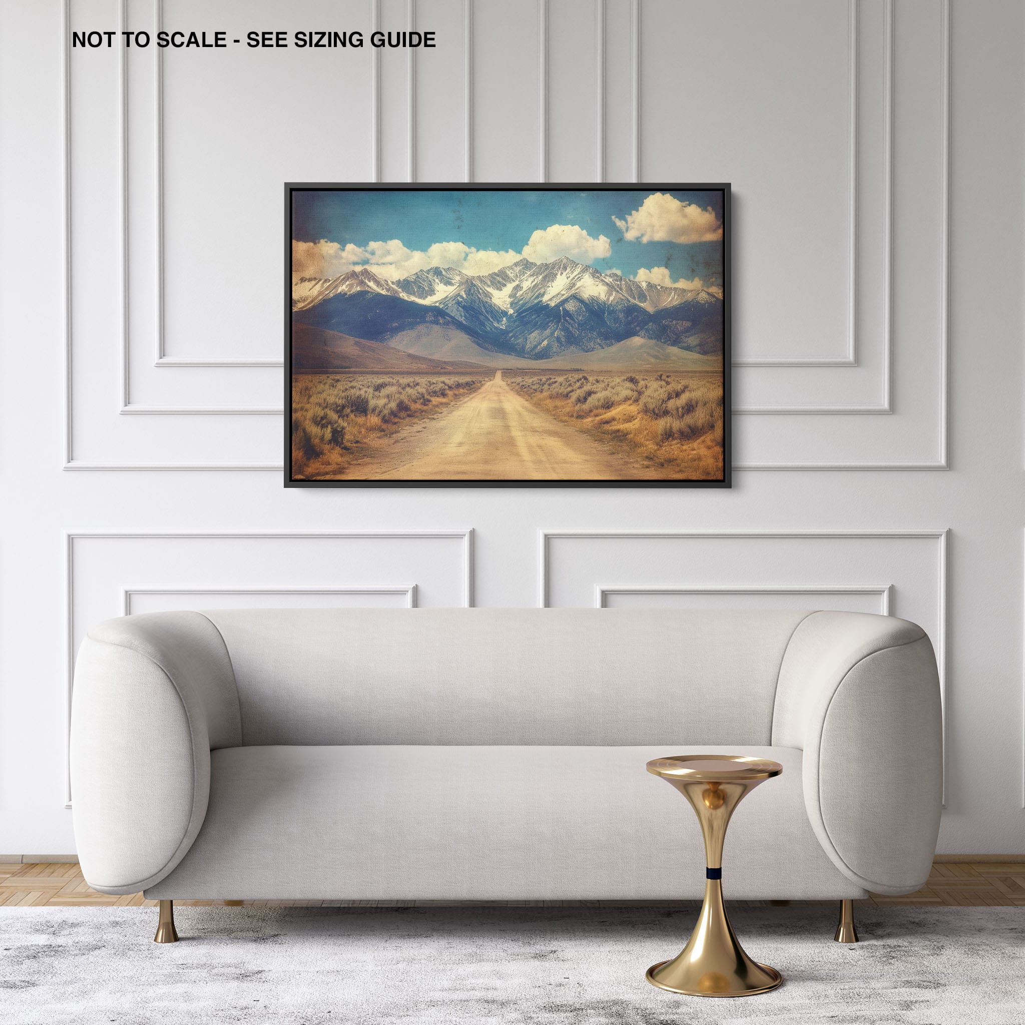 This breathtaking artwork captures a majestic view of a winding dirt path leading to a range of snow-capped mountains under a vibrant, cloudy sky. Highlighting the serenity of the wilderness, the image blends the rugged textures of the landscape with the dramatic beauty of the Sierra Nevada mountain range. With a subtle vintage filter, this digital photography piece evokes a nostalgic feel, perfect for those who cherish the natural world's untouched splendor. Ideal for adding a touch of rustic charm to any space, this landscape photography will transport you to the tranquil beauty of nature’s grandeur.