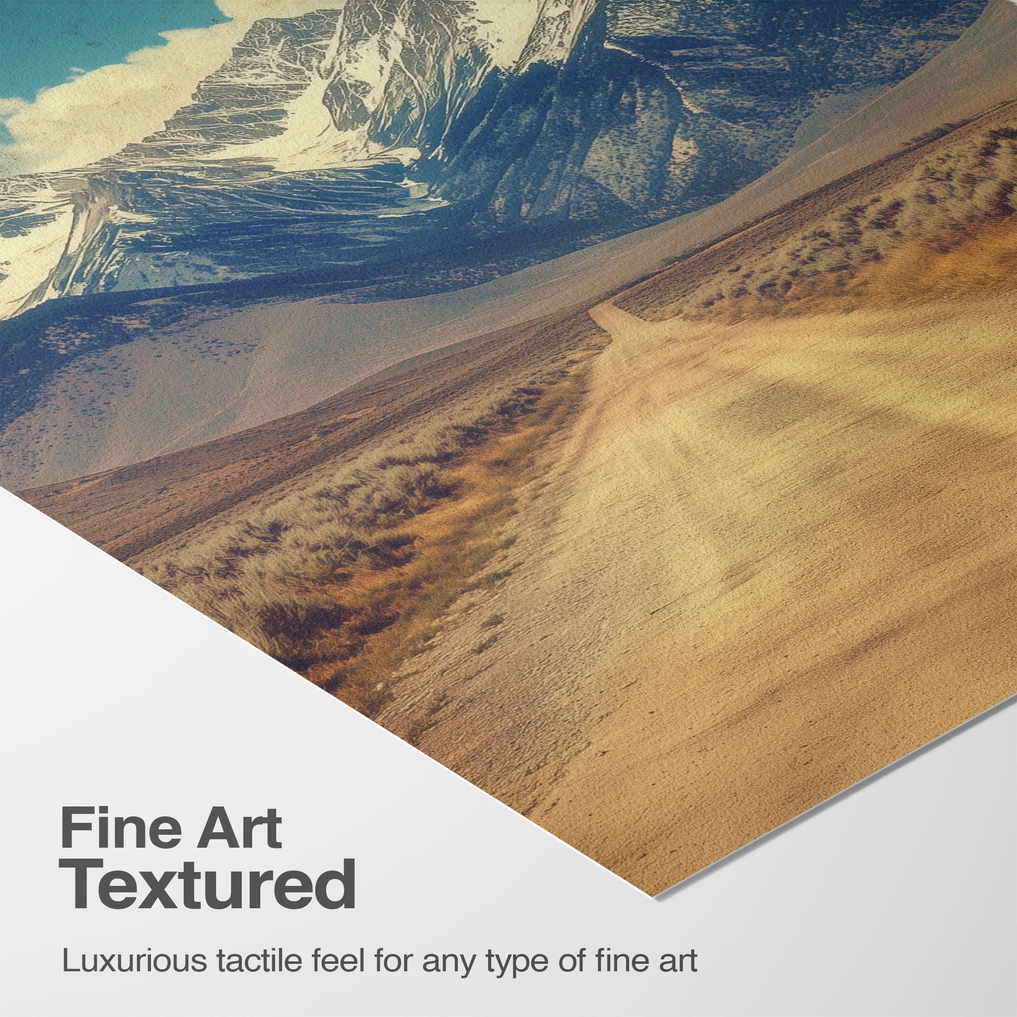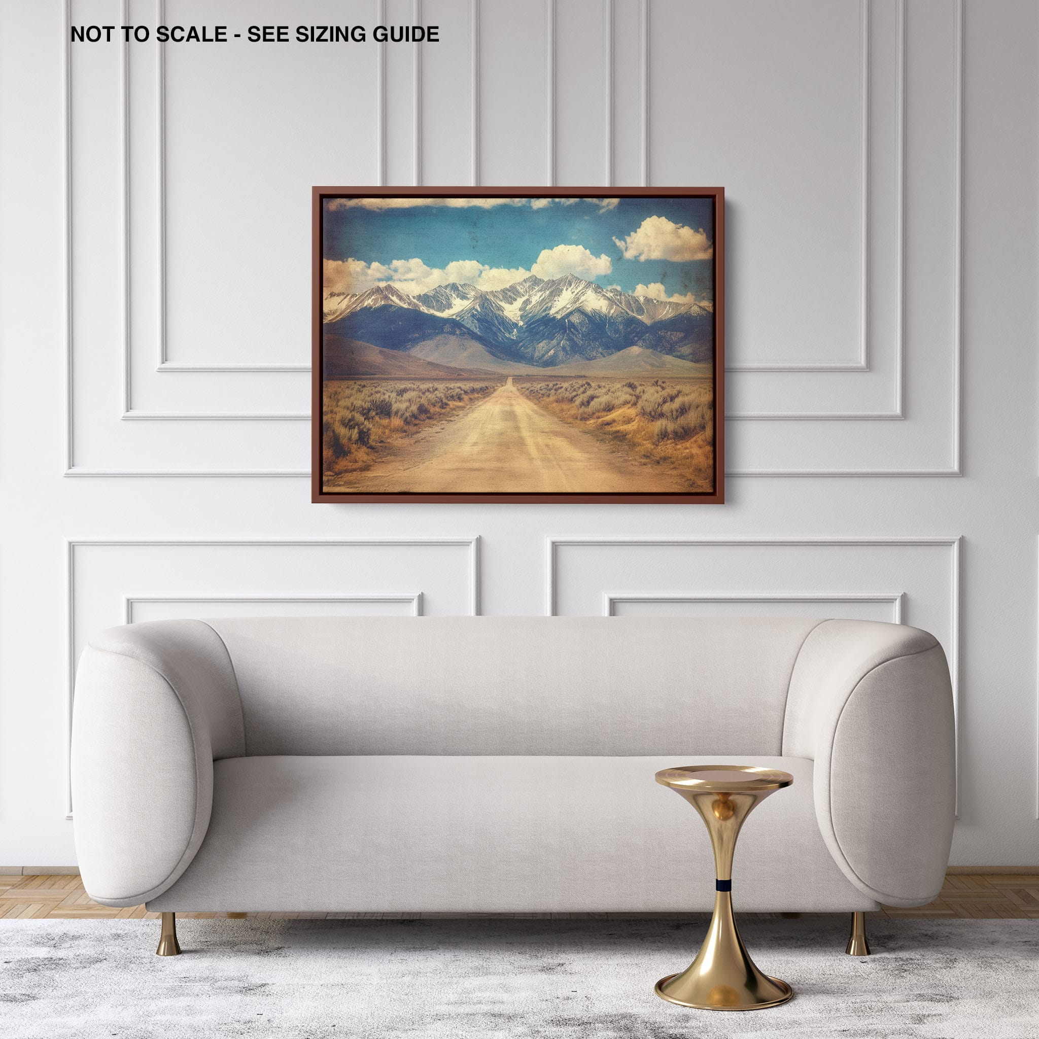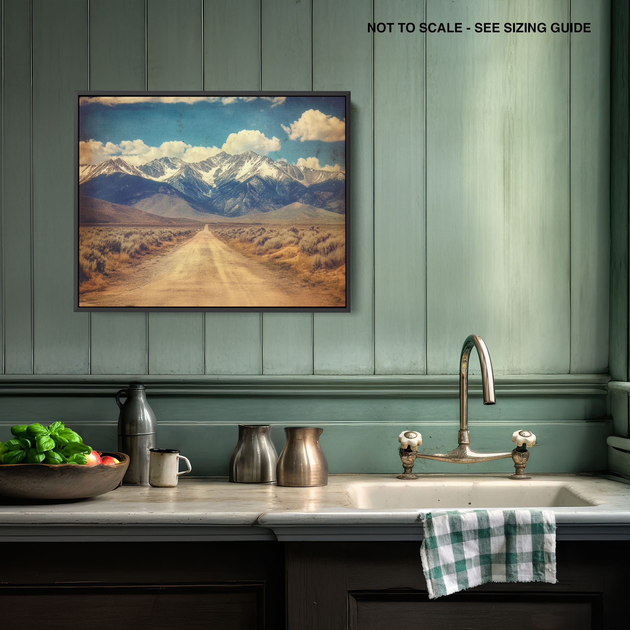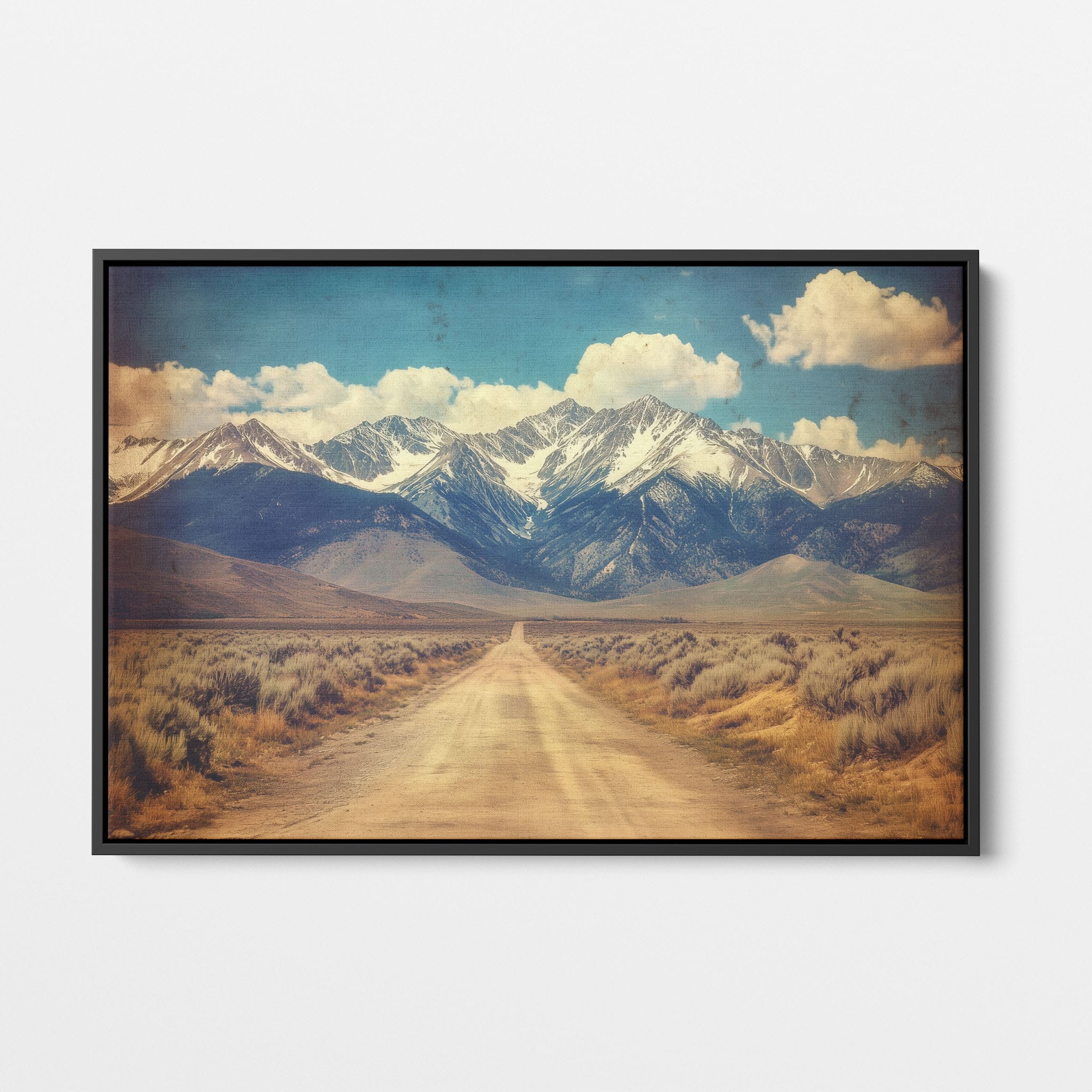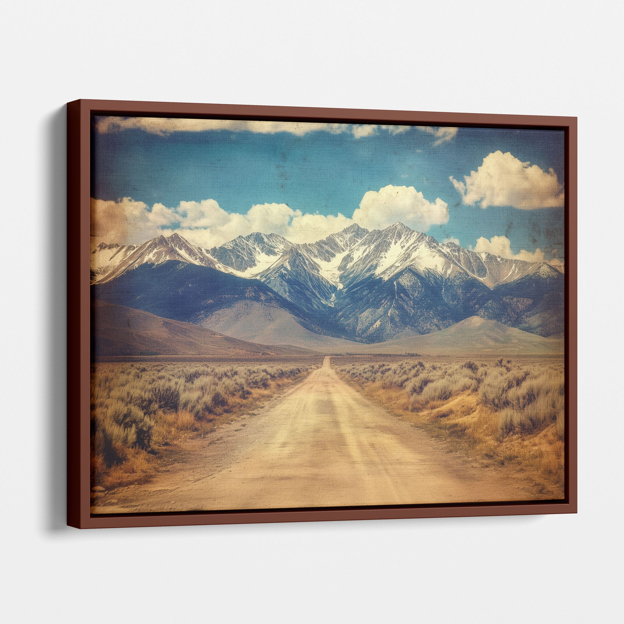 This breathtaking artwork captures a majestic view of a winding dirt path leading to a range of snow-capped mountains under a vibrant, cloudy sky. Highlighting the serenity of the wilderness, the image blends the rugged textures of the landscape with the dramatic beauty of the Sierra Nevada mountain range. With a subtle vintage filter, this digital photography piece evokes a nostalgic feel, perfect for those who cherish the natural world's untouched splendor. Ideal for adding a touch of rustic charm to any space, this landscape photography will transport you to the tranquil beauty of nature’s grandeur.