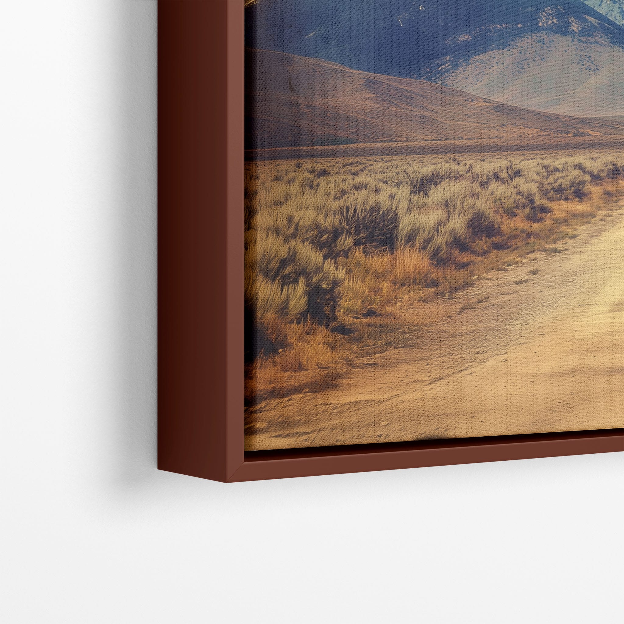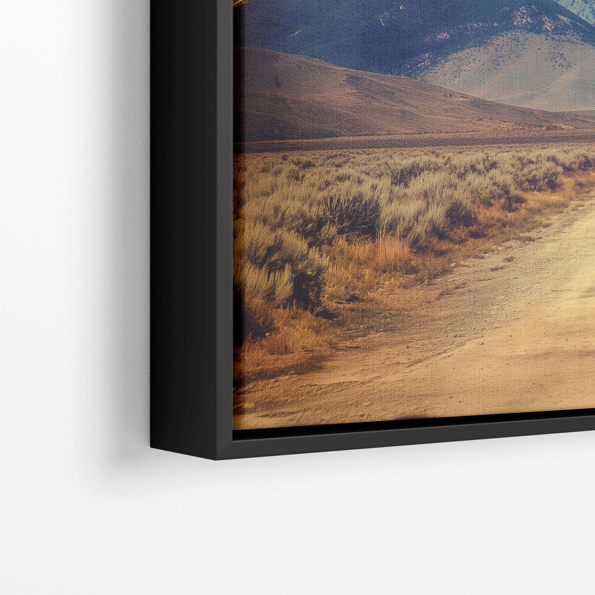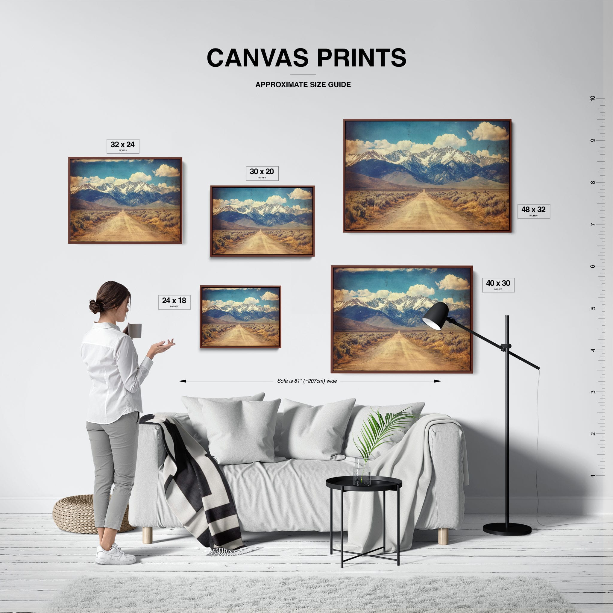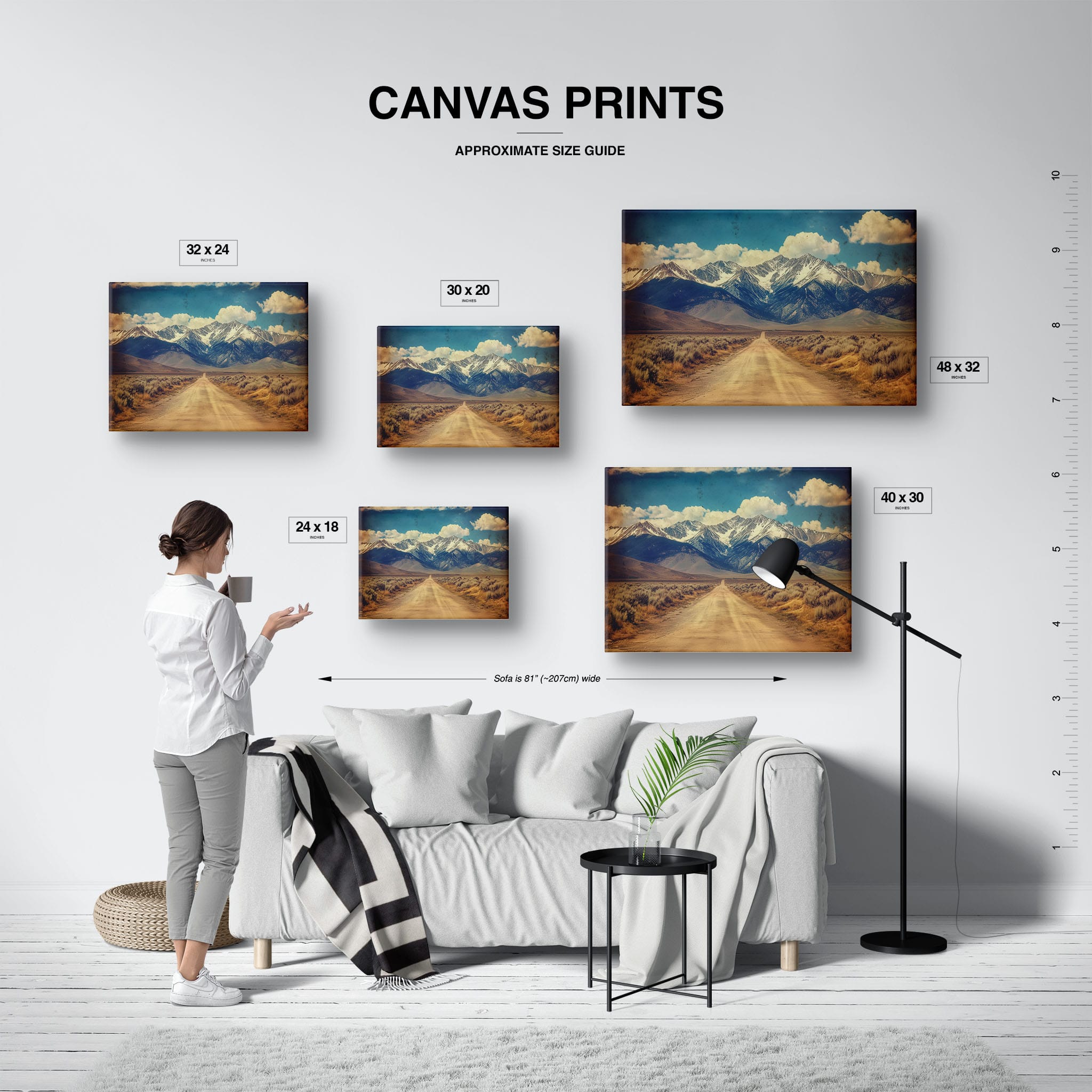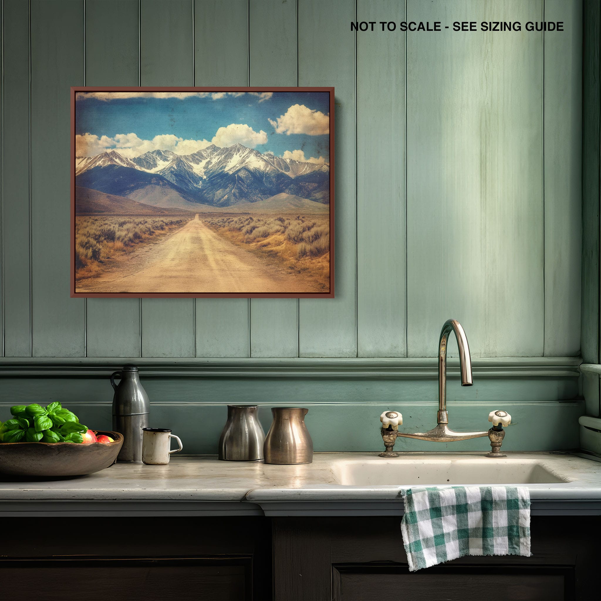 This breathtaking artwork captures a majestic view of a winding dirt path leading to a range of snow-capped mountains under a vibrant, cloudy sky. Highlighting the serenity of the wilderness, the image blends the rugged textures of the landscape with the dramatic beauty of the Sierra Nevada mountain range. With a subtle vintage filter, this digital photography piece evokes a nostalgic feel, perfect for those who cherish the natural world's untouched splendor. Ideal for adding a touch of rustic charm to any space, this landscape photography will transport you to the tranquil beauty of nature’s grandeur.
