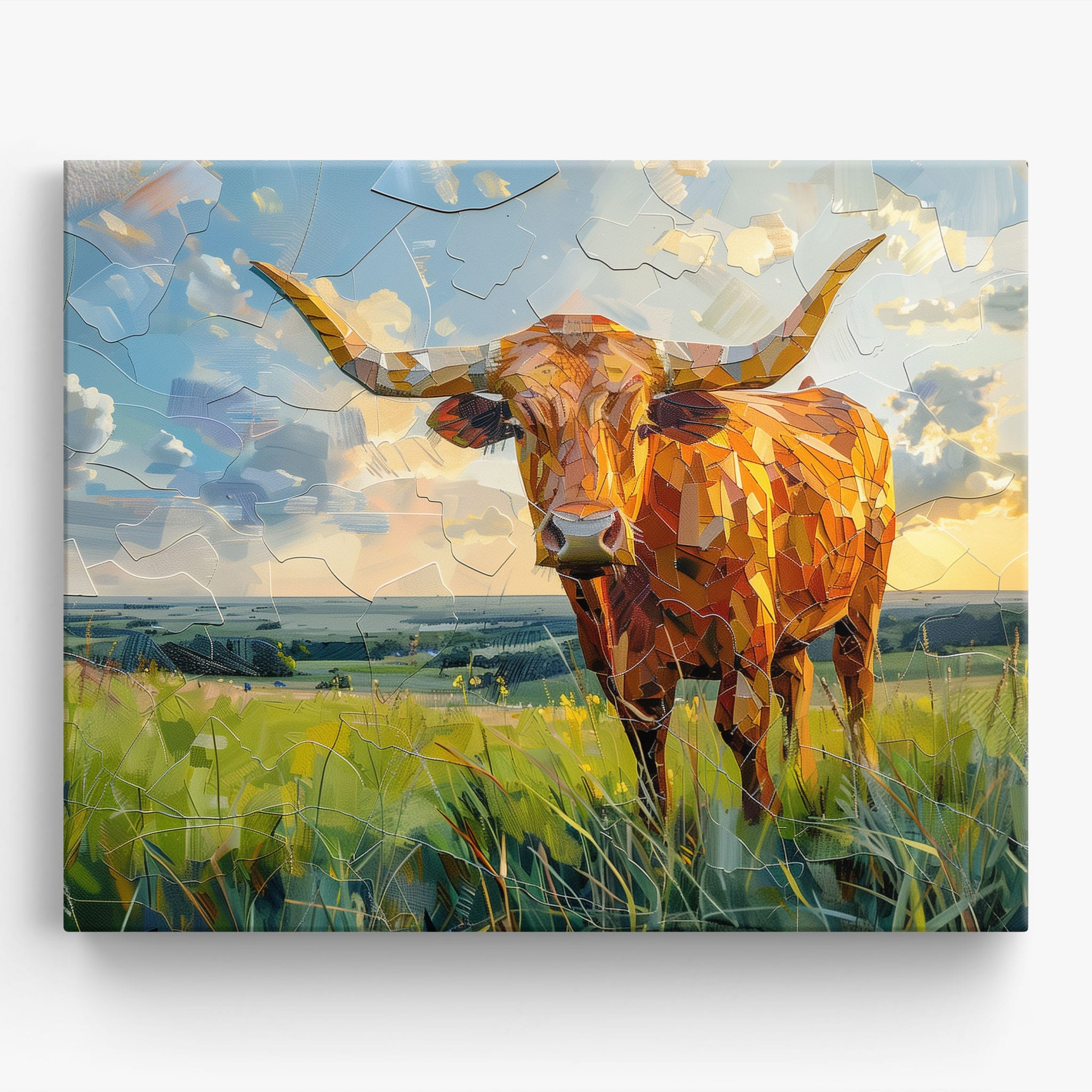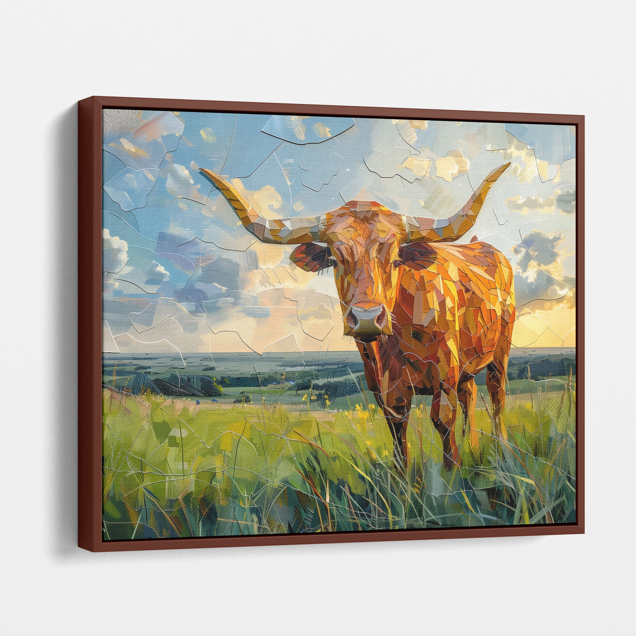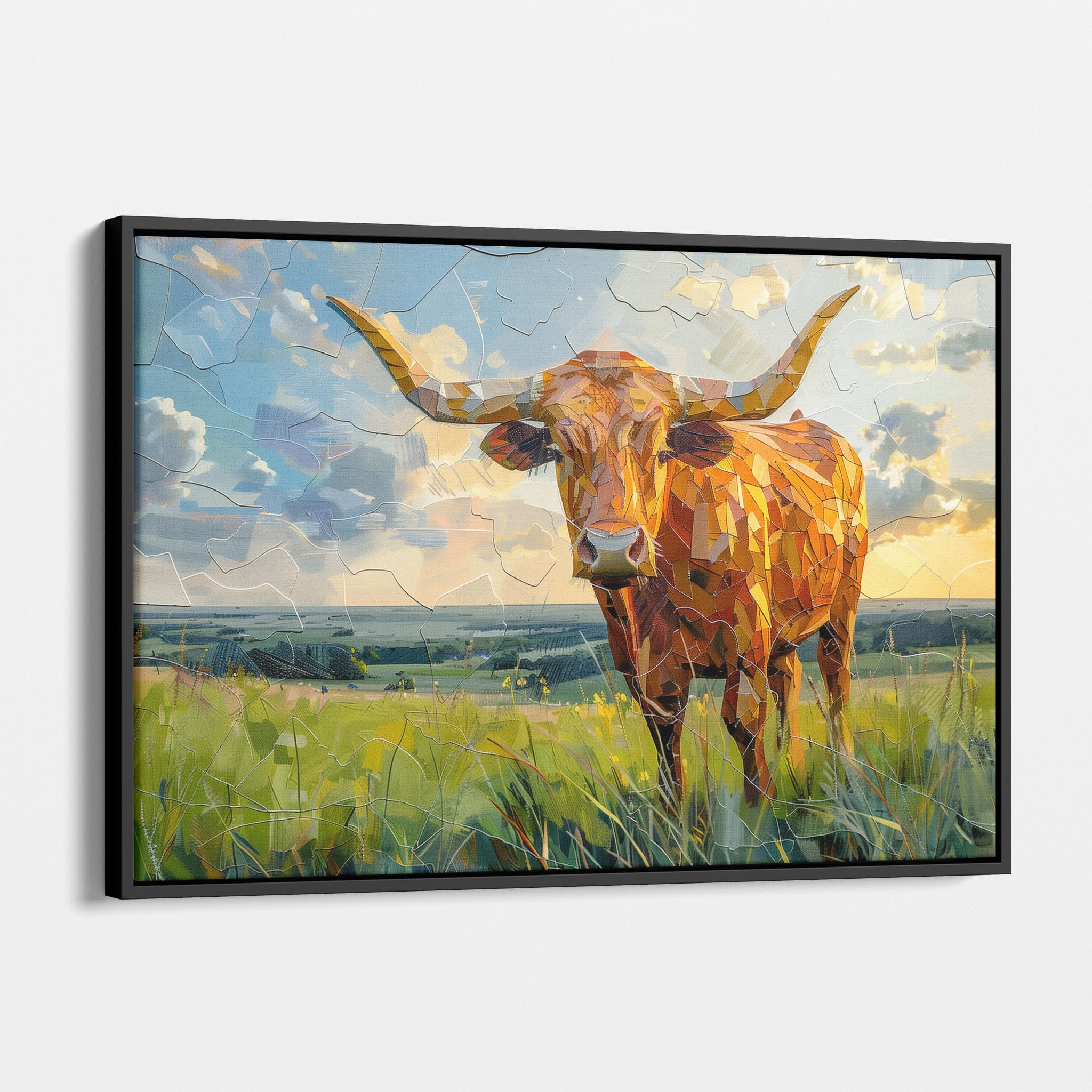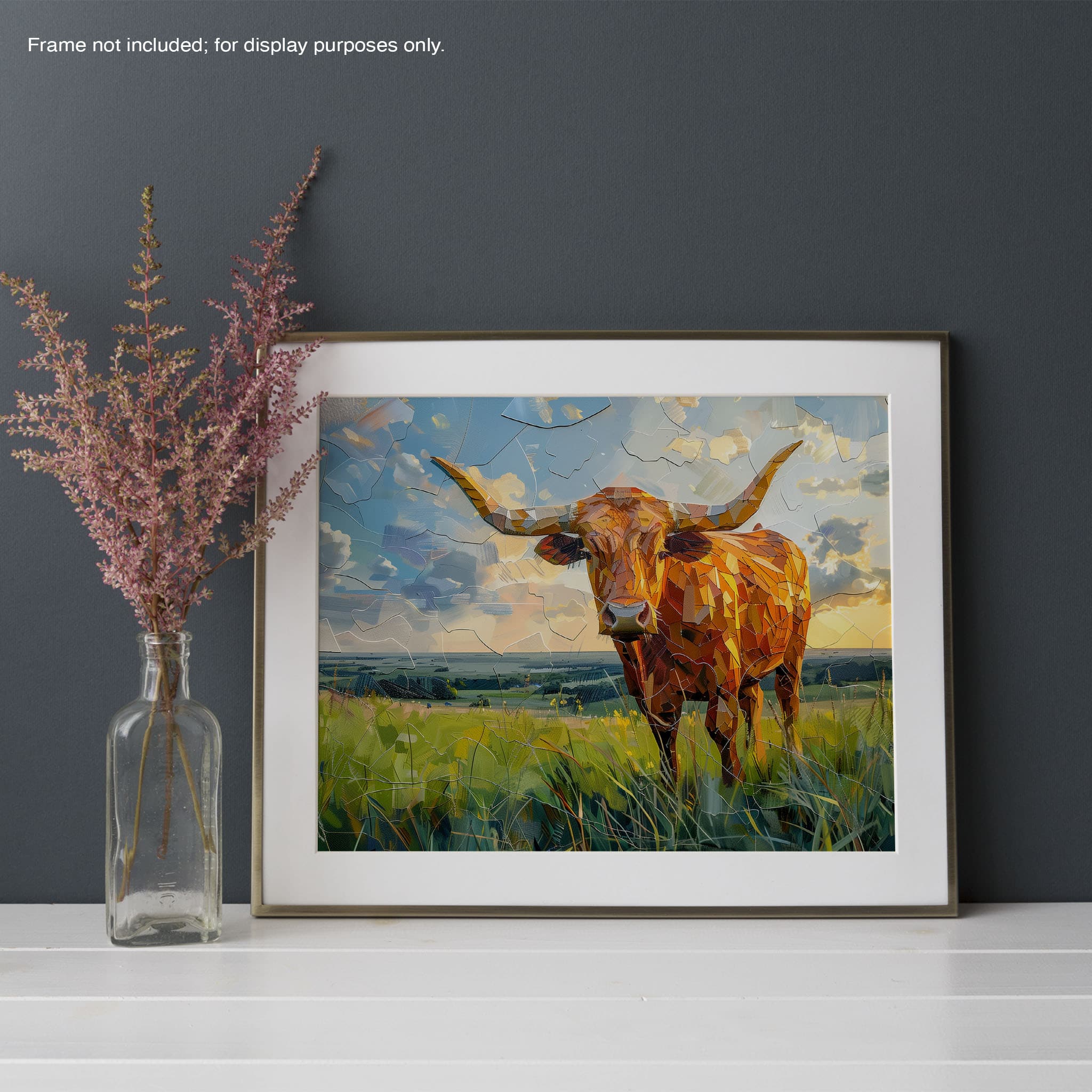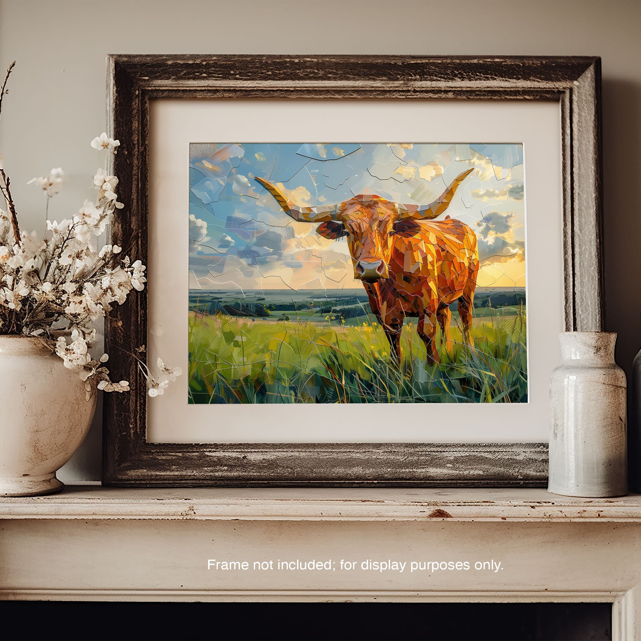 Transport yourself to the tranquil expanse of a sun-drenched pasture with this stunning digital illustration of a majestic longhorn steer. Utilizing vibrant mosaic-like textures and rich earth-tone colors, this piece beautifully captures the vitality of rural life. With a striking interplay of light and shadow, this artwork epitomizes the harmony between nature and wildlife, blending contemporary mosaic techniques with the timeless charm of the pastoral countryside. Perfect for animal art enthusiasts and collectors of modern rural motifs, this eye-catching piece is a must-have for transforming your space. Keywords: digital illustration, mosaic, contemporary, pastoral, longhorn steer, rural life.