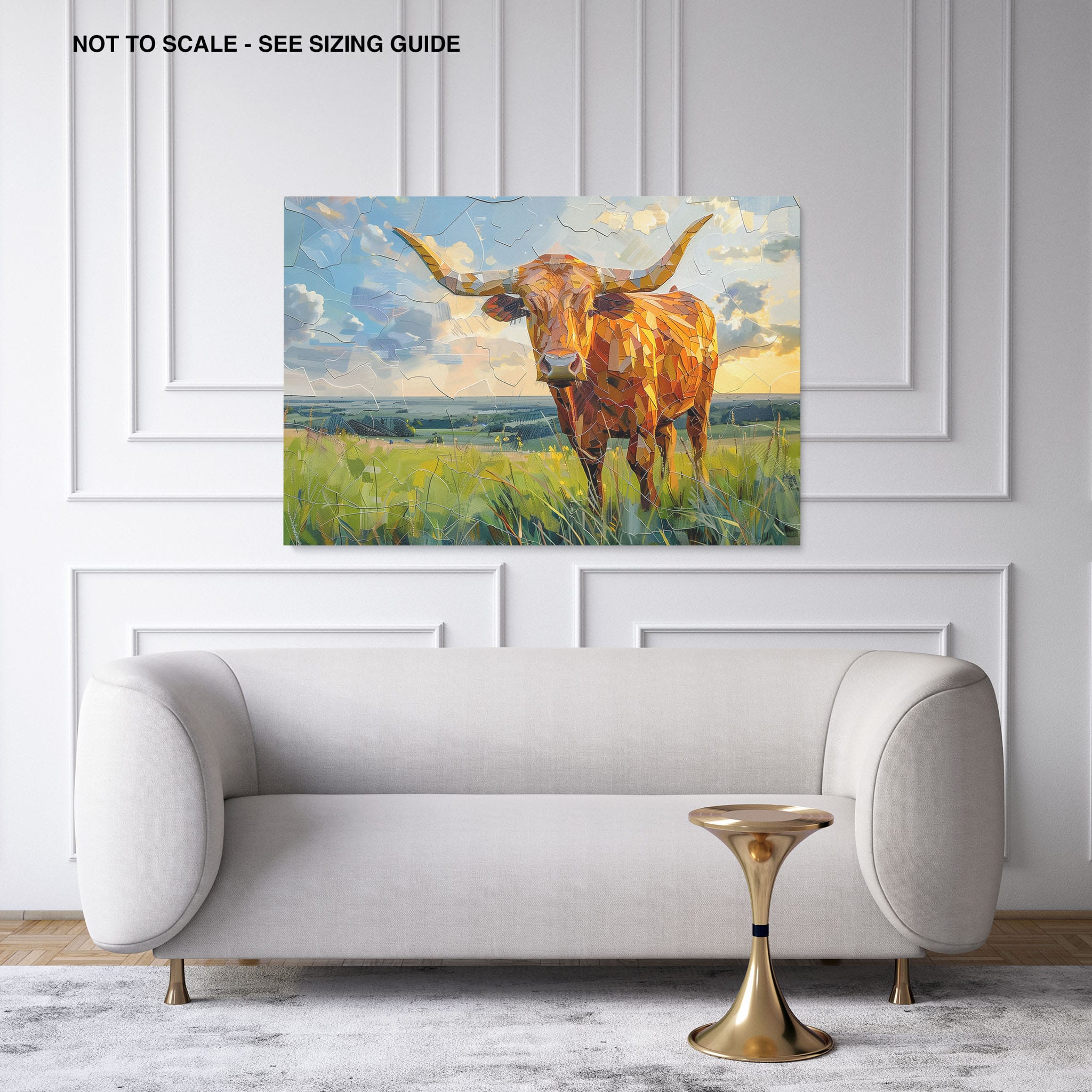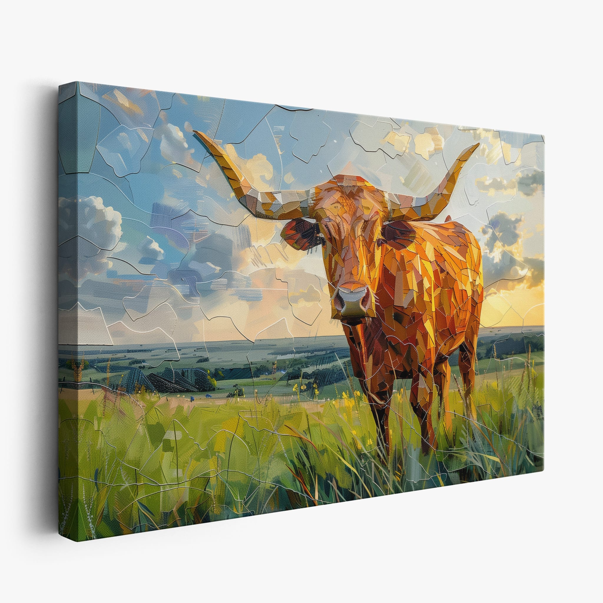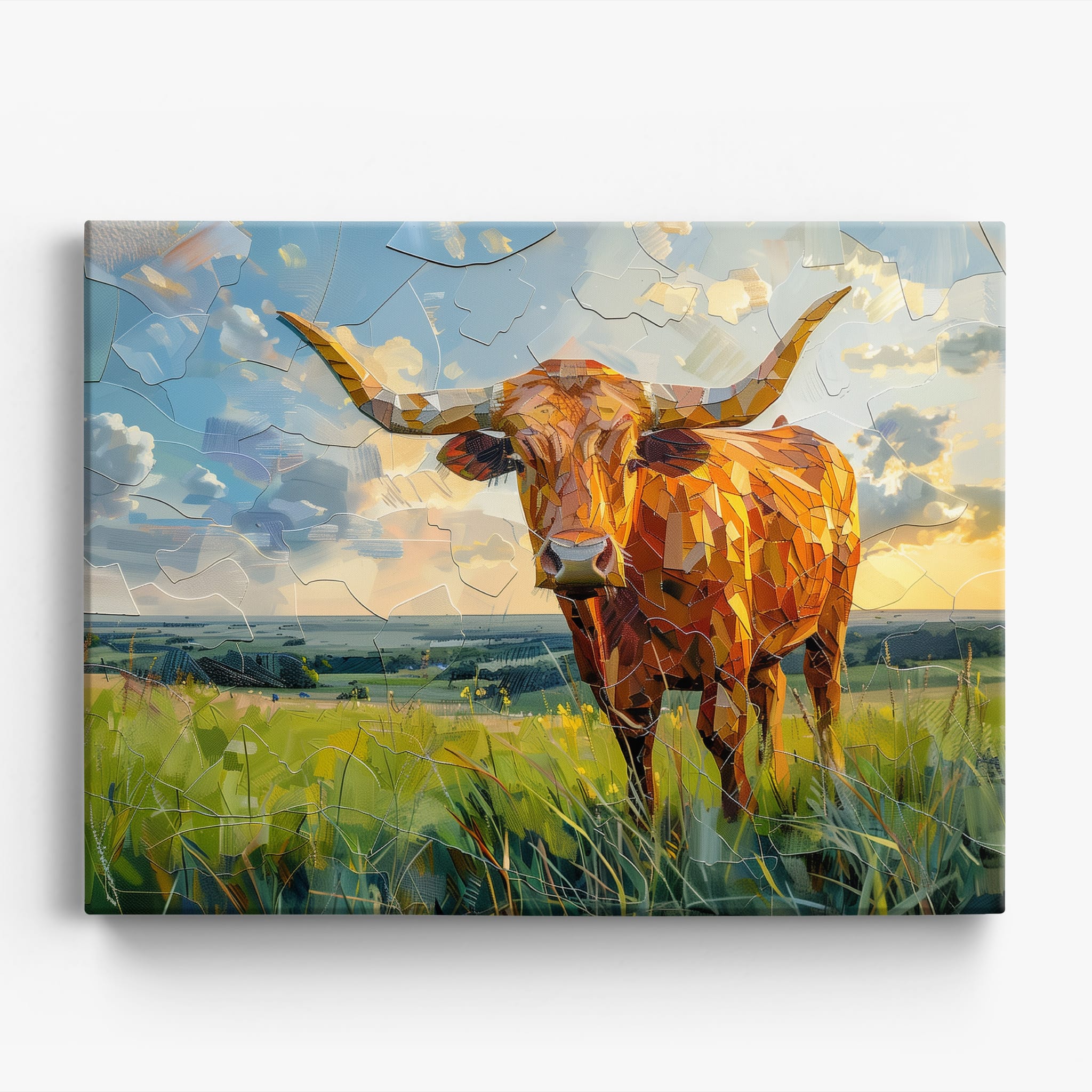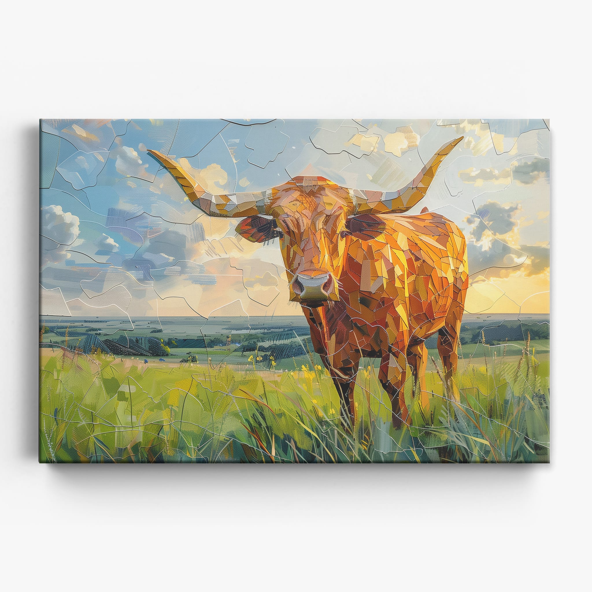 Transport yourself to the tranquil expanse of a sun-drenched pasture with this stunning digital illustration of a majestic longhorn steer. Utilizing vibrant mosaic-like textures and rich earth-tone colors, this piece beautifully captures the vitality of rural life. With a striking interplay of light and shadow, this artwork epitomizes the harmony between nature and wildlife, blending contemporary mosaic techniques with the timeless charm of the pastoral countryside. Perfect for animal art enthusiasts and collectors of modern rural motifs, this eye-catching piece is a must-have for transforming your space. Keywords: digital illustration, mosaic, contemporary, pastoral, longhorn steer, rural life.
