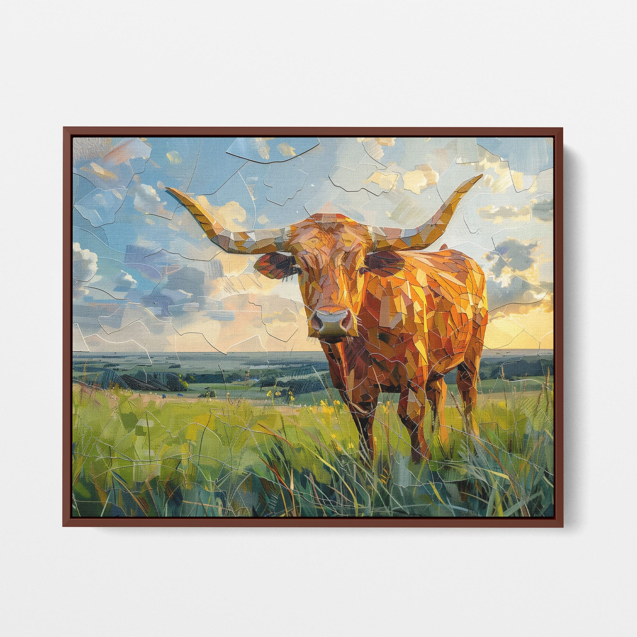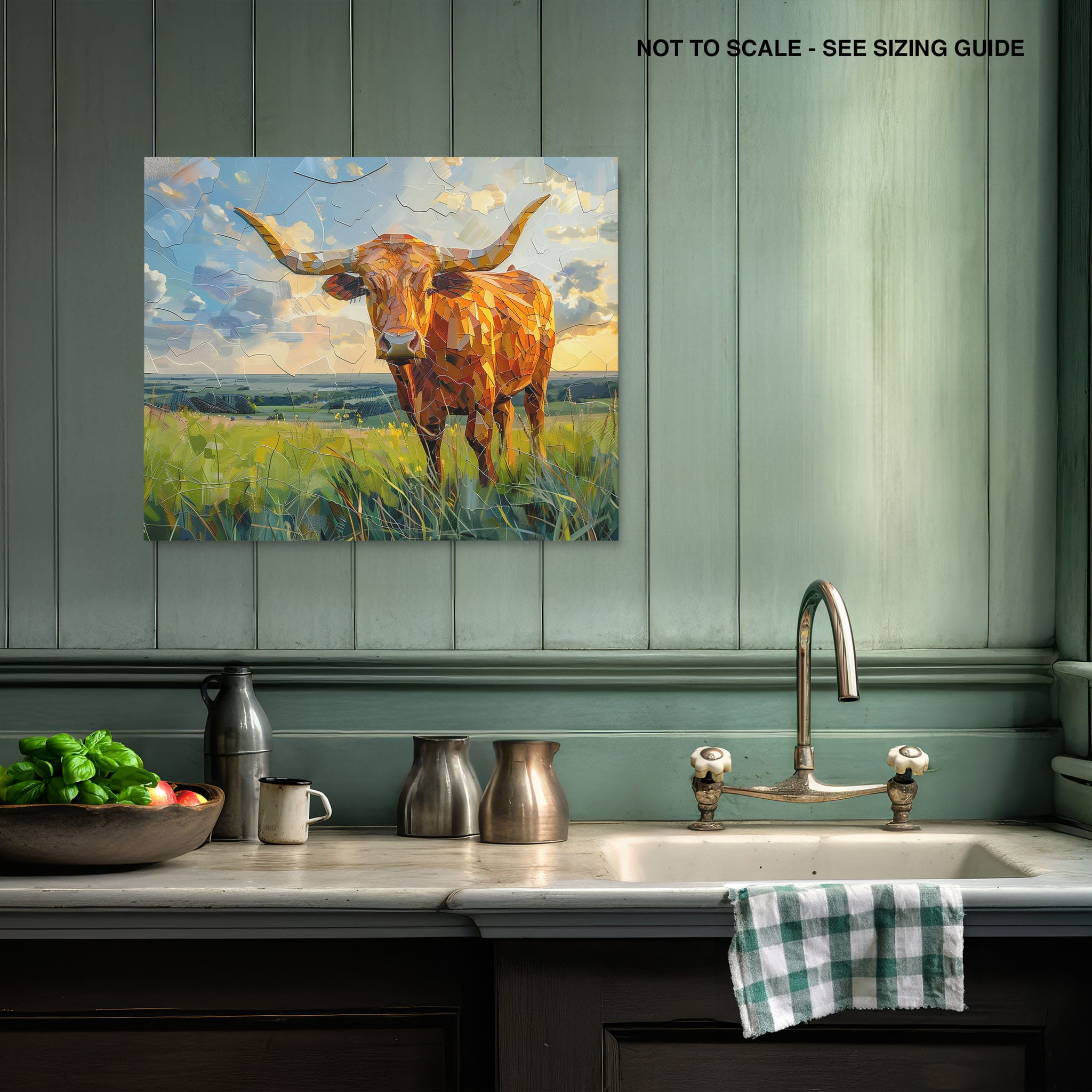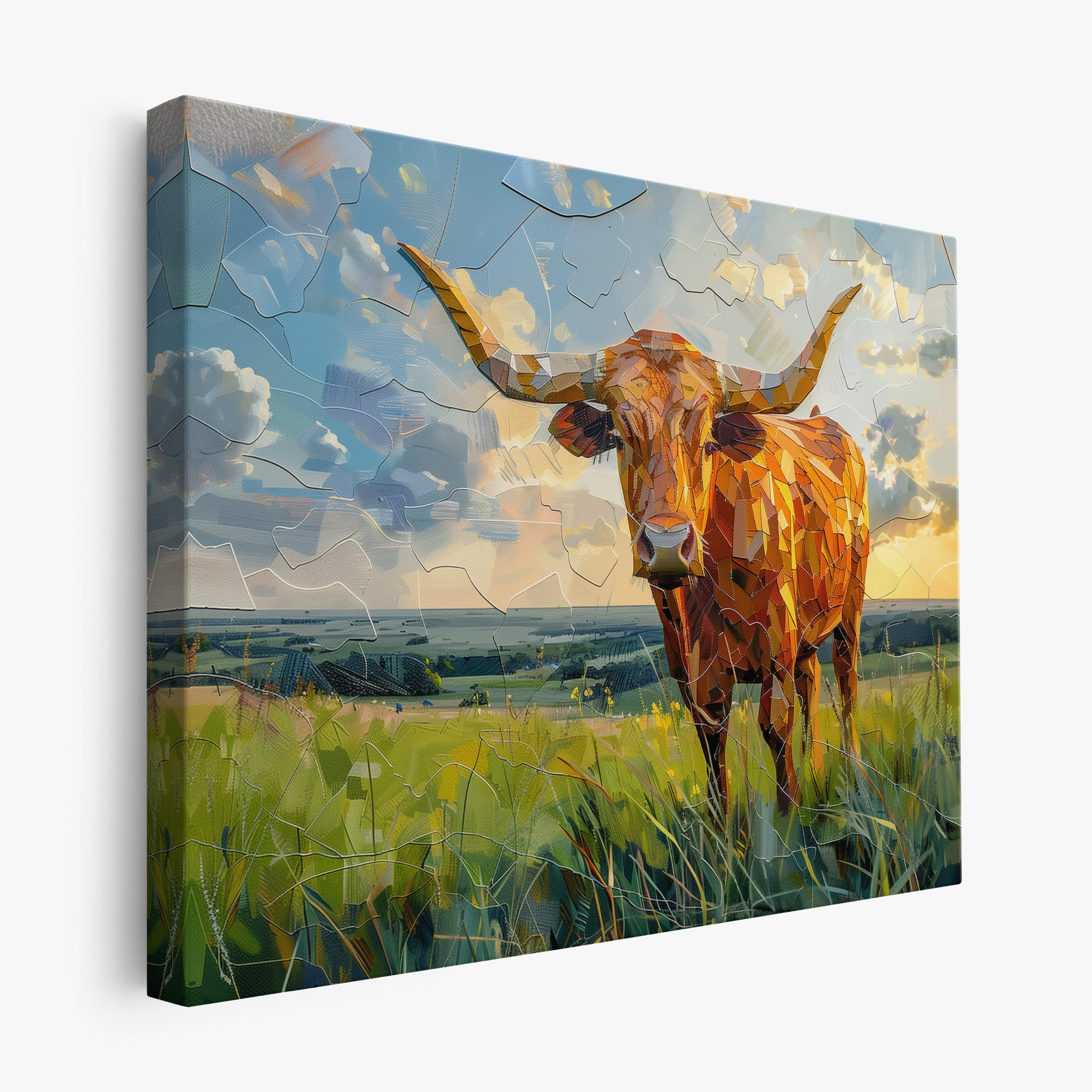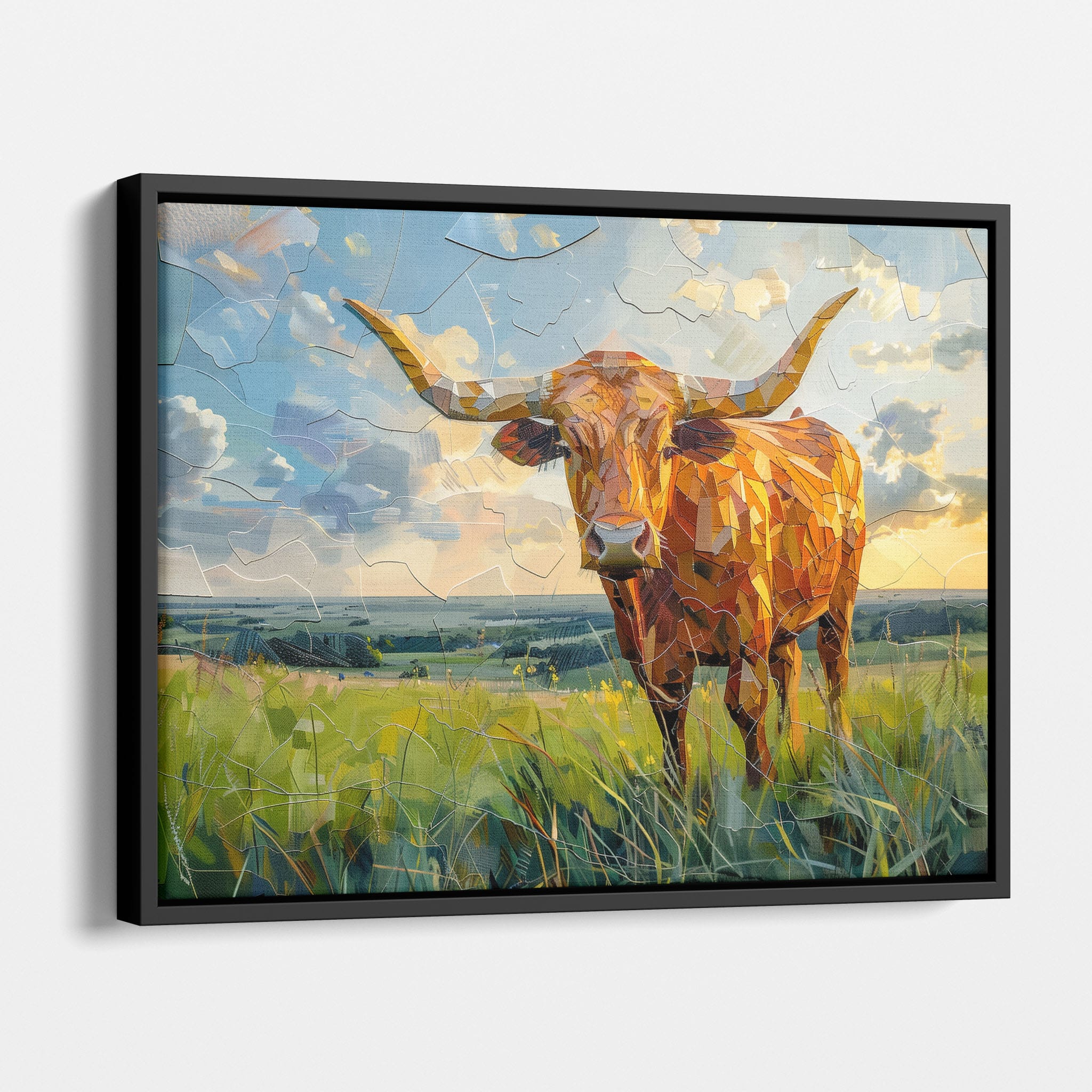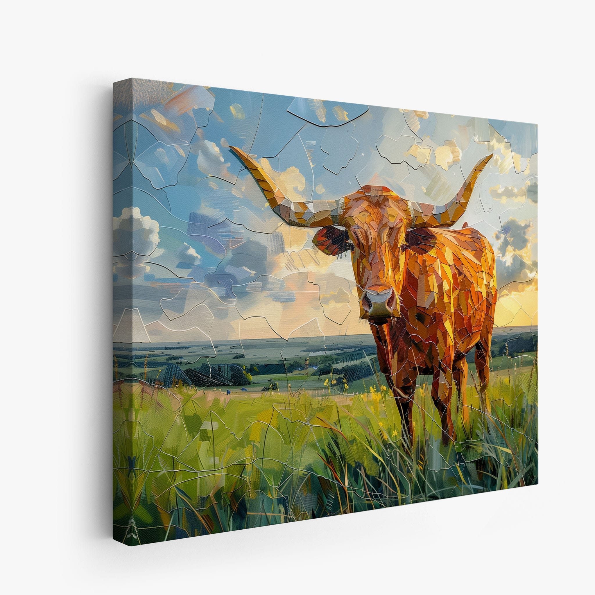 Transport yourself to the tranquil expanse of a sun-drenched pasture with this stunning digital illustration of a majestic longhorn steer. Utilizing vibrant mosaic-like textures and rich earth-tone colors, this piece beautifully captures the vitality of rural life. With a striking interplay of light and shadow, this artwork epitomizes the harmony between nature and wildlife, blending contemporary mosaic techniques with the timeless charm of the pastoral countryside. Perfect for animal art enthusiasts and collectors of modern rural motifs, this eye-catching piece is a must-have for transforming your space. Keywords: digital illustration, mosaic, contemporary, pastoral, longhorn steer, rural life.