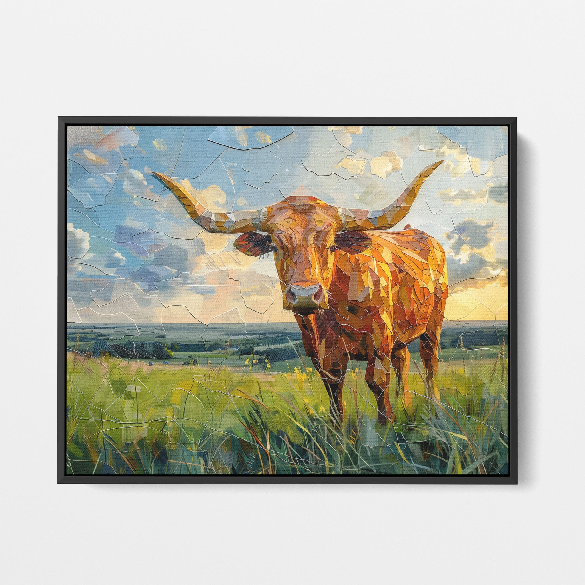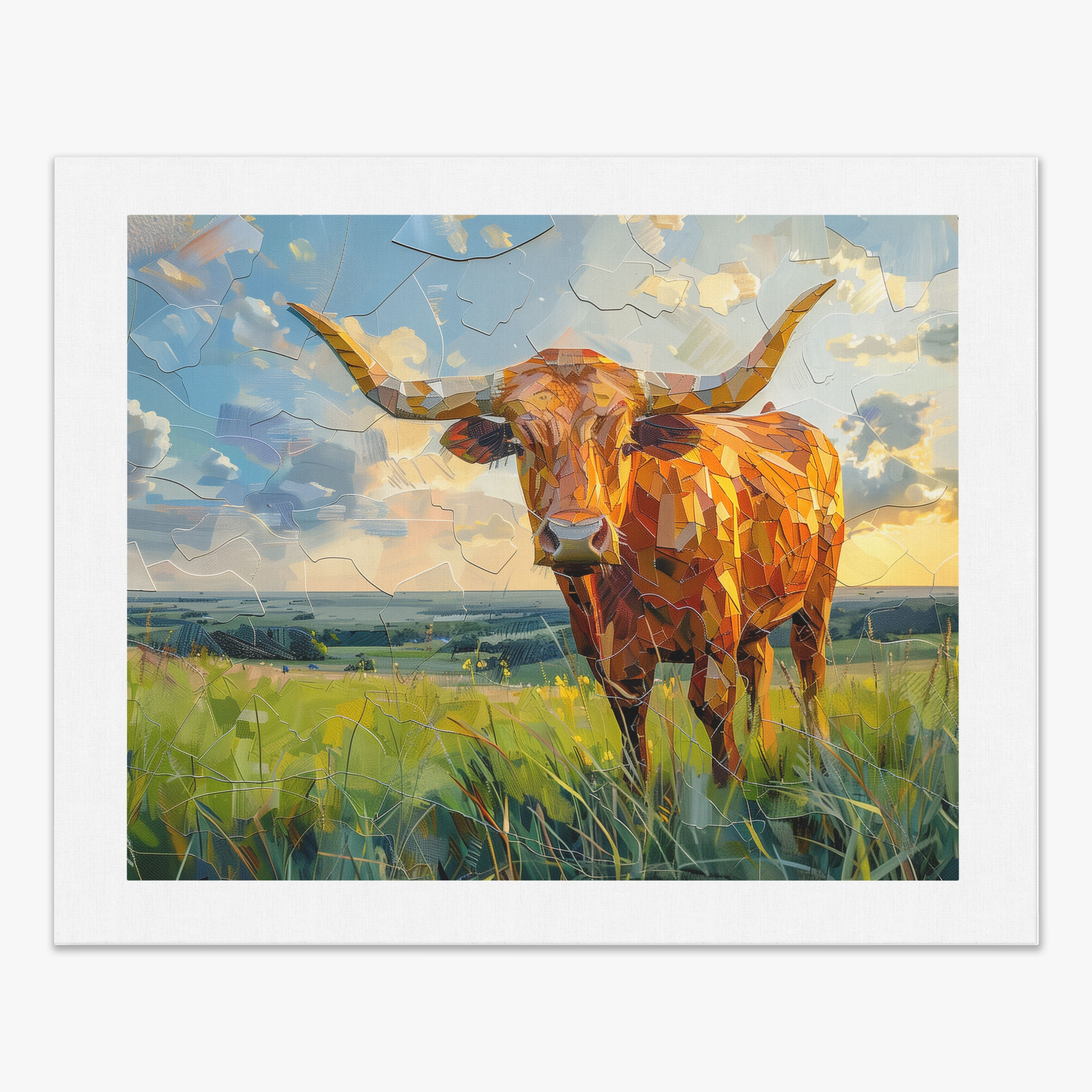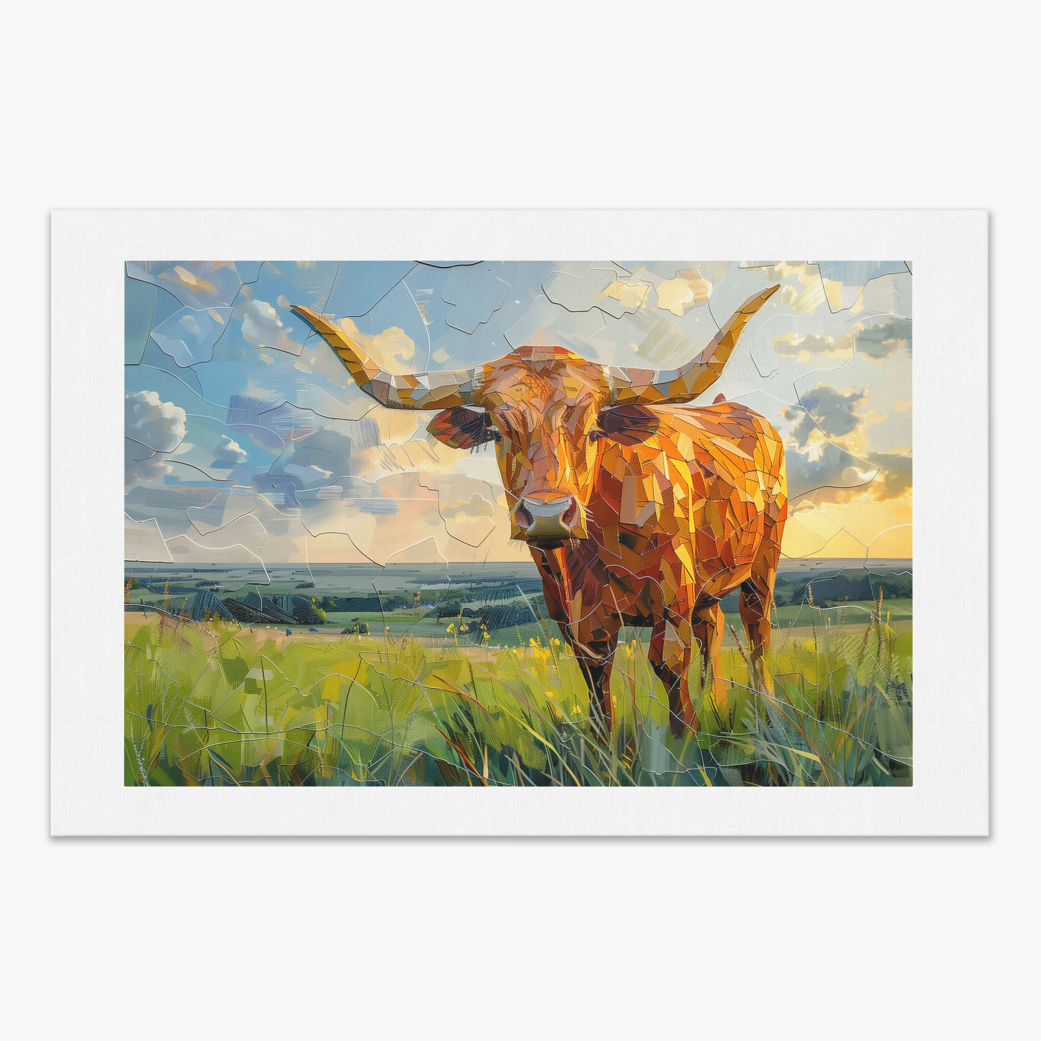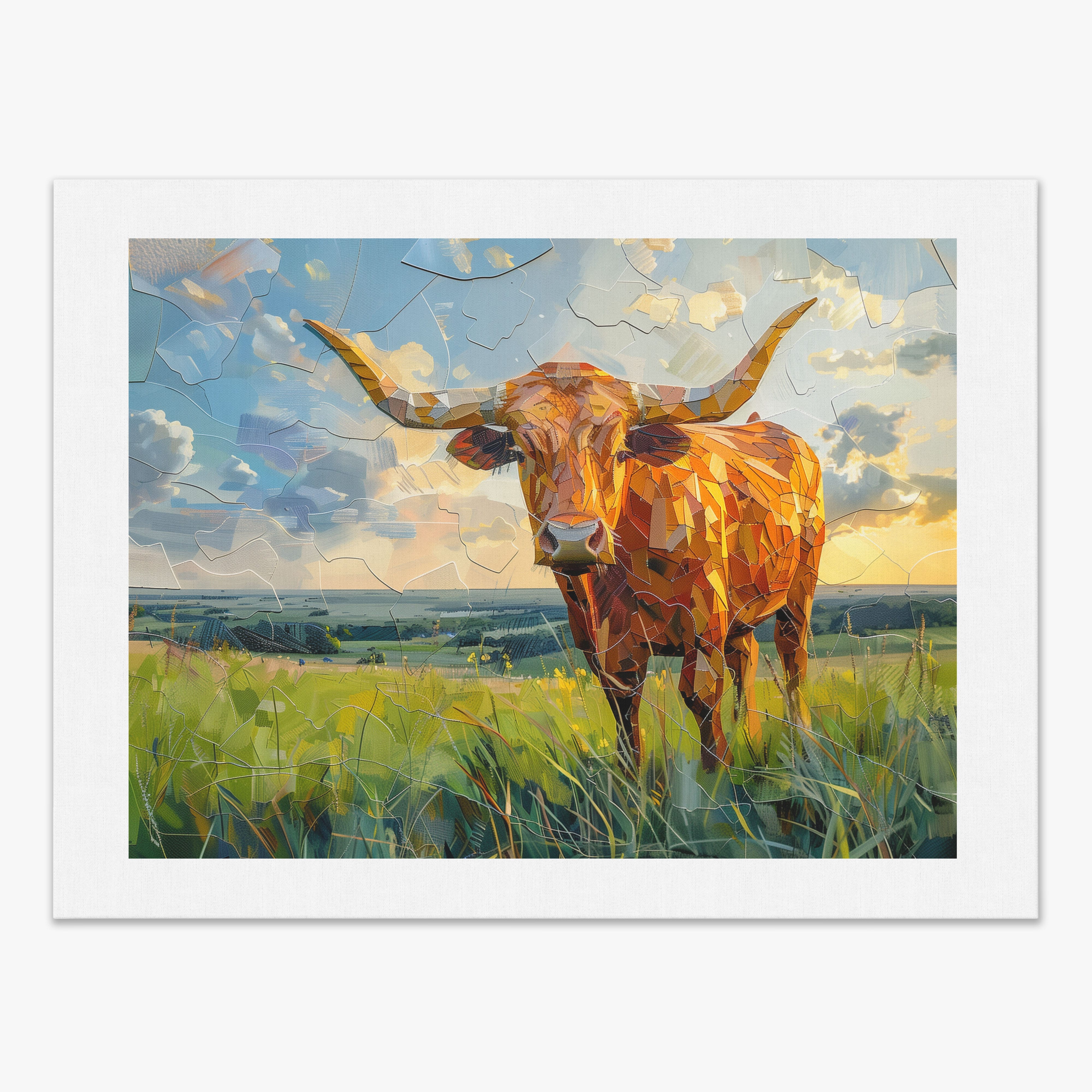 Transport yourself to the tranquil expanse of a sun-drenched pasture with this stunning digital illustration of a majestic longhorn steer. Utilizing vibrant mosaic-like textures and rich earth-tone colors, this piece beautifully captures the vitality of rural life. With a striking interplay of light and shadow, this artwork epitomizes the harmony between nature and wildlife, blending contemporary mosaic techniques with the timeless charm of the pastoral countryside. Perfect for animal art enthusiasts and collectors of modern rural motifs, this eye-catching piece is a must-have for transforming your space. Keywords: digital illustration, mosaic, contemporary, pastoral, longhorn steer, rural life.