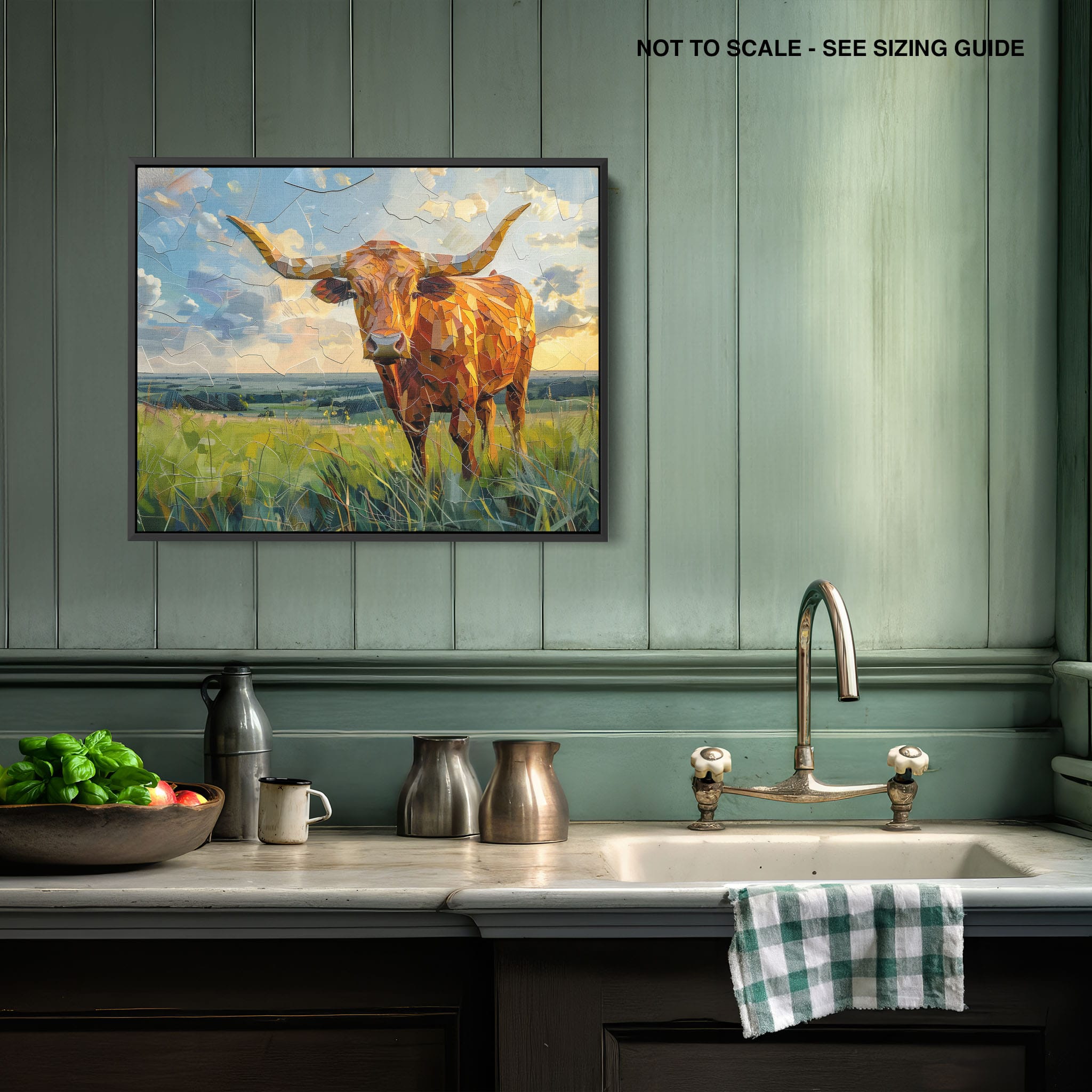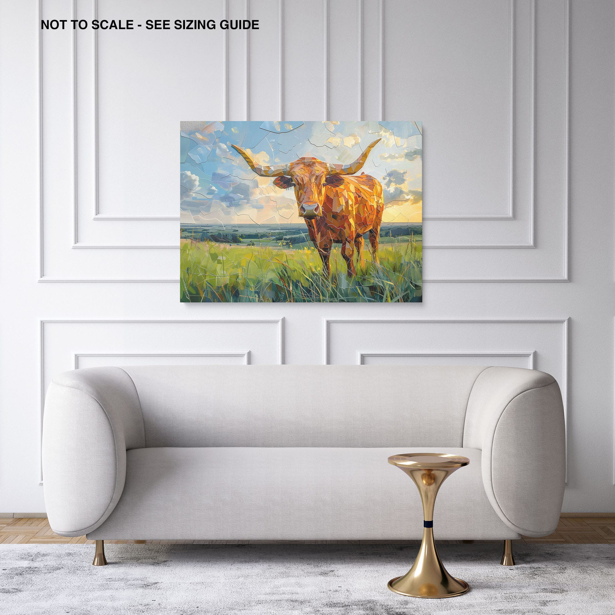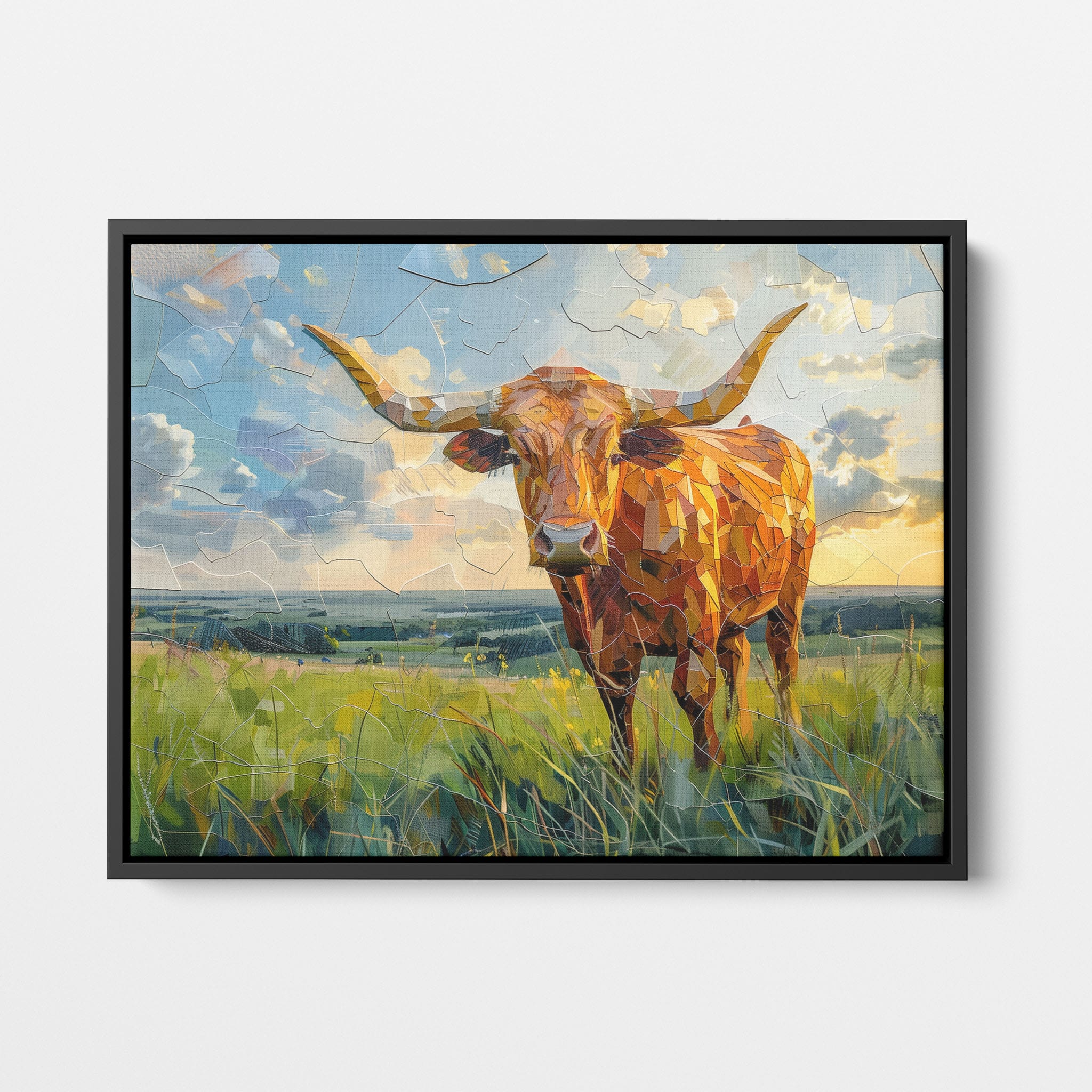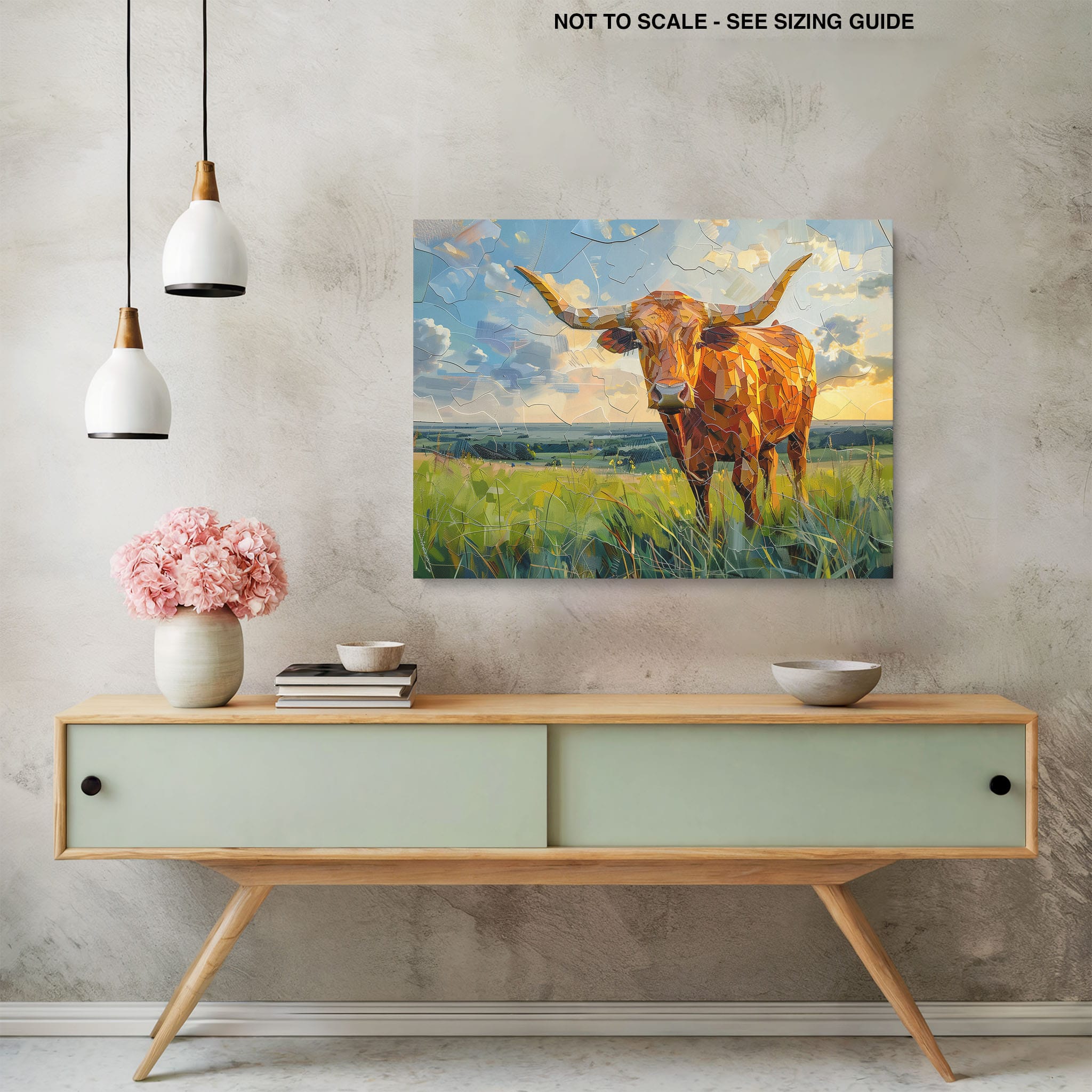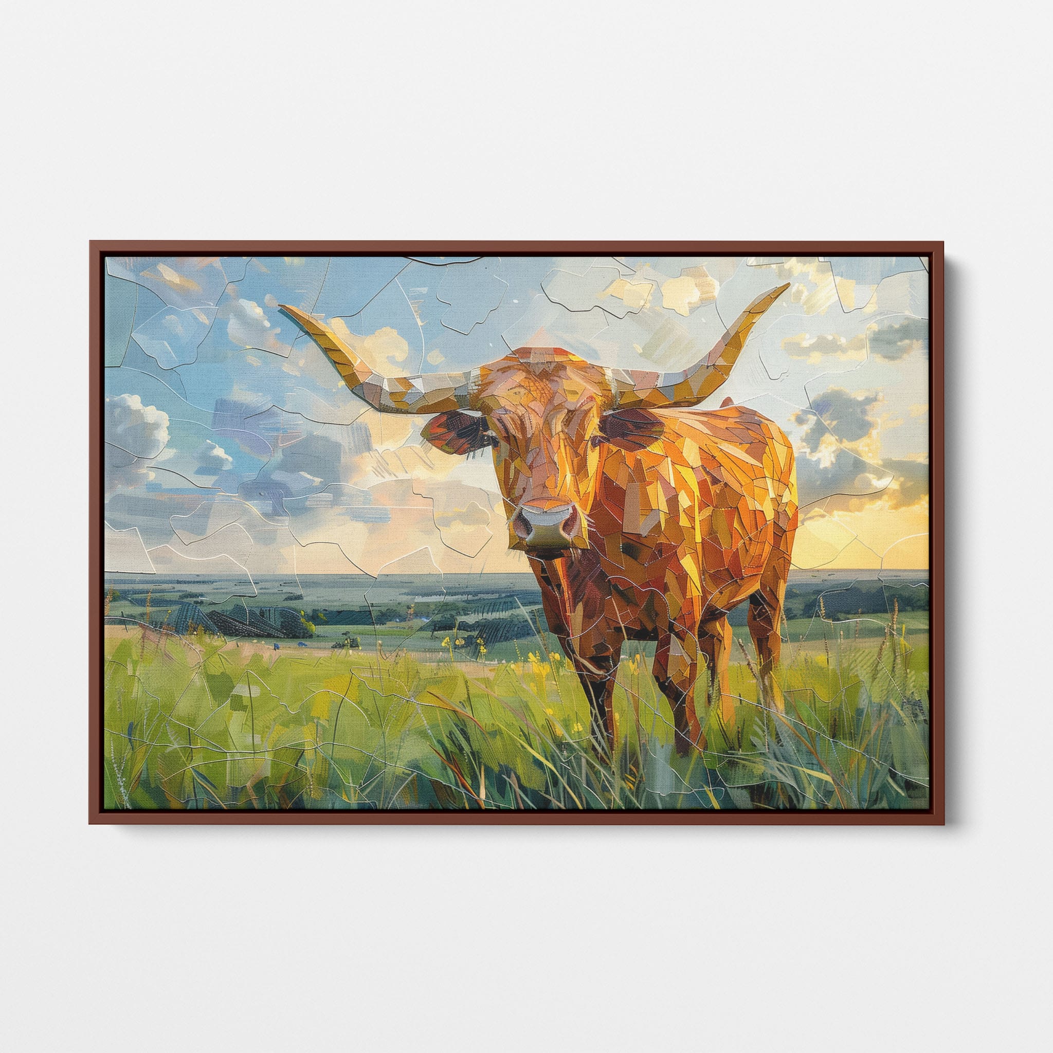 Transport yourself to the tranquil expanse of a sun-drenched pasture with this stunning digital illustration of a majestic longhorn steer. Utilizing vibrant mosaic-like textures and rich earth-tone colors, this piece beautifully captures the vitality of rural life. With a striking interplay of light and shadow, this artwork epitomizes the harmony between nature and wildlife, blending contemporary mosaic techniques with the timeless charm of the pastoral countryside. Perfect for animal art enthusiasts and collectors of modern rural motifs, this eye-catching piece is a must-have for transforming your space. Keywords: digital illustration, mosaic, contemporary, pastoral, longhorn steer, rural life.