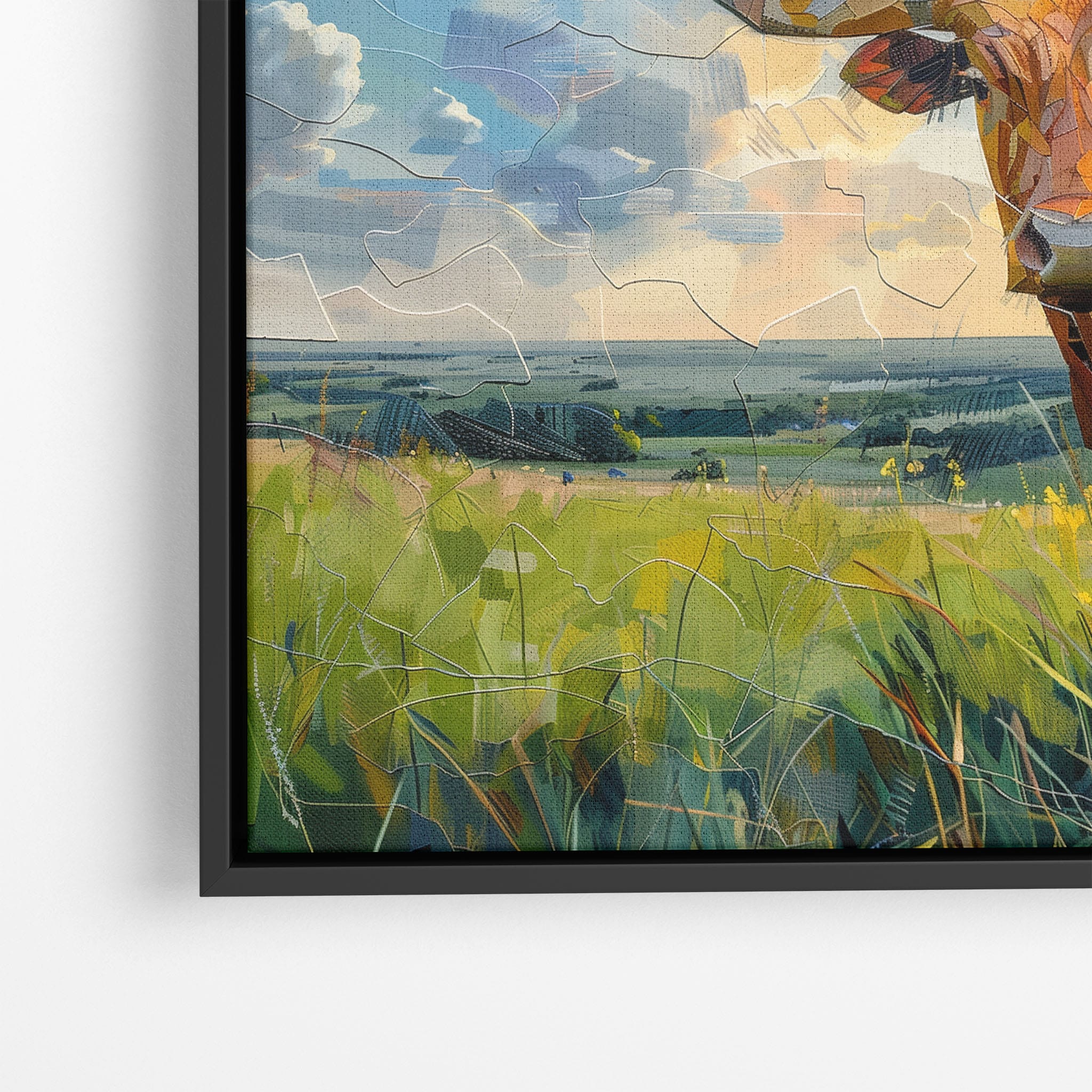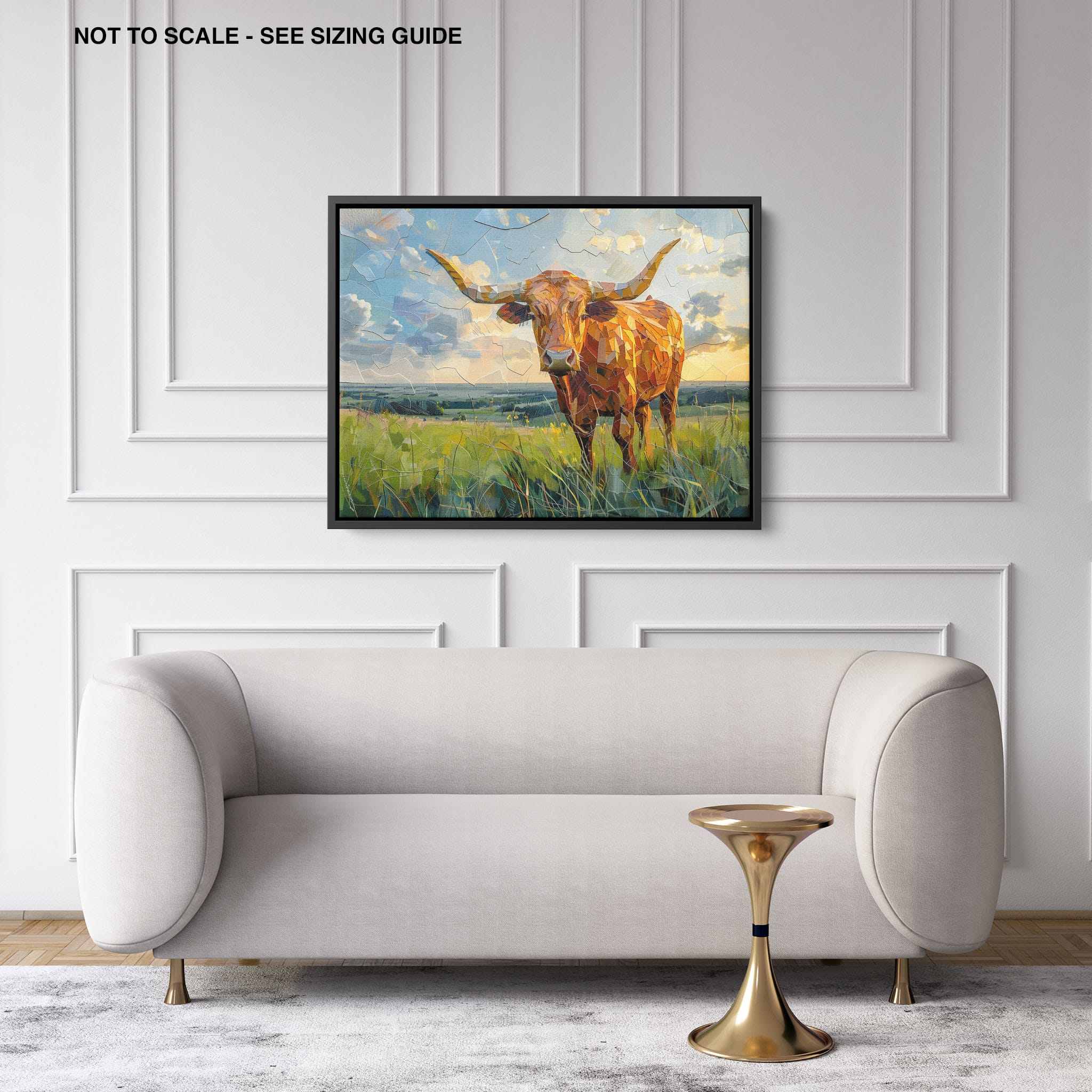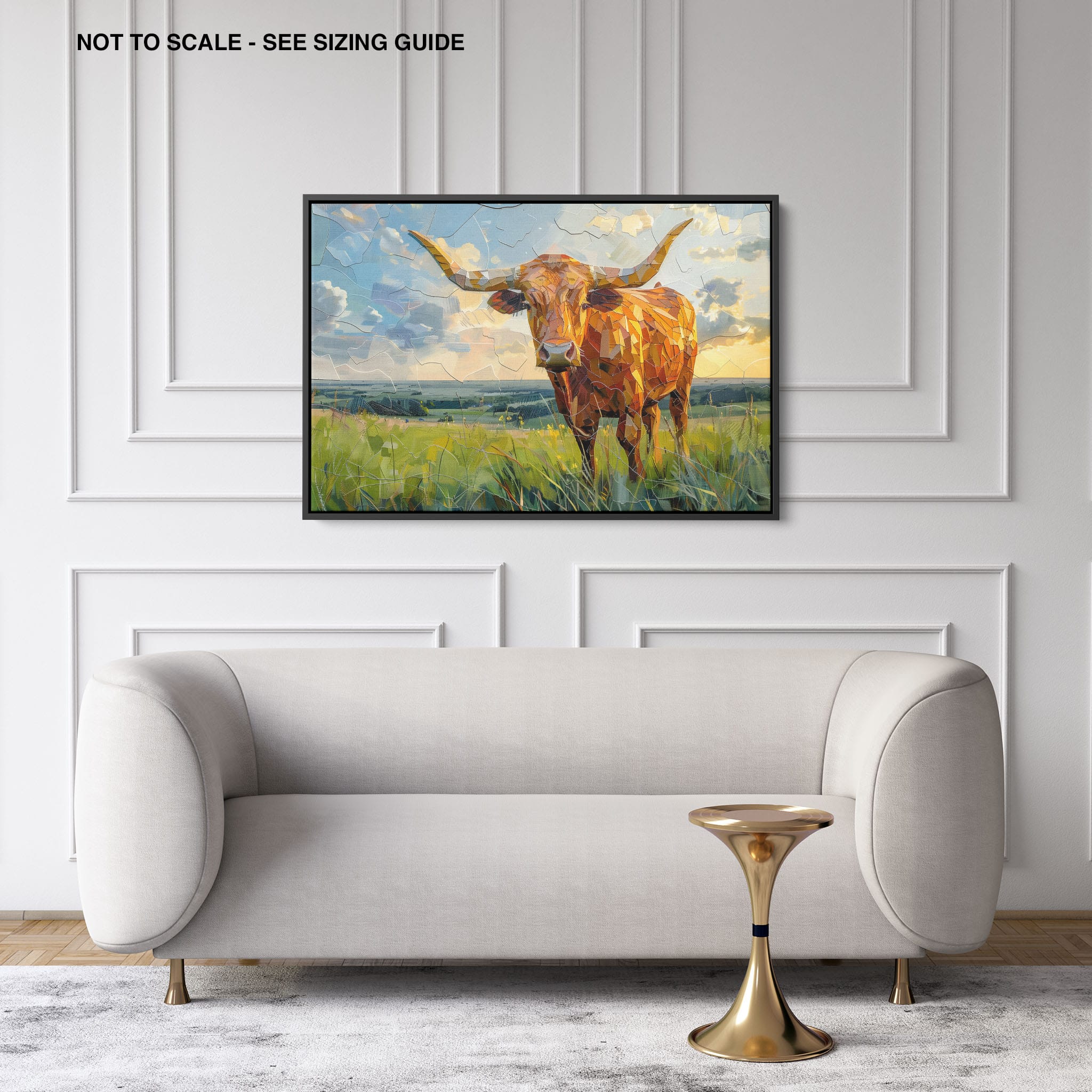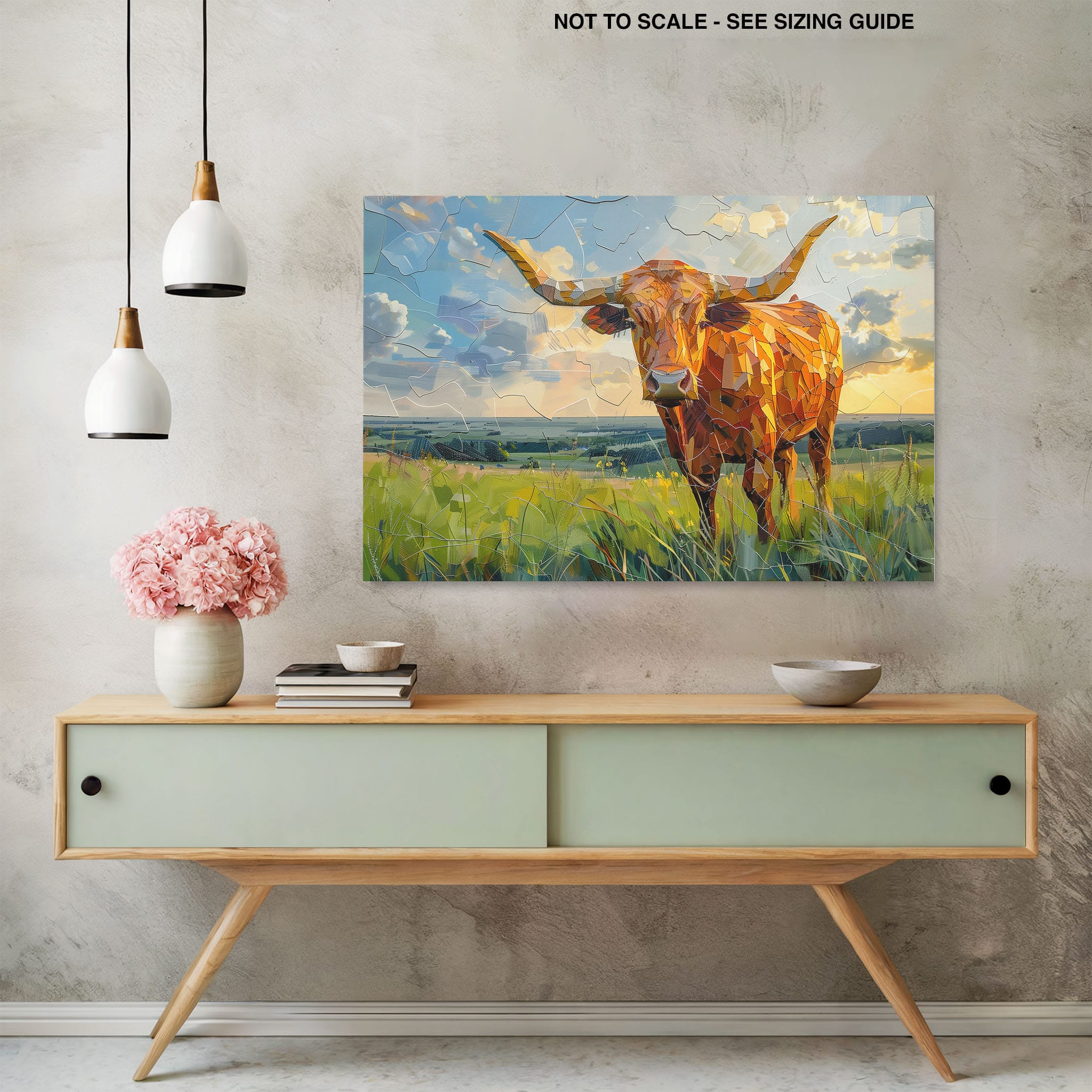 Transport yourself to the tranquil expanse of a sun-drenched pasture with this stunning digital illustration of a majestic longhorn steer. Utilizing vibrant mosaic-like textures and rich earth-tone colors, this piece beautifully captures the vitality of rural life. With a striking interplay of light and shadow, this artwork epitomizes the harmony between nature and wildlife, blending contemporary mosaic techniques with the timeless charm of the pastoral countryside. Perfect for animal art enthusiasts and collectors of modern rural motifs, this eye-catching piece is a must-have for transforming your space. Keywords: digital illustration, mosaic, contemporary, pastoral, longhorn steer, rural life.