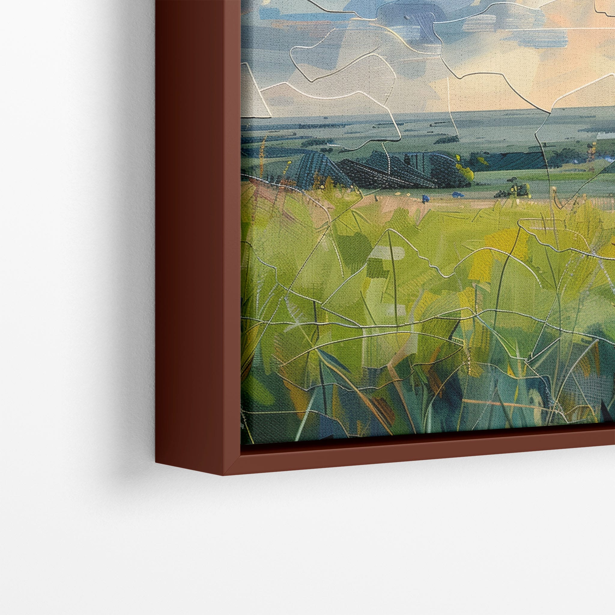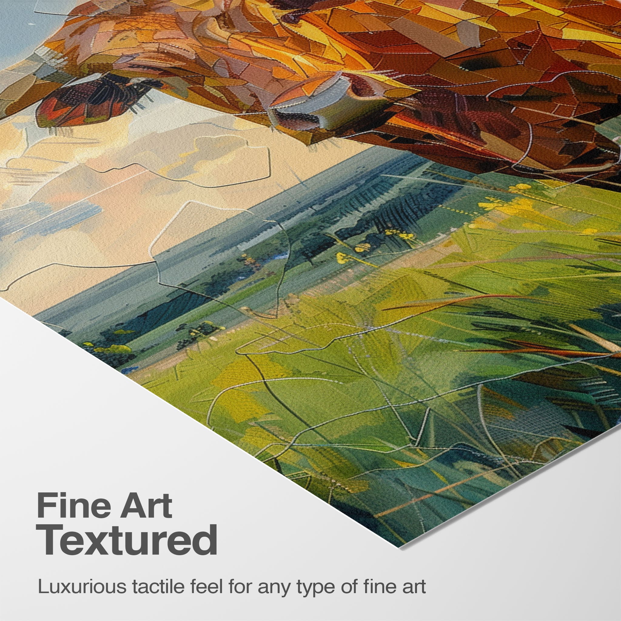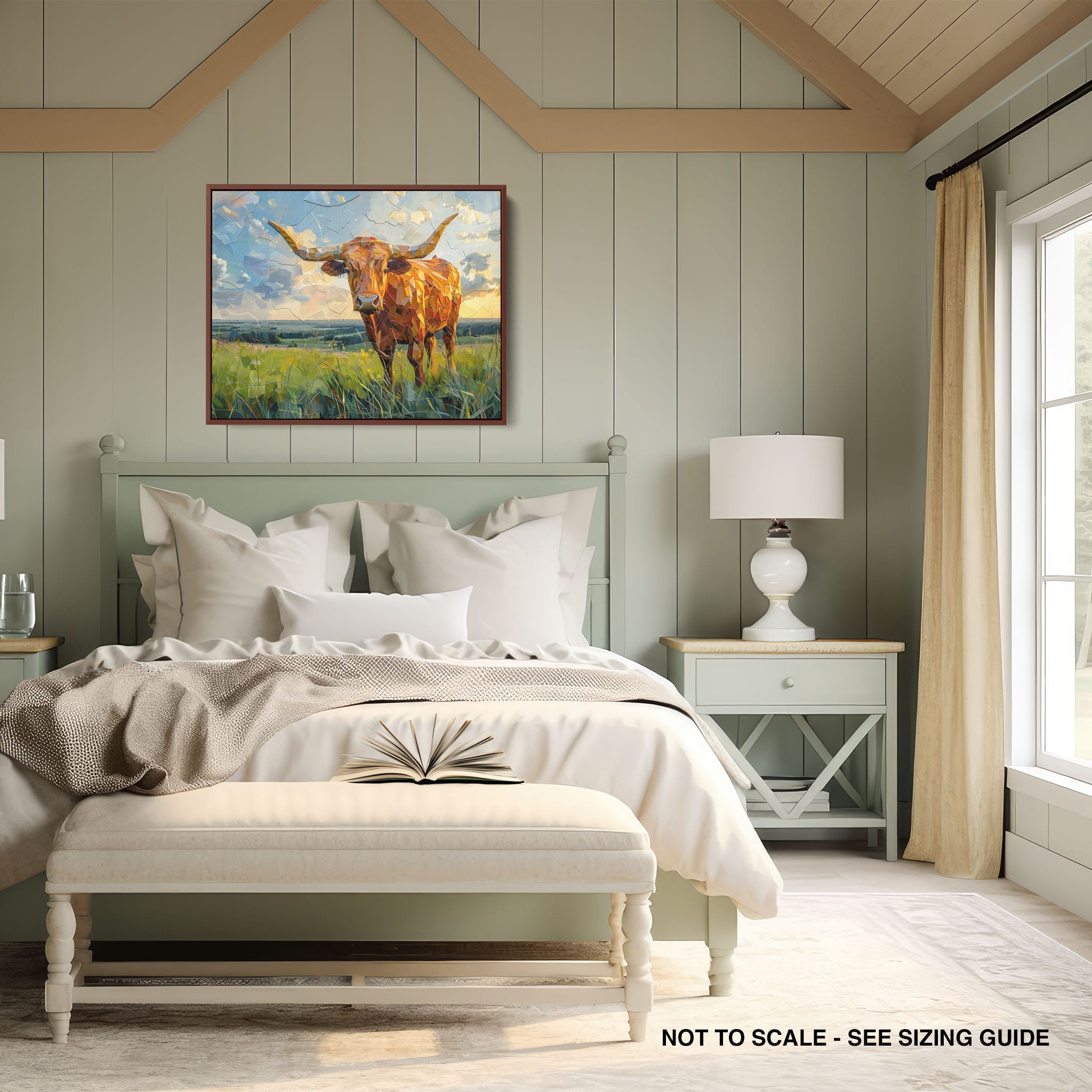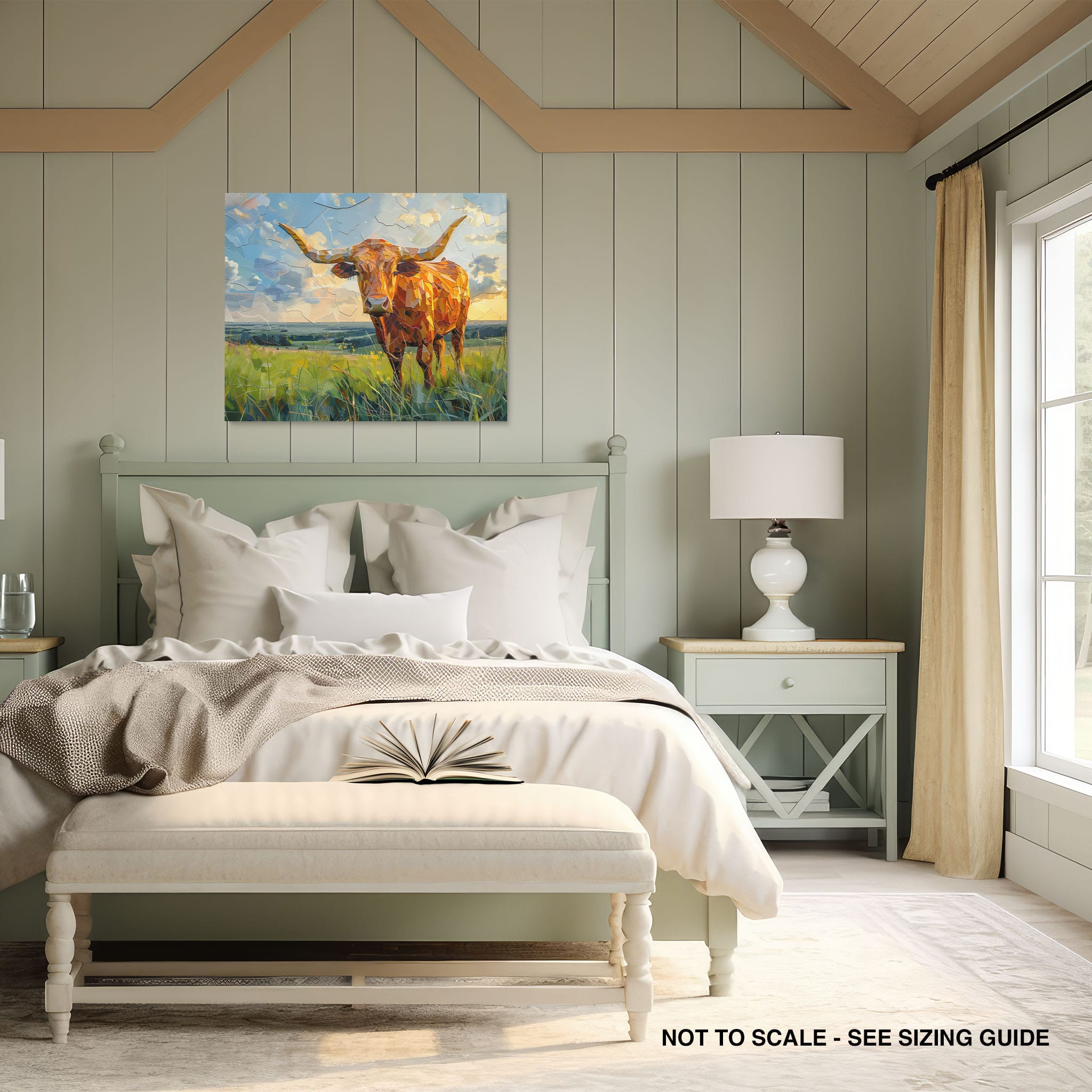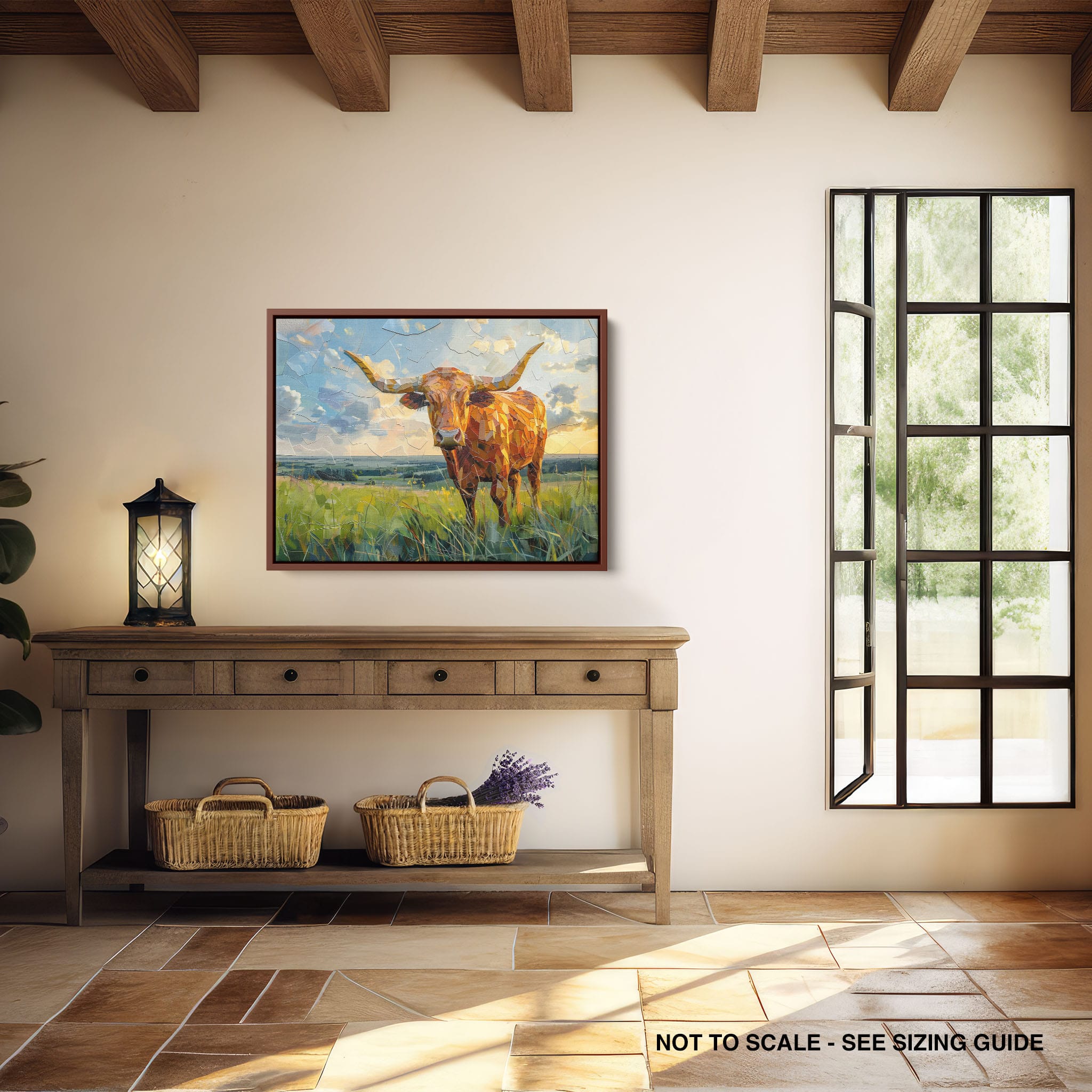 Transport yourself to the tranquil expanse of a sun-drenched pasture with this stunning digital illustration of a majestic longhorn steer. Utilizing vibrant mosaic-like textures and rich earth-tone colors, this piece beautifully captures the vitality of rural life. With a striking interplay of light and shadow, this artwork epitomizes the harmony between nature and wildlife, blending contemporary mosaic techniques with the timeless charm of the pastoral countryside. Perfect for animal art enthusiasts and collectors of modern rural motifs, this eye-catching piece is a must-have for transforming your space. Keywords: digital illustration, mosaic, contemporary, pastoral, longhorn steer, rural life.
