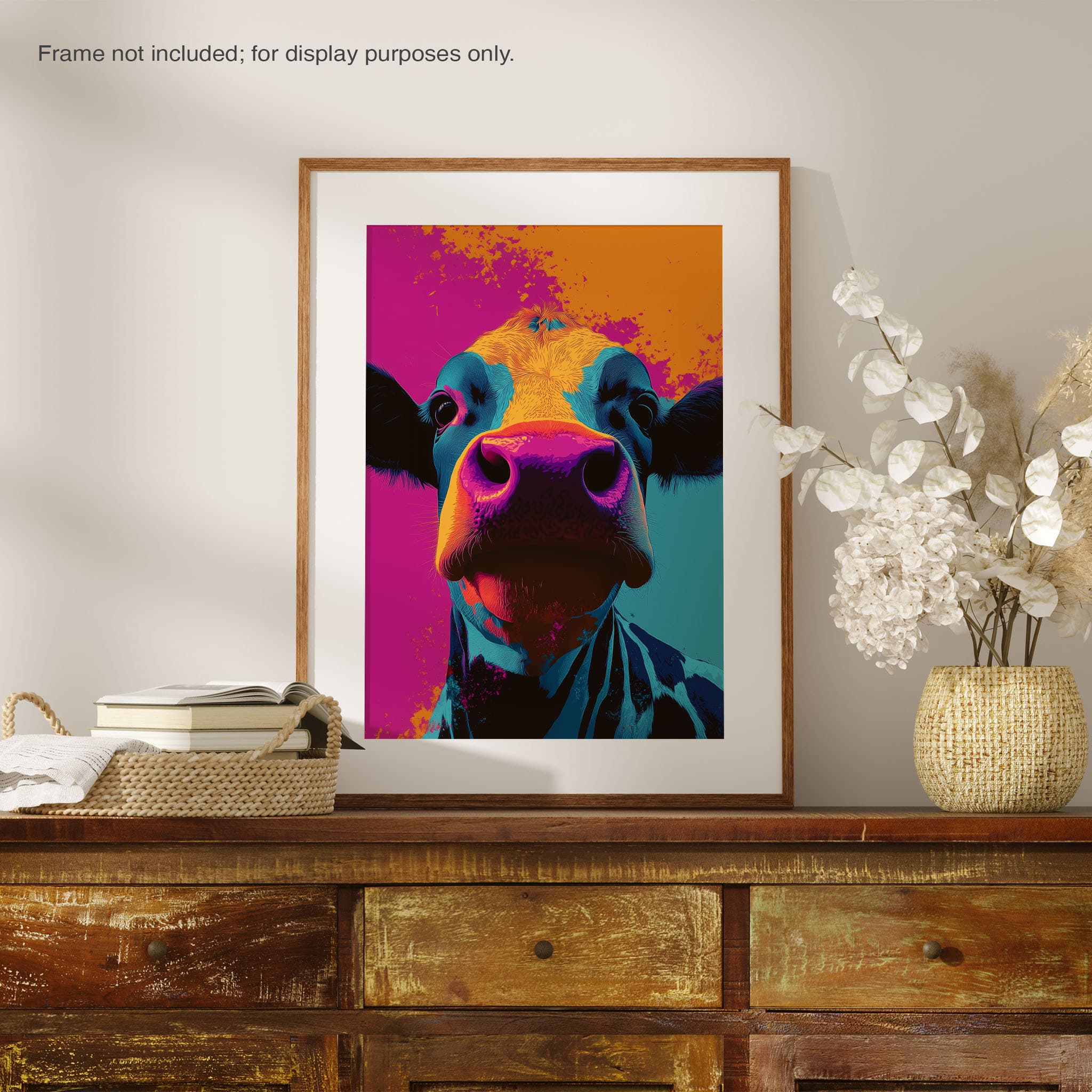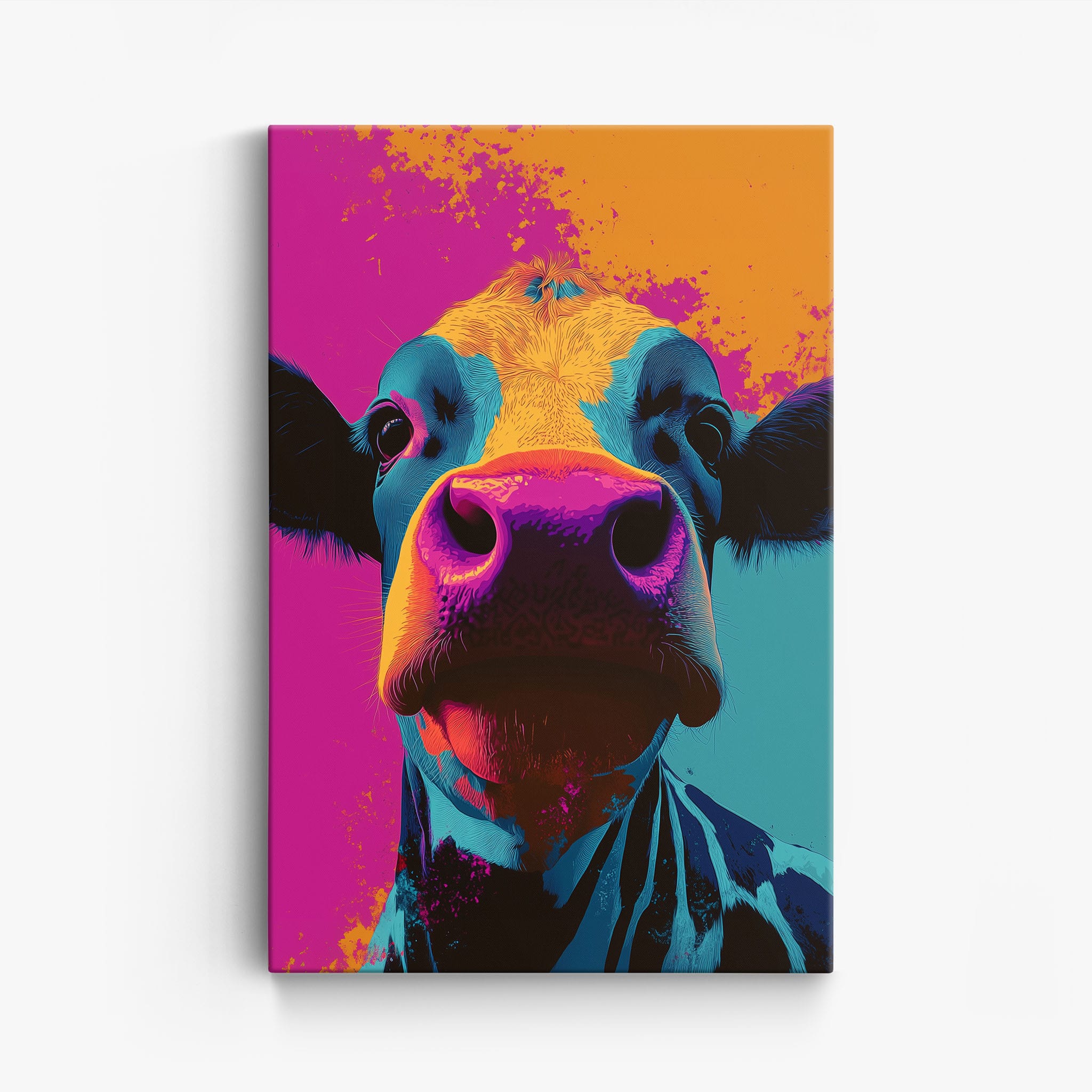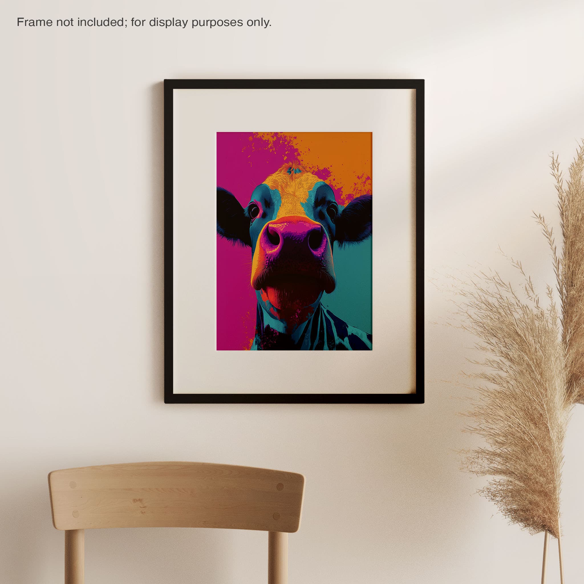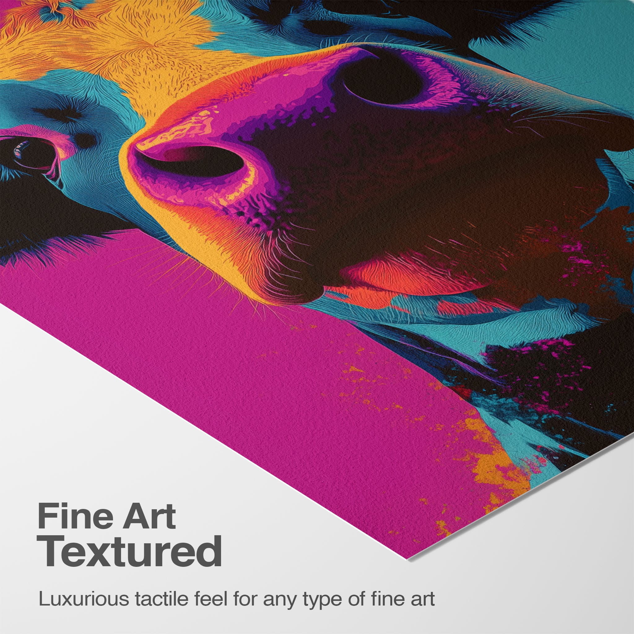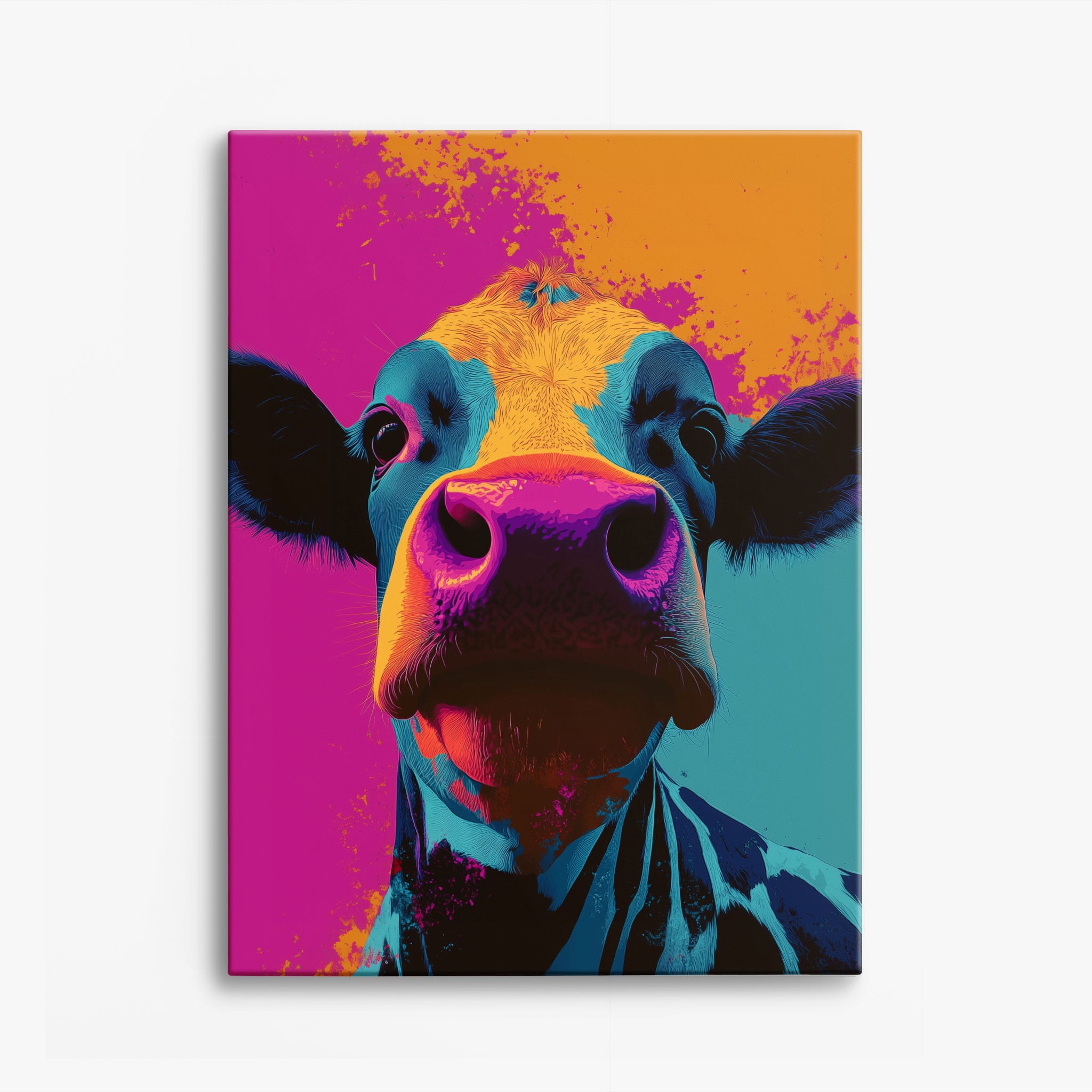 This vibrant digital illustration depicts a neon-hued cow, showcasing striking contrasts and bold colors reminiscent of Pop Art. The cow's face is the focal point, rendered in intense blues, pinks, and oranges, creating a surreal atmosphere. The unexpected color palette and whimsical texture invite viewers to see farm life in a new light. Ideal for modern and eclectic interiors, this piece makes a bold statement. Add this masterpiece to your collection for an artistic touch that's both contemporary and playful.