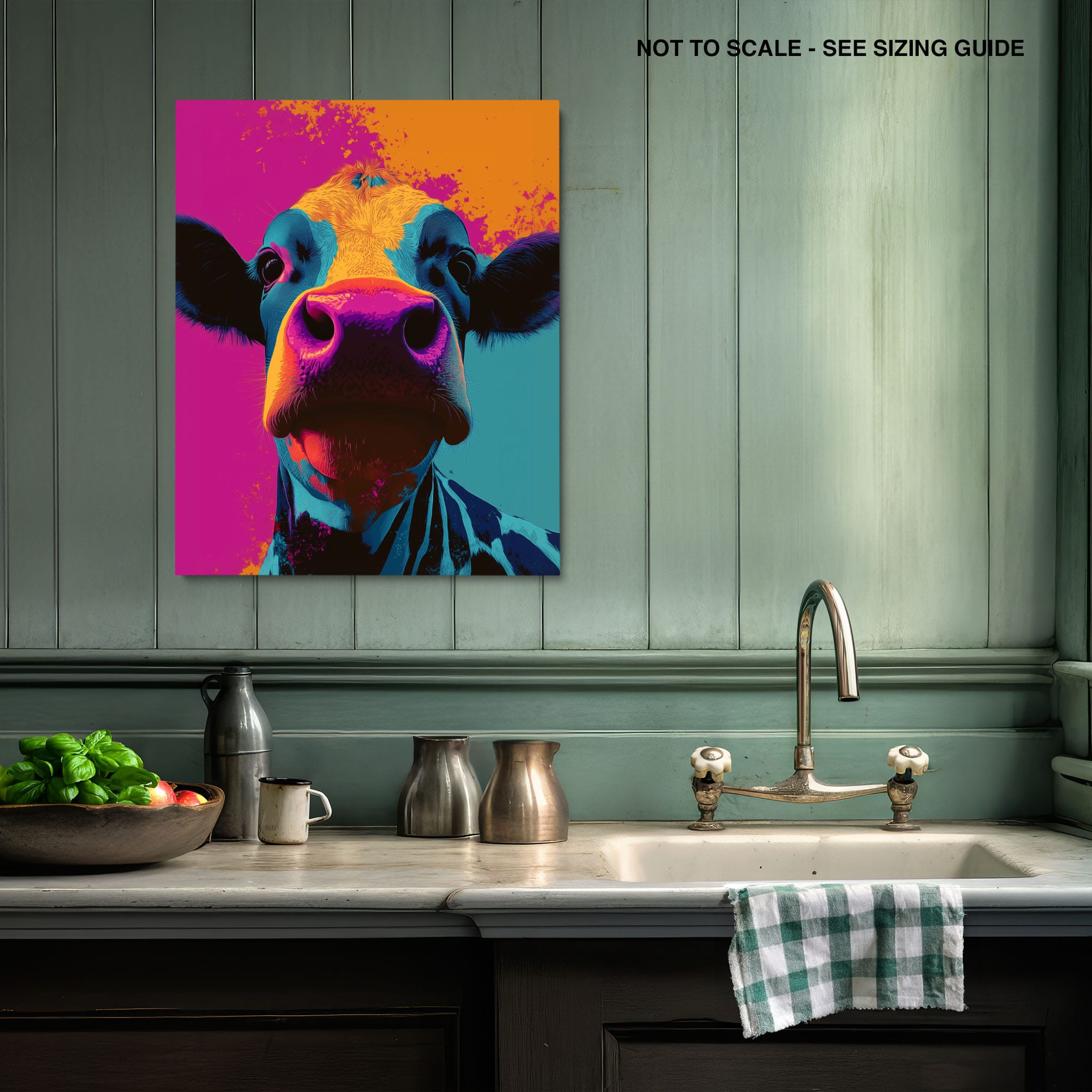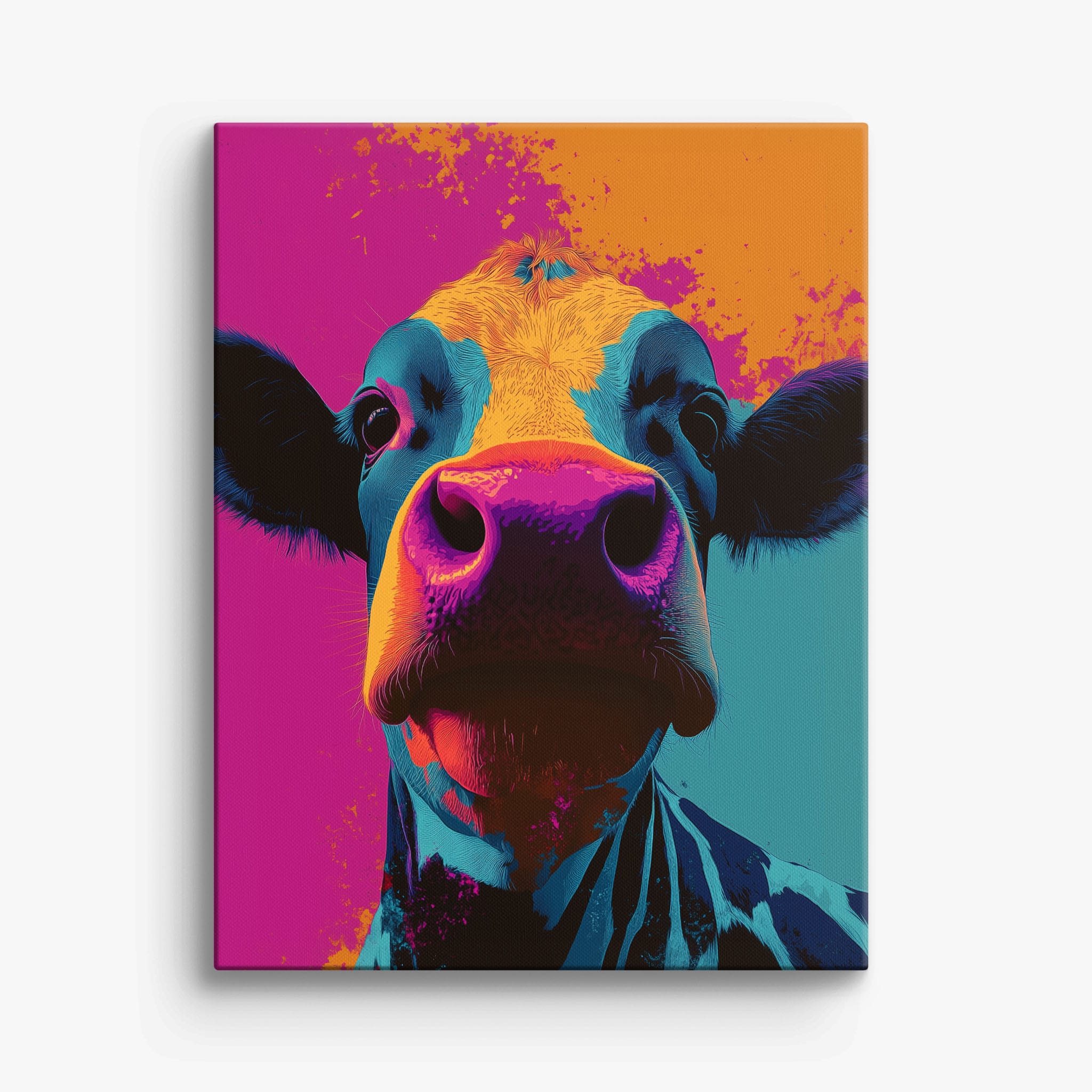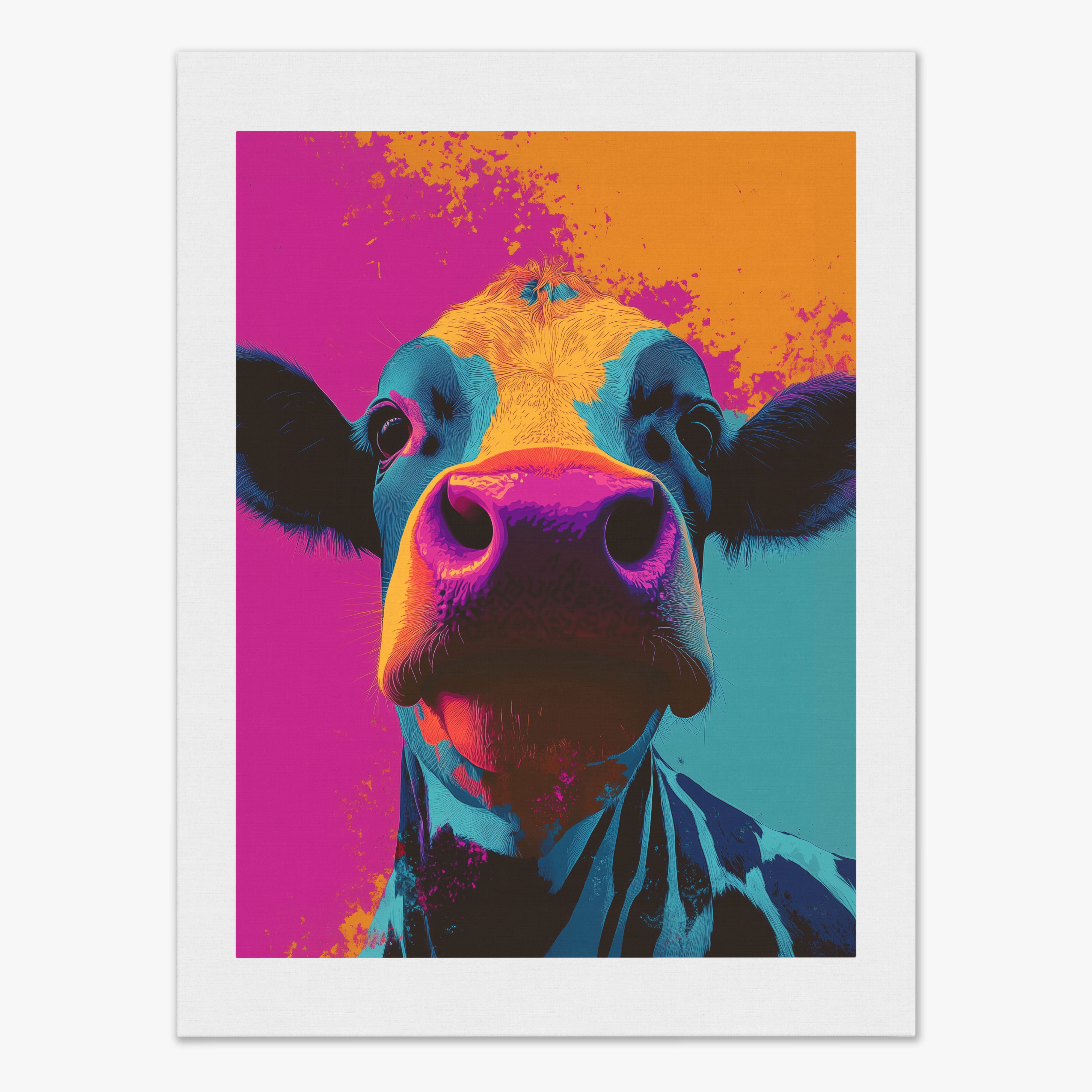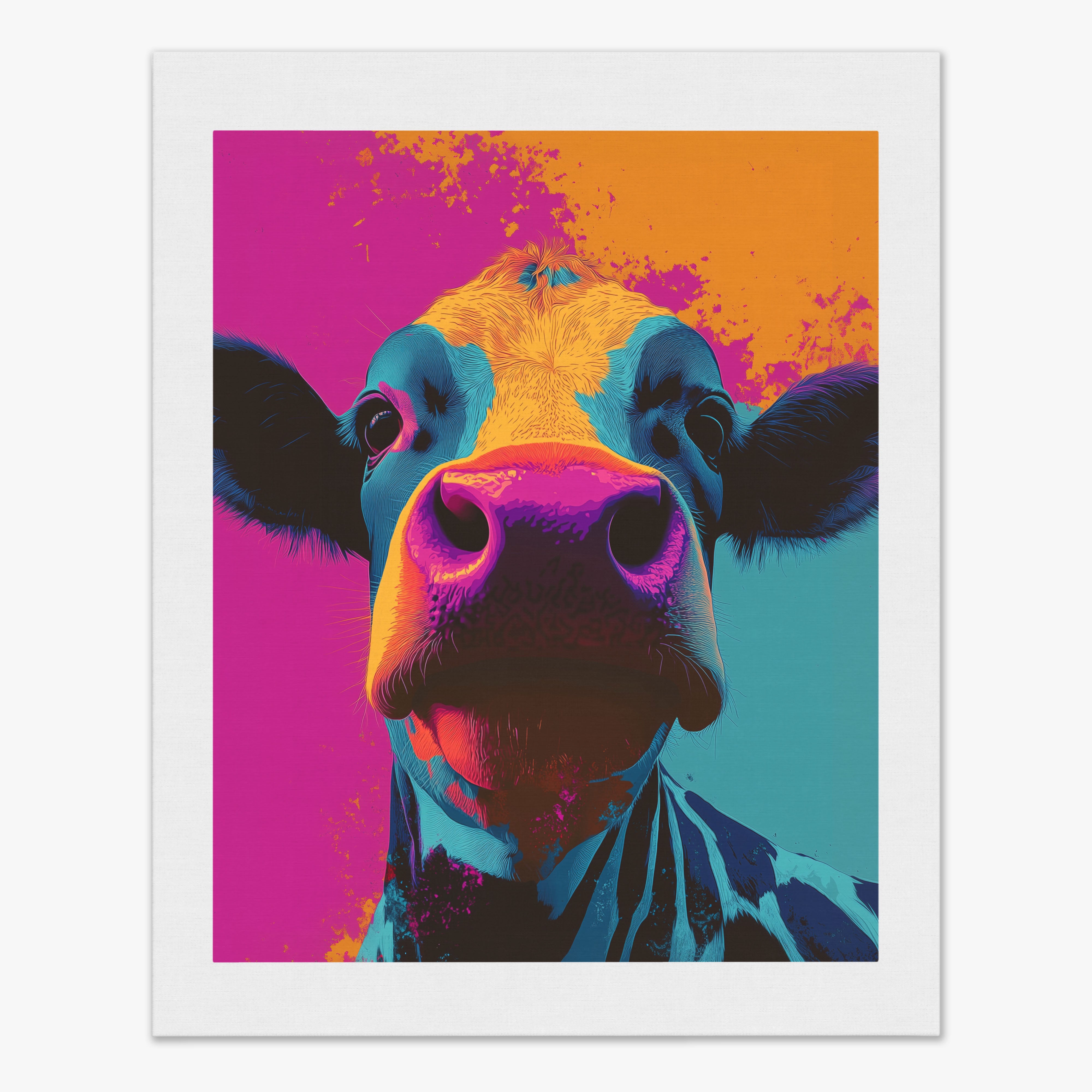 This vibrant digital illustration depicts a neon-hued cow, showcasing striking contrasts and bold colors reminiscent of Pop Art. The cow's face is the focal point, rendered in intense blues, pinks, and oranges, creating a surreal atmosphere. The unexpected color palette and whimsical texture invite viewers to see farm life in a new light. Ideal for modern and eclectic interiors, this piece makes a bold statement. Add this masterpiece to your collection for an artistic touch that's both contemporary and playful.