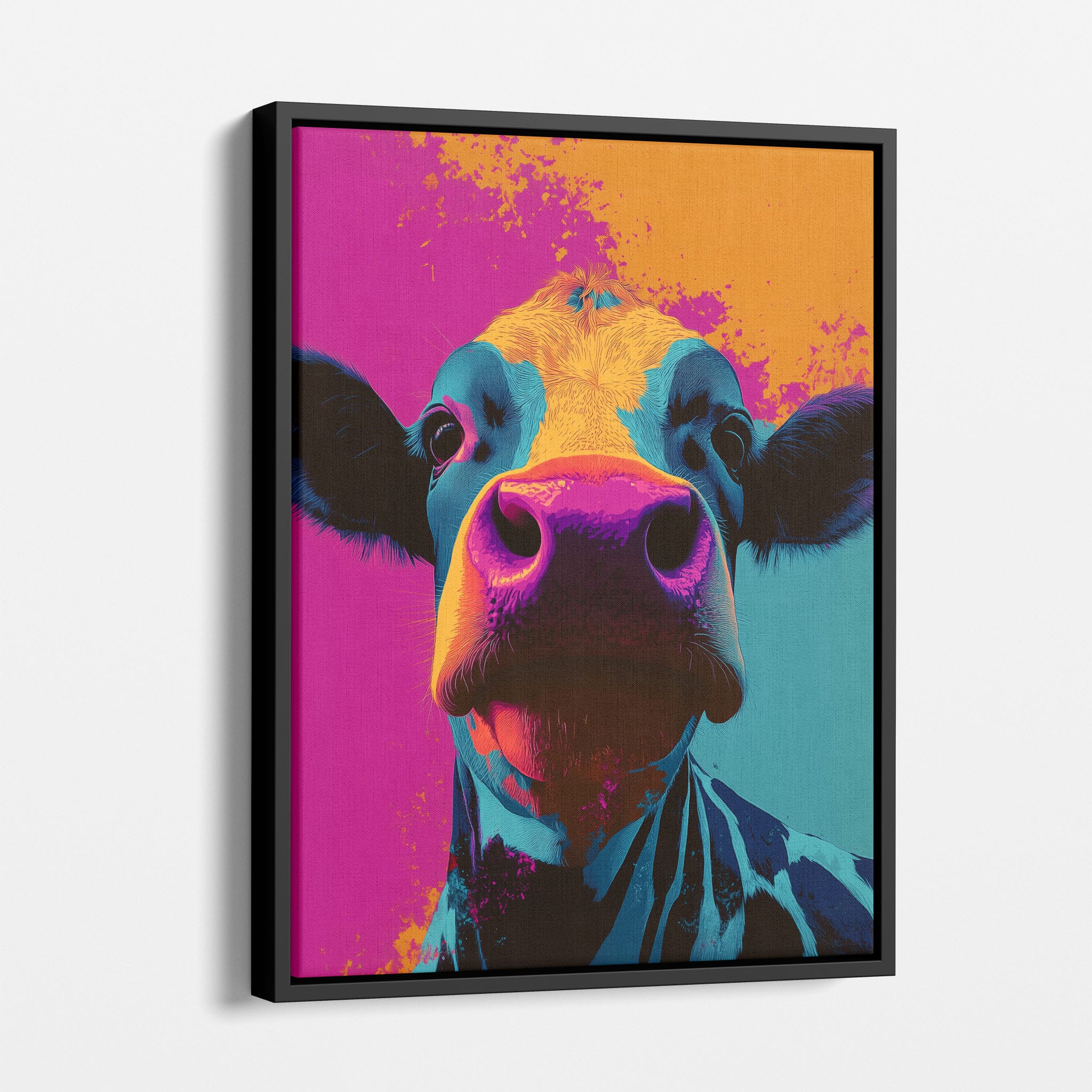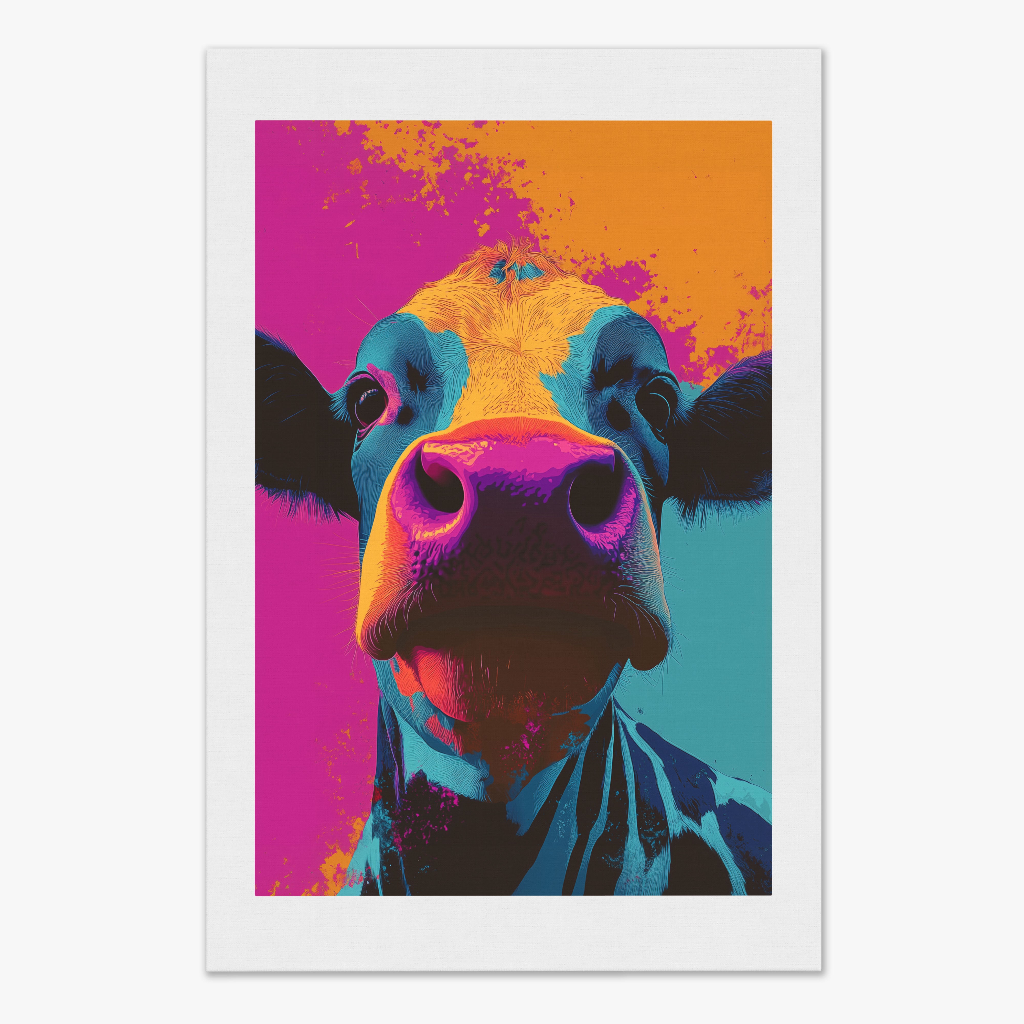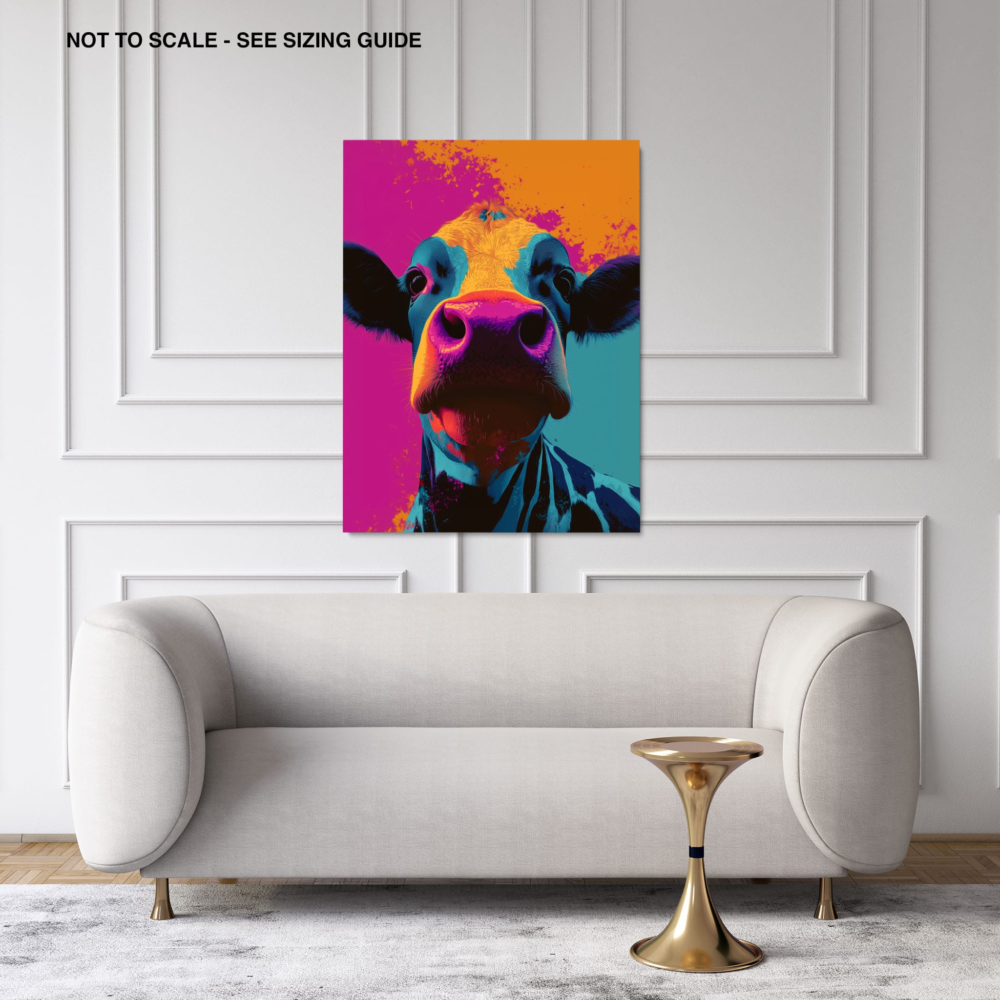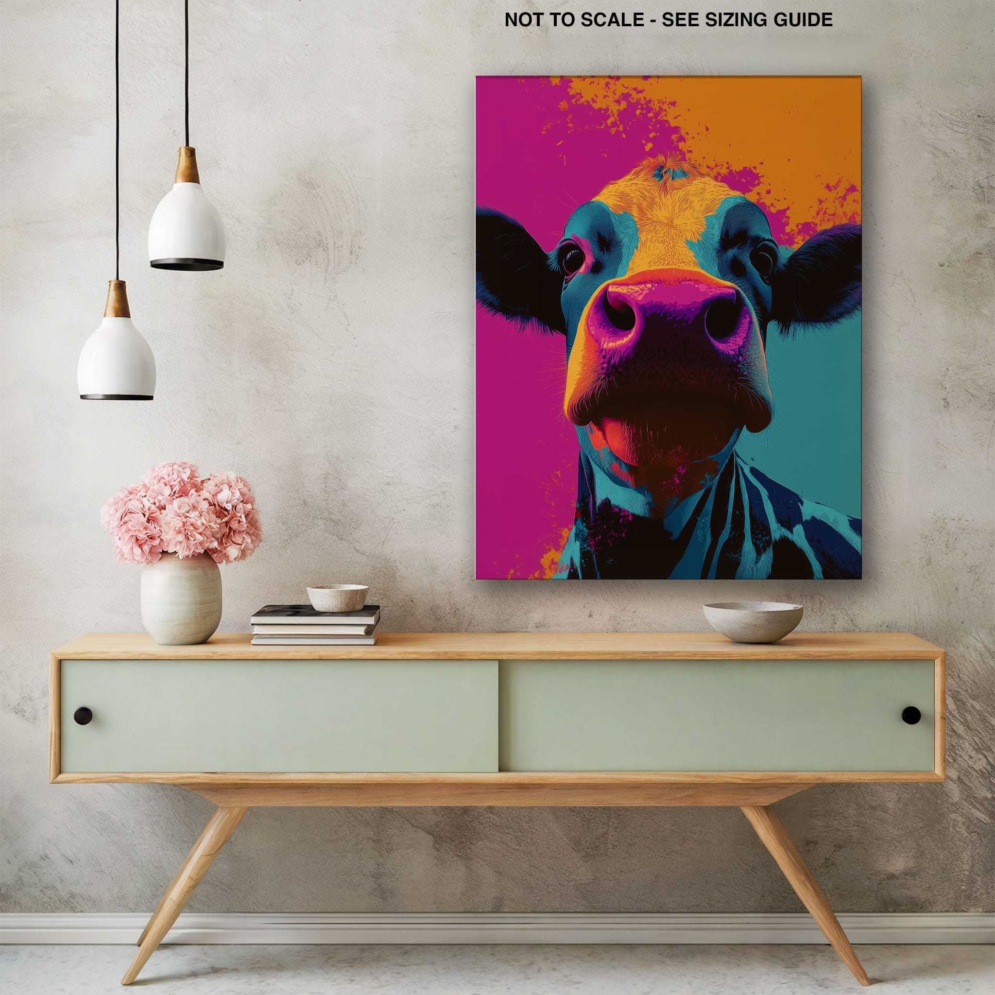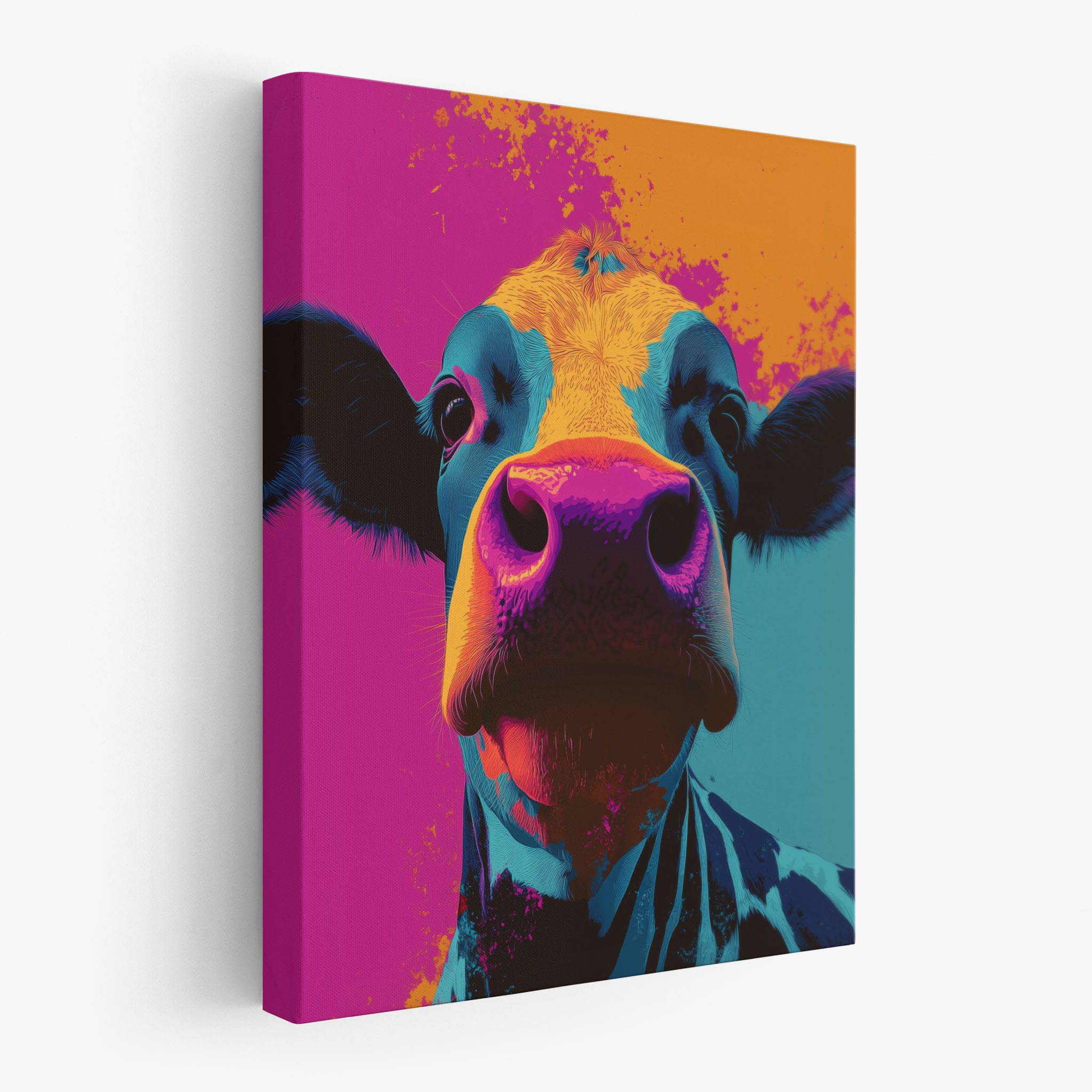 This vibrant digital illustration depicts a neon-hued cow, showcasing striking contrasts and bold colors reminiscent of Pop Art. The cow's face is the focal point, rendered in intense blues, pinks, and oranges, creating a surreal atmosphere. The unexpected color palette and whimsical texture invite viewers to see farm life in a new light. Ideal for modern and eclectic interiors, this piece makes a bold statement. Add this masterpiece to your collection for an artistic touch that's both contemporary and playful.