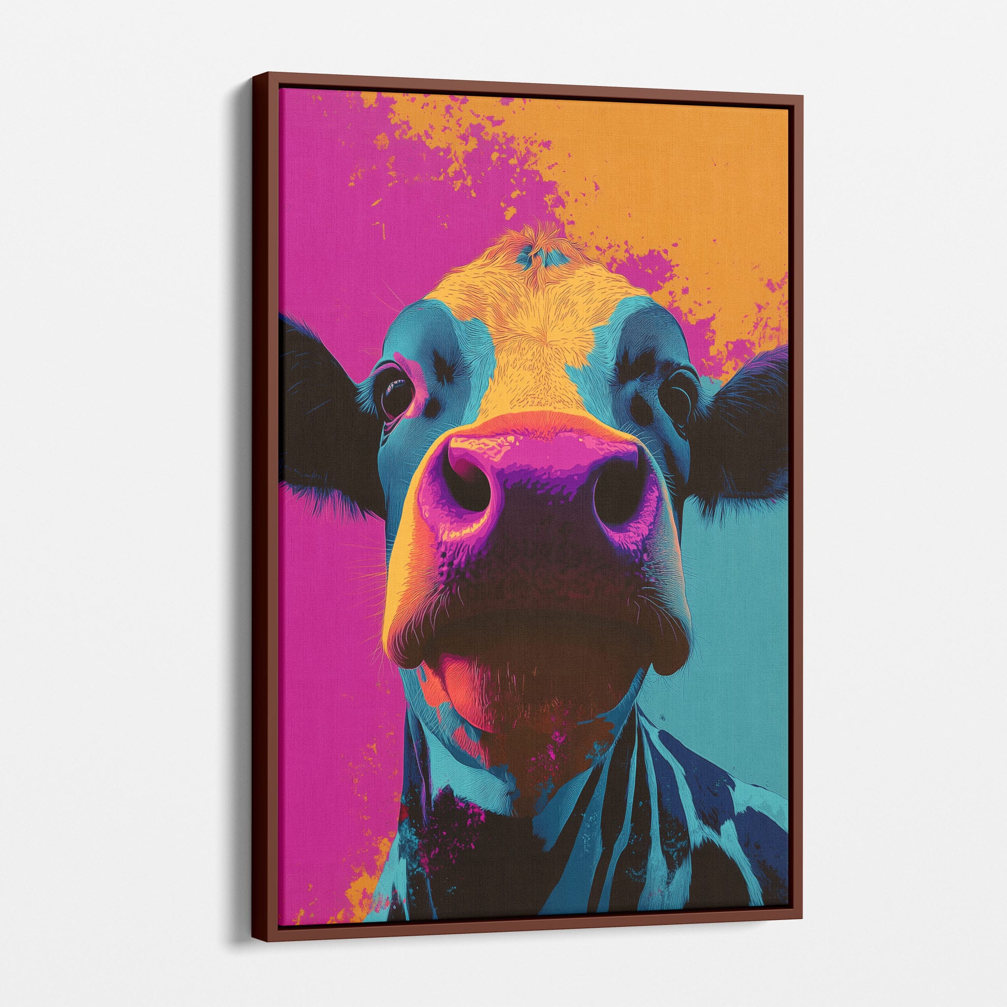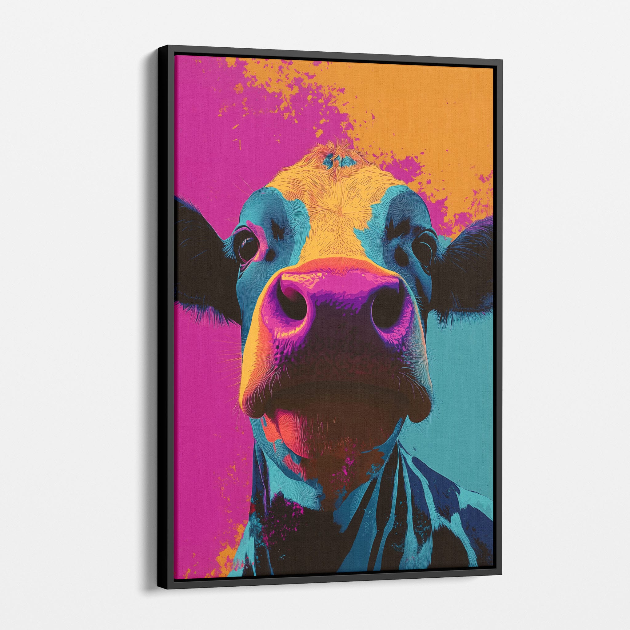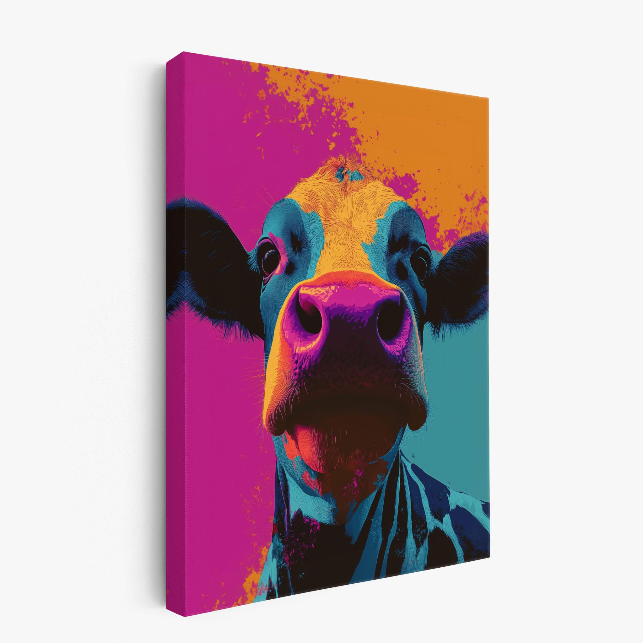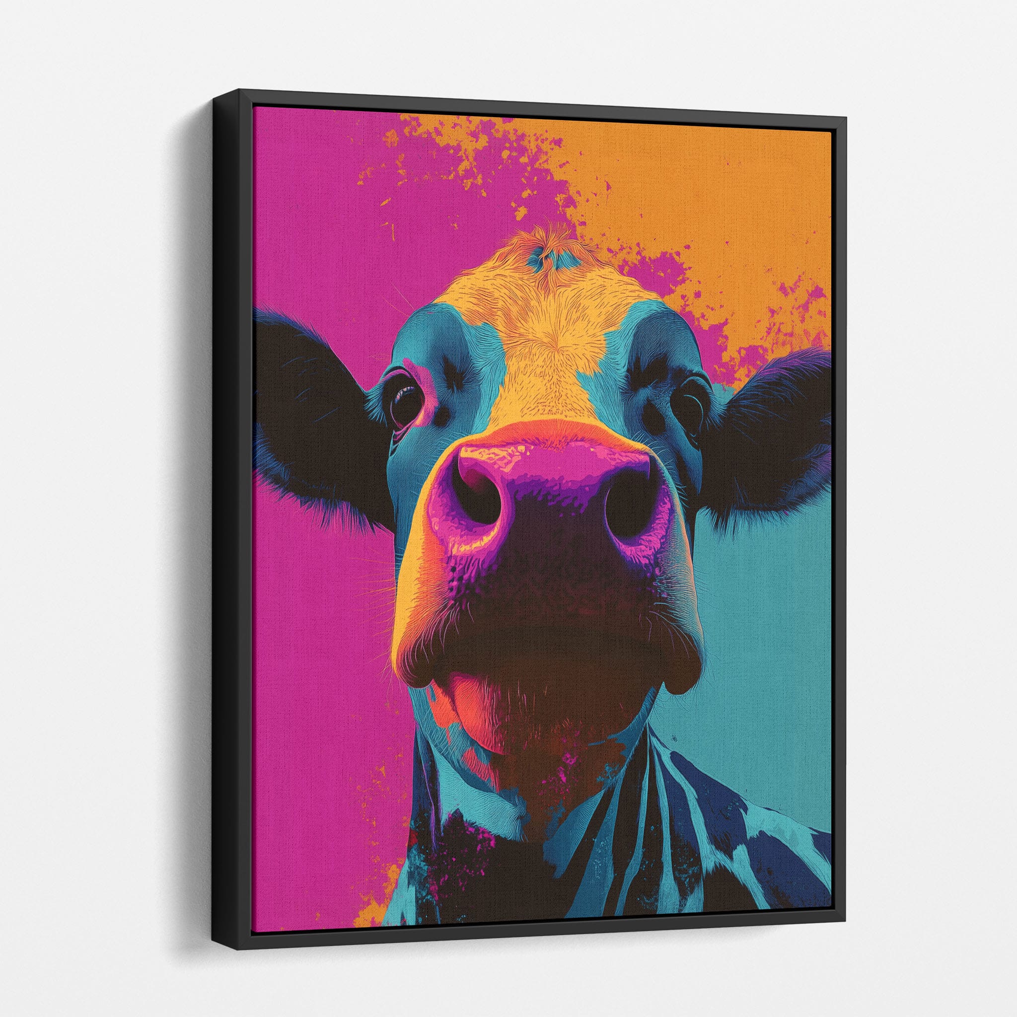 This vibrant digital illustration depicts a neon-hued cow, showcasing striking contrasts and bold colors reminiscent of Pop Art. The cow's face is the focal point, rendered in intense blues, pinks, and oranges, creating a surreal atmosphere. The unexpected color palette and whimsical texture invite viewers to see farm life in a new light. Ideal for modern and eclectic interiors, this piece makes a bold statement. Add this masterpiece to your collection for an artistic touch that's both contemporary and playful.