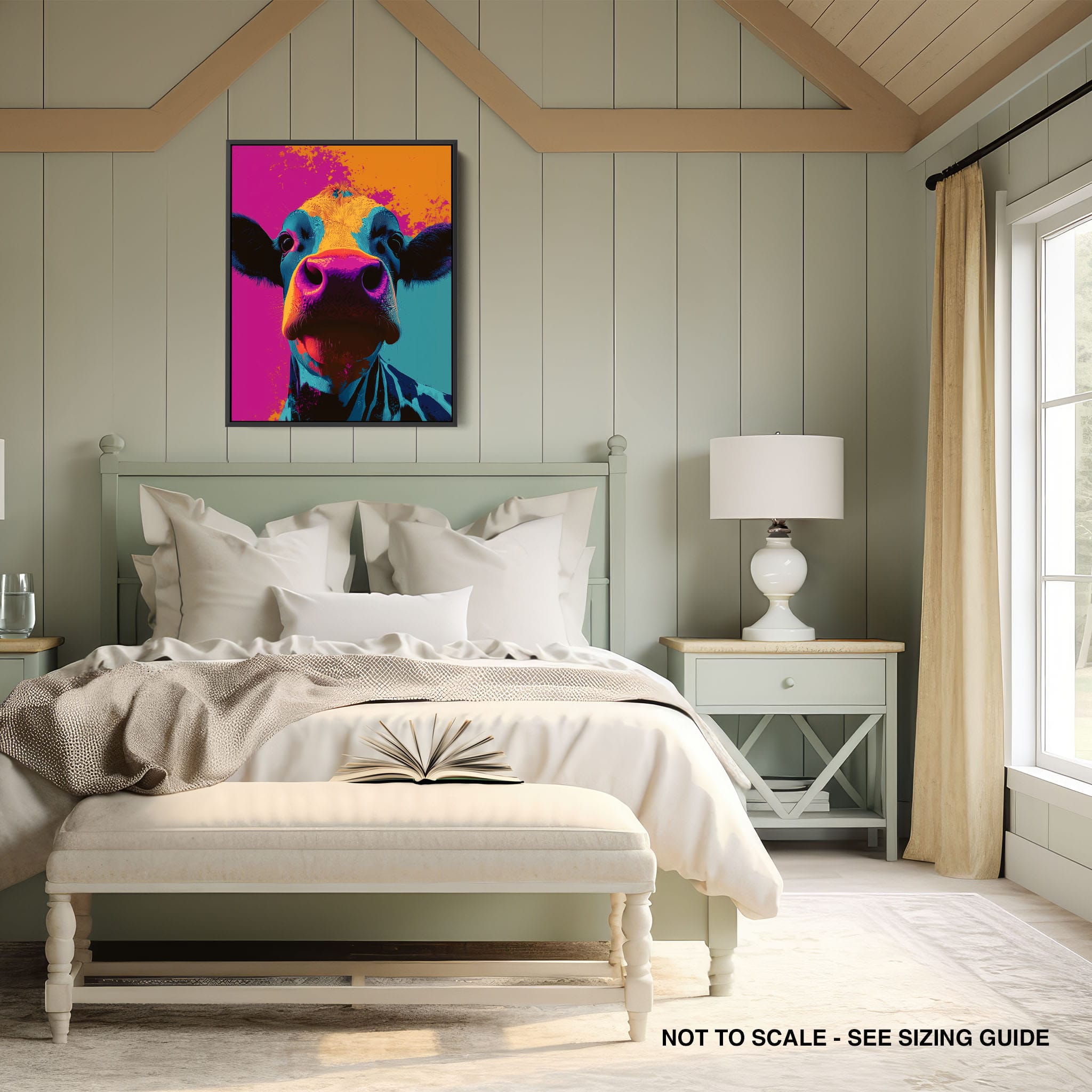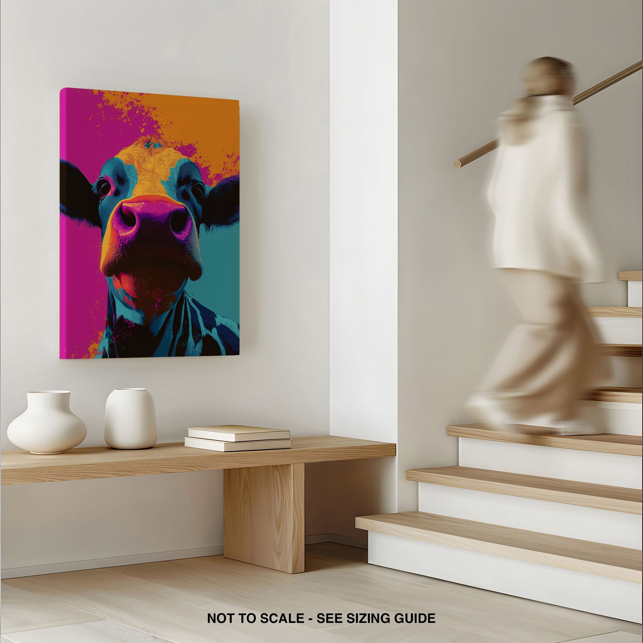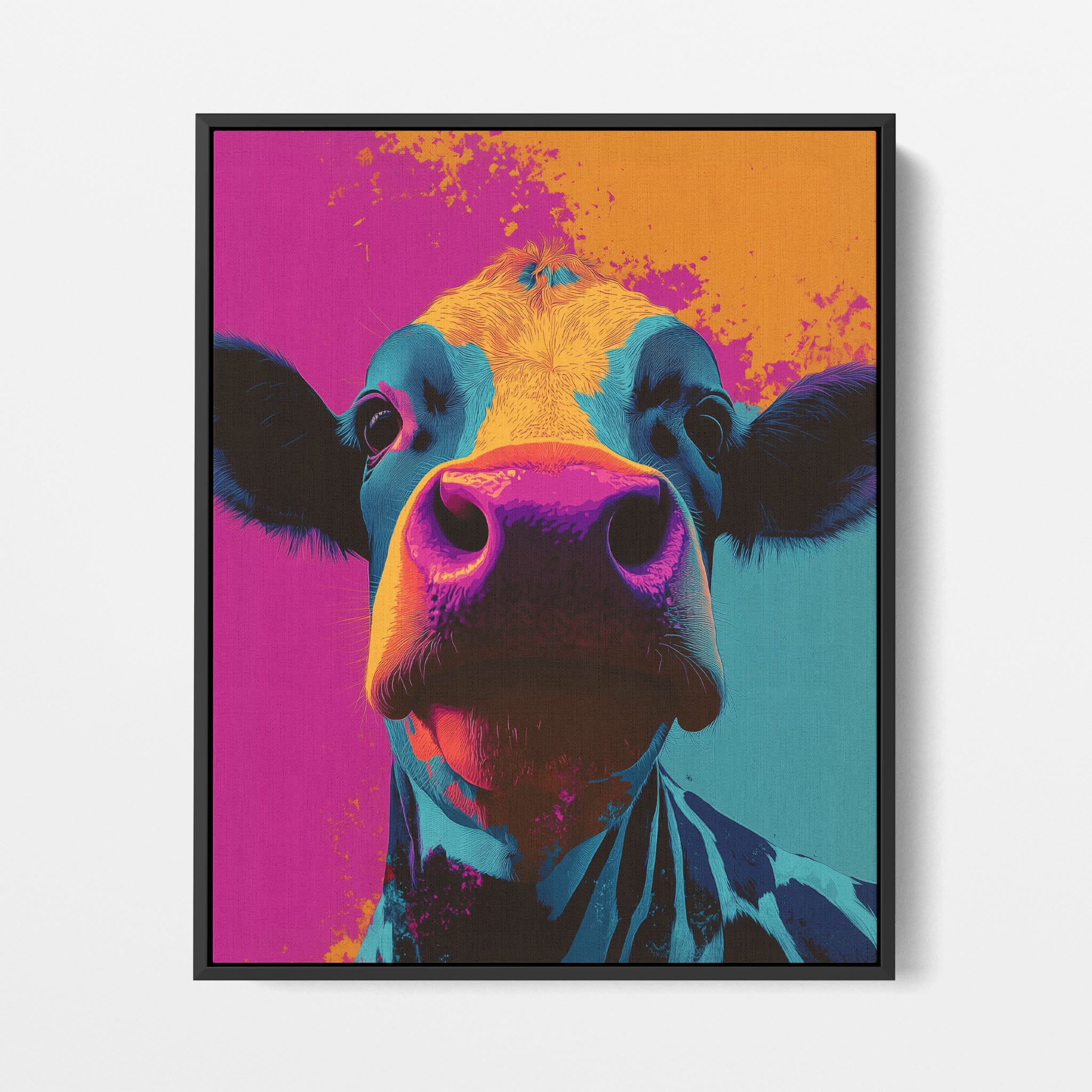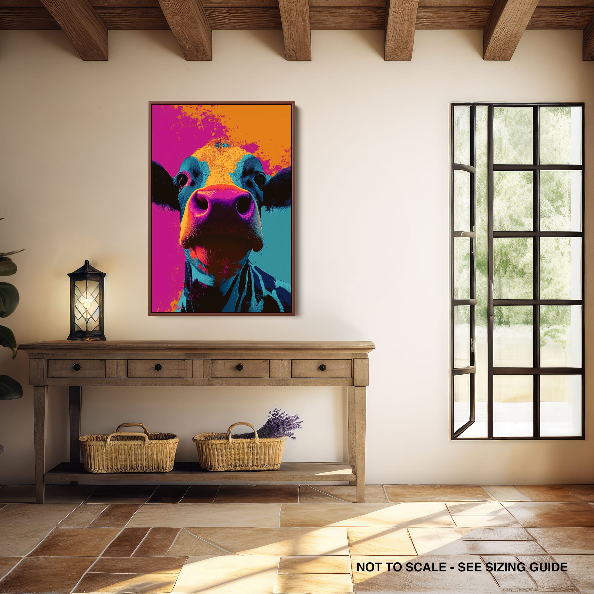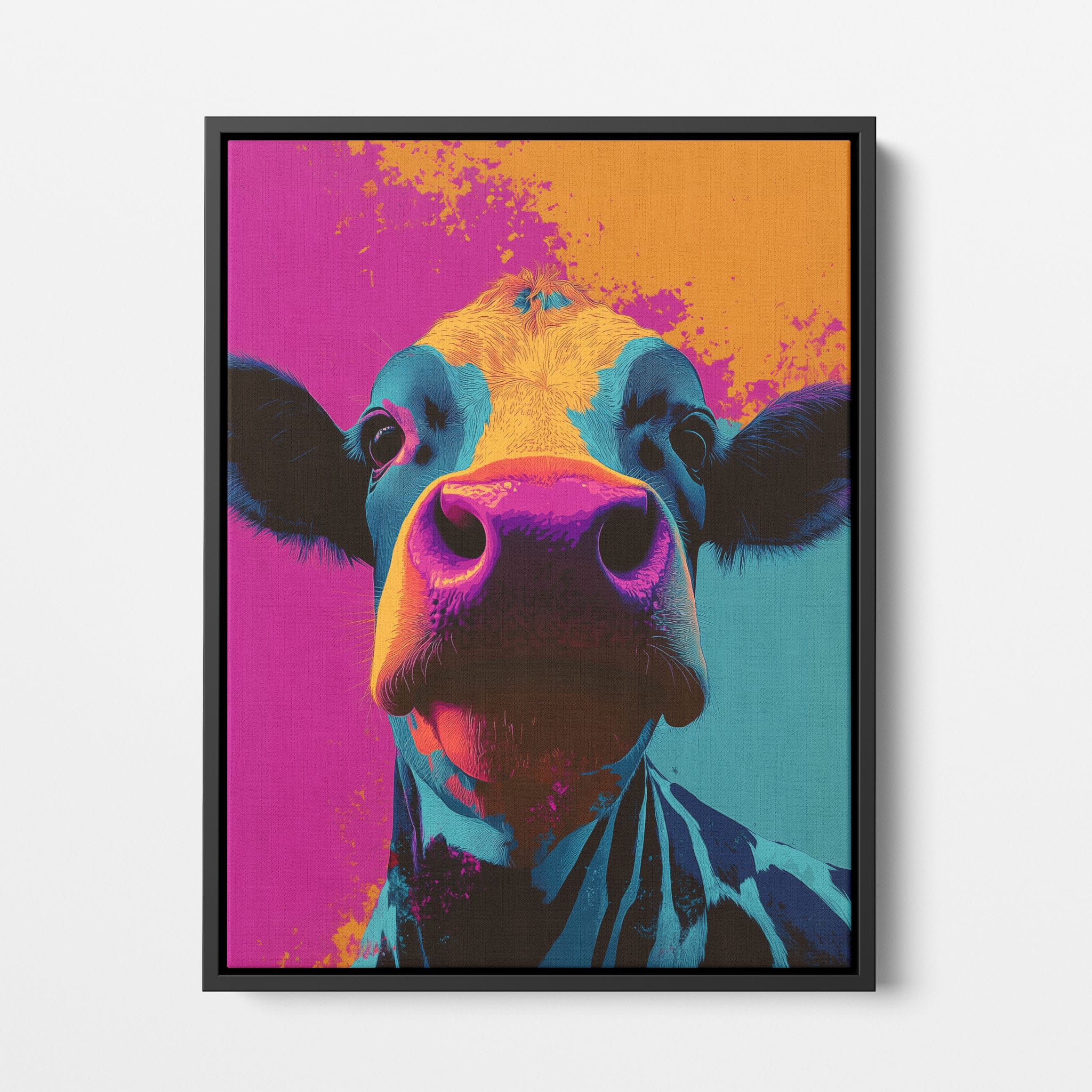 This vibrant digital illustration depicts a neon-hued cow, showcasing striking contrasts and bold colors reminiscent of Pop Art. The cow's face is the focal point, rendered in intense blues, pinks, and oranges, creating a surreal atmosphere. The unexpected color palette and whimsical texture invite viewers to see farm life in a new light. Ideal for modern and eclectic interiors, this piece makes a bold statement. Add this masterpiece to your collection for an artistic touch that's both contemporary and playful.