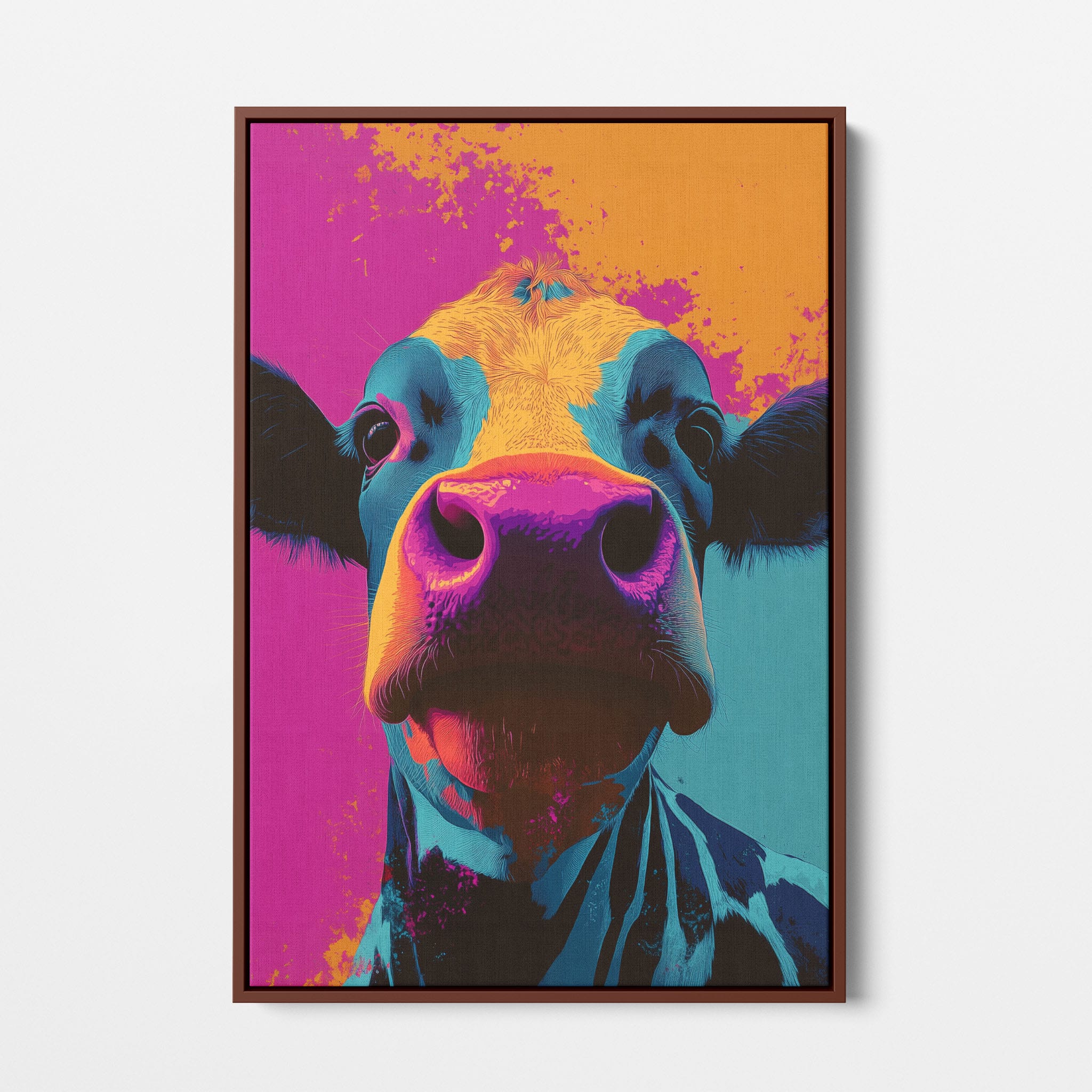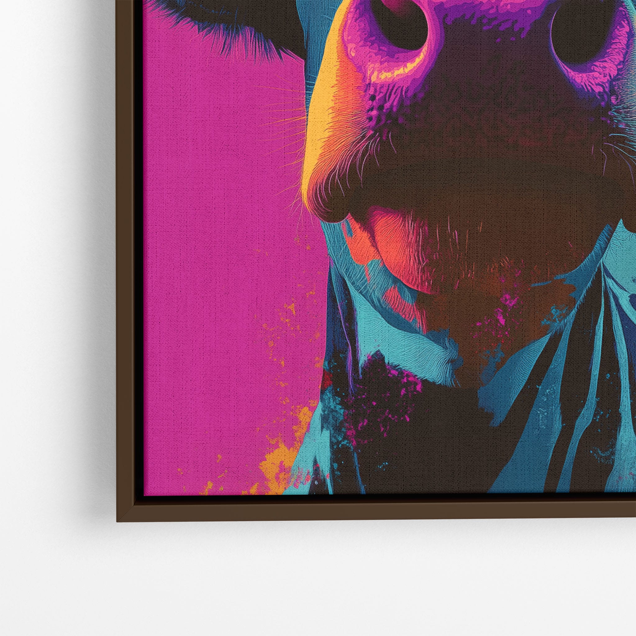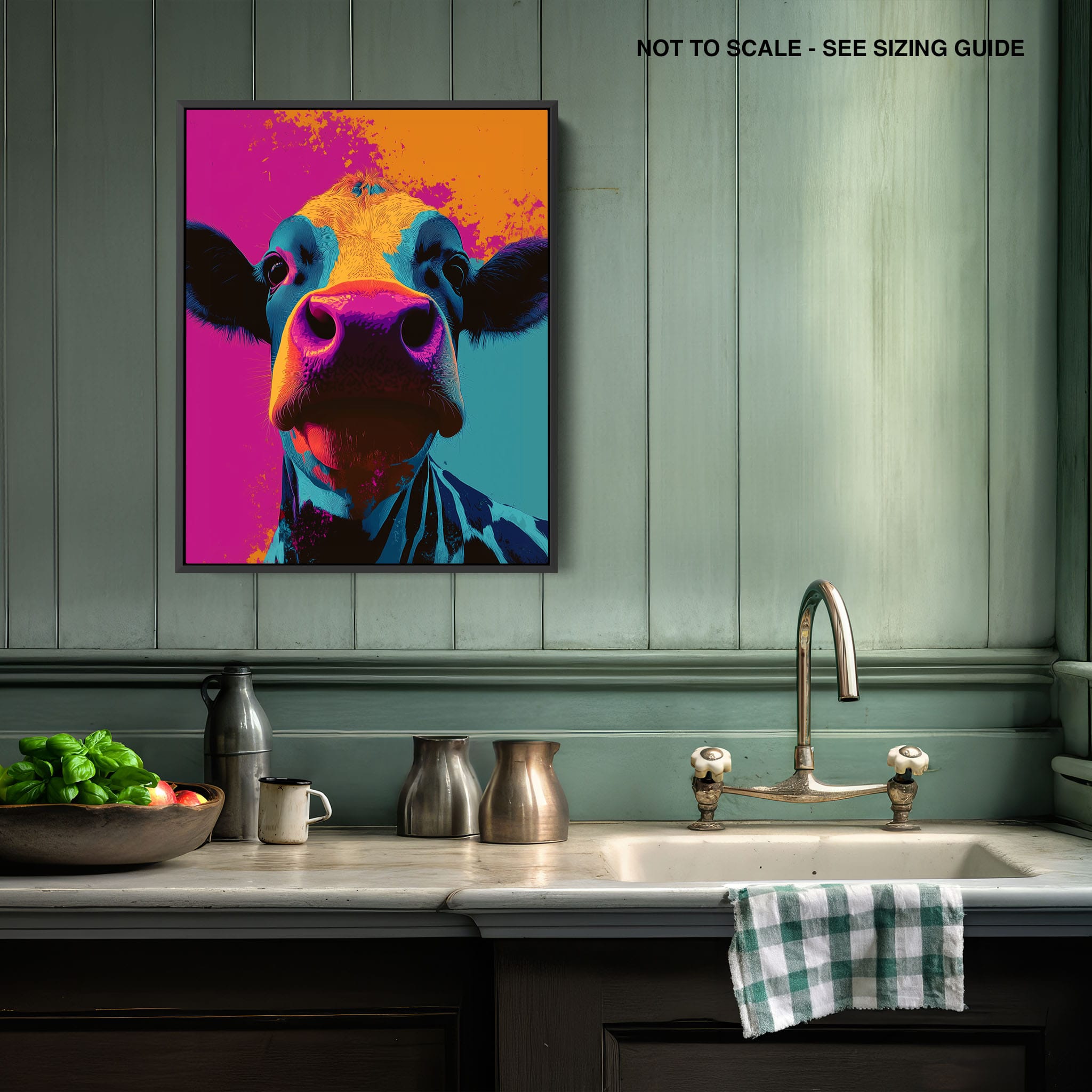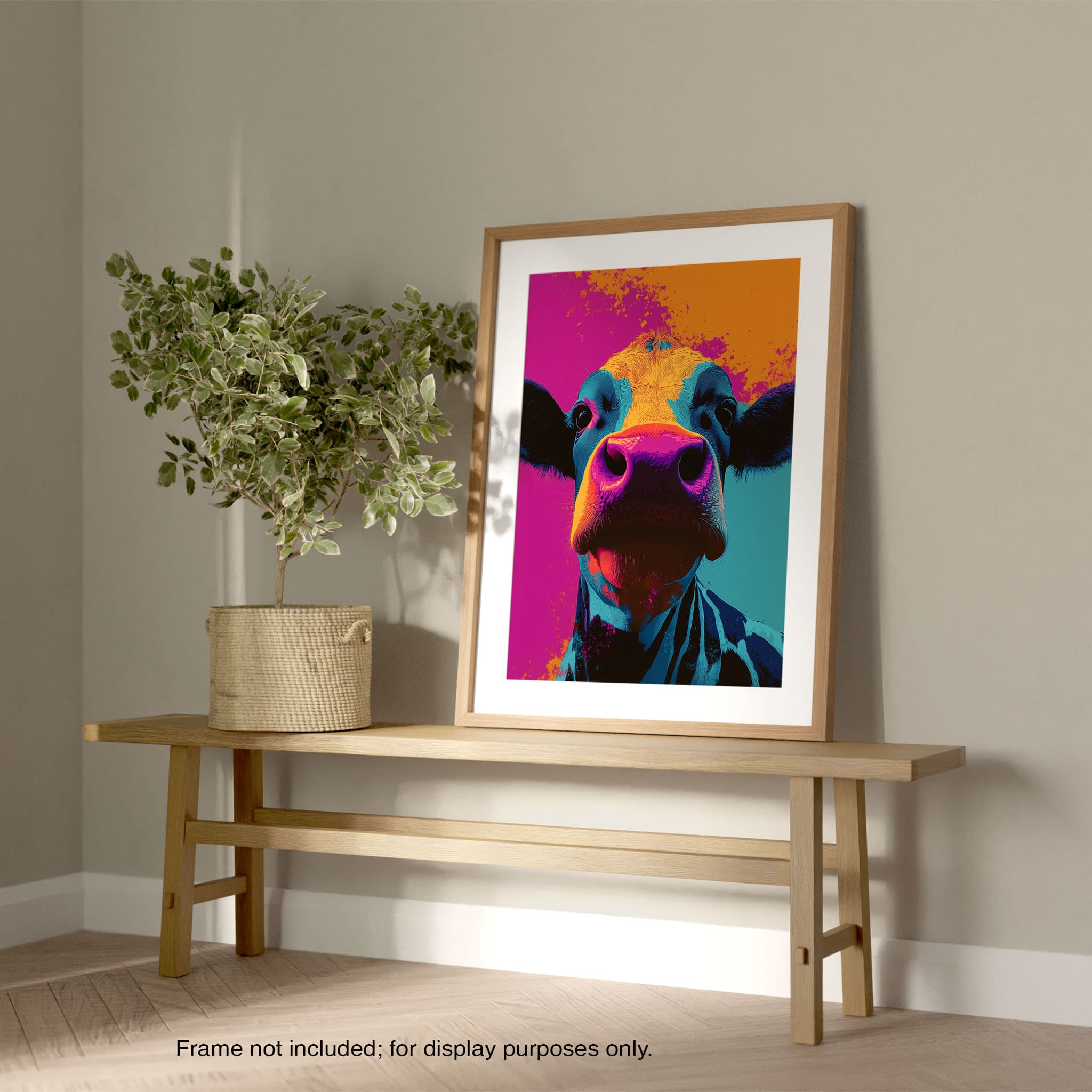 This vibrant digital illustration depicts a neon-hued cow, showcasing striking contrasts and bold colors reminiscent of Pop Art. The cow's face is the focal point, rendered in intense blues, pinks, and oranges, creating a surreal atmosphere. The unexpected color palette and whimsical texture invite viewers to see farm life in a new light. Ideal for modern and eclectic interiors, this piece makes a bold statement. Add this masterpiece to your collection for an artistic touch that's both contemporary and playful.