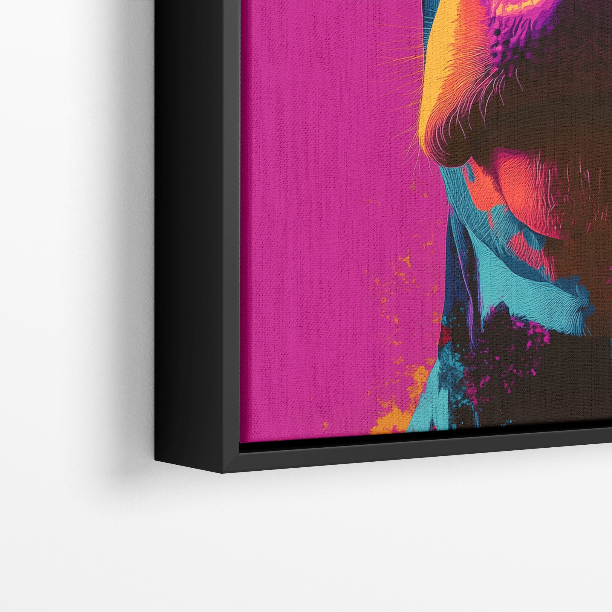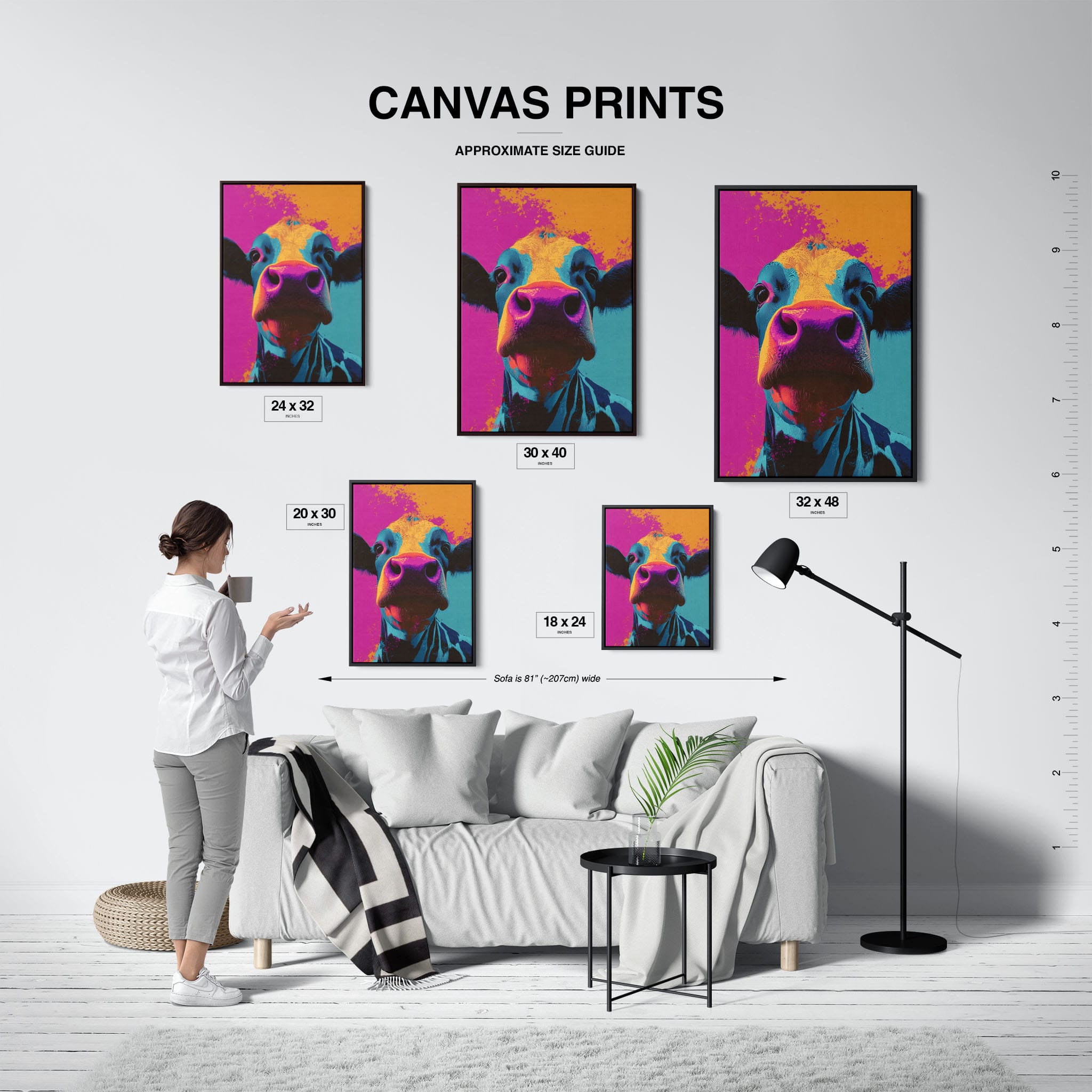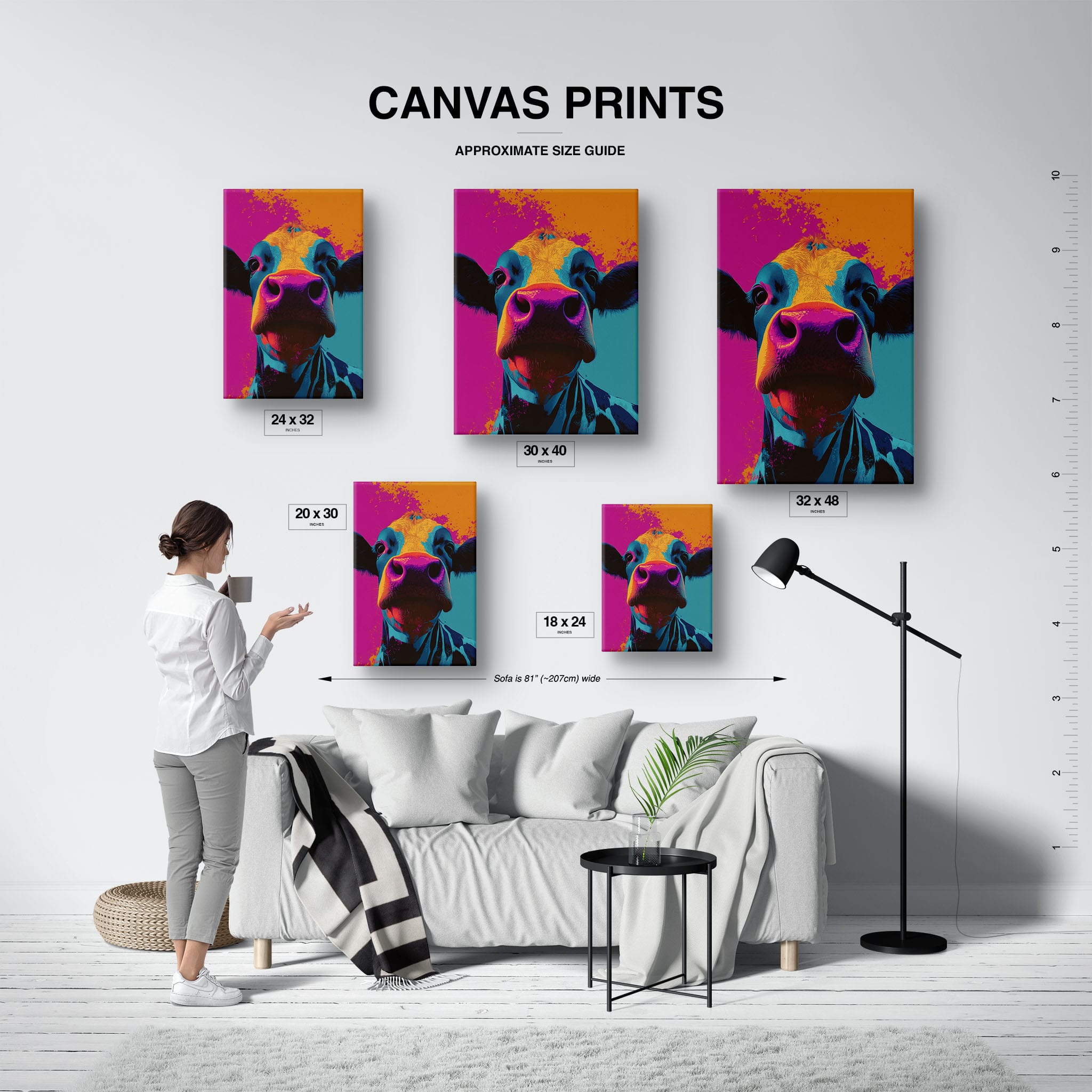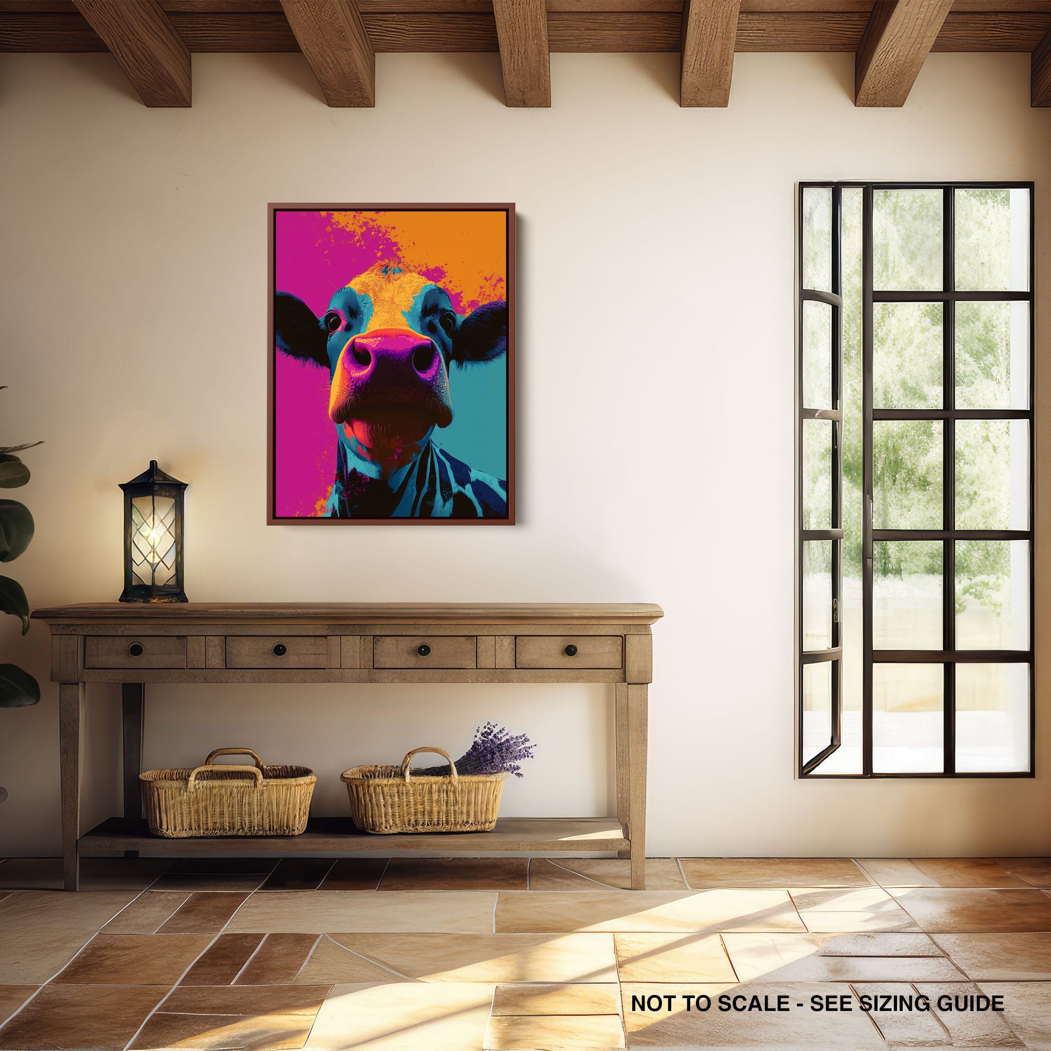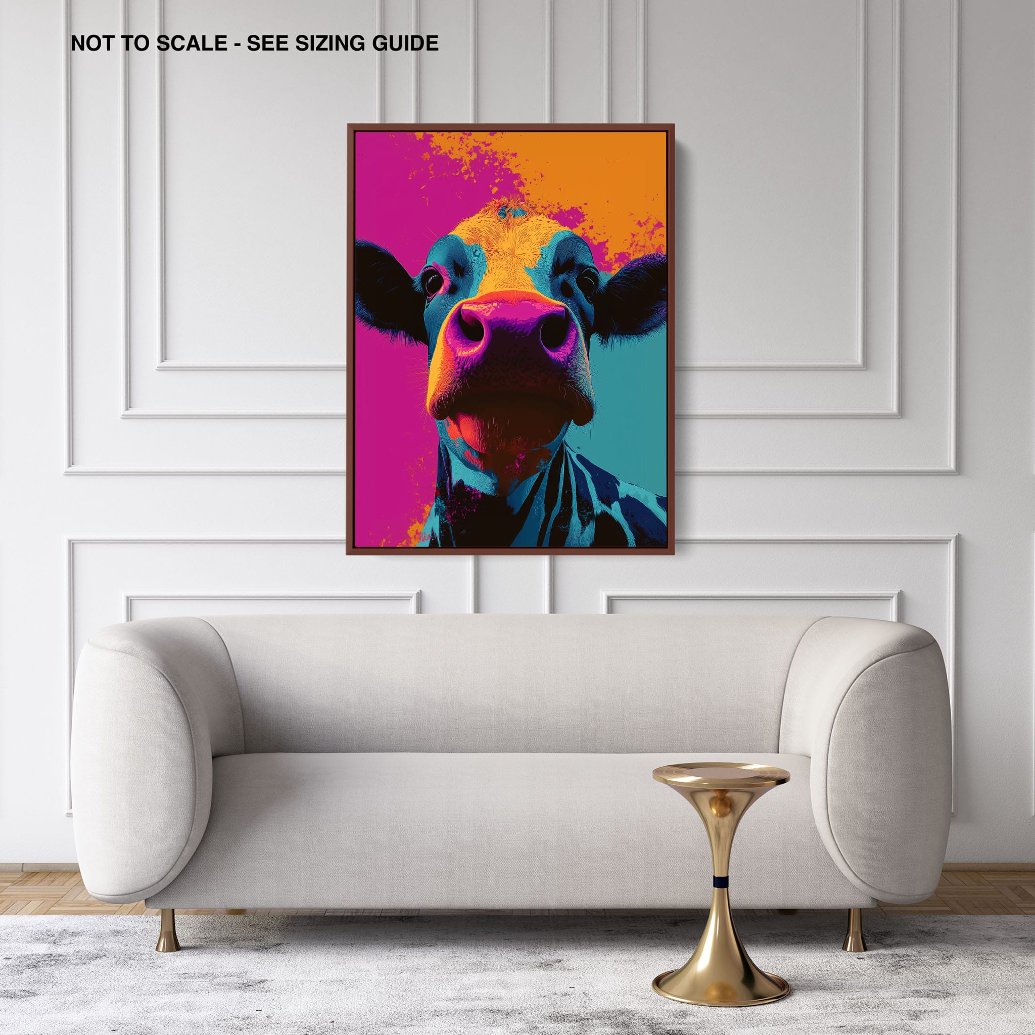This vibrant digital illustration depicts a neon-hued cow, showcasing striking contrasts and bold colors reminiscent of Pop Art. The cow's face is the focal point, rendered in intense blues, pinks, and oranges, creating a surreal atmosphere. The unexpected color palette and whimsical texture invite viewers to see farm life in a new light. Ideal for modern and eclectic interiors, this piece makes a bold statement. Add this masterpiece to your collection for an artistic touch that's both contemporary and playful.