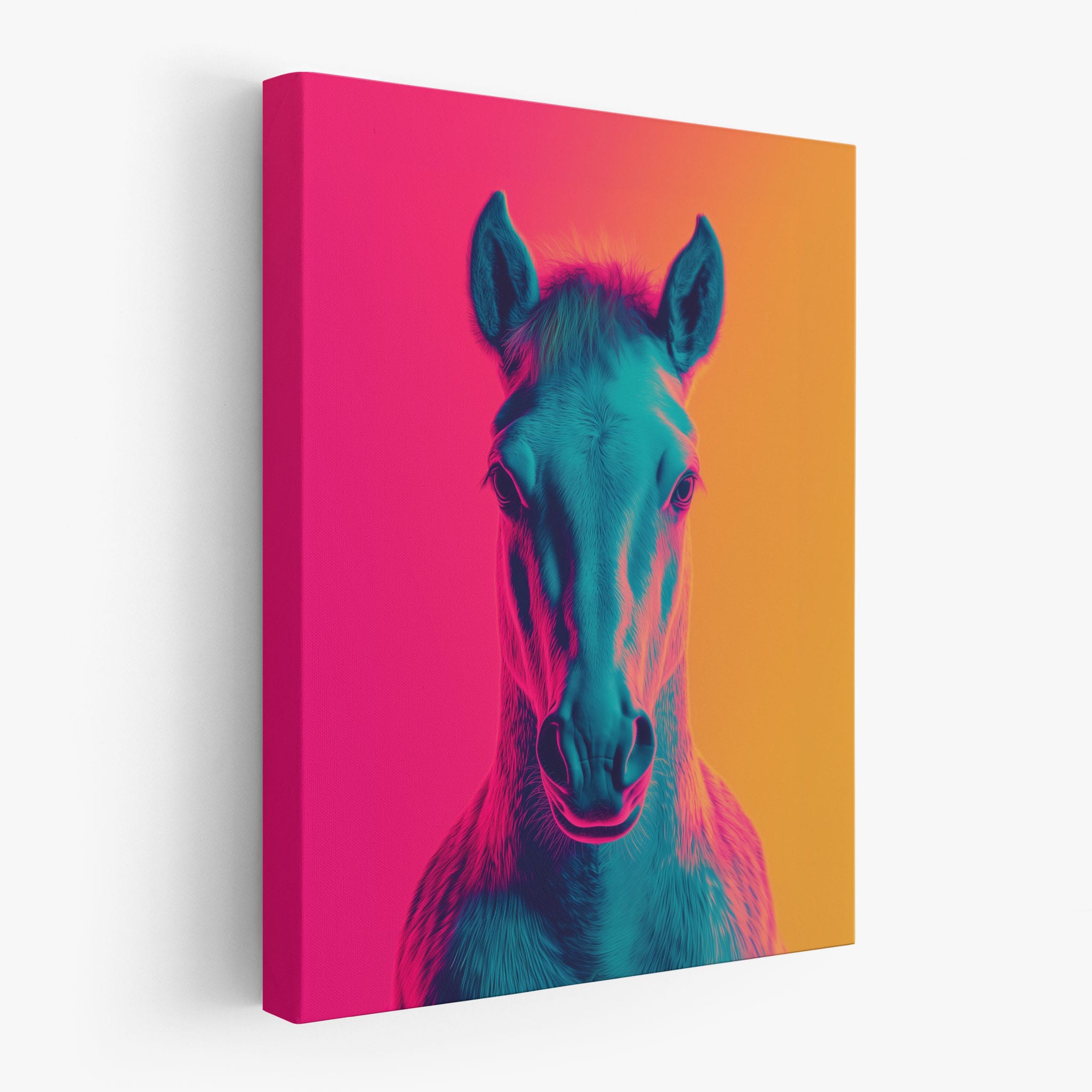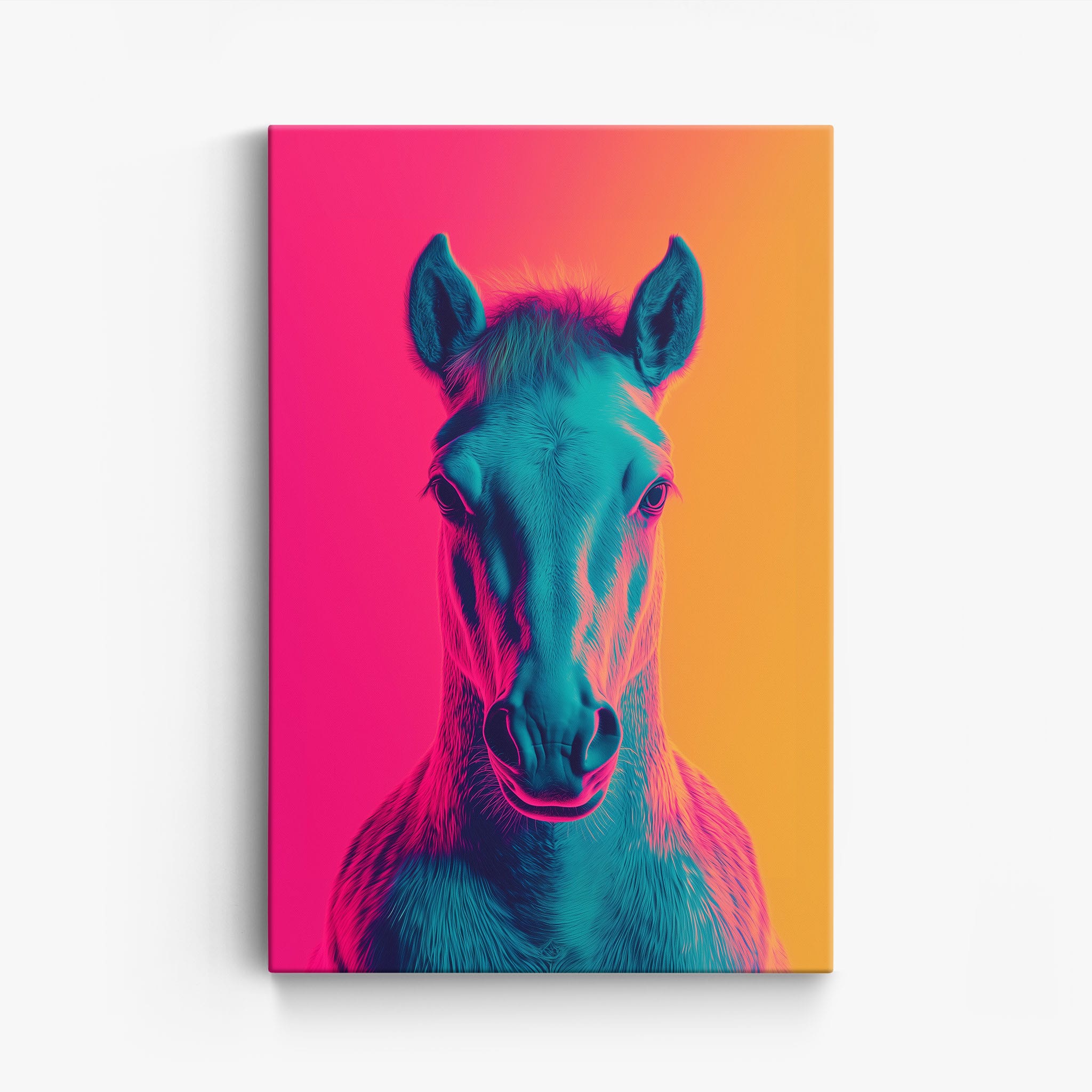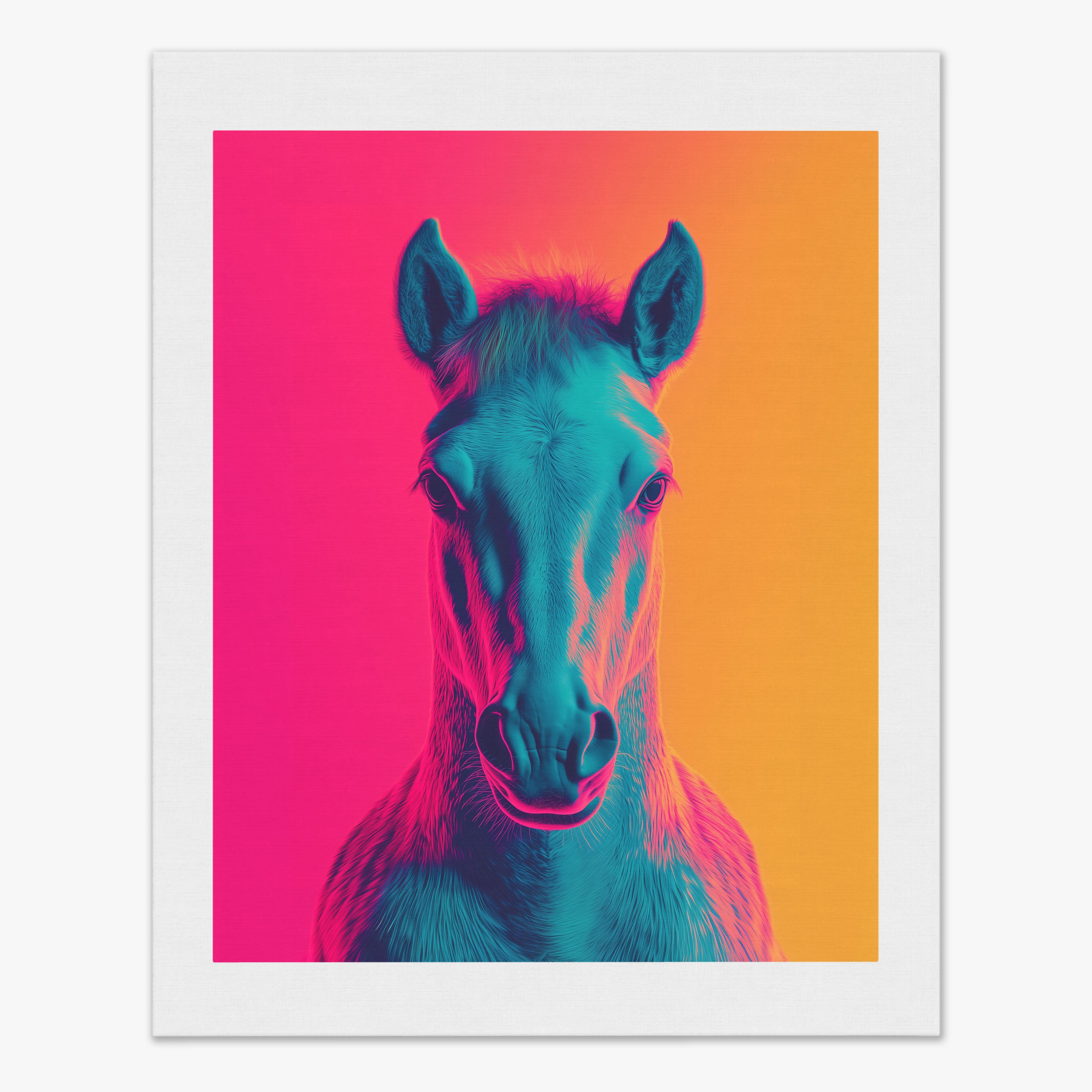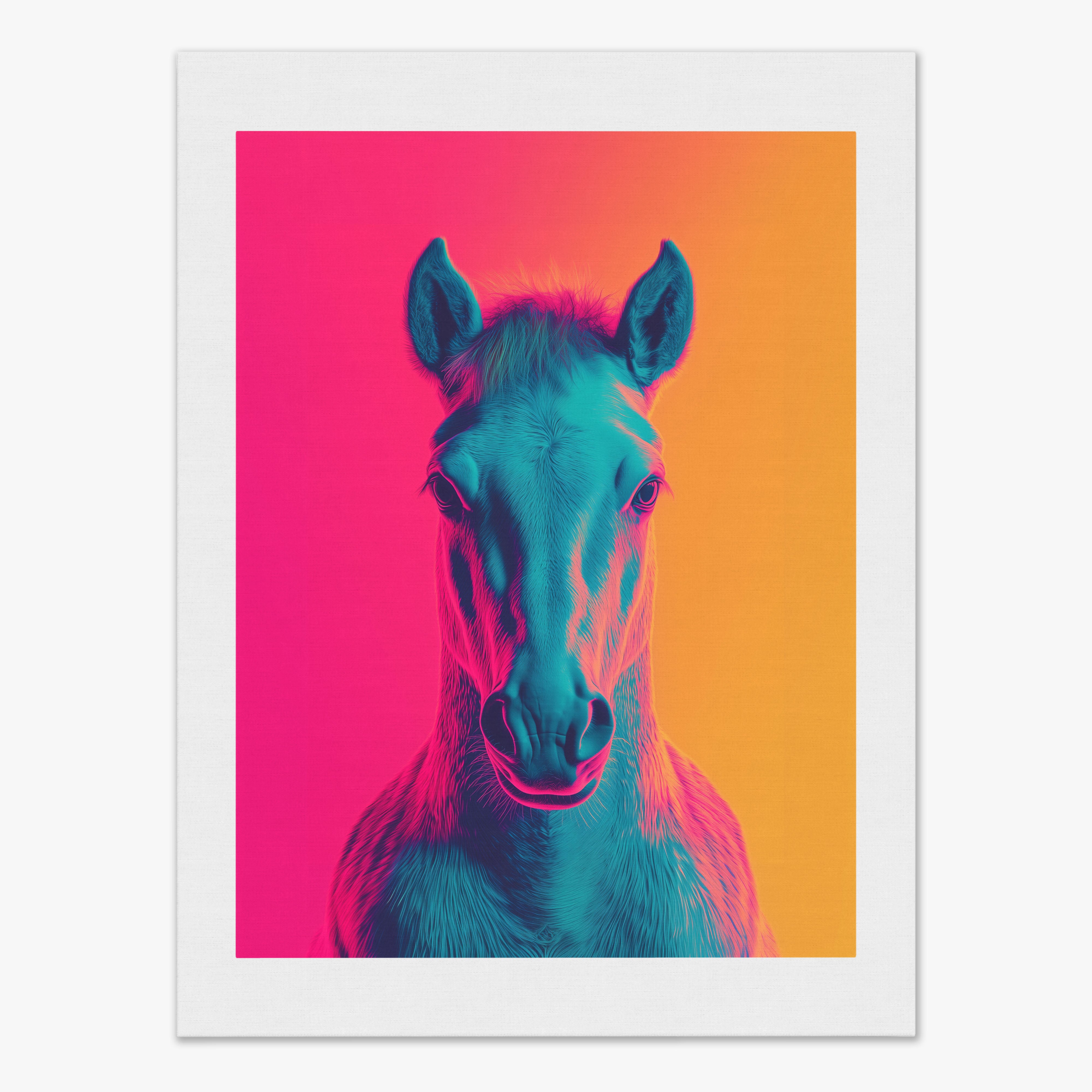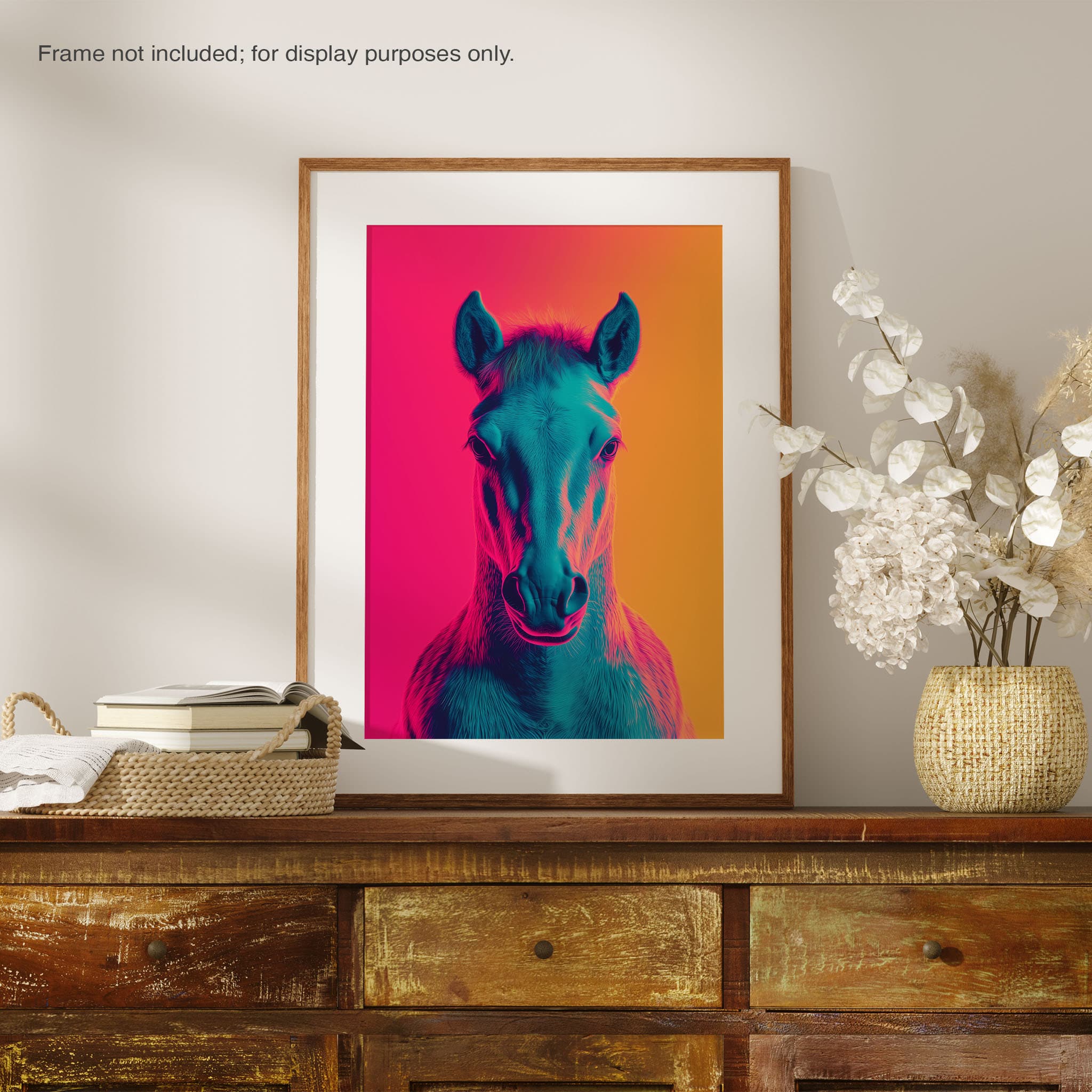 This captivating digital illustration features a horse enveloped in vibrant neon hues, seamlessly blending electric blue and radiant pink. The meticulous attention to detail is evident in the horse’s lifelike texture, adding depth and dimension. The pop art influence is striking, characterized by bold colors and dynamic energy, while hints of surrealism create an otherworldly charm. Perfect for contemporary spaces, this piece is a stylish statement that brings a burst of color and personality to any setting. Add this unique artwork to your collection and transform your decor with its stunning visual appeal.