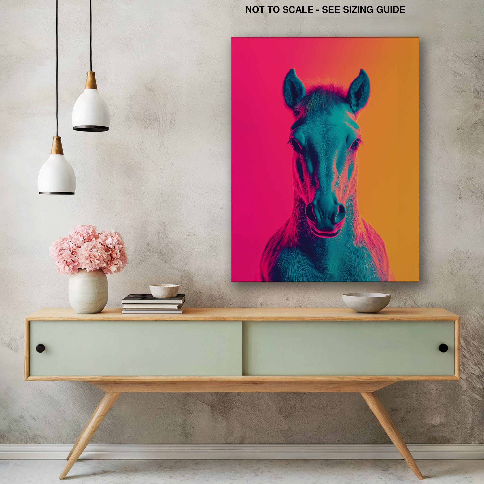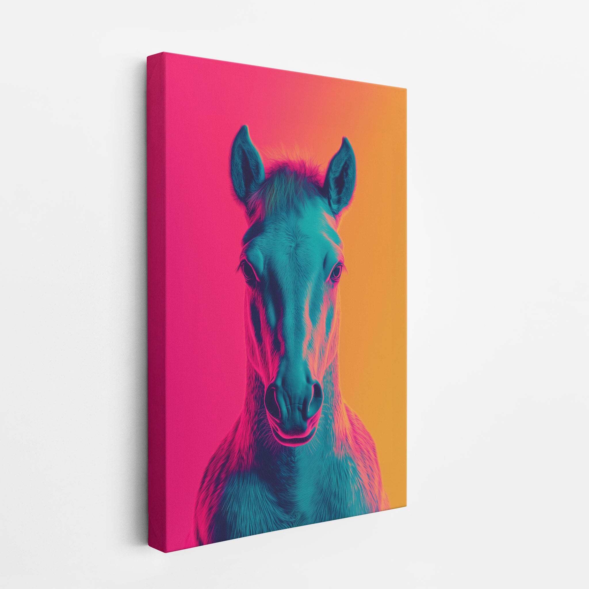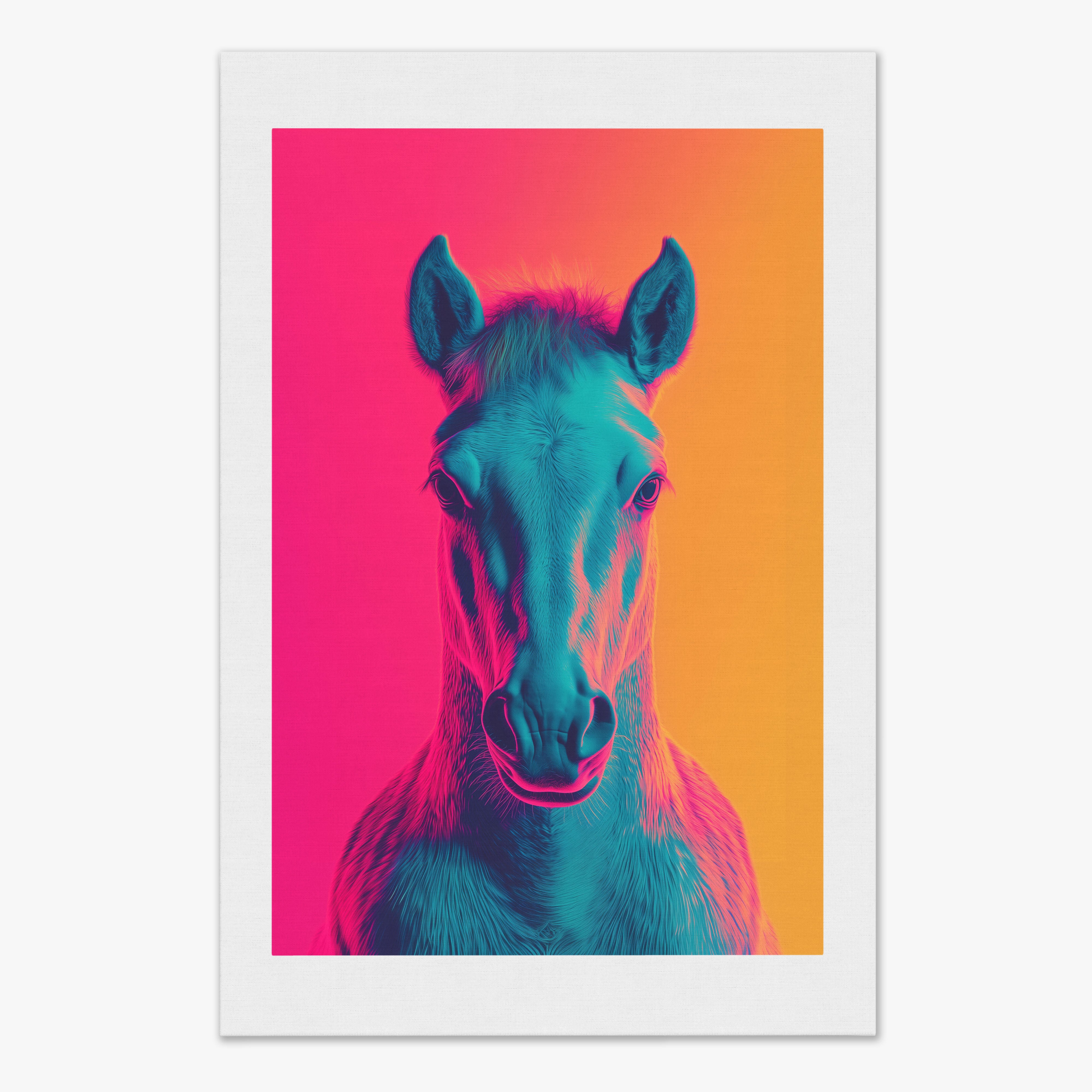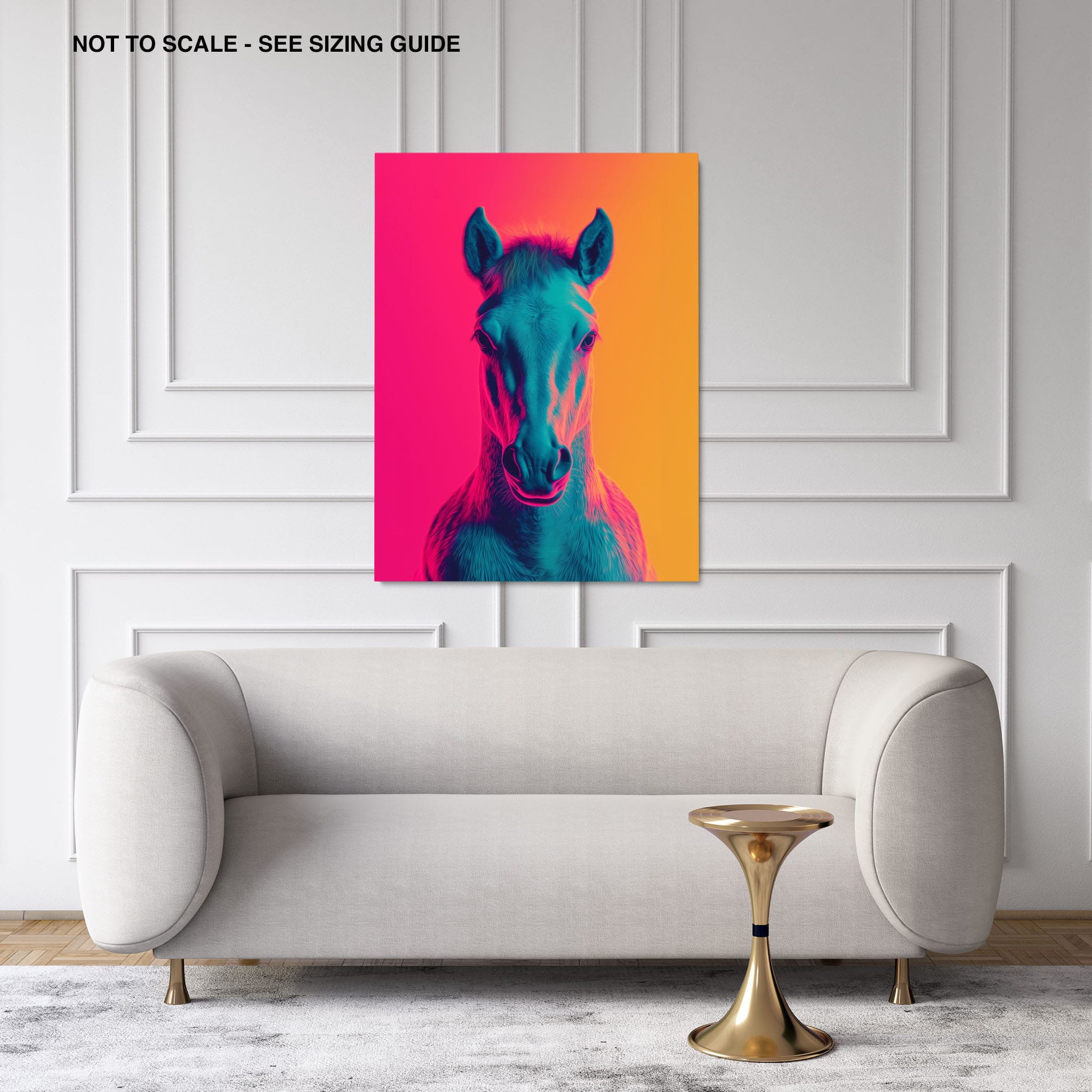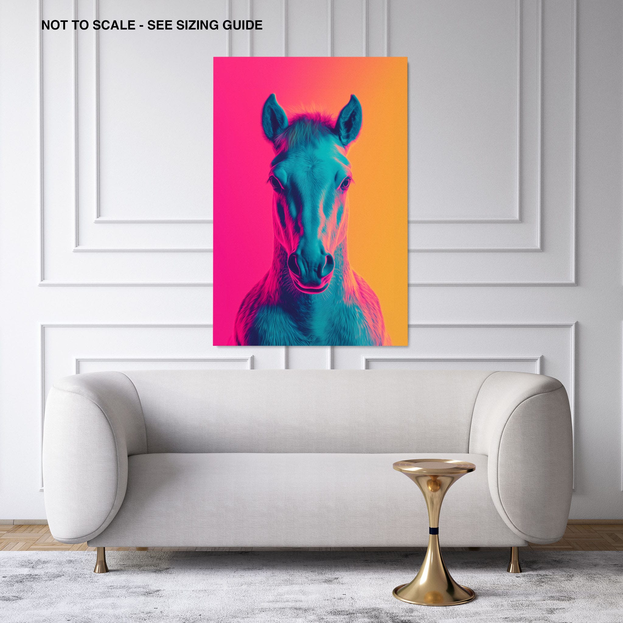 This captivating digital illustration features a horse enveloped in vibrant neon hues, seamlessly blending electric blue and radiant pink. The meticulous attention to detail is evident in the horse’s lifelike texture, adding depth and dimension. The pop art influence is striking, characterized by bold colors and dynamic energy, while hints of surrealism create an otherworldly charm. Perfect for contemporary spaces, this piece is a stylish statement that brings a burst of color and personality to any setting. Add this unique artwork to your collection and transform your decor with its stunning visual appeal.