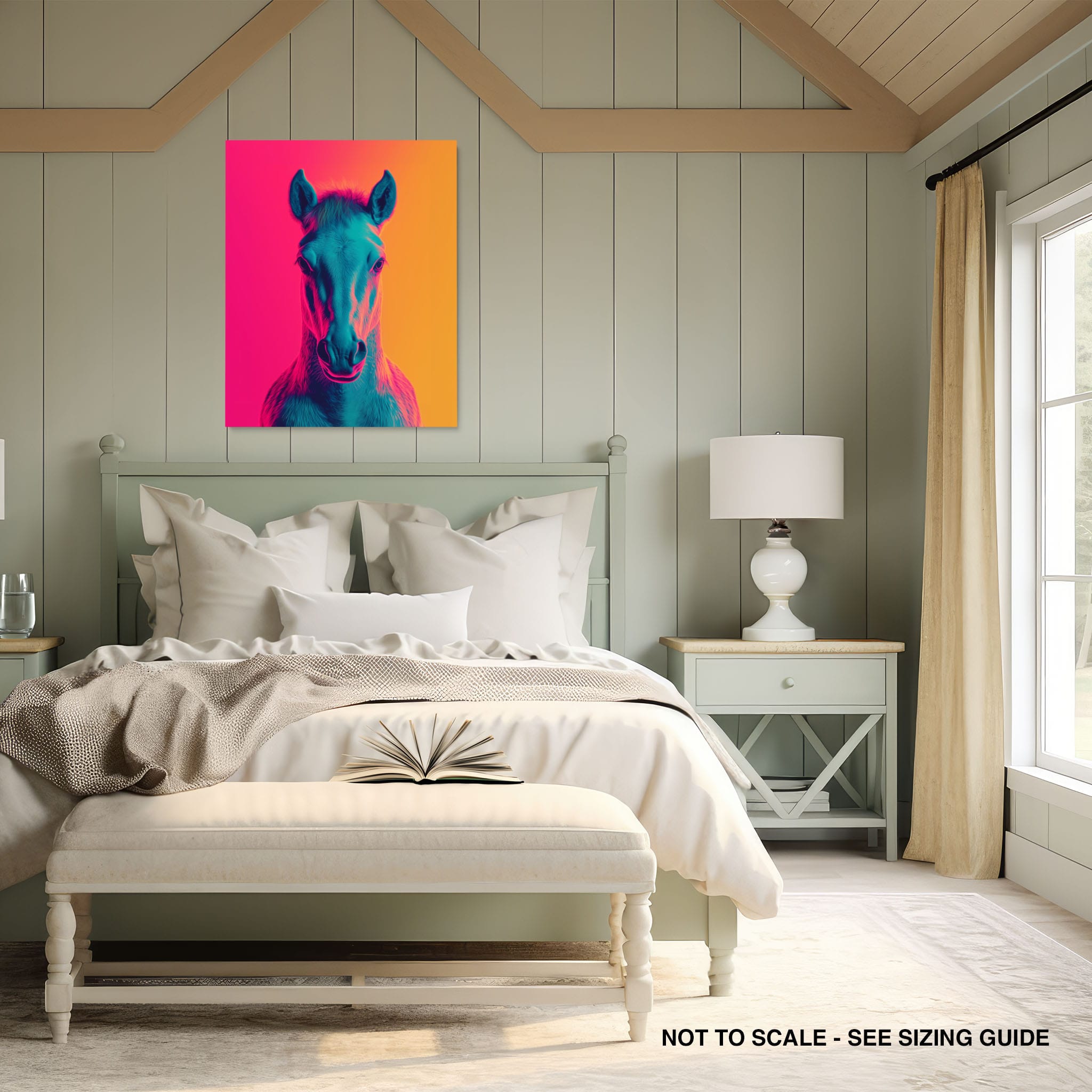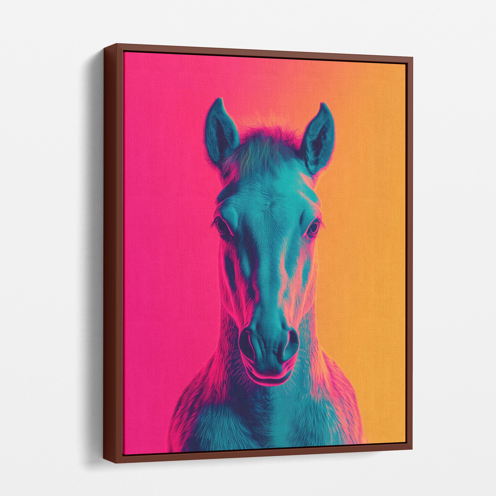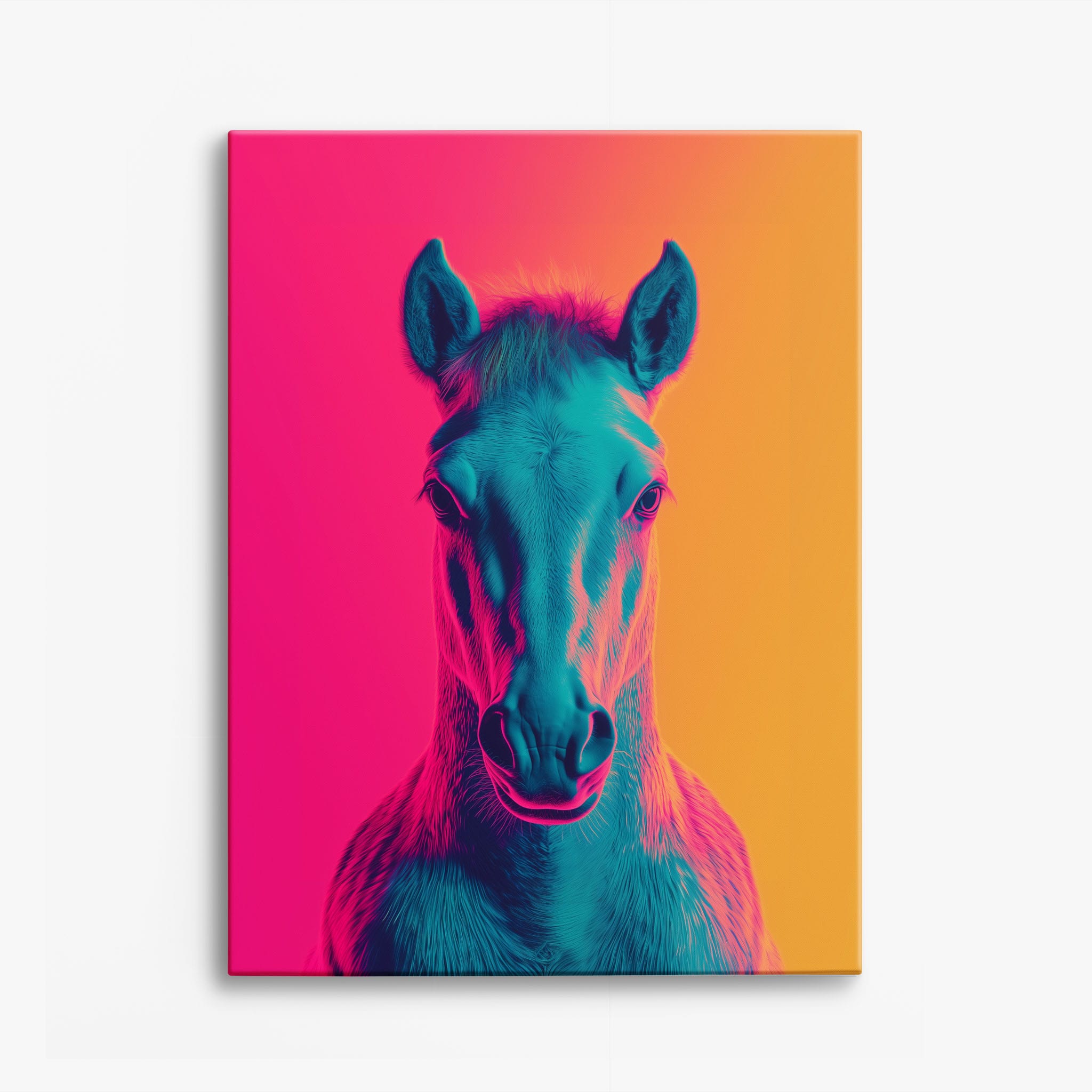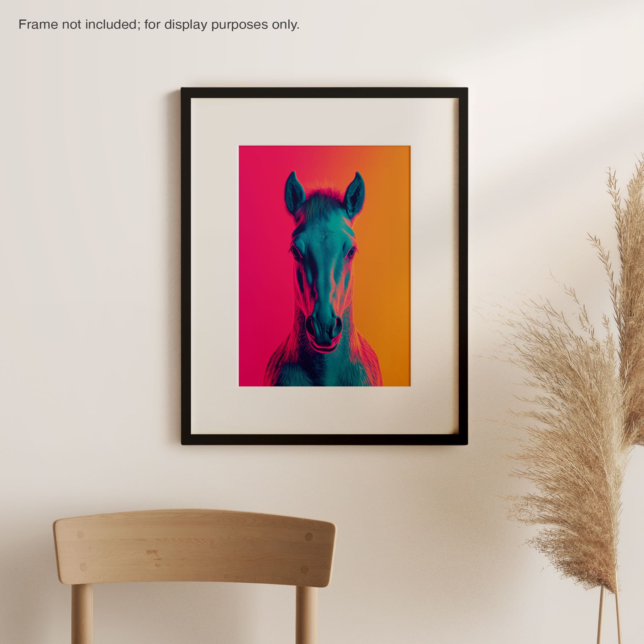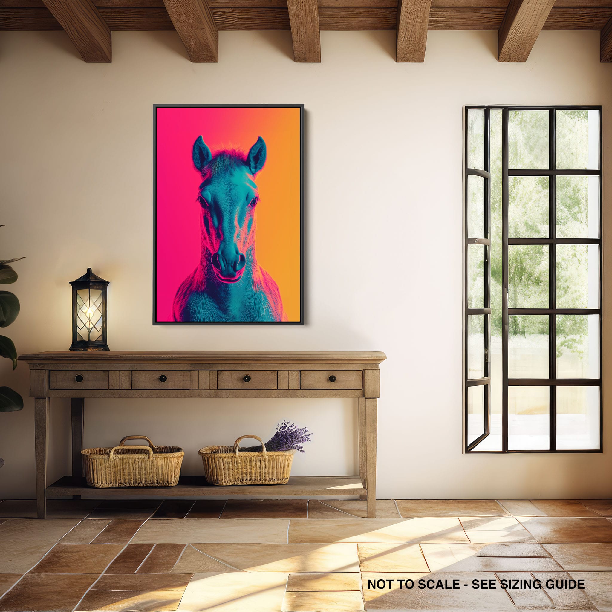 This captivating digital illustration features a horse enveloped in vibrant neon hues, seamlessly blending electric blue and radiant pink. The meticulous attention to detail is evident in the horse’s lifelike texture, adding depth and dimension. The pop art influence is striking, characterized by bold colors and dynamic energy, while hints of surrealism create an otherworldly charm. Perfect for contemporary spaces, this piece is a stylish statement that brings a burst of color and personality to any setting. Add this unique artwork to your collection and transform your decor with its stunning visual appeal.