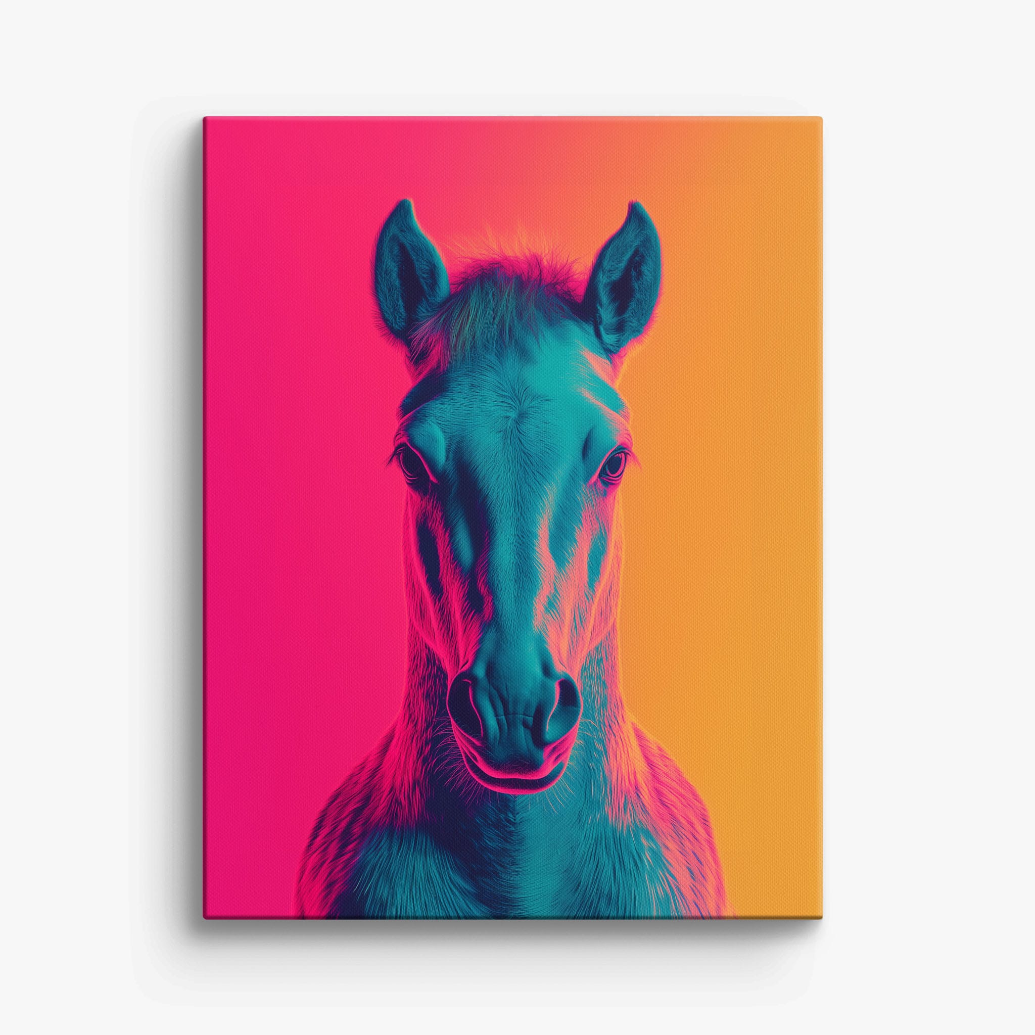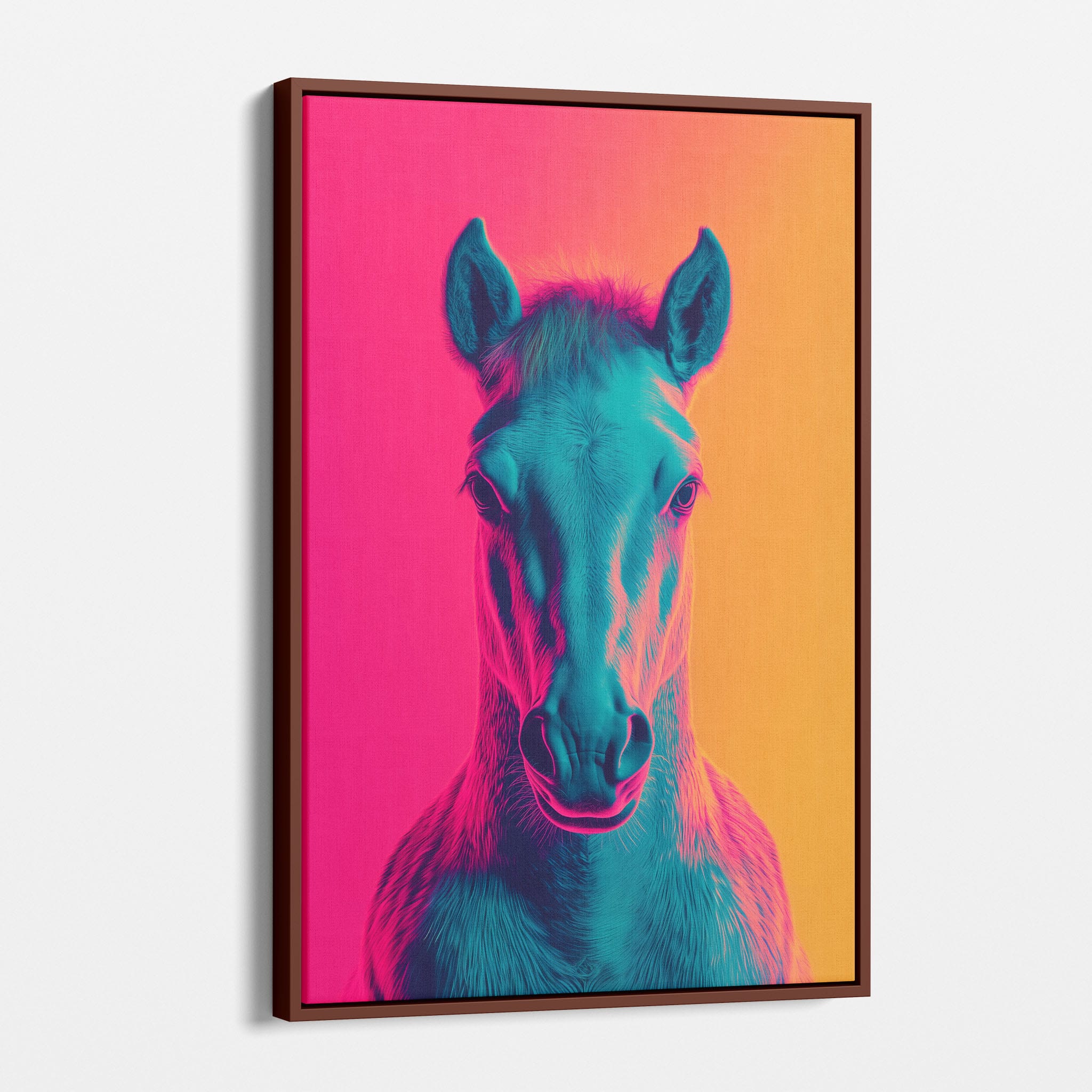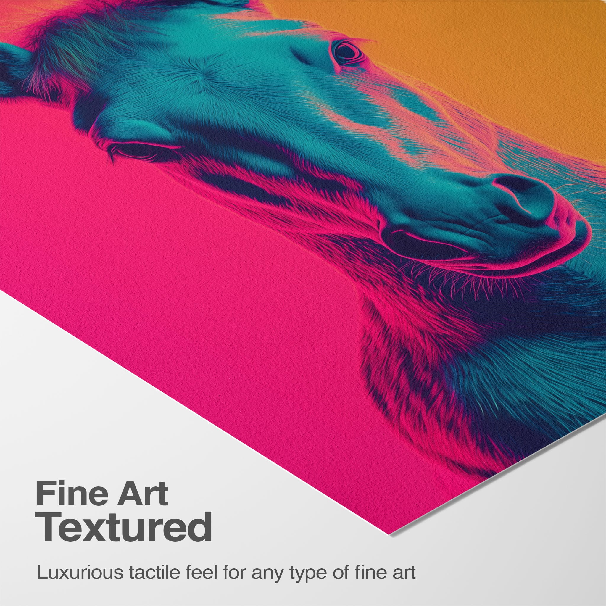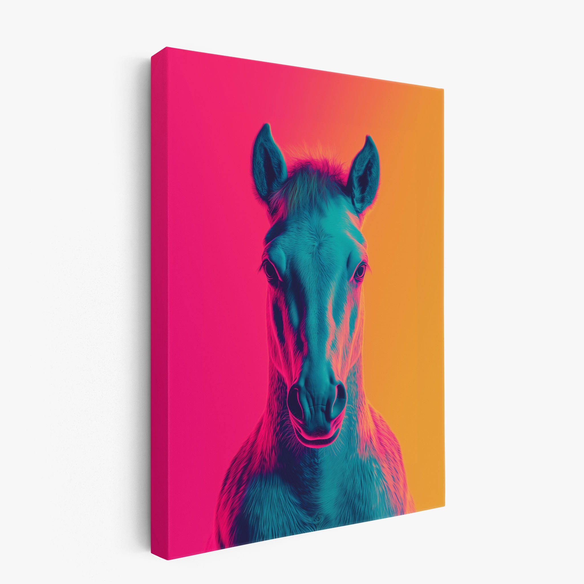 This captivating digital illustration features a horse enveloped in vibrant neon hues, seamlessly blending electric blue and radiant pink. The meticulous attention to detail is evident in the horse’s lifelike texture, adding depth and dimension. The pop art influence is striking, characterized by bold colors and dynamic energy, while hints of surrealism create an otherworldly charm. Perfect for contemporary spaces, this piece is a stylish statement that brings a burst of color and personality to any setting. Add this unique artwork to your collection and transform your decor with its stunning visual appeal.