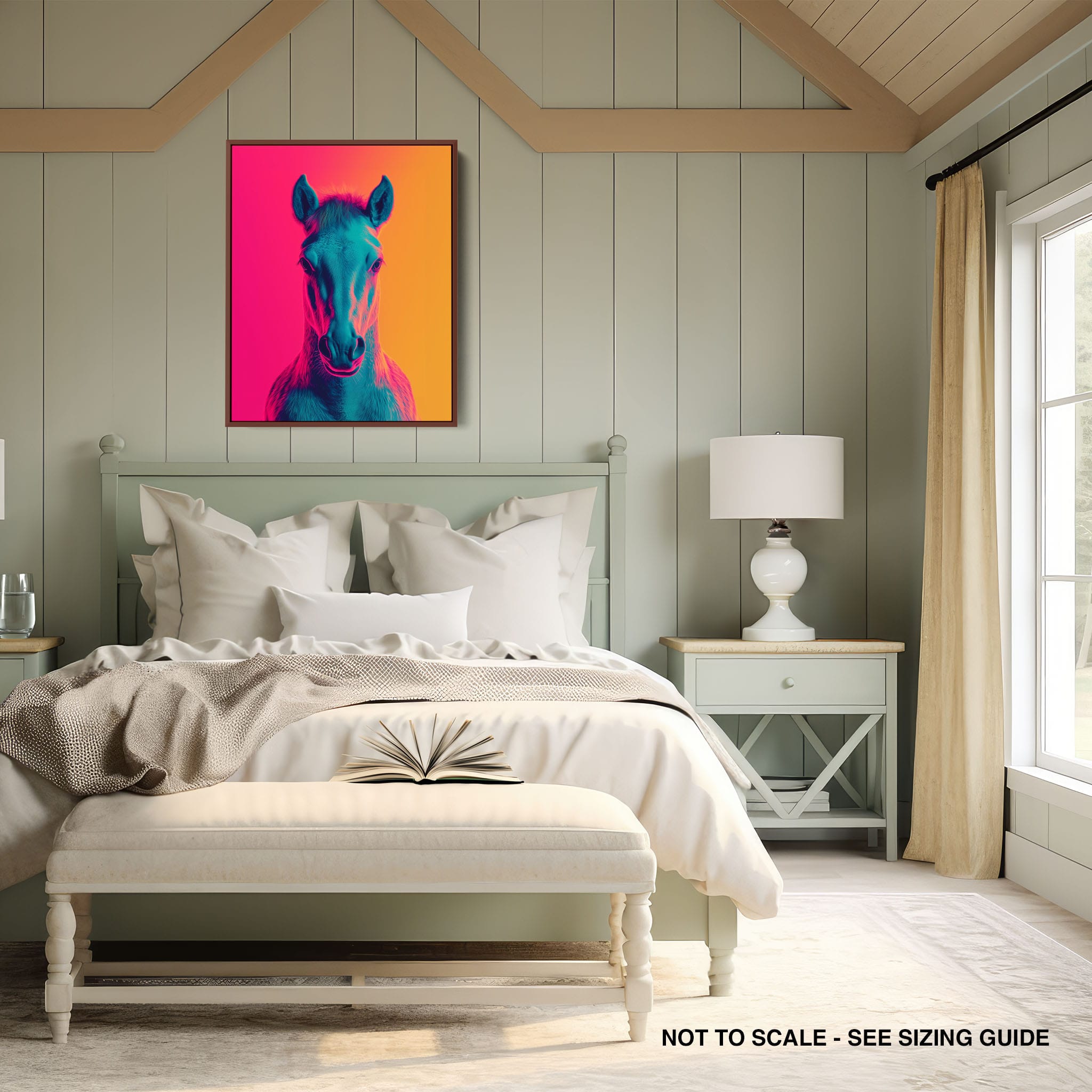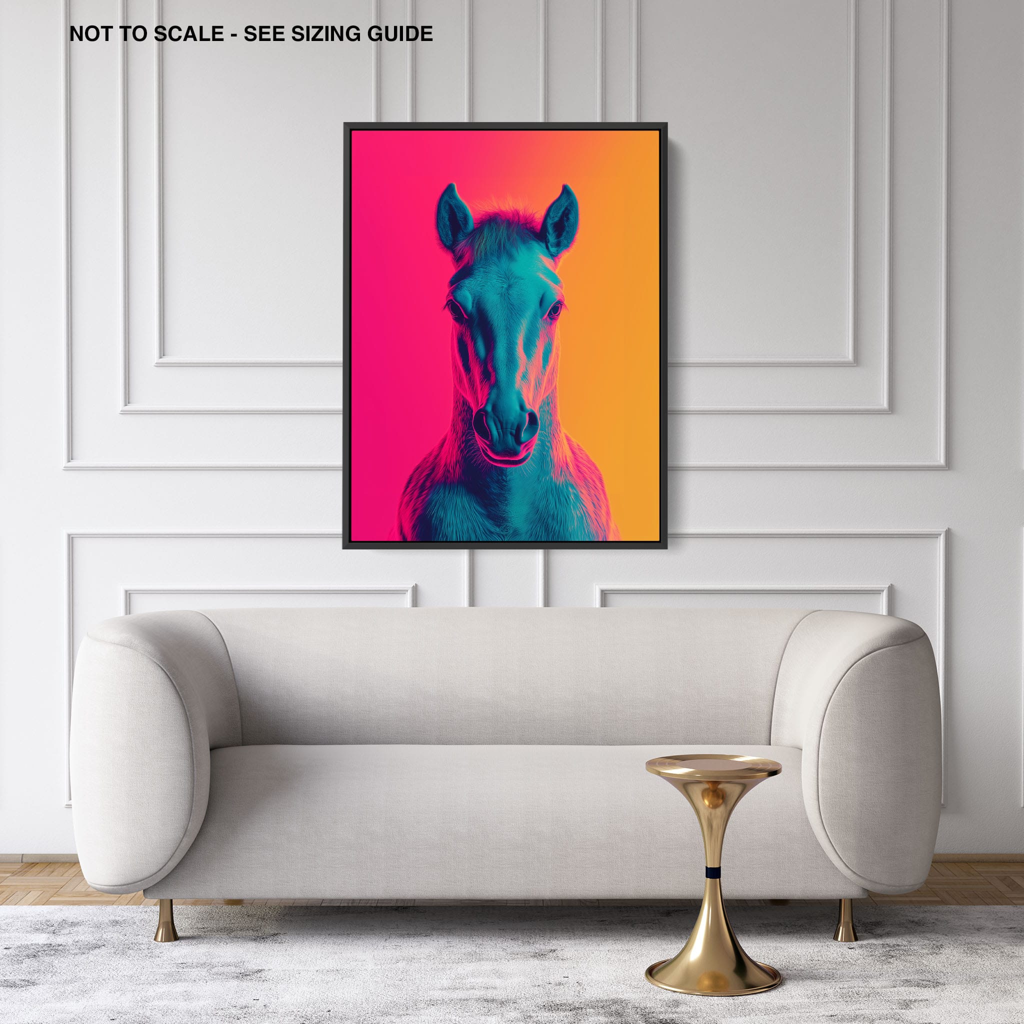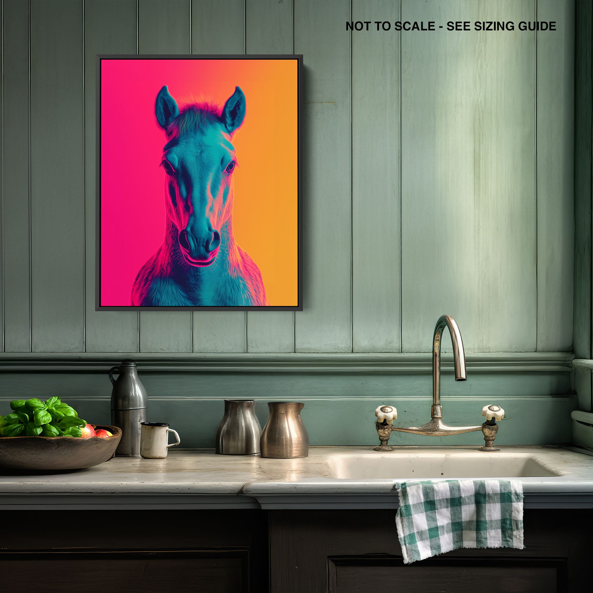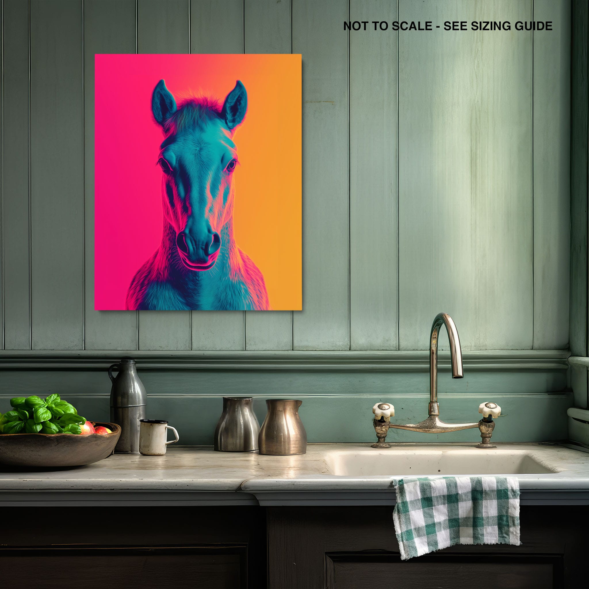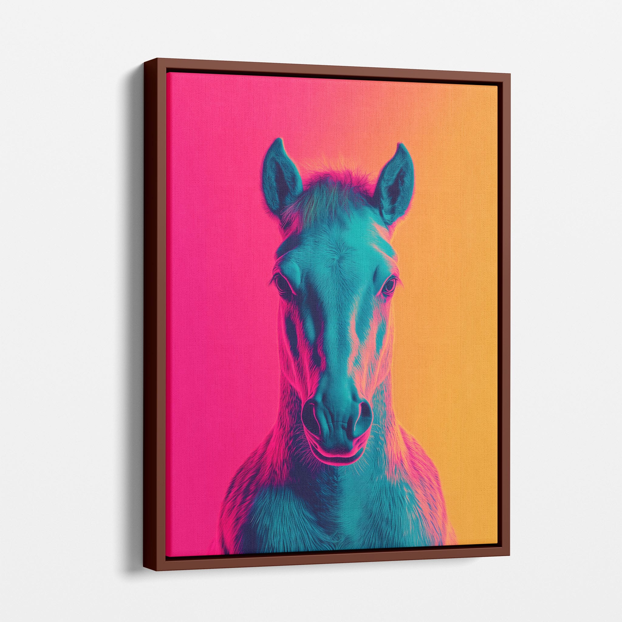 This captivating digital illustration features a horse enveloped in vibrant neon hues, seamlessly blending electric blue and radiant pink. The meticulous attention to detail is evident in the horse’s lifelike texture, adding depth and dimension. The pop art influence is striking, characterized by bold colors and dynamic energy, while hints of surrealism create an otherworldly charm. Perfect for contemporary spaces, this piece is a stylish statement that brings a burst of color and personality to any setting. Add this unique artwork to your collection and transform your decor with its stunning visual appeal.