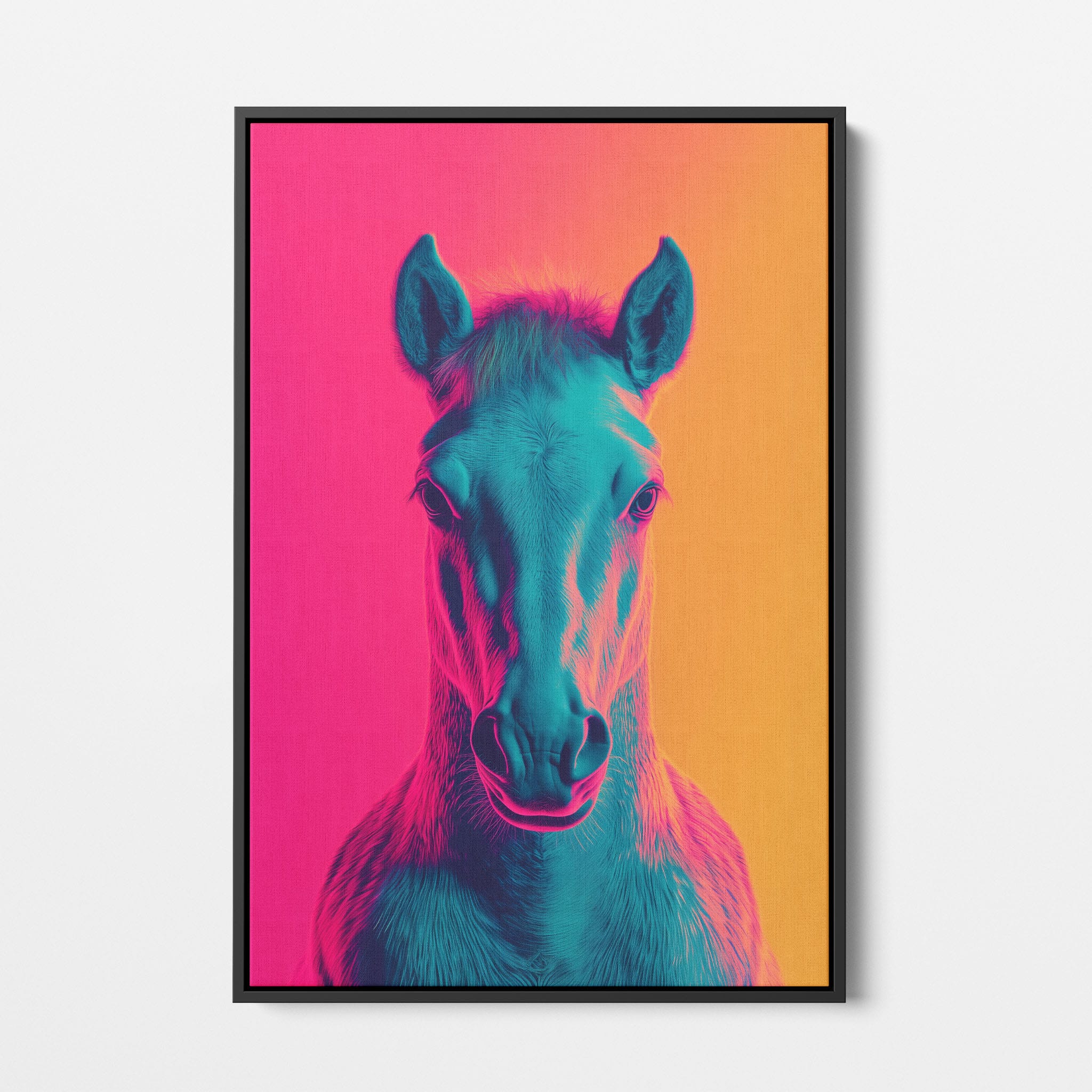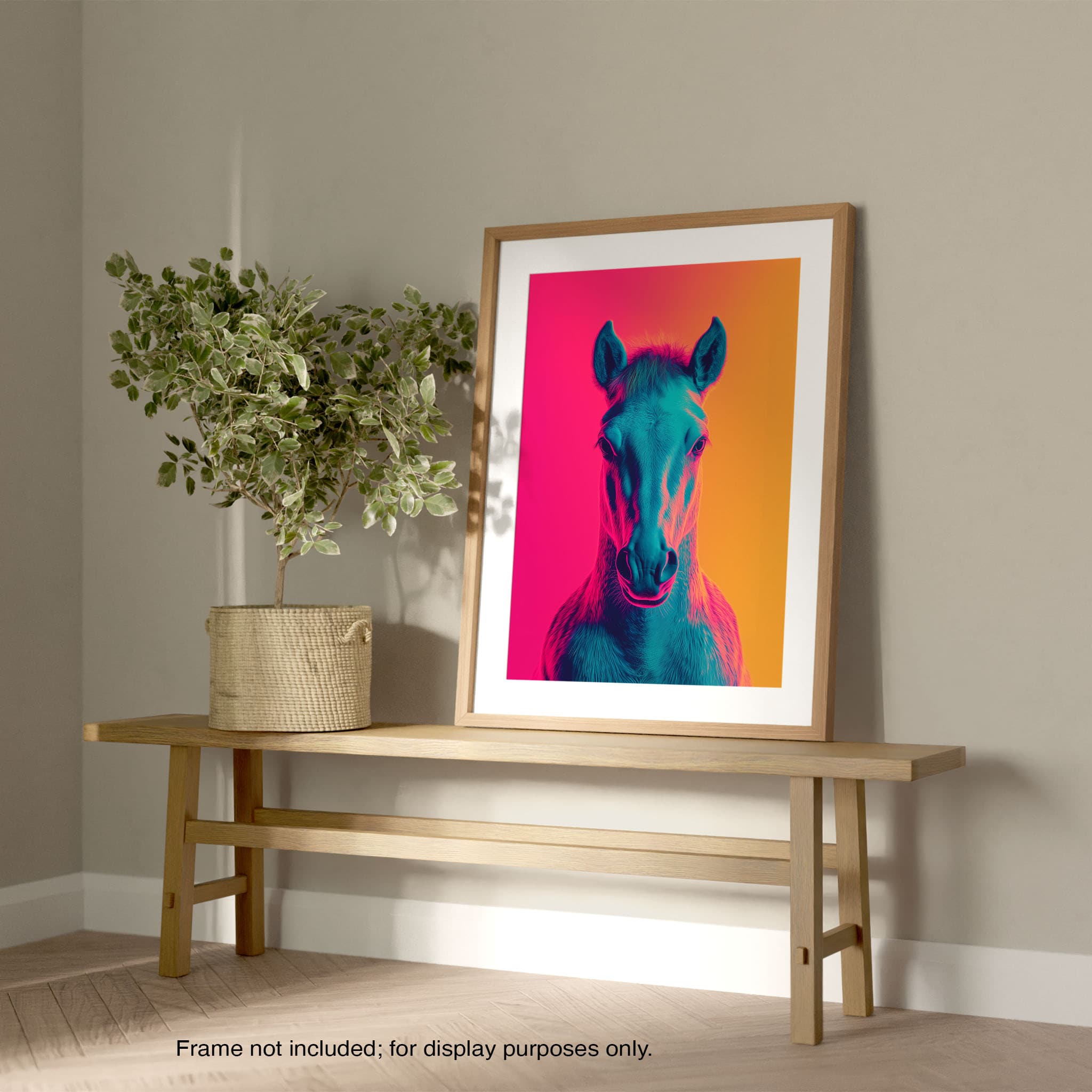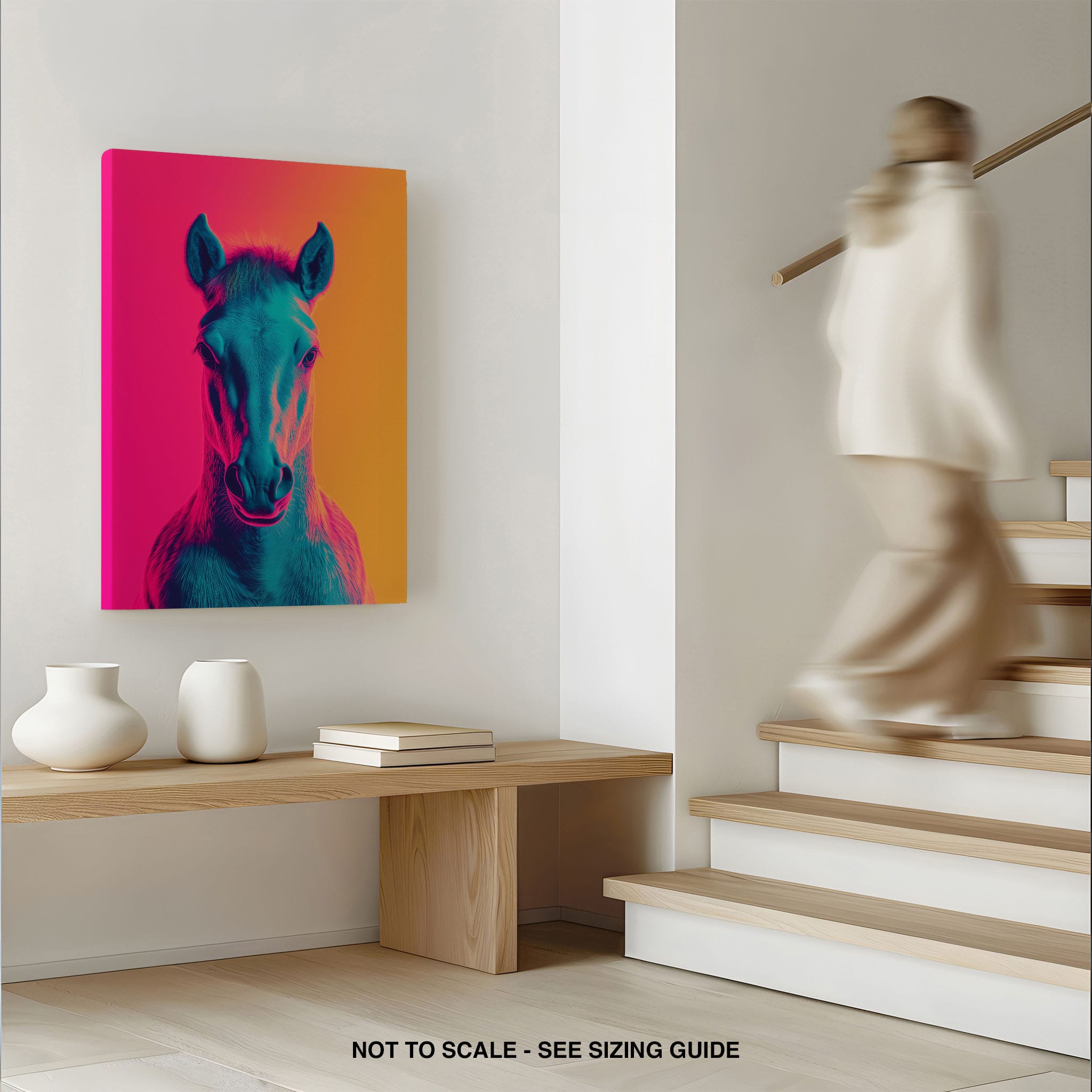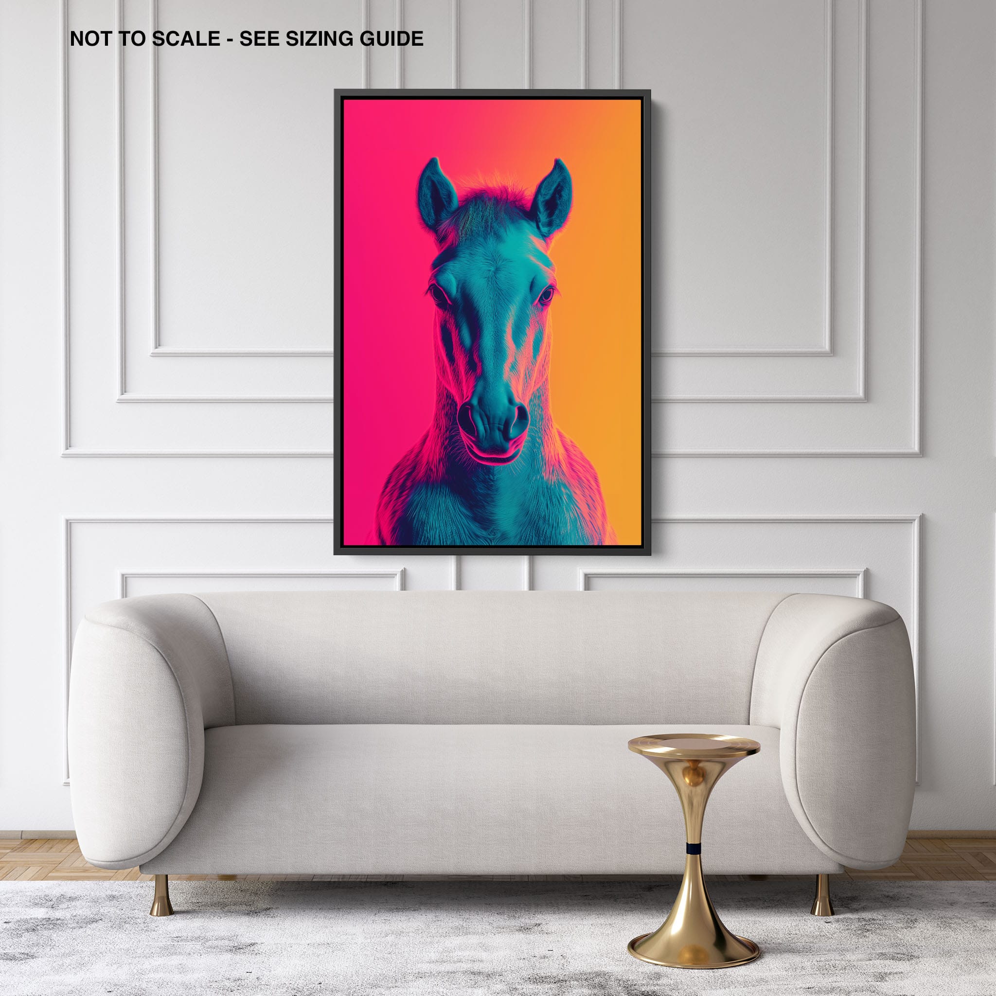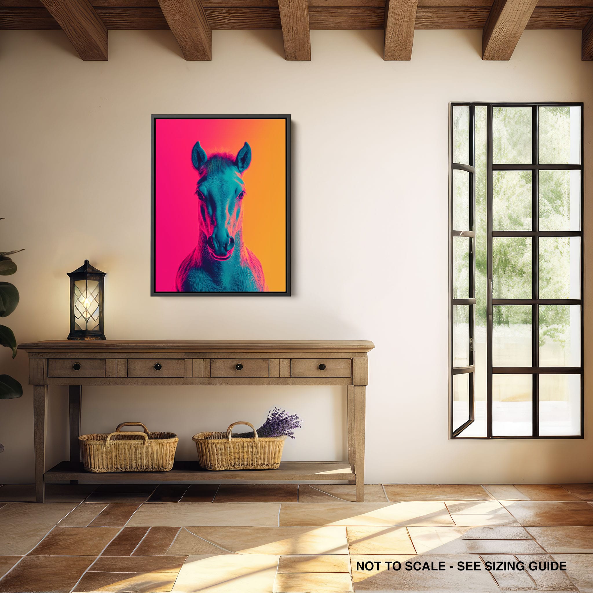 This captivating digital illustration features a horse enveloped in vibrant neon hues, seamlessly blending electric blue and radiant pink. The meticulous attention to detail is evident in the horse’s lifelike texture, adding depth and dimension. The pop art influence is striking, characterized by bold colors and dynamic energy, while hints of surrealism create an otherworldly charm. Perfect for contemporary spaces, this piece is a stylish statement that brings a burst of color and personality to any setting. Add this unique artwork to your collection and transform your decor with its stunning visual appeal.