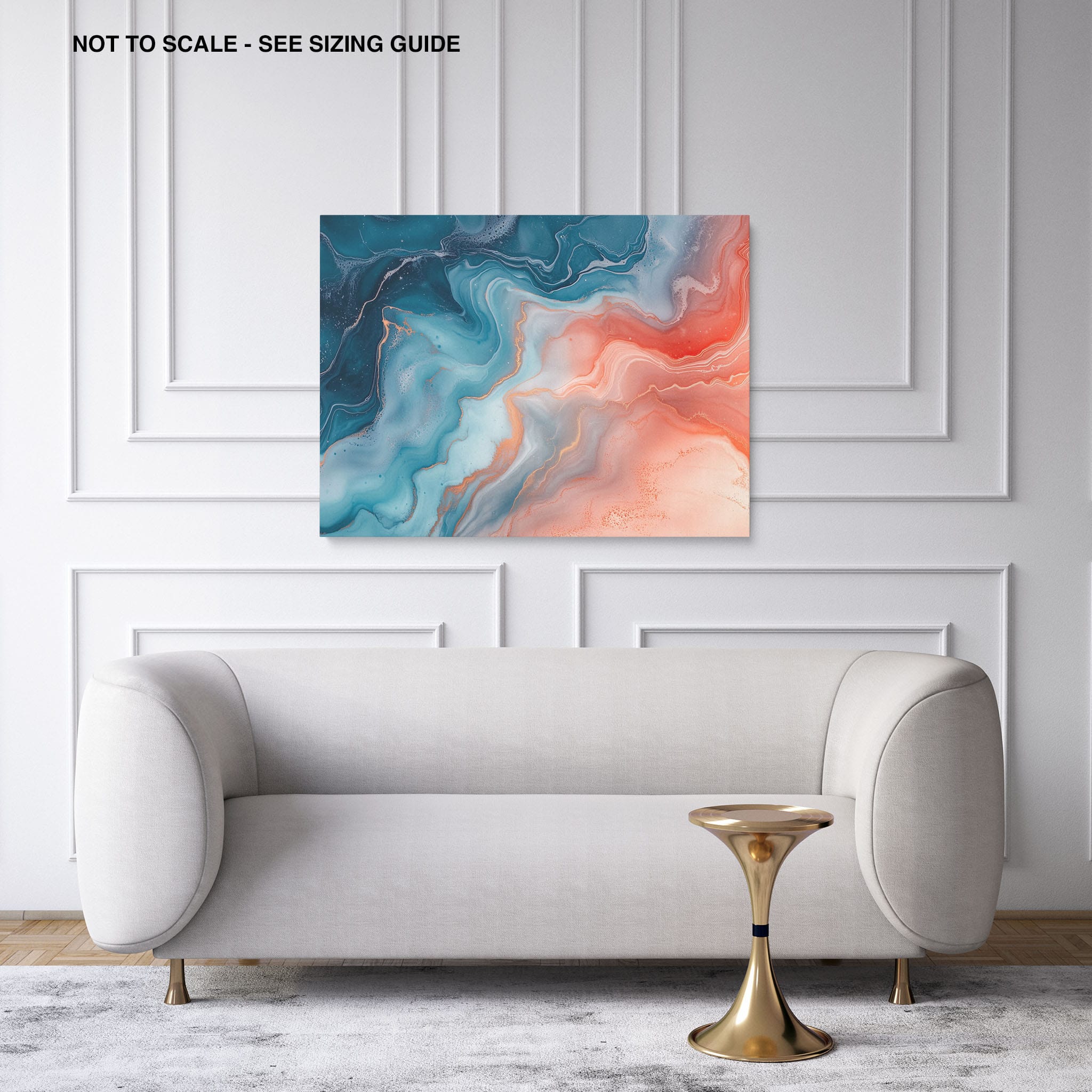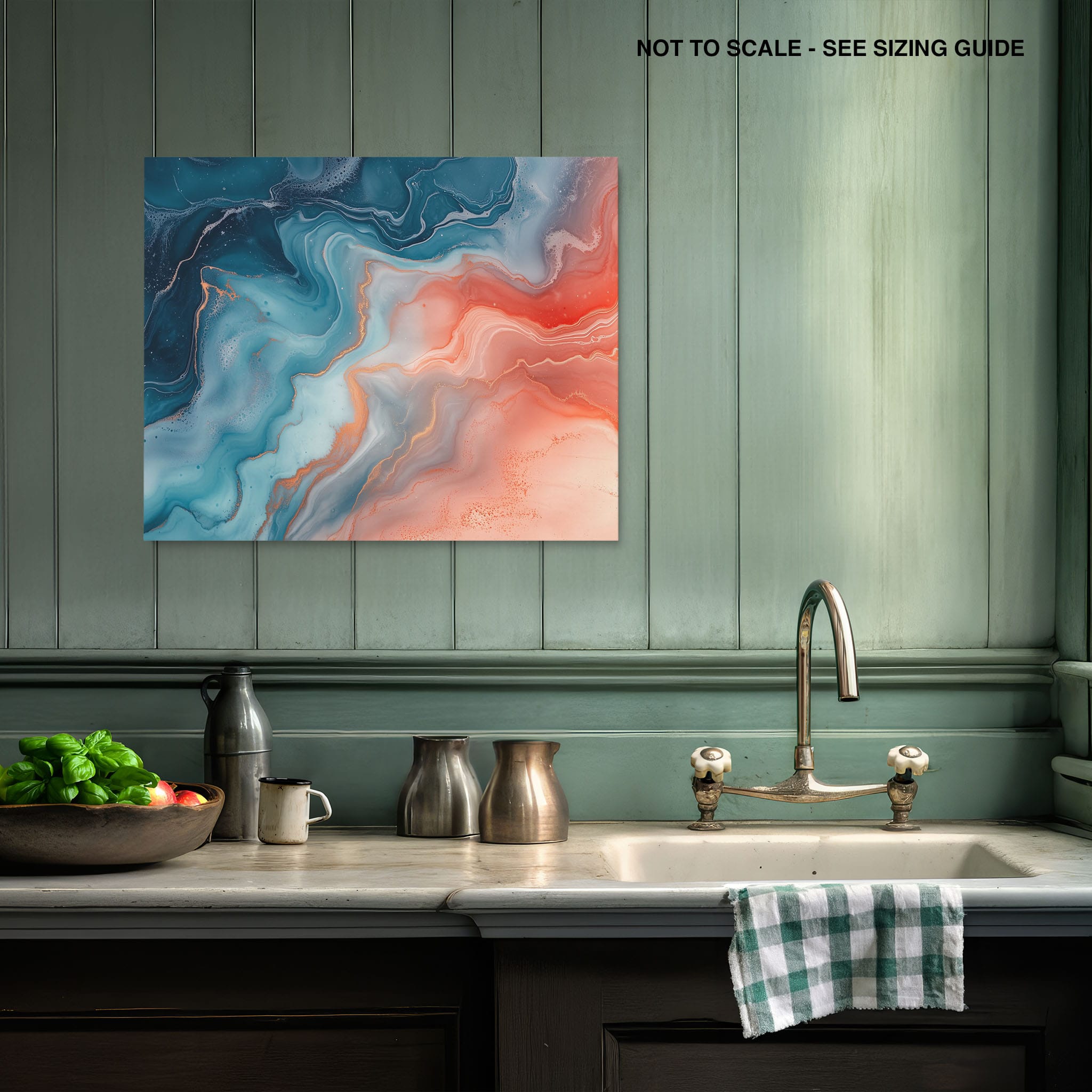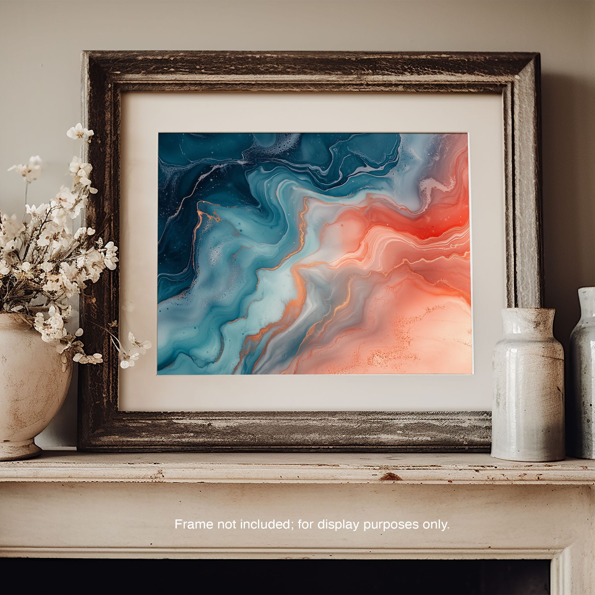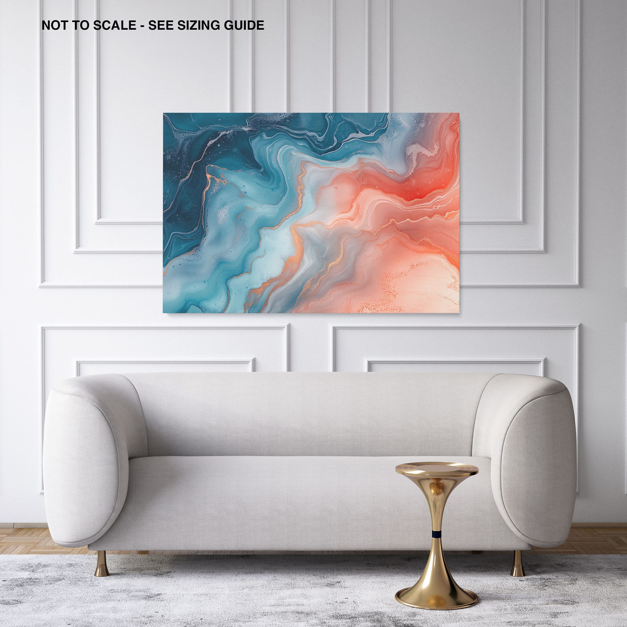This stunning photographic print captures an abstract blend of ocean blues and fiery reds, reminiscent of a vivid, flowing sunset. The swirling patterns evoke a surreal charm, while the blend of colors offers a modern appeal. Perfect for art lovers appreciative of dynamic, visually impactful works, this piece promises to be a captivating focus in any space. Add a touch of elegance and a splash of color to your walls with this exquisite art photography. Ideal for those who value unique design and passionate craftsmanship.