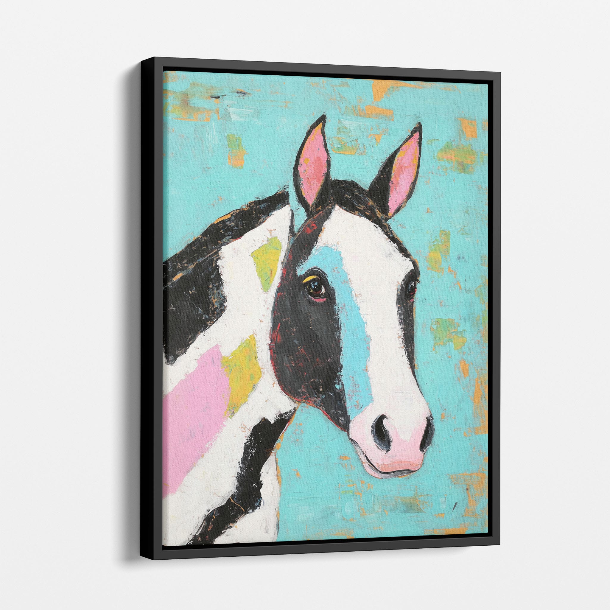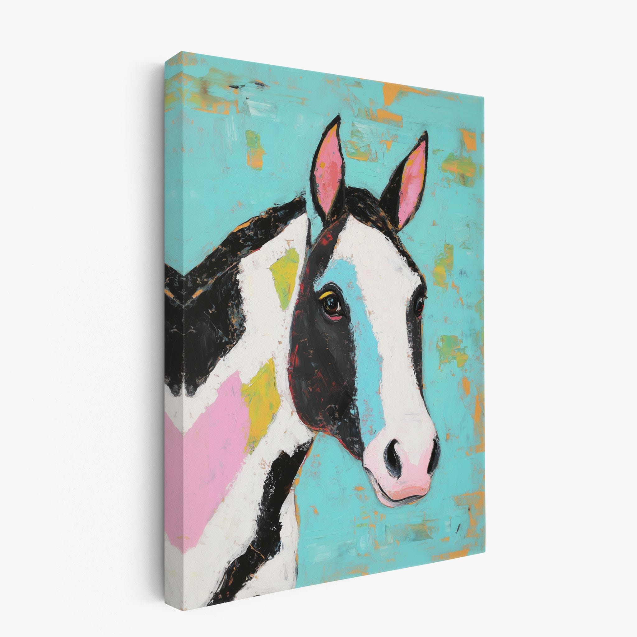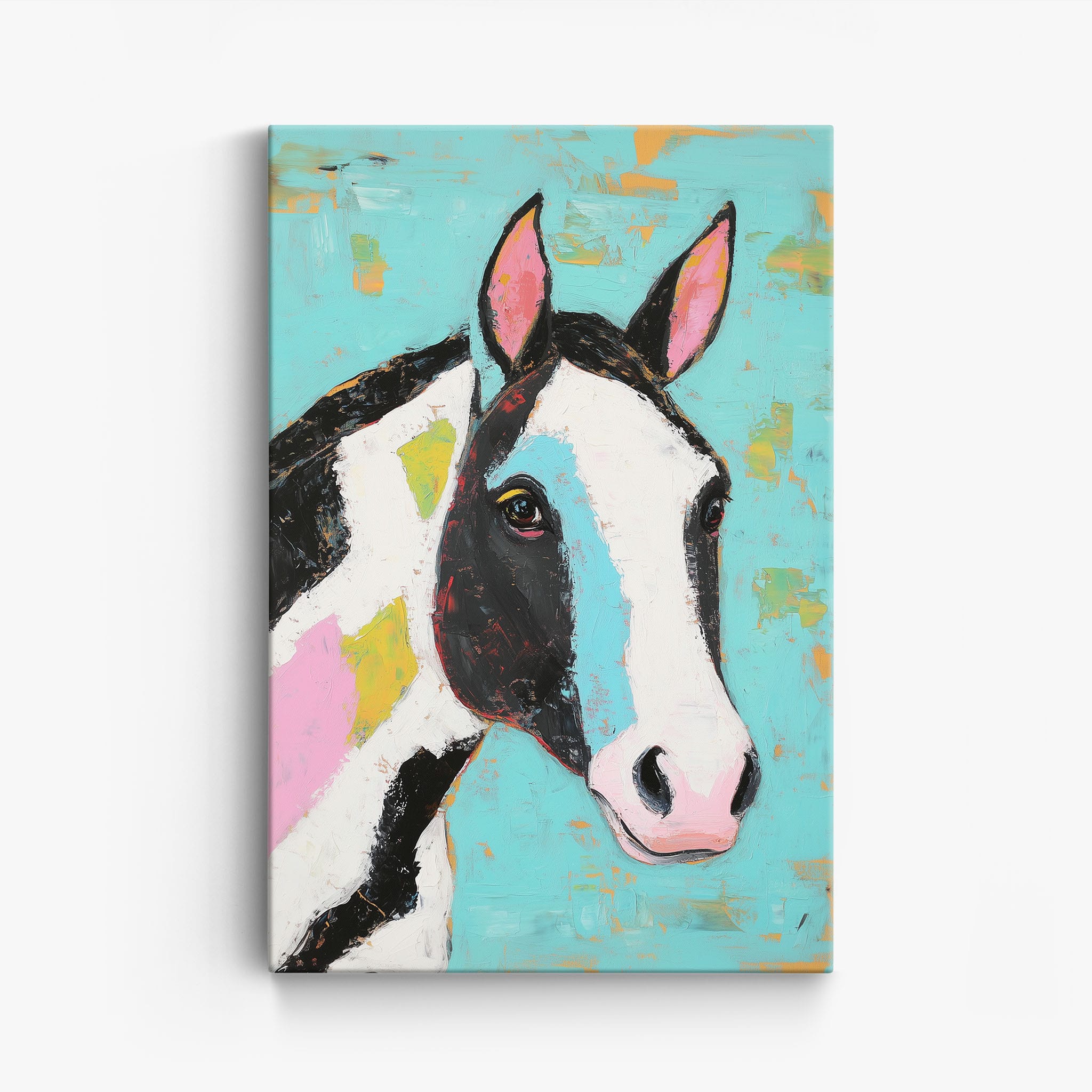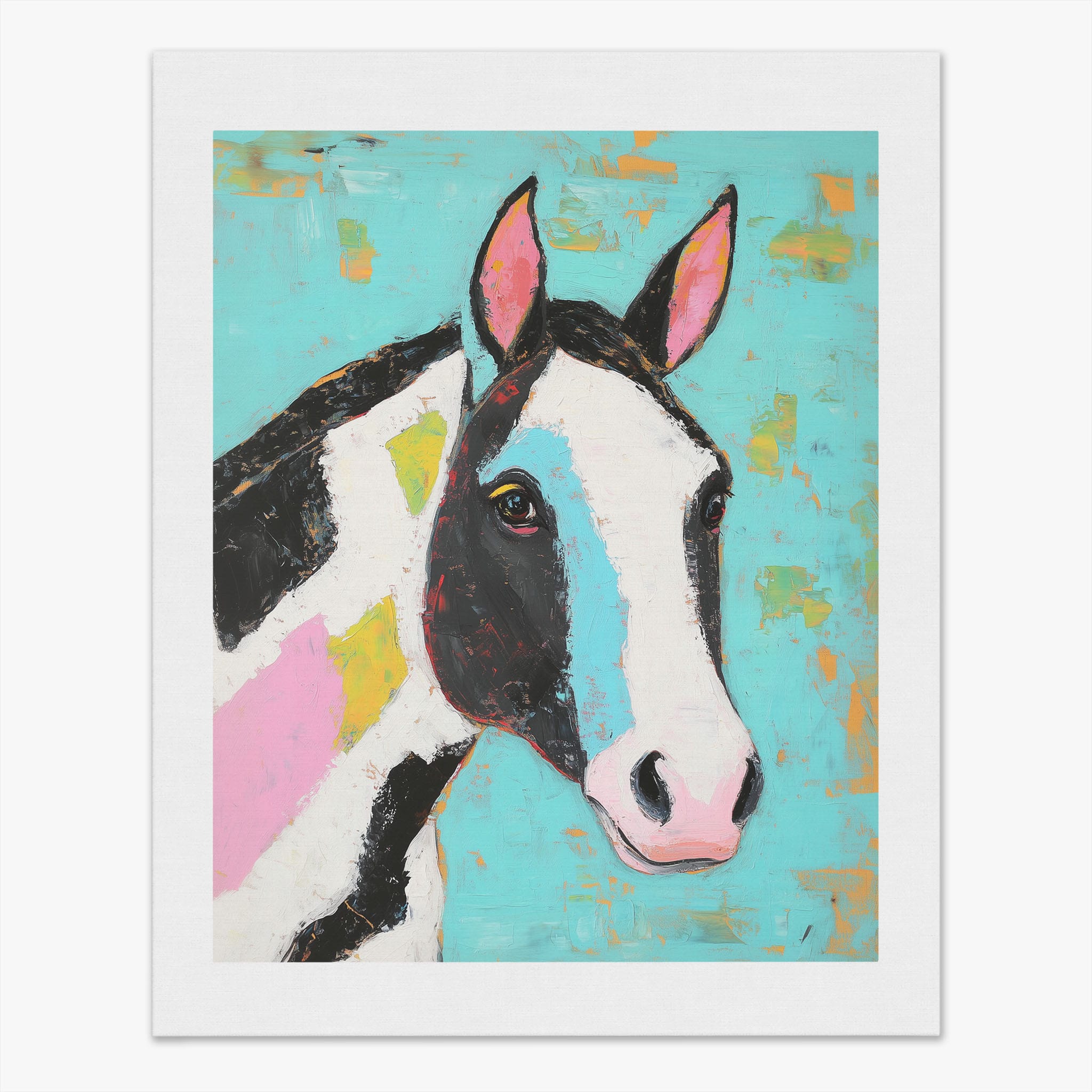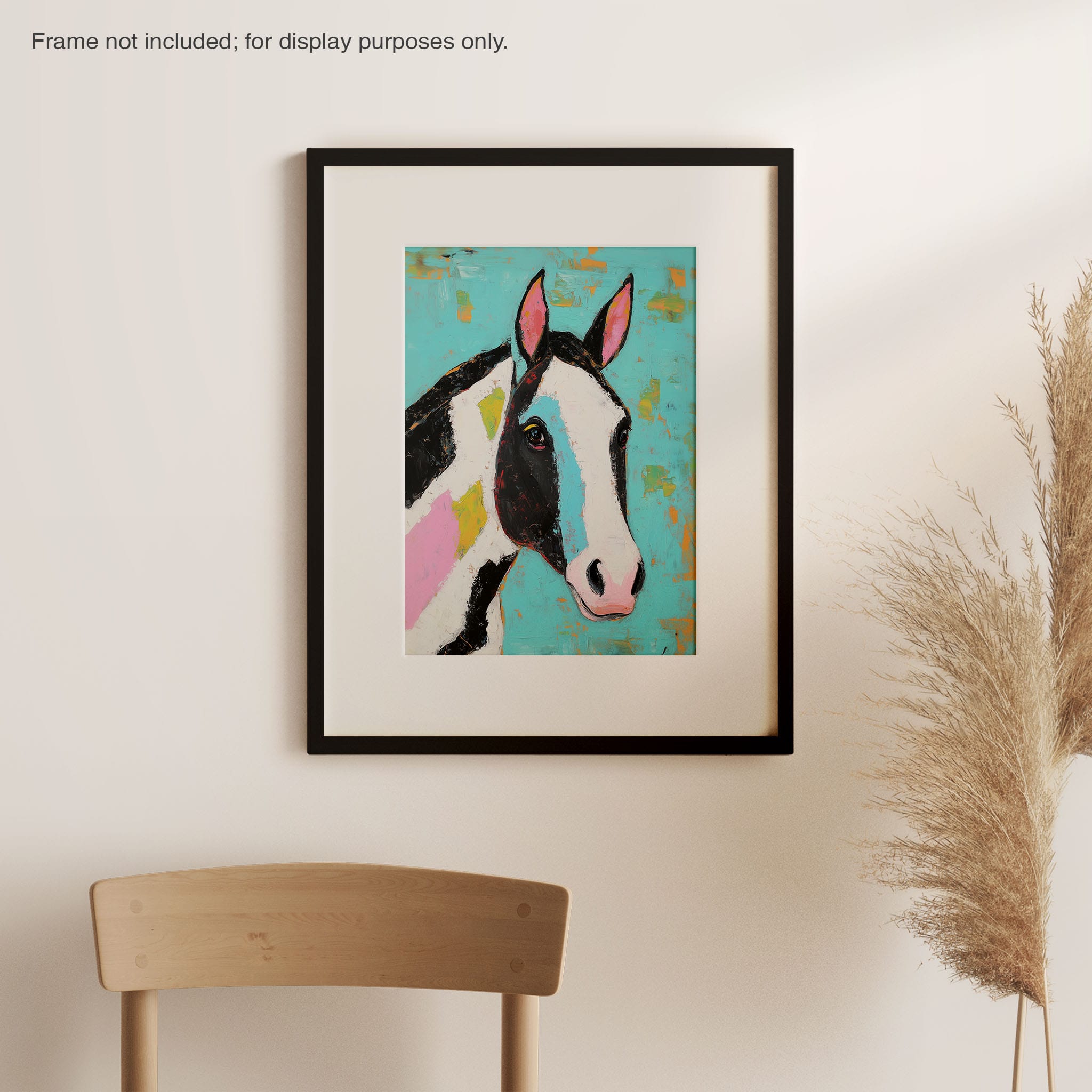 This vibrant painting captures the essence of a horse, enlivened through bold, expressive strokes and a vivid palette of teal, white, black, and splashes of yellow and pink. The textured technique brings forth a modern expressionistic flair, highlighting the emotional connection and striking presence of the equine subject. A perfect piece for any interior, it offers an immediate focal point that combines artistic flair with a love for animals. Ideal for those looking to infuse their space with energy and character.