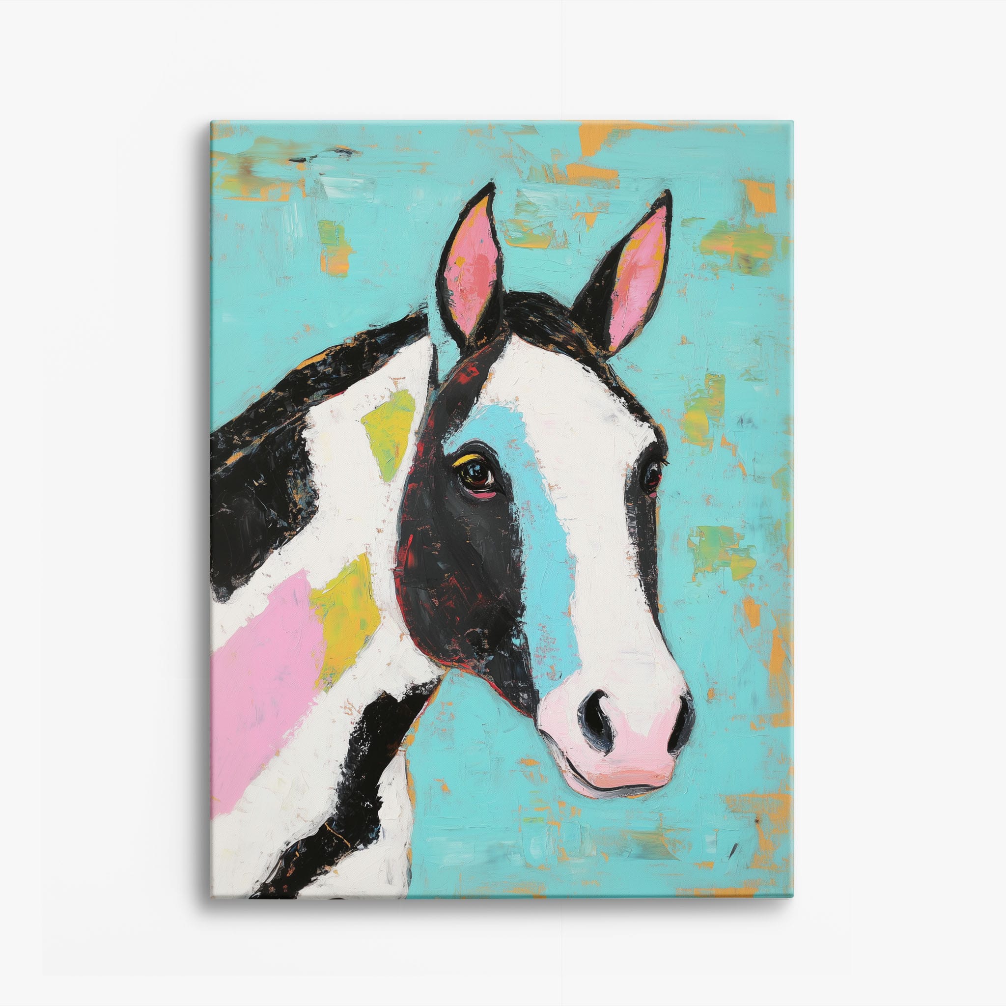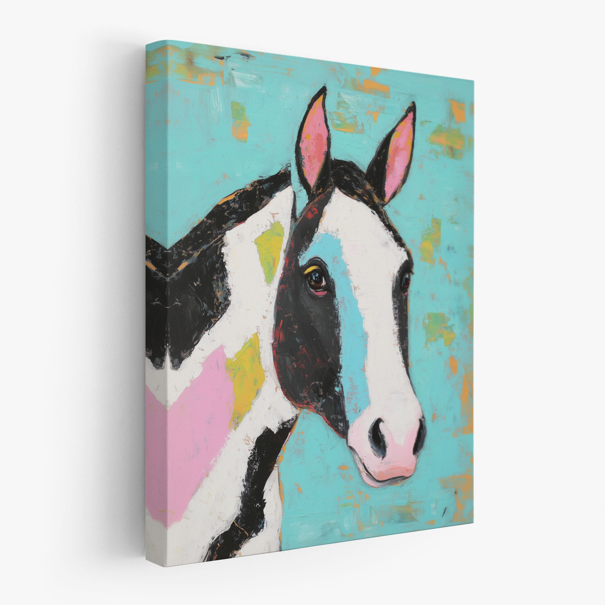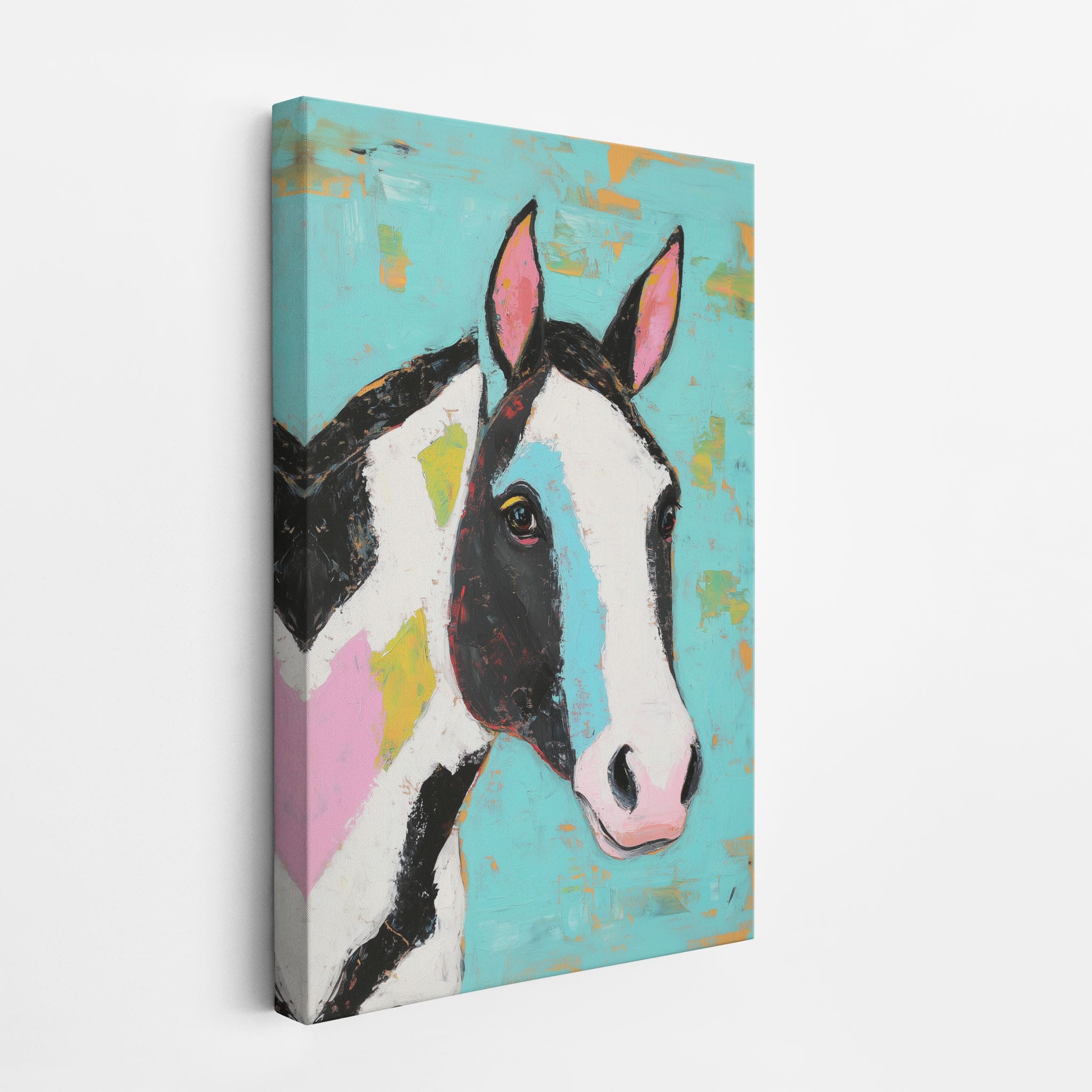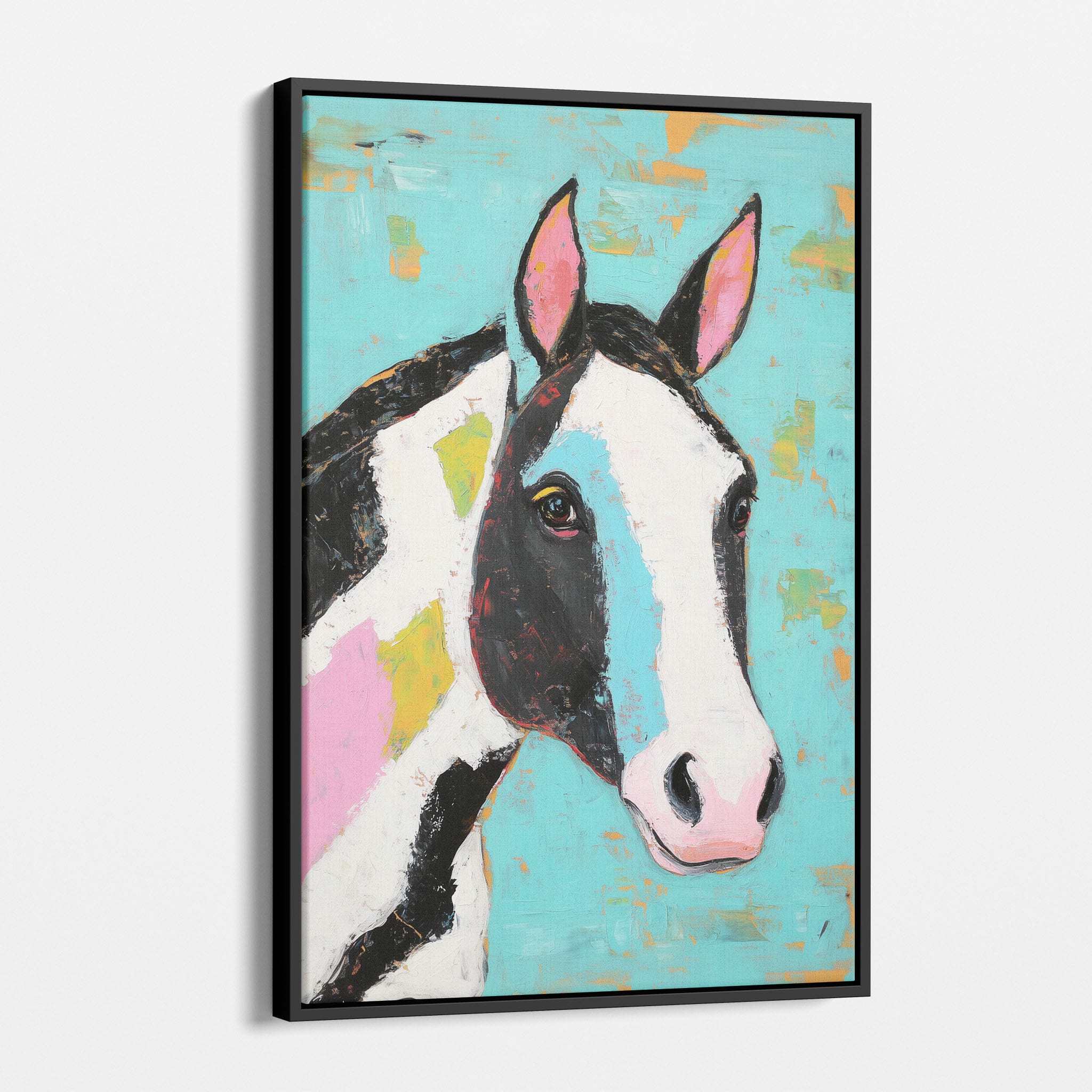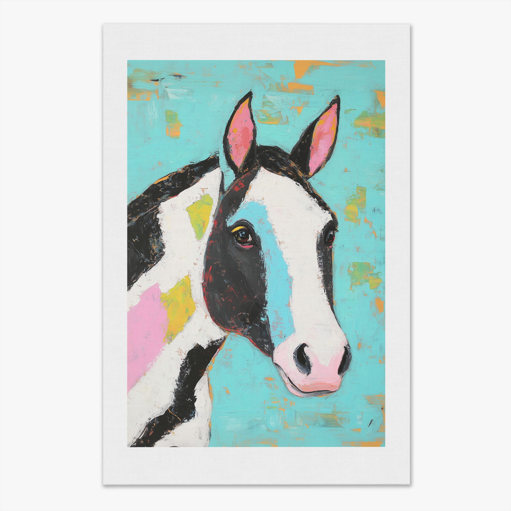 This vibrant painting captures the essence of a horse, enlivened through bold, expressive strokes and a vivid palette of teal, white, black, and splashes of yellow and pink. The textured technique brings forth a modern expressionistic flair, highlighting the emotional connection and striking presence of the equine subject. A perfect piece for any interior, it offers an immediate focal point that combines artistic flair with a love for animals. Ideal for those looking to infuse their space with energy and character.