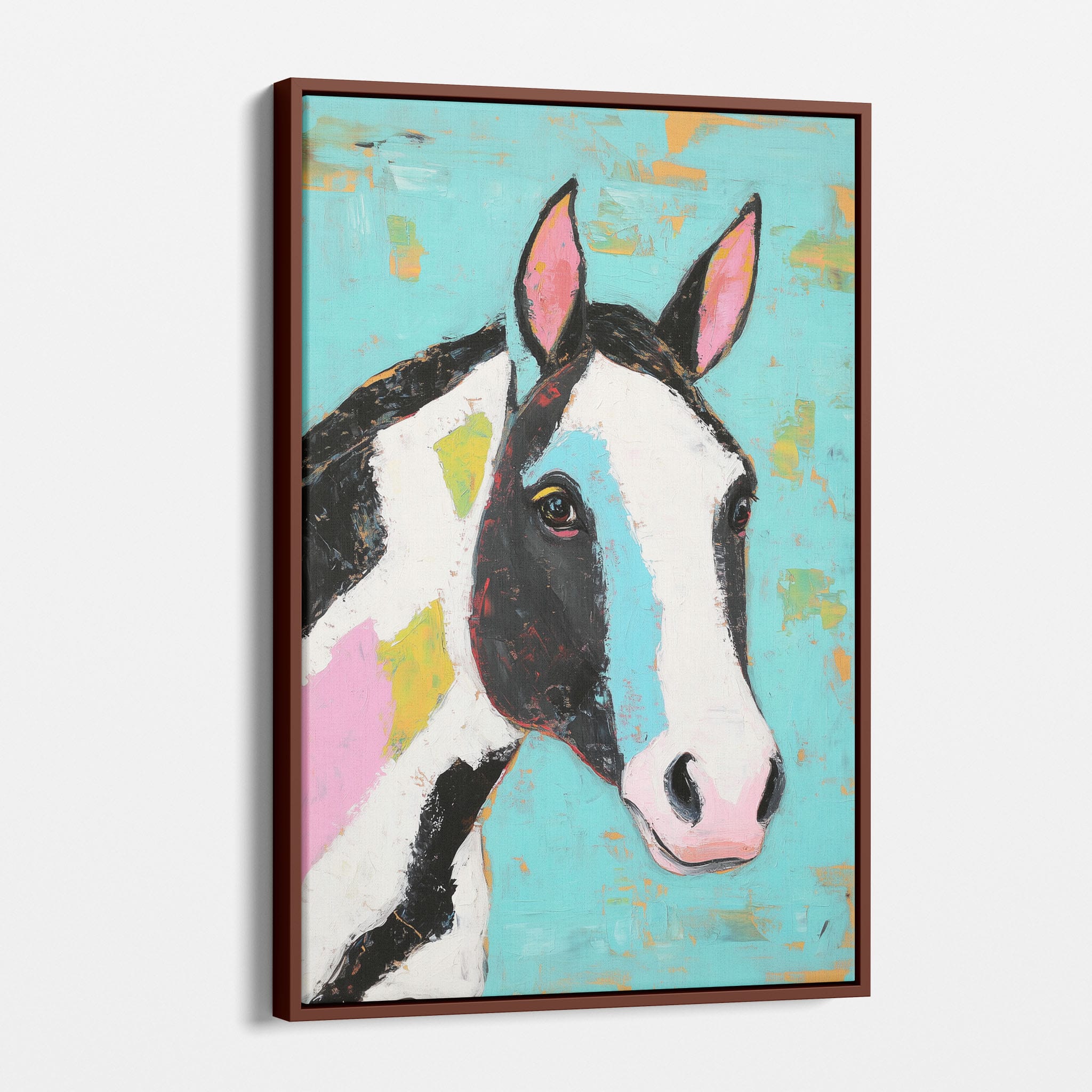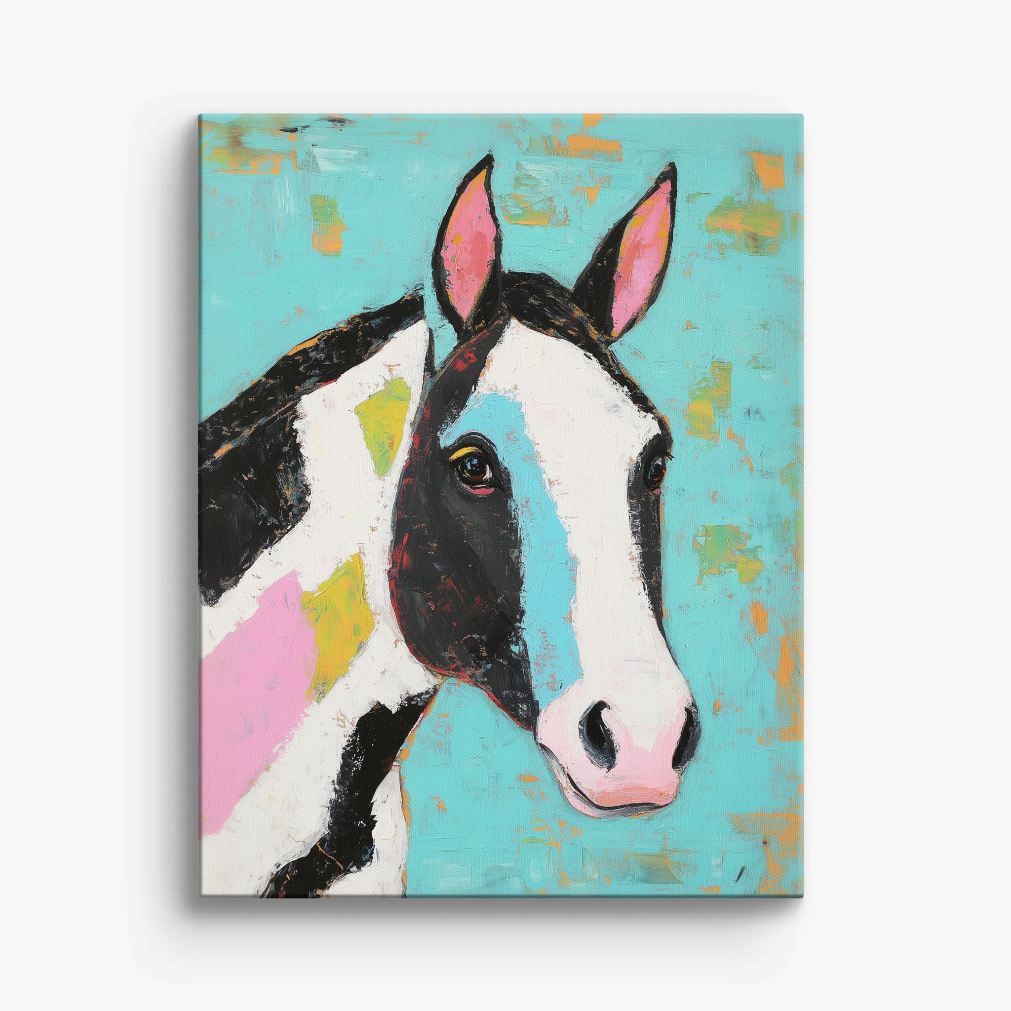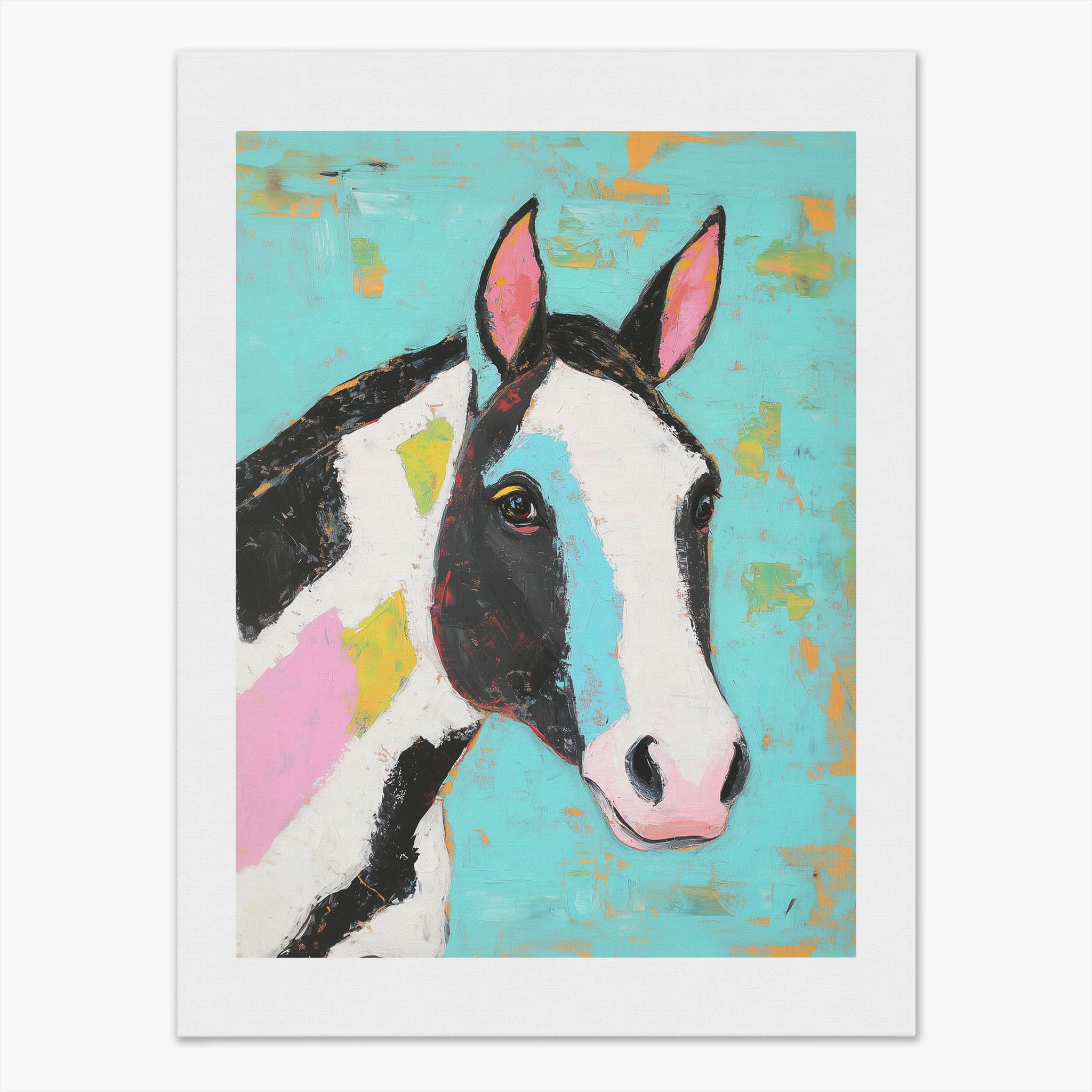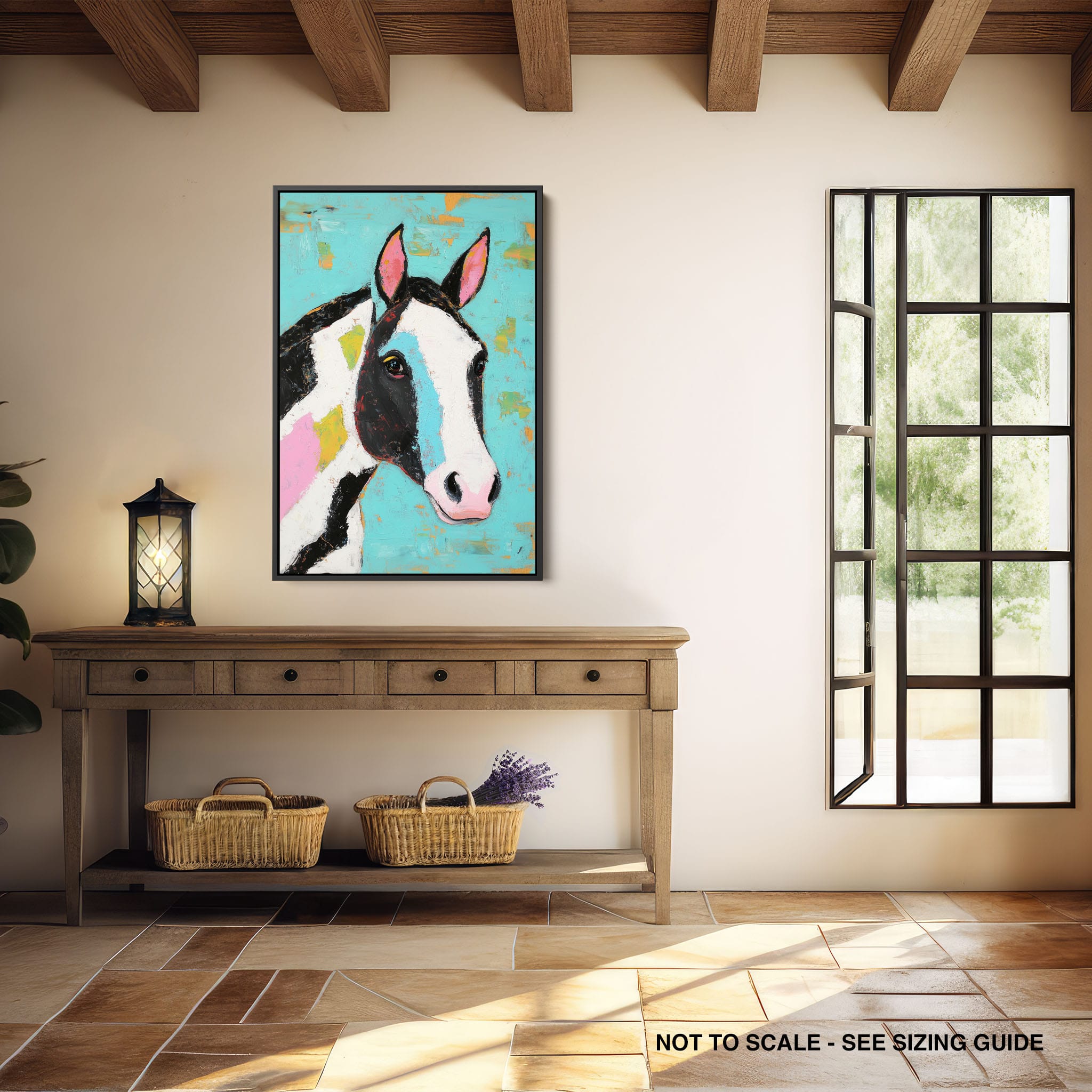 This vibrant painting captures the essence of a horse, enlivened through bold, expressive strokes and a vivid palette of teal, white, black, and splashes of yellow and pink. The textured technique brings forth a modern expressionistic flair, highlighting the emotional connection and striking presence of the equine subject. A perfect piece for any interior, it offers an immediate focal point that combines artistic flair with a love for animals. Ideal for those looking to infuse their space with energy and character.