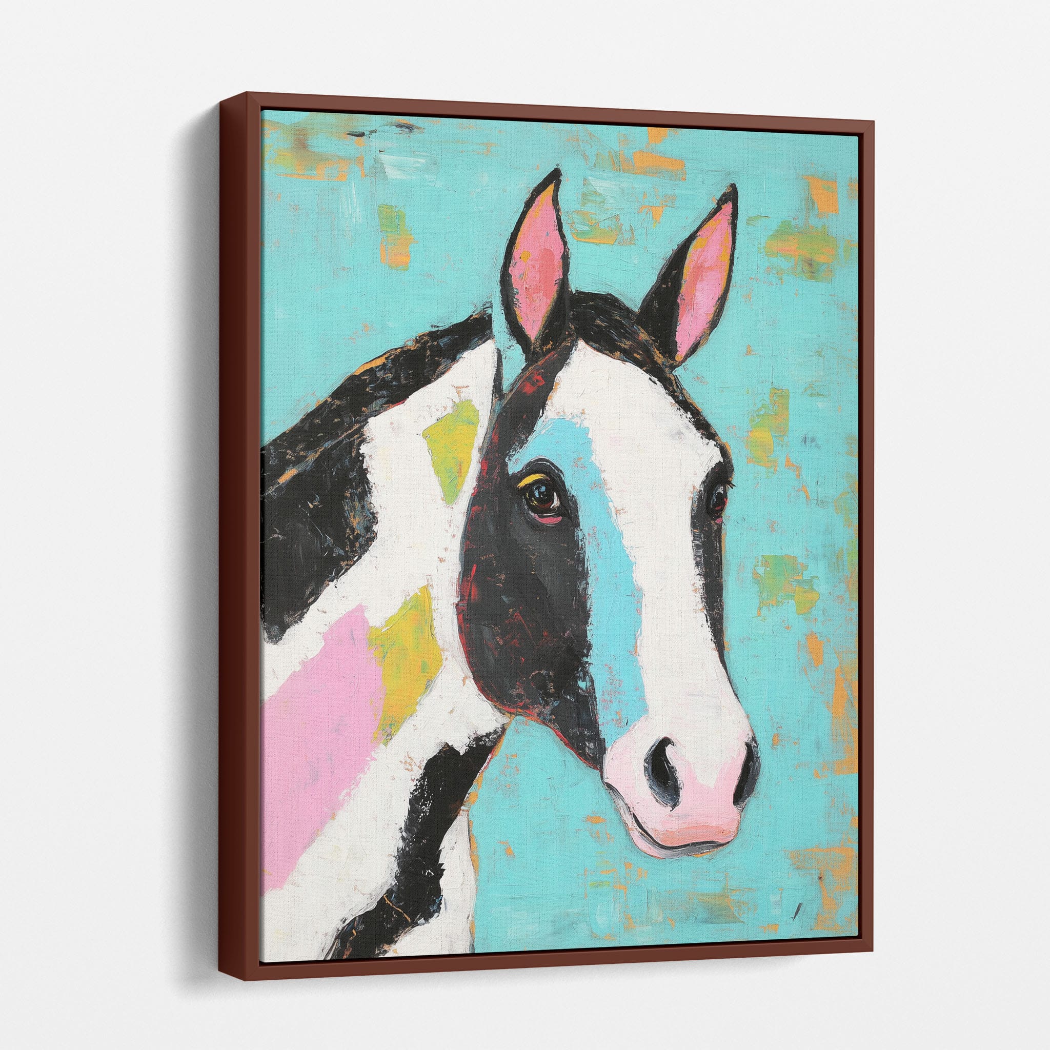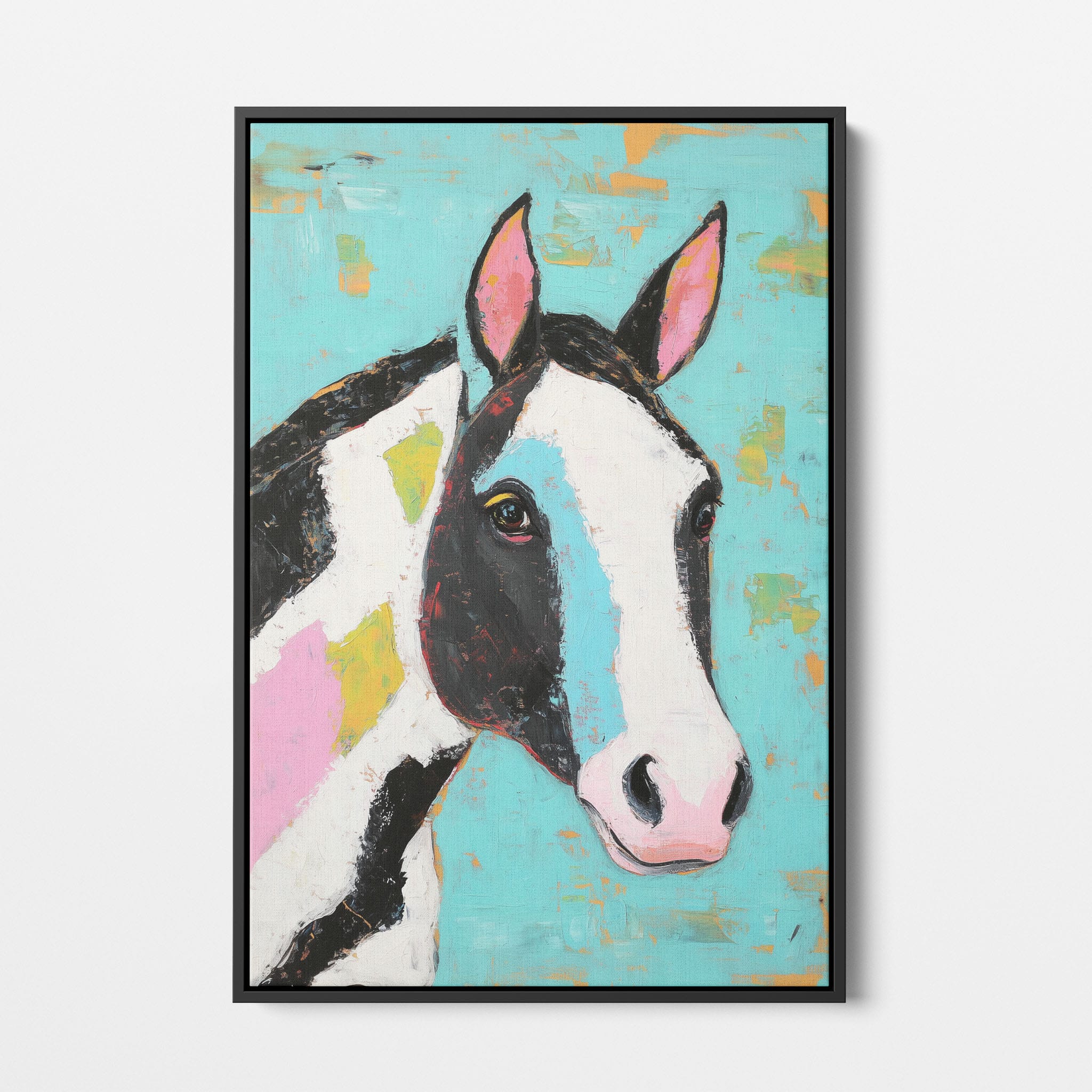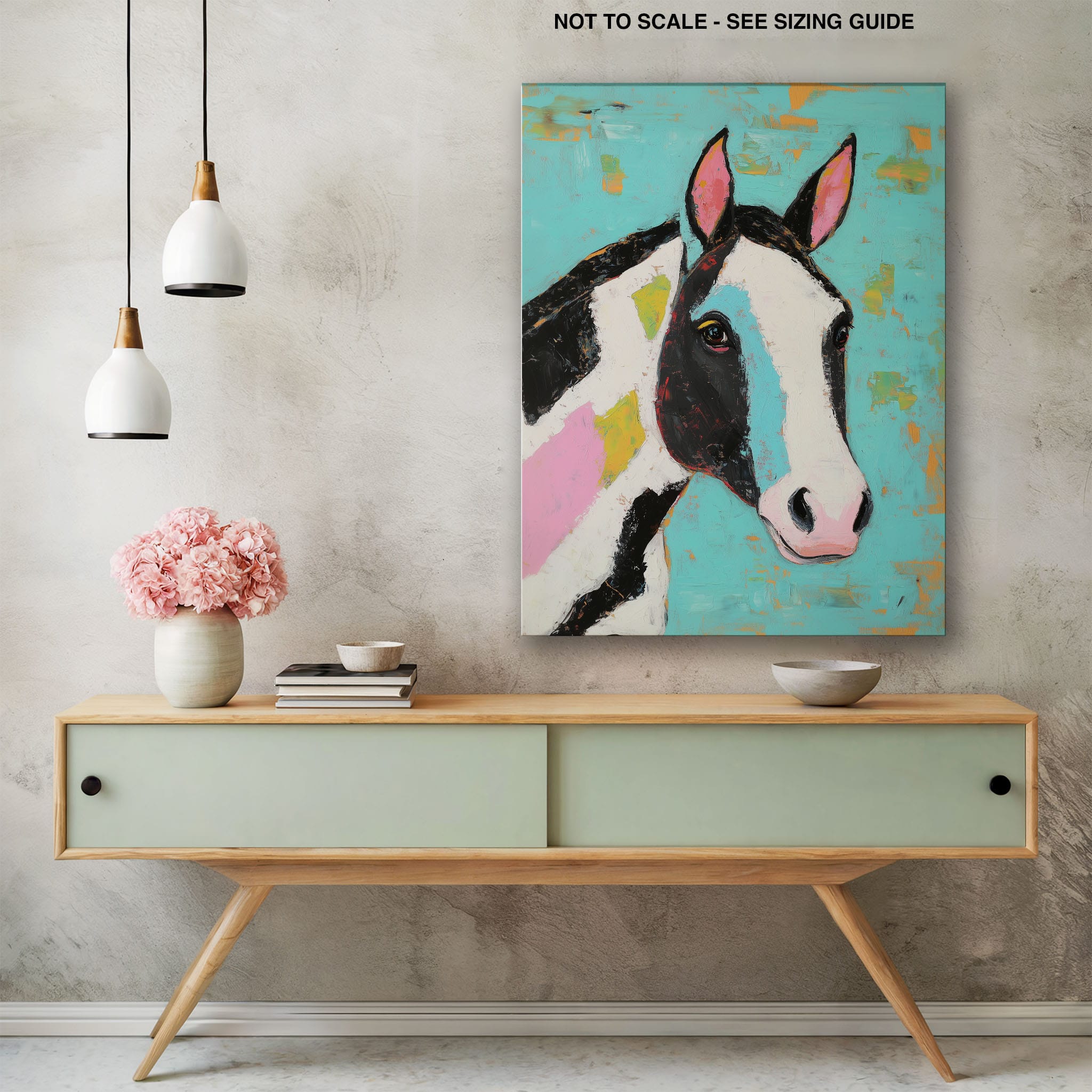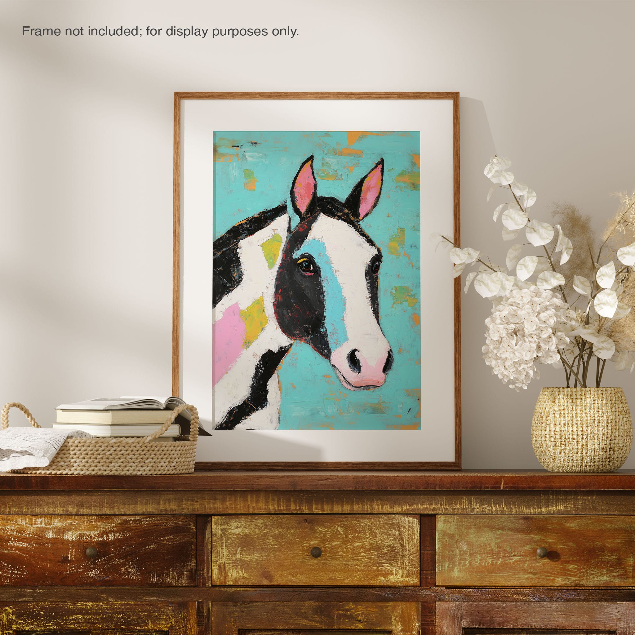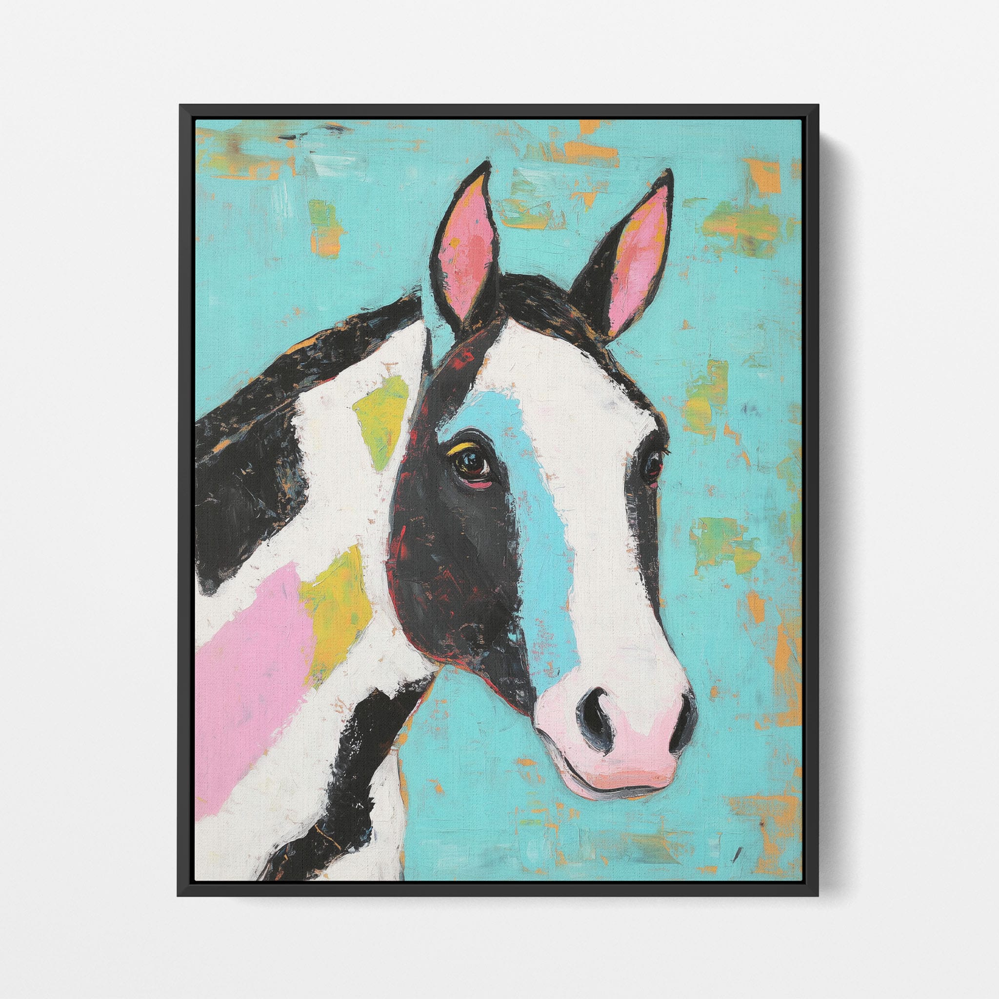 This vibrant painting captures the essence of a horse, enlivened through bold, expressive strokes and a vivid palette of teal, white, black, and splashes of yellow and pink. The textured technique brings forth a modern expressionistic flair, highlighting the emotional connection and striking presence of the equine subject. A perfect piece for any interior, it offers an immediate focal point that combines artistic flair with a love for animals. Ideal for those looking to infuse their space with energy and character.