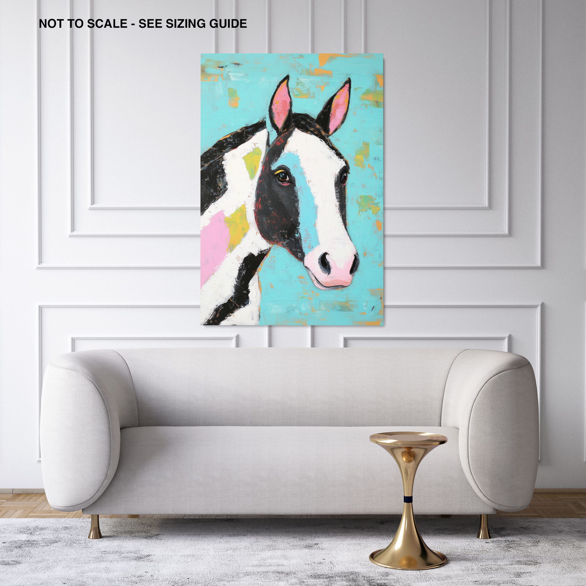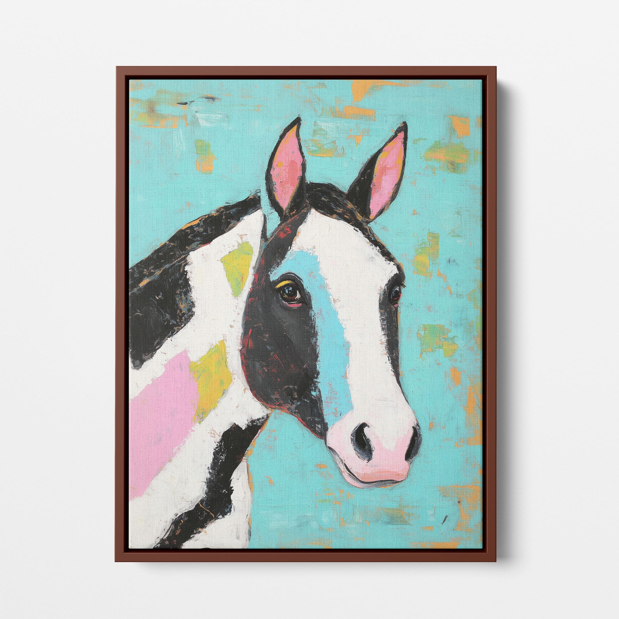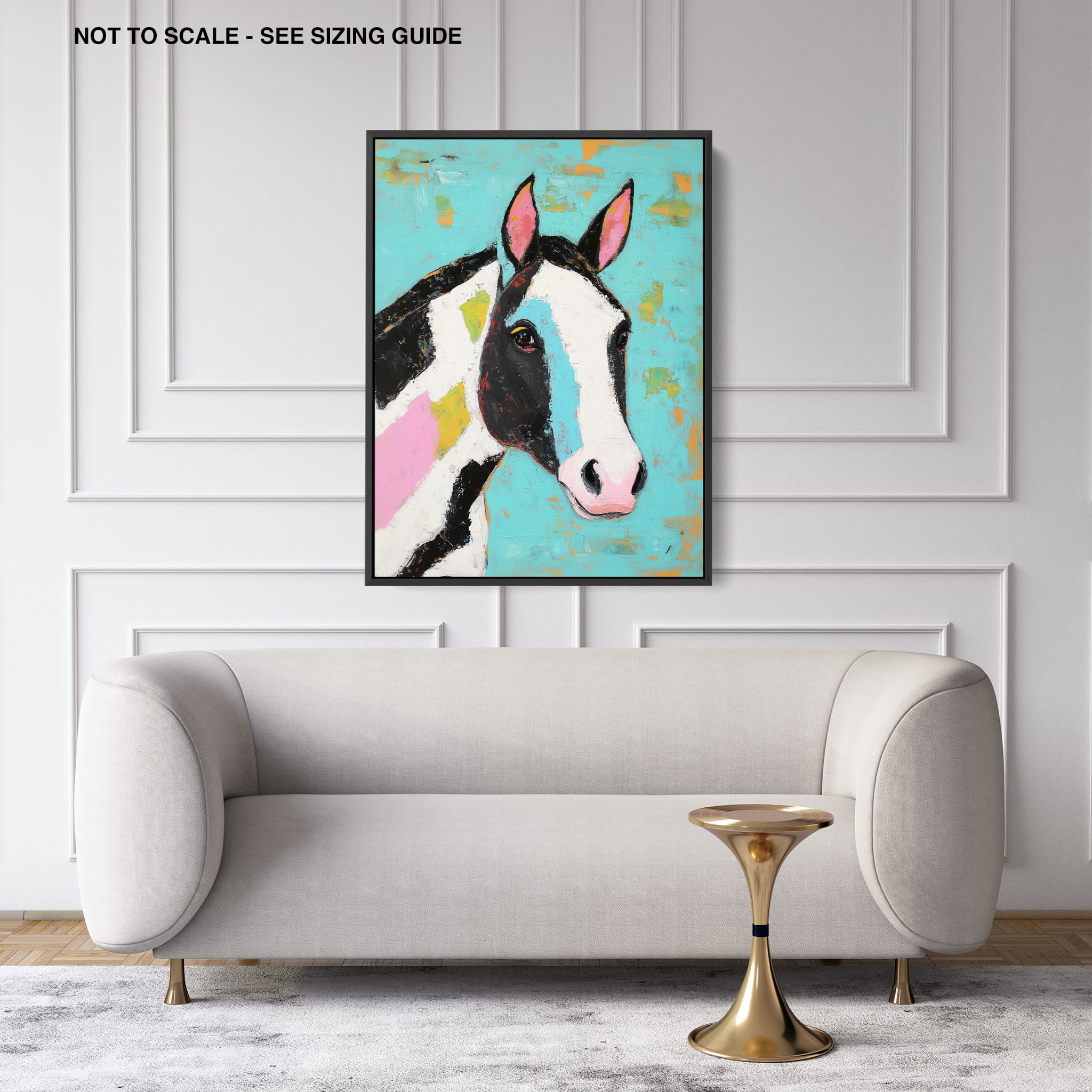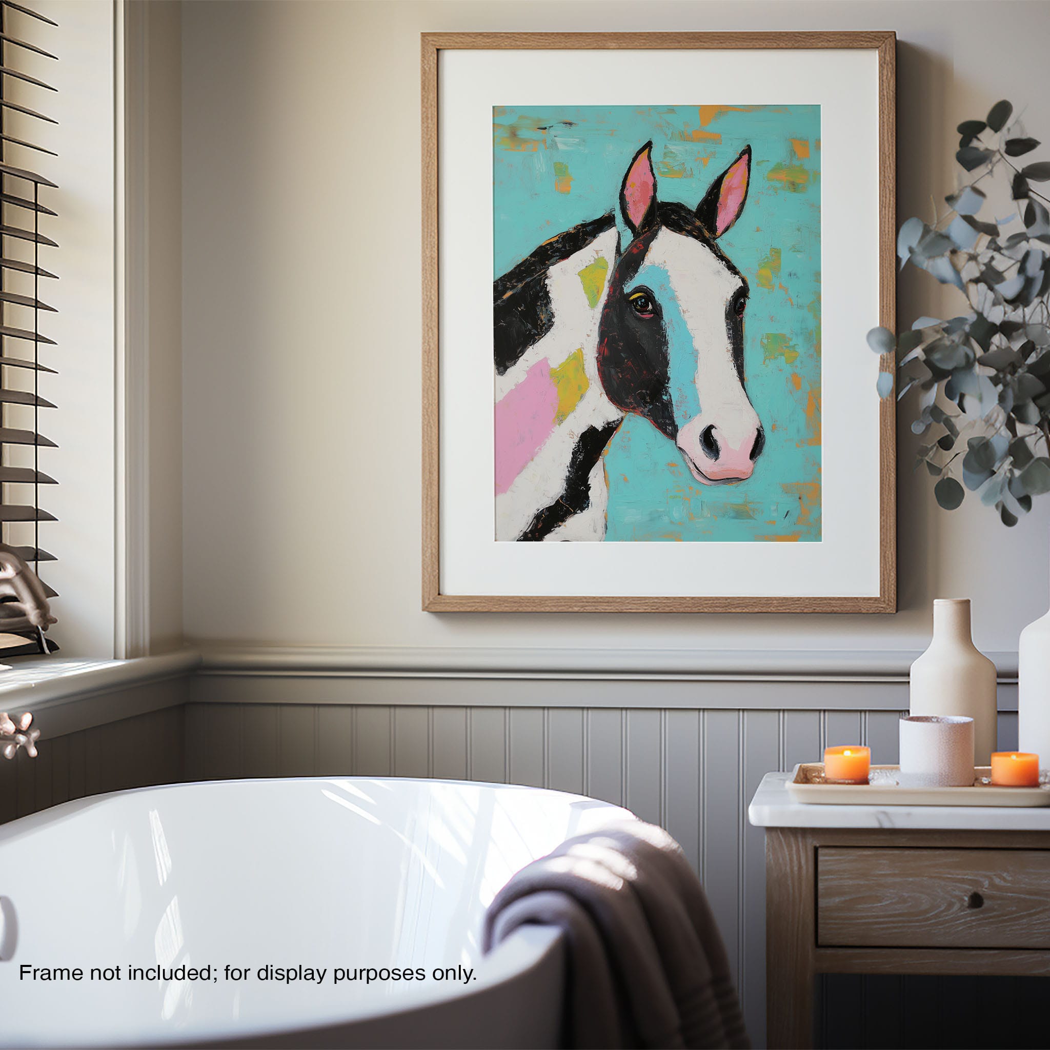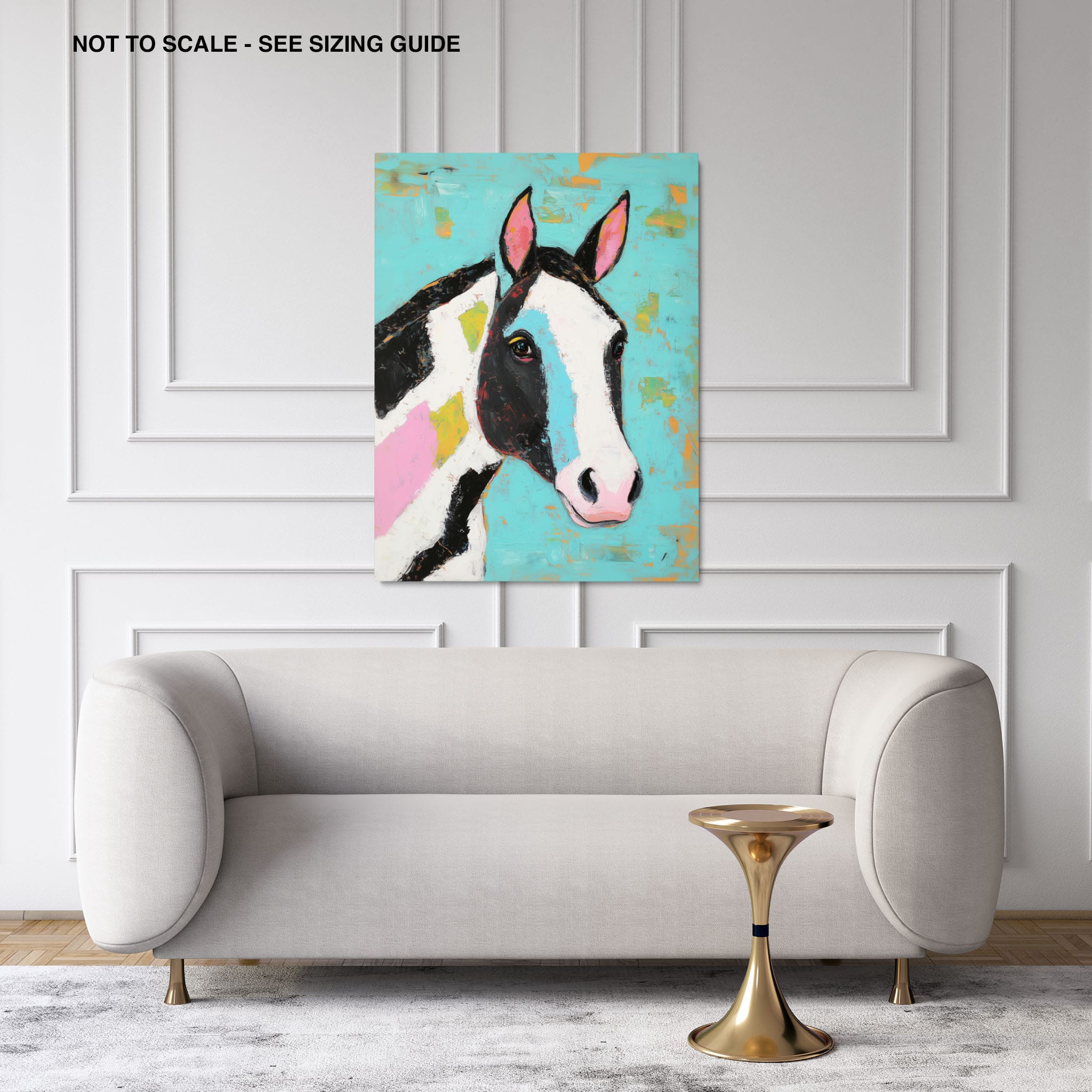 This vibrant painting captures the essence of a horse, enlivened through bold, expressive strokes and a vivid palette of teal, white, black, and splashes of yellow and pink. The textured technique brings forth a modern expressionistic flair, highlighting the emotional connection and striking presence of the equine subject. A perfect piece for any interior, it offers an immediate focal point that combines artistic flair with a love for animals. Ideal for those looking to infuse their space with energy and character.