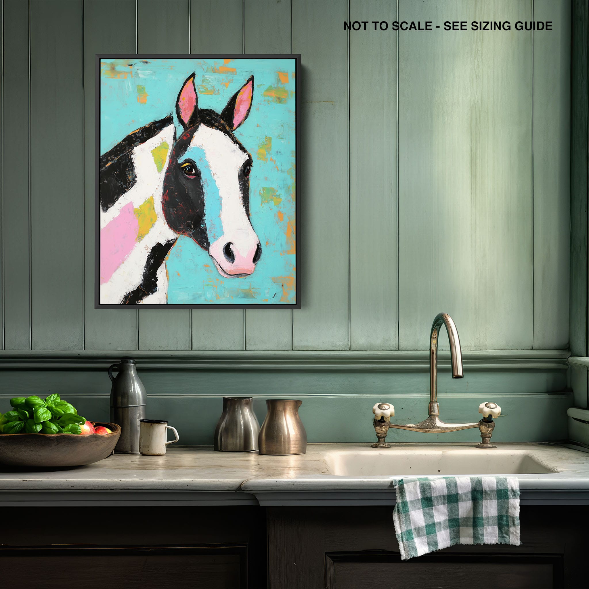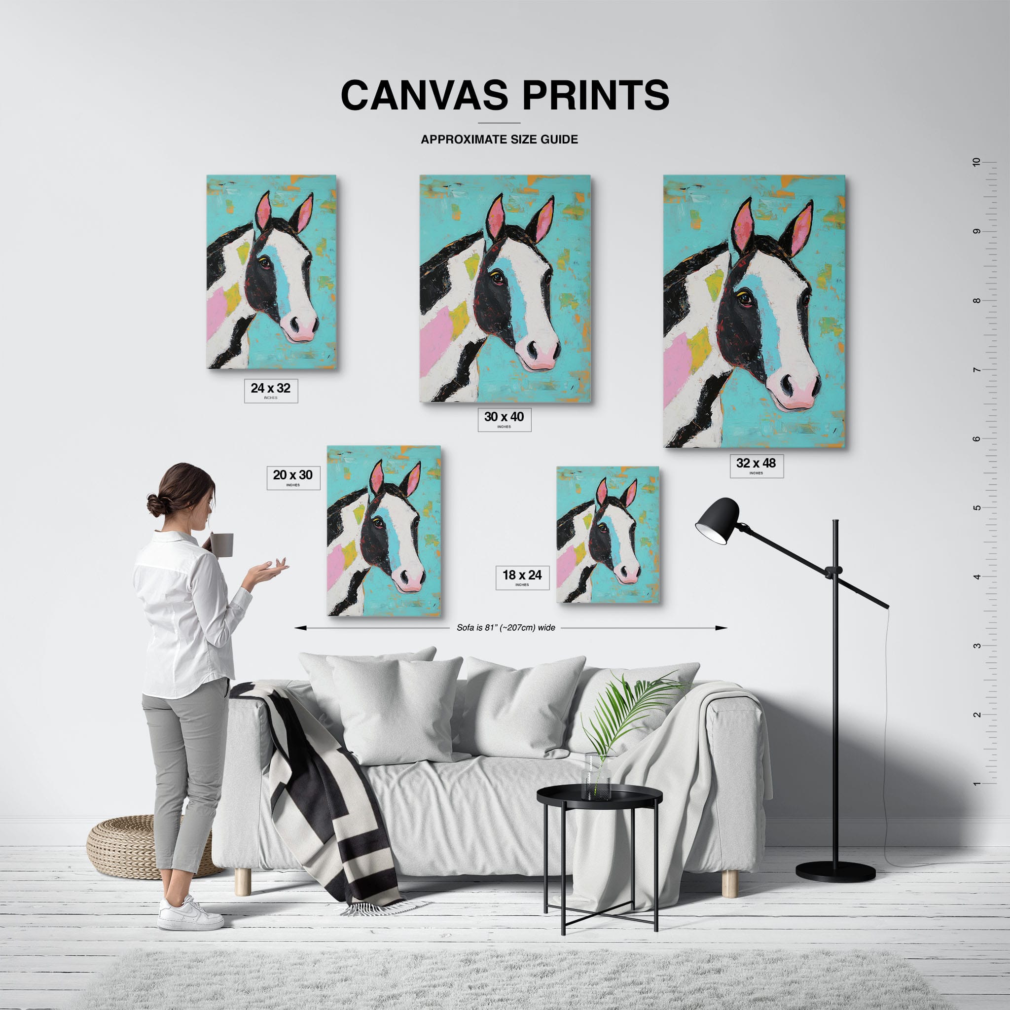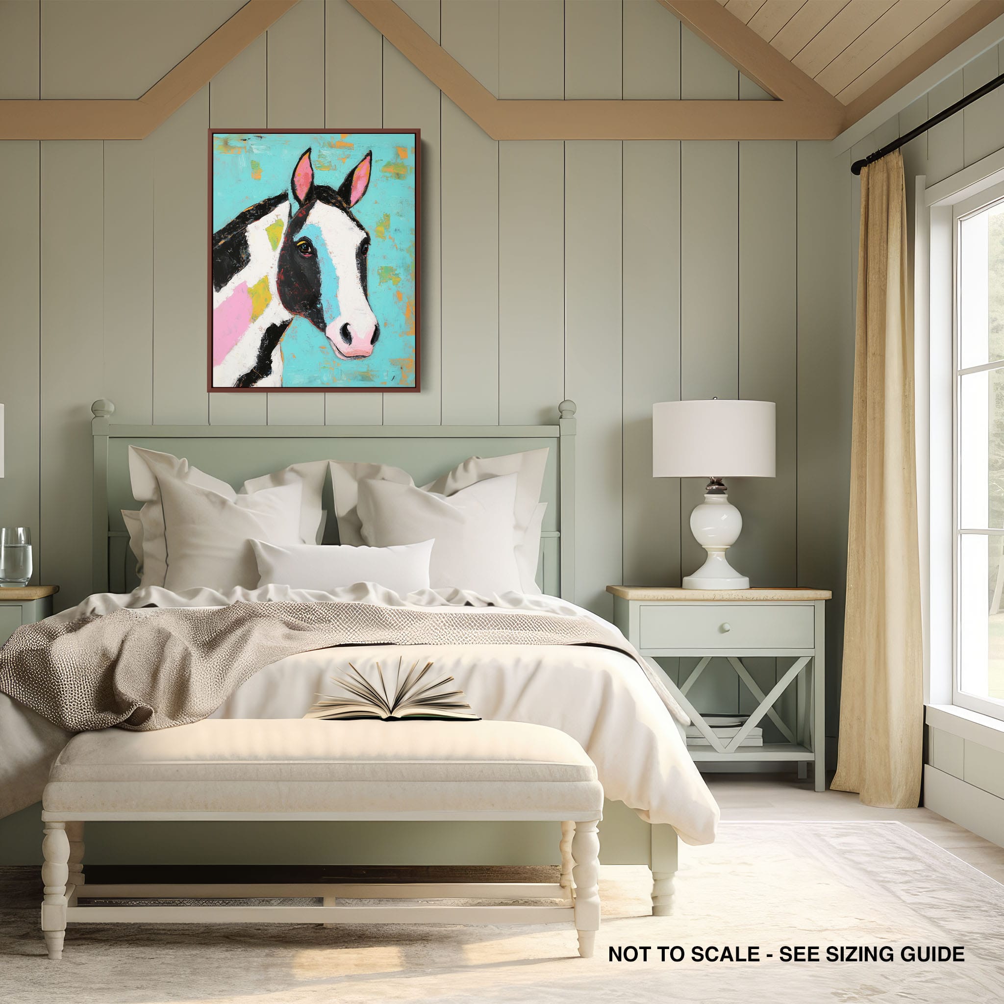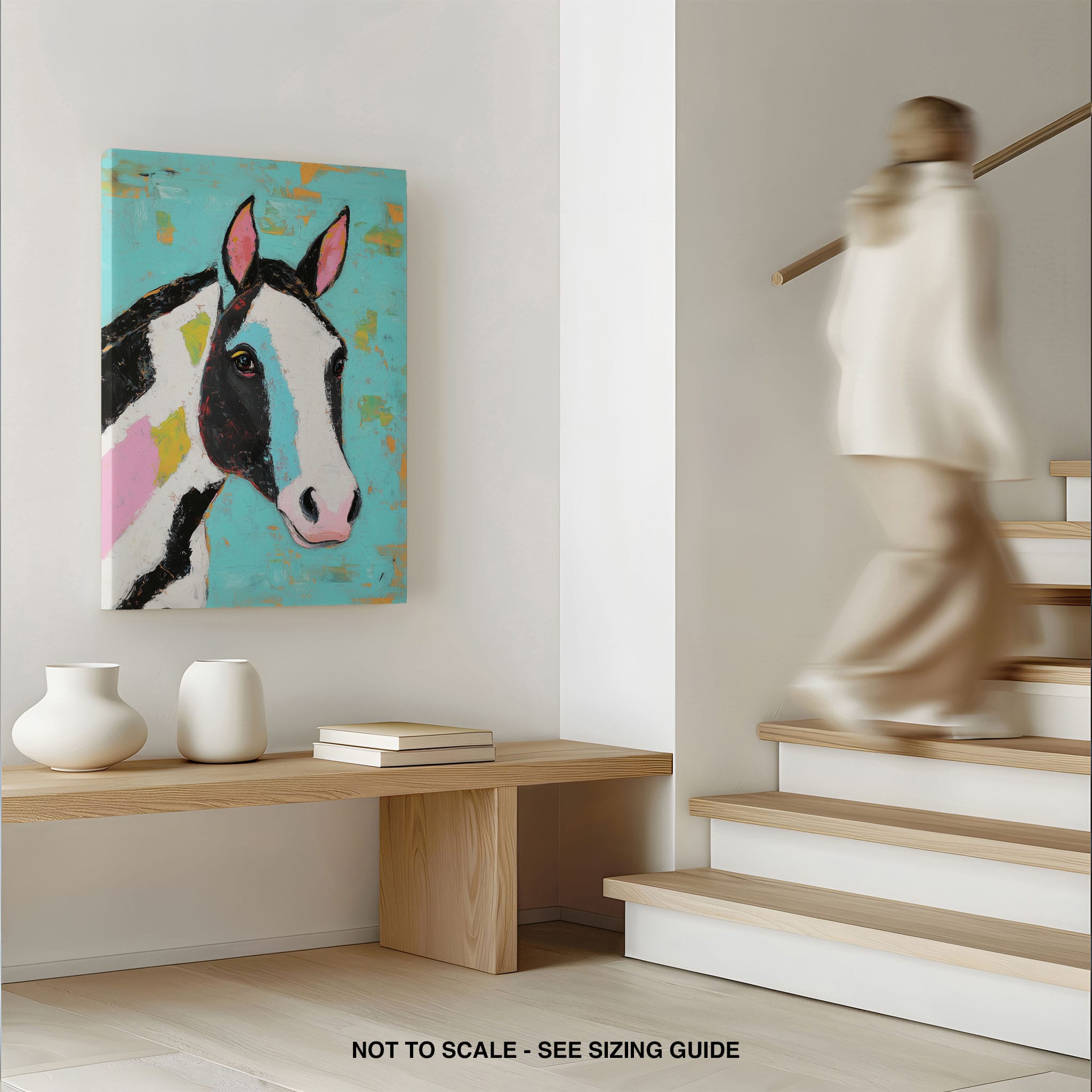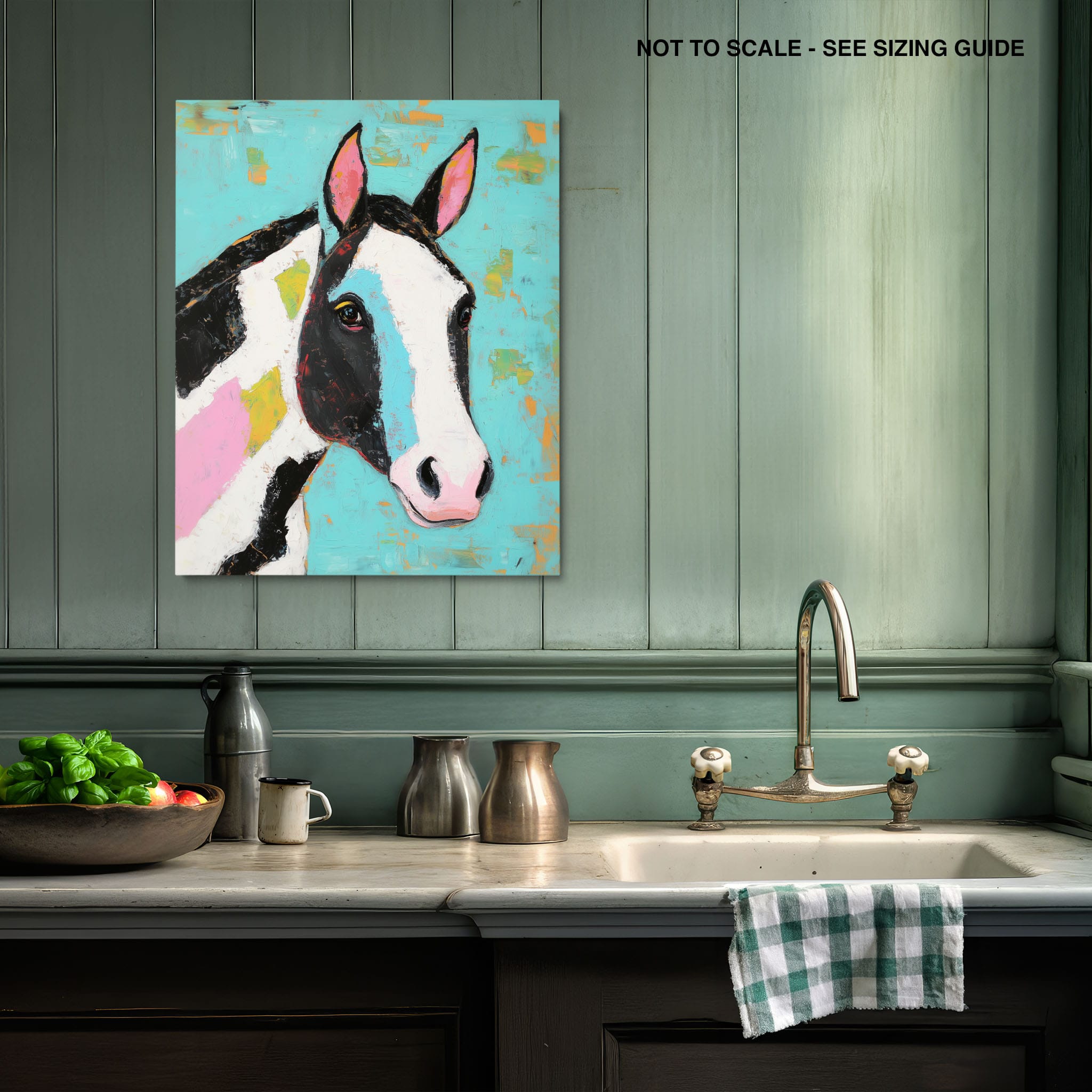 This vibrant painting captures the essence of a horse, enlivened through bold, expressive strokes and a vivid palette of teal, white, black, and splashes of yellow and pink. The textured technique brings forth a modern expressionistic flair, highlighting the emotional connection and striking presence of the equine subject. A perfect piece for any interior, it offers an immediate focal point that combines artistic flair with a love for animals. Ideal for those looking to infuse their space with energy and character.