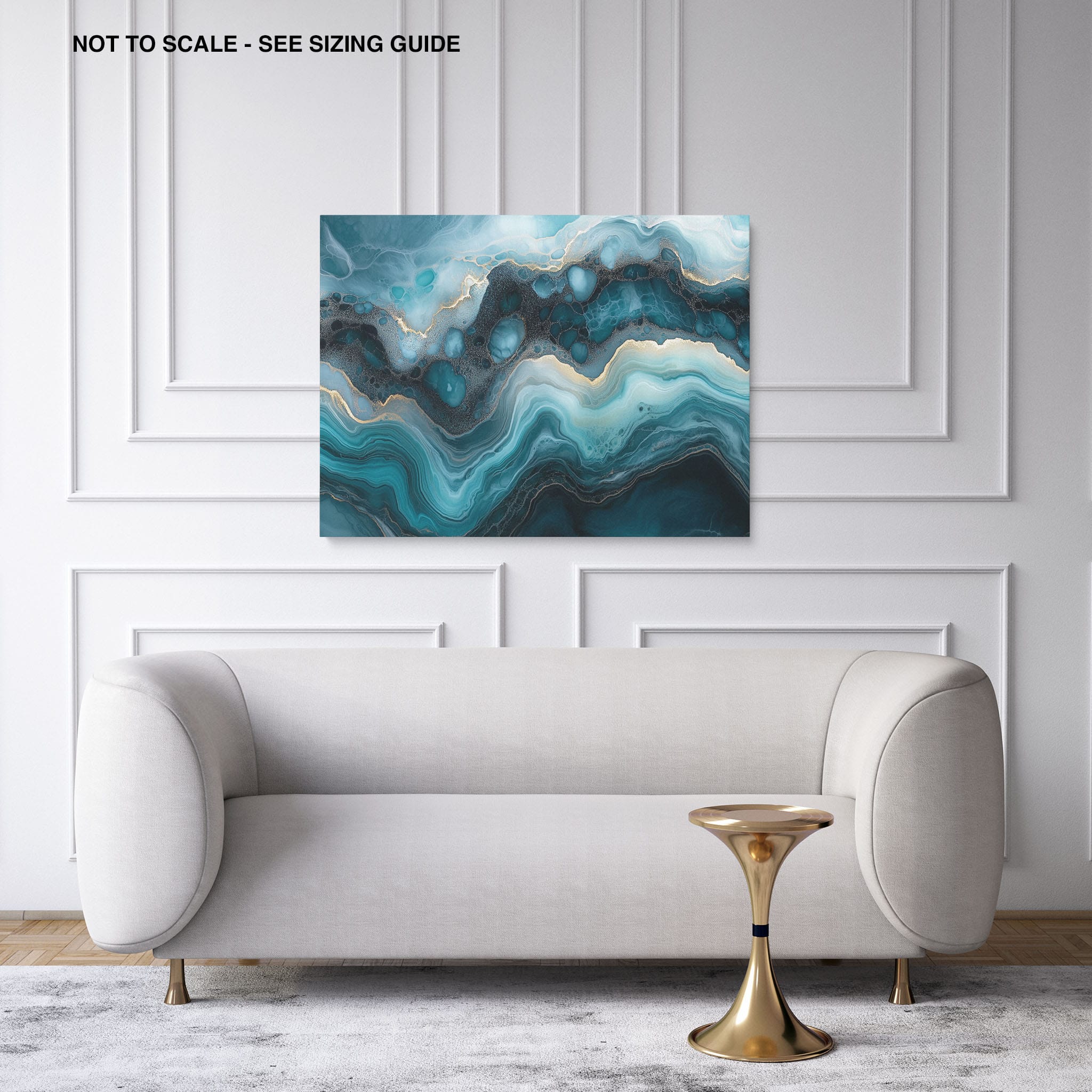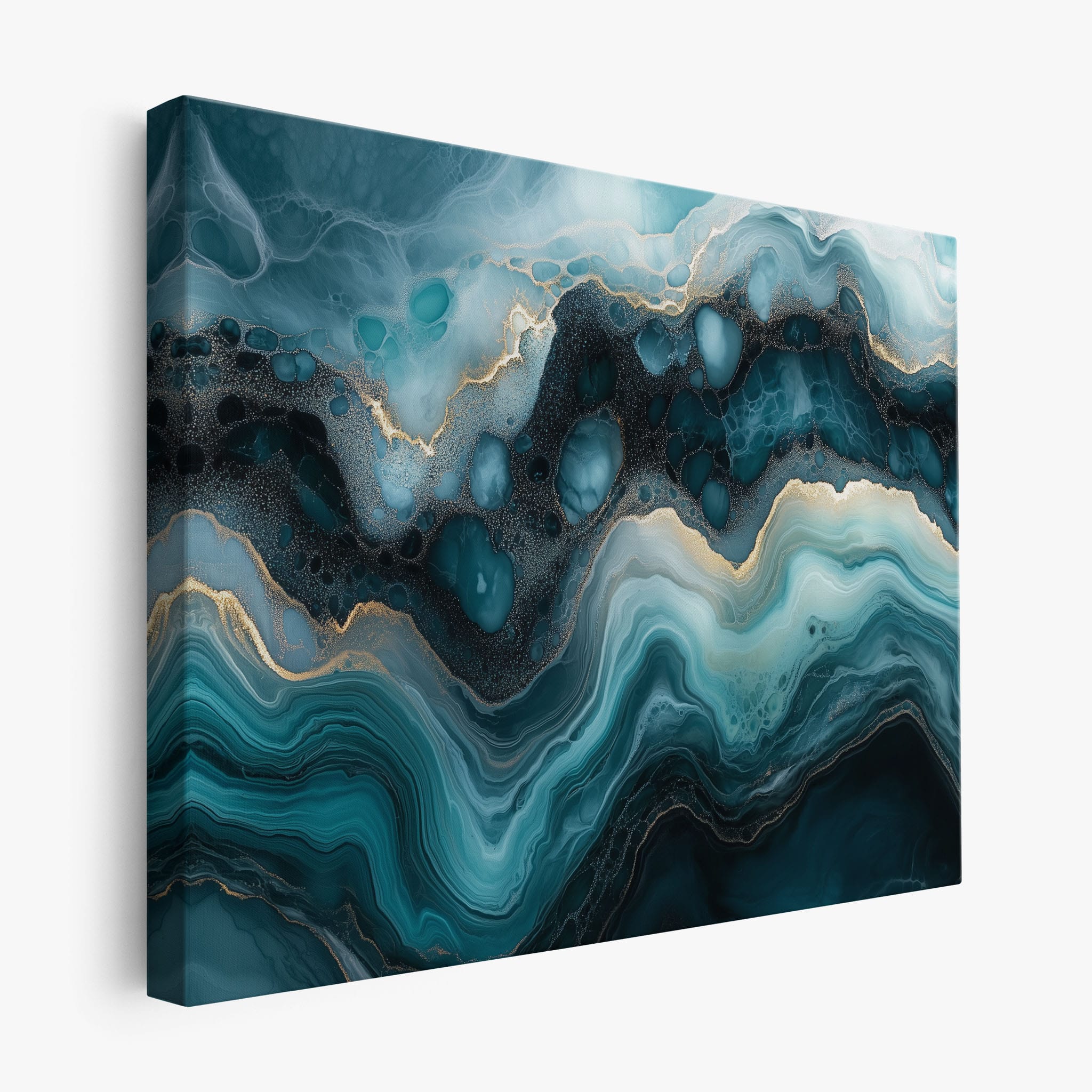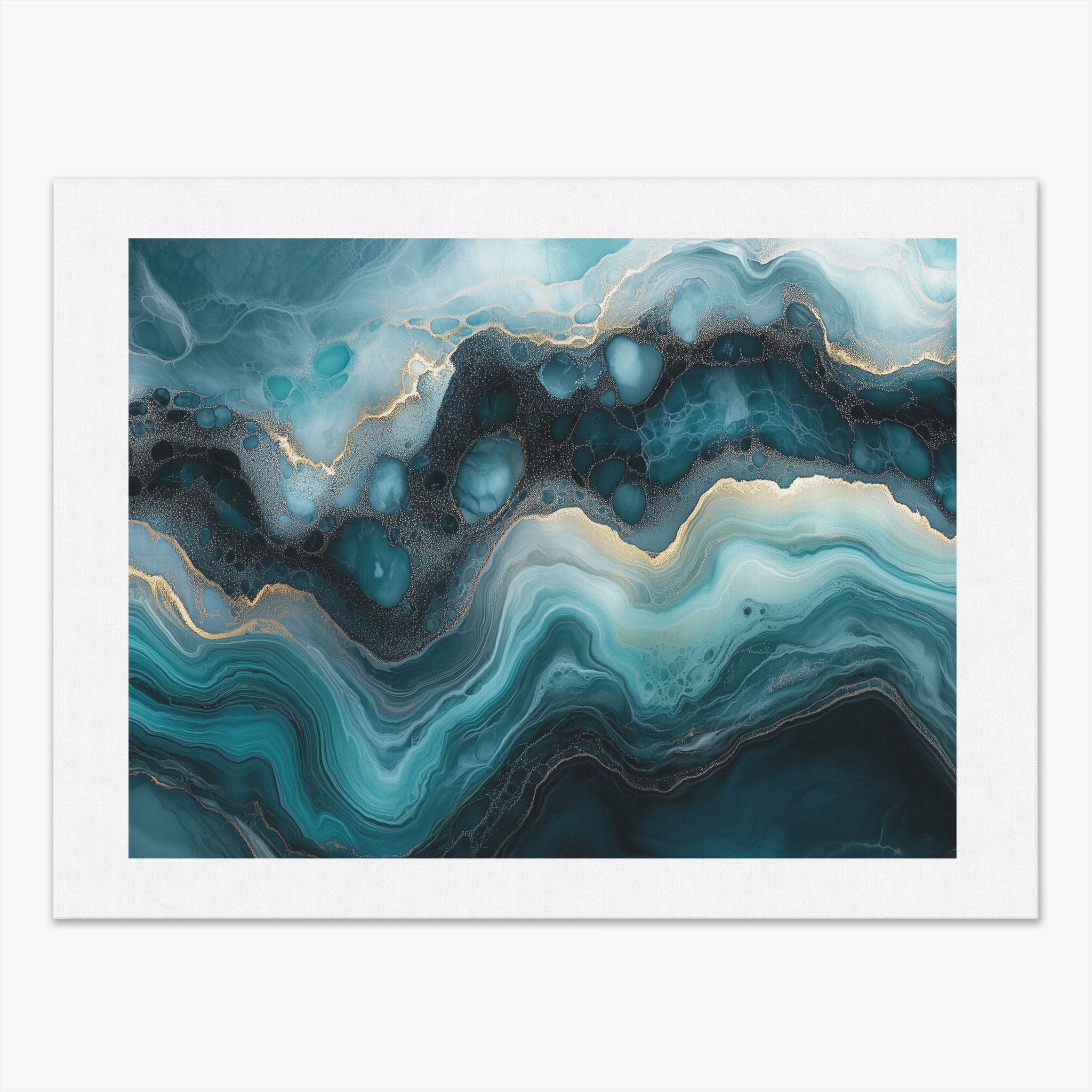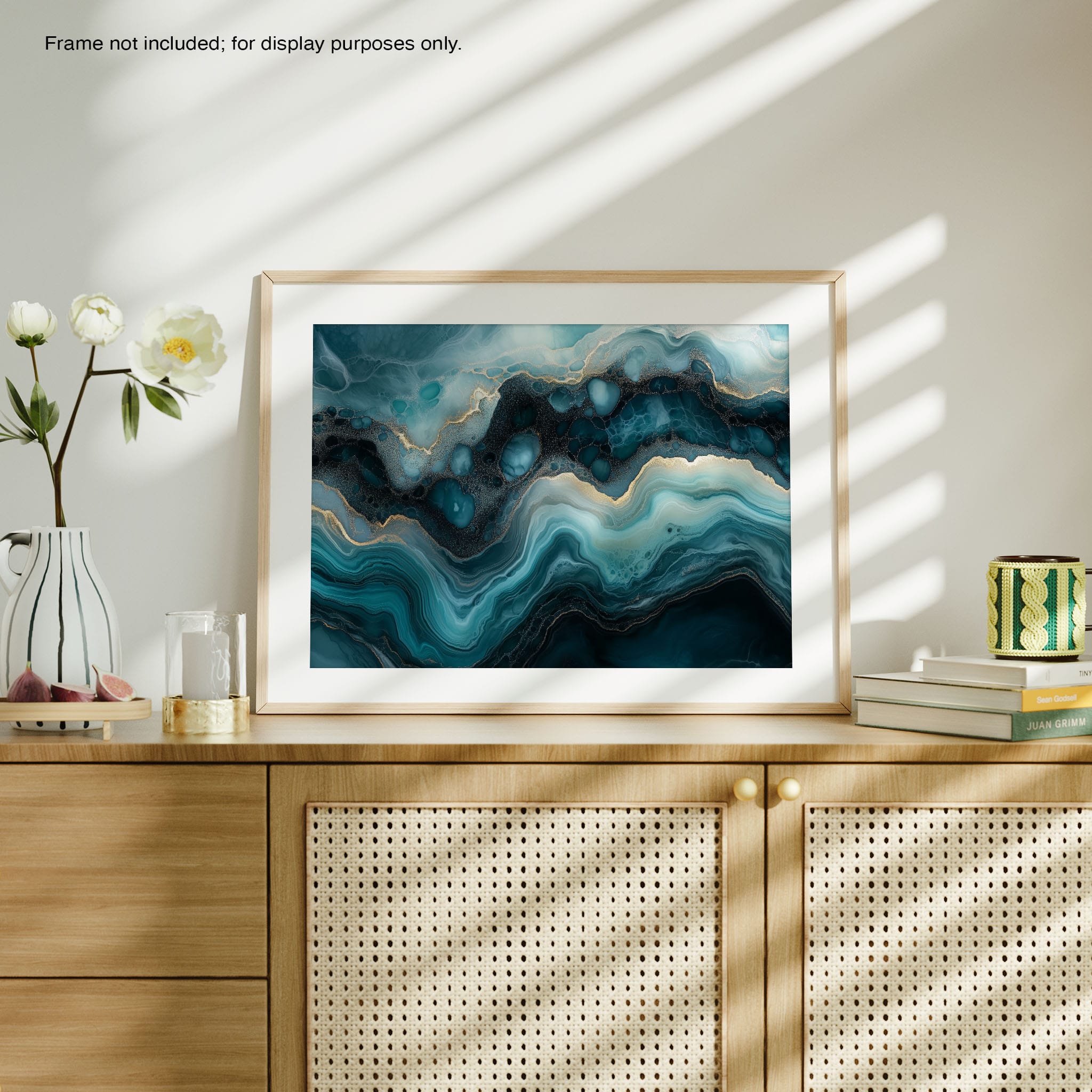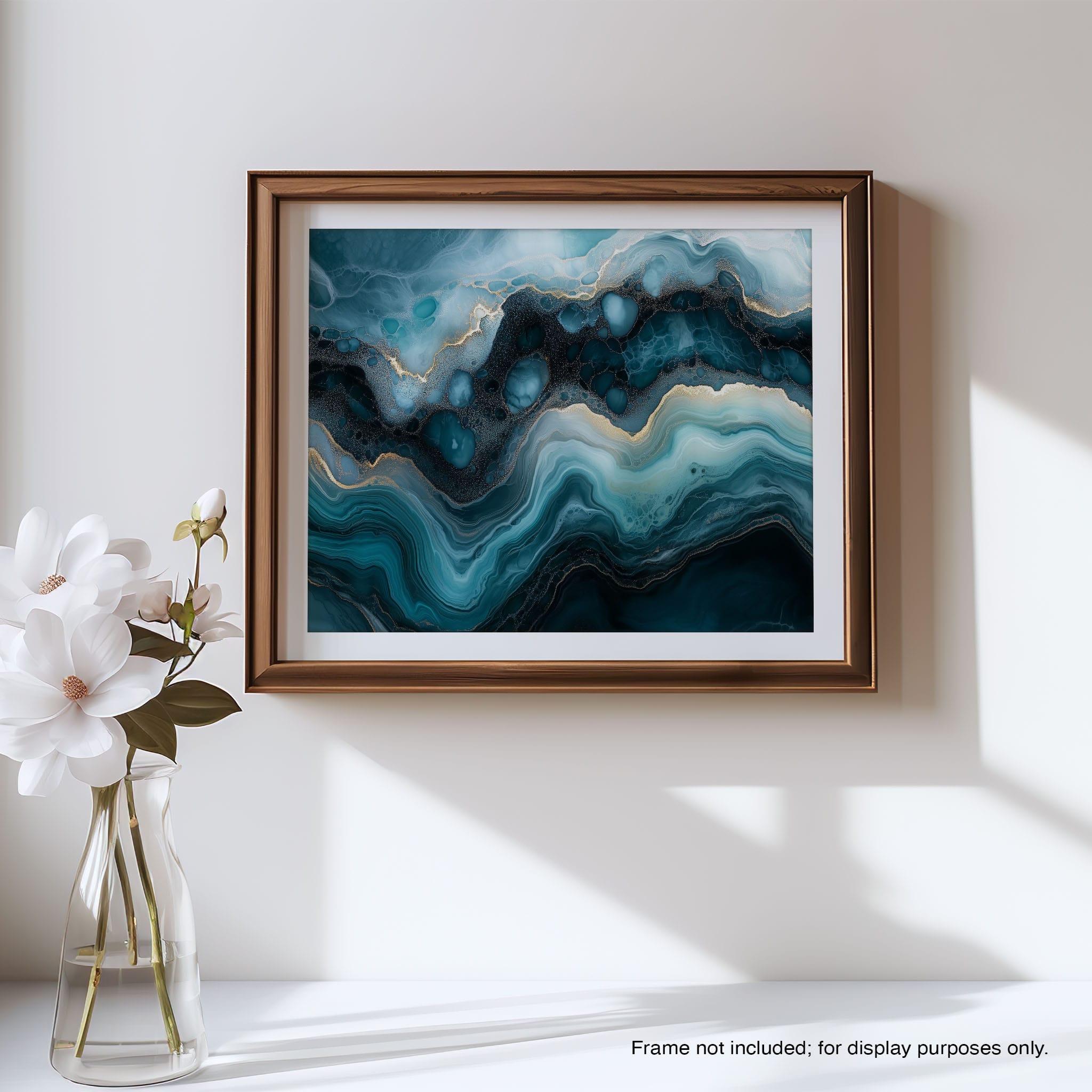This stunning digital illustration captivates viewers with its ethereal swirls of teal and mysterious black depths, highlighted by delicate veins of gold. The artwork's intricacies evoke the sensations of diving into an undiscovered ocean or investigating the marbling of precious minerals. The cool, soothing palette makes this piece a perfect accent for spaces seeking a touch of refined tranquility. Bold yet peaceful, this work invites an introspective exploration suitable for any modern decor. Transform your room with this striking portrayal of abstract surrealism.