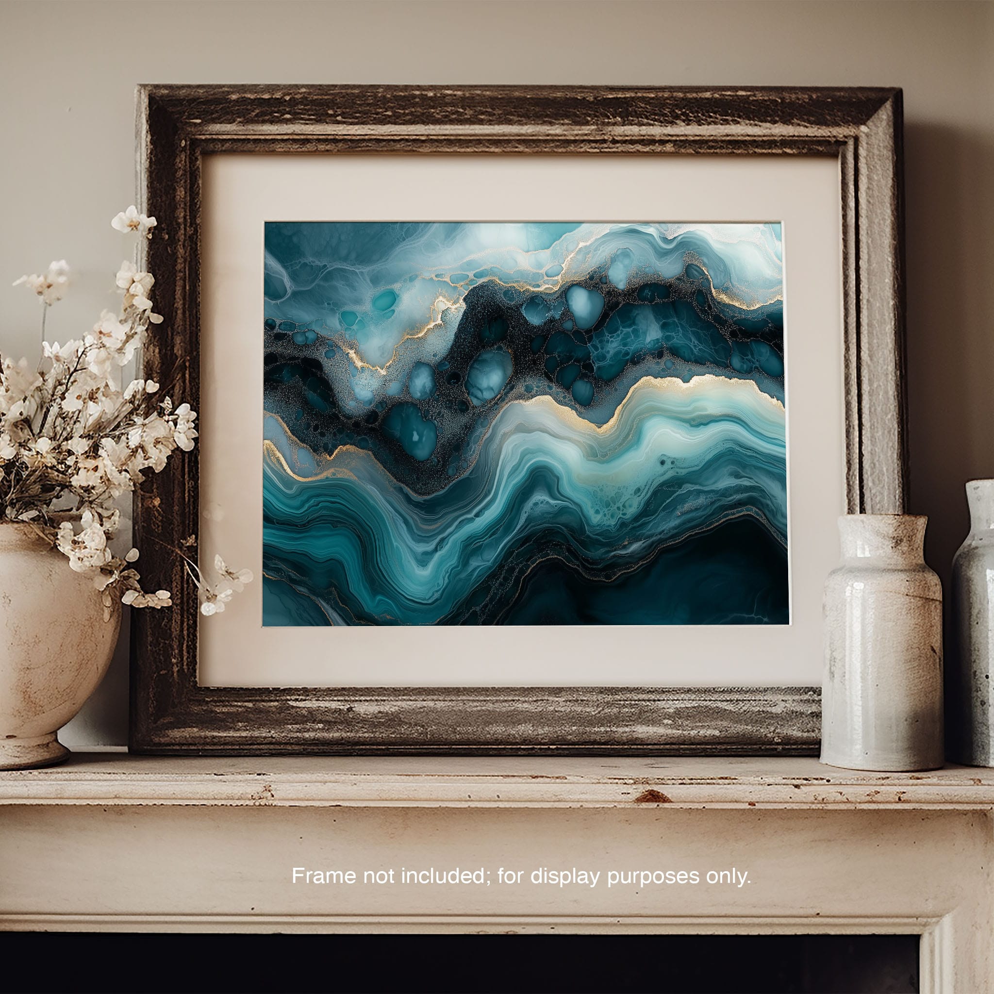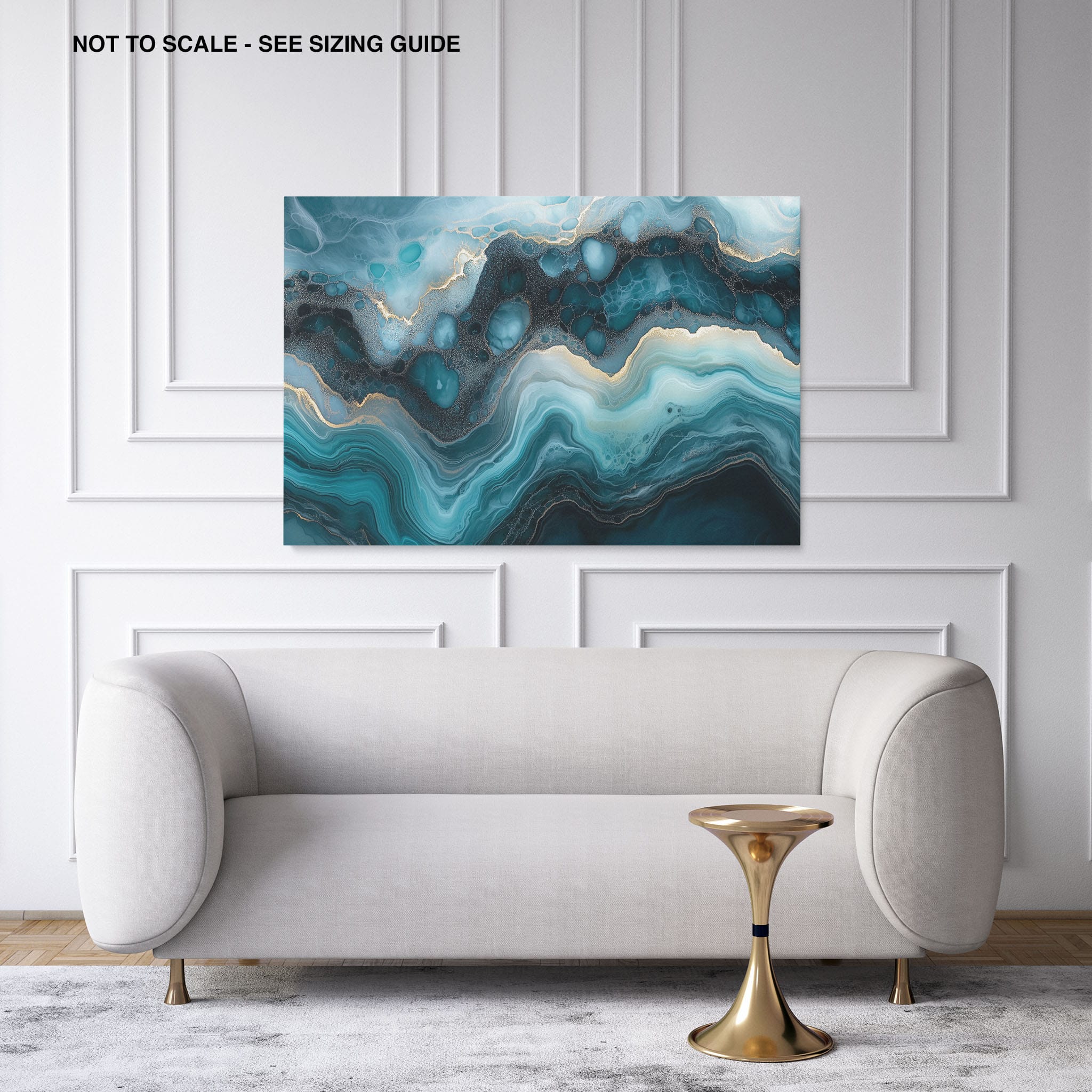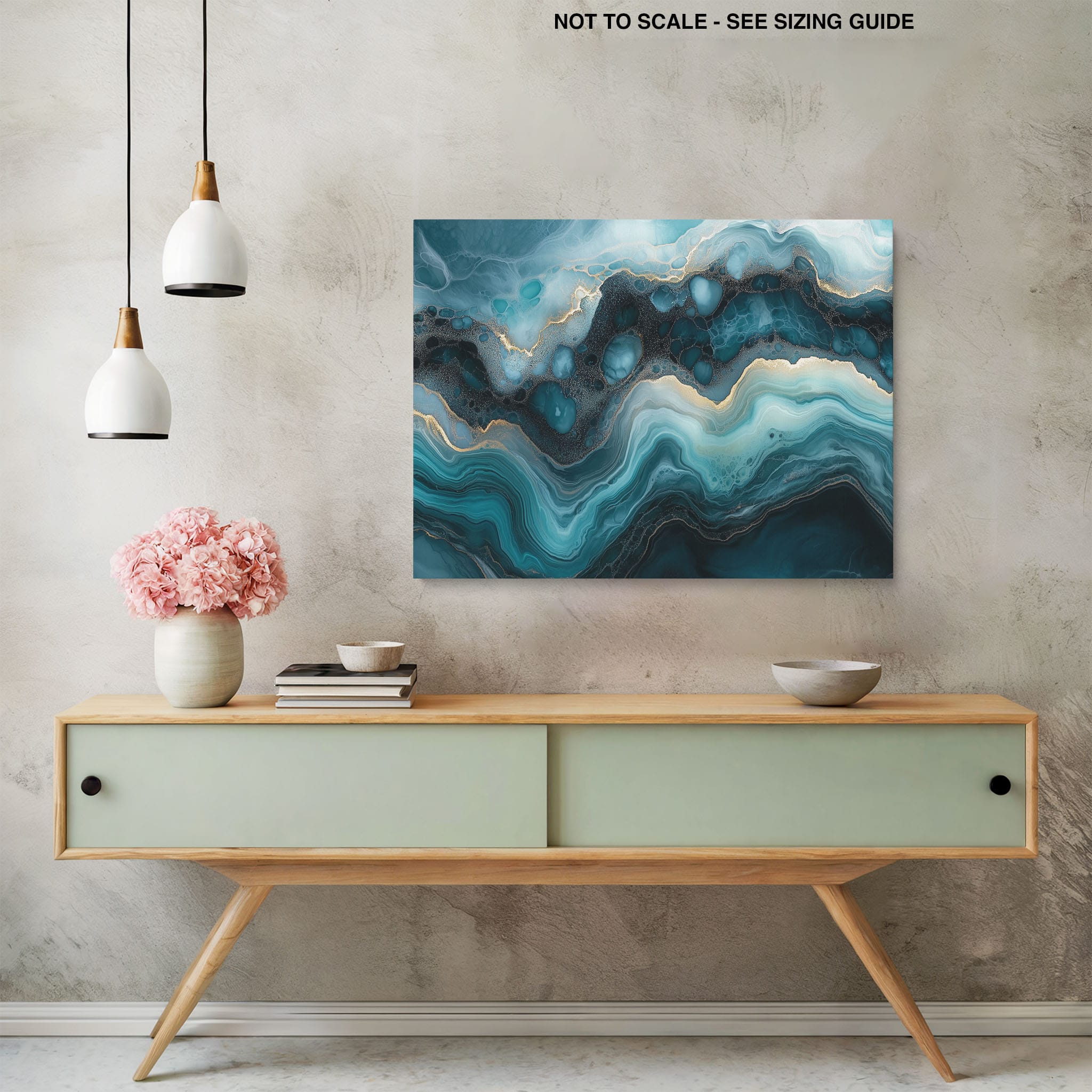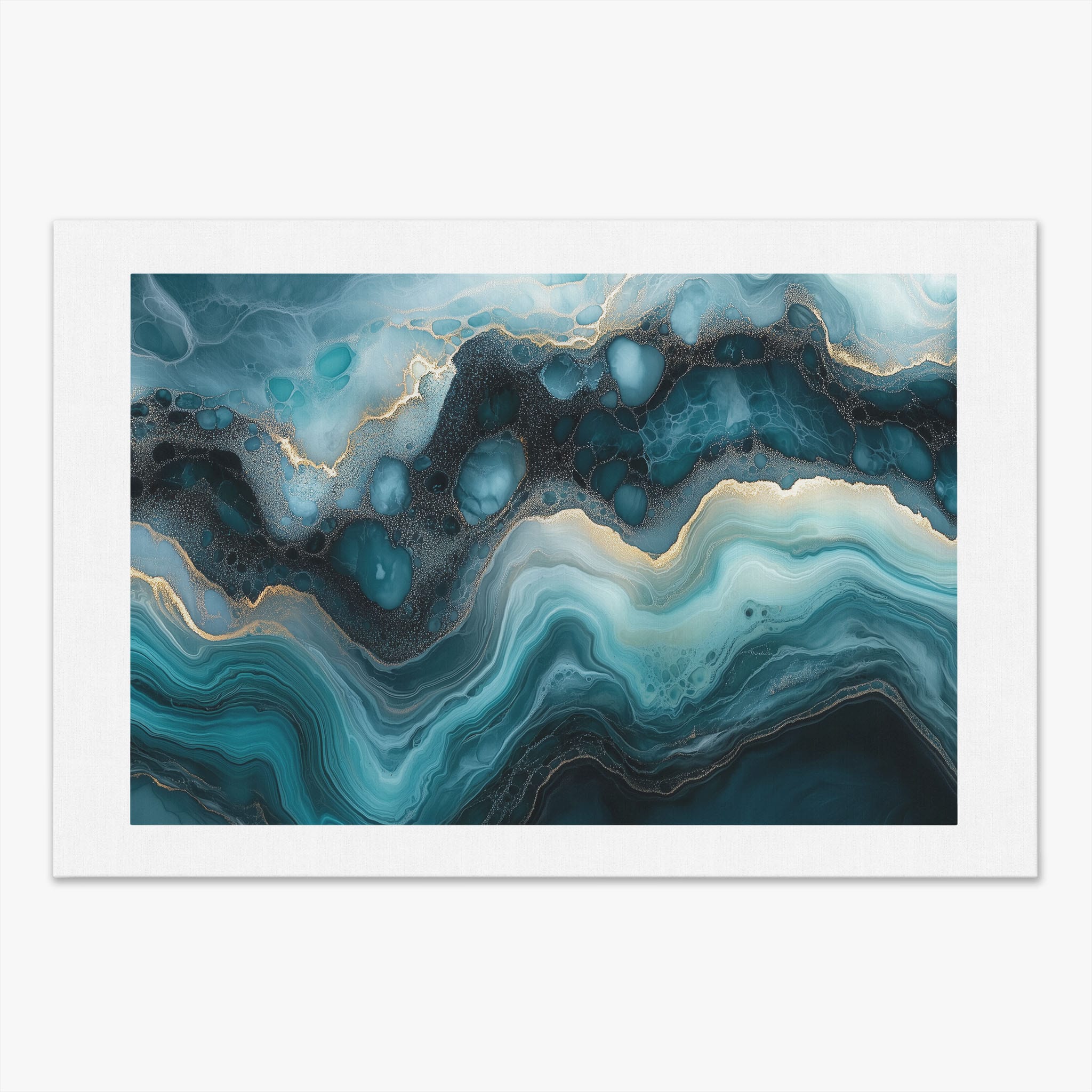 This stunning digital illustration captivates viewers with its ethereal swirls of teal and mysterious black depths, highlighted by delicate veins of gold. The artwork's intricacies evoke the sensations of diving into an undiscovered ocean or investigating the marbling of precious minerals. The cool, soothing palette makes this piece a perfect accent for spaces seeking a touch of refined tranquility. Bold yet peaceful, this work invites an introspective exploration suitable for any modern decor. Transform your room with this striking portrayal of abstract surrealism.