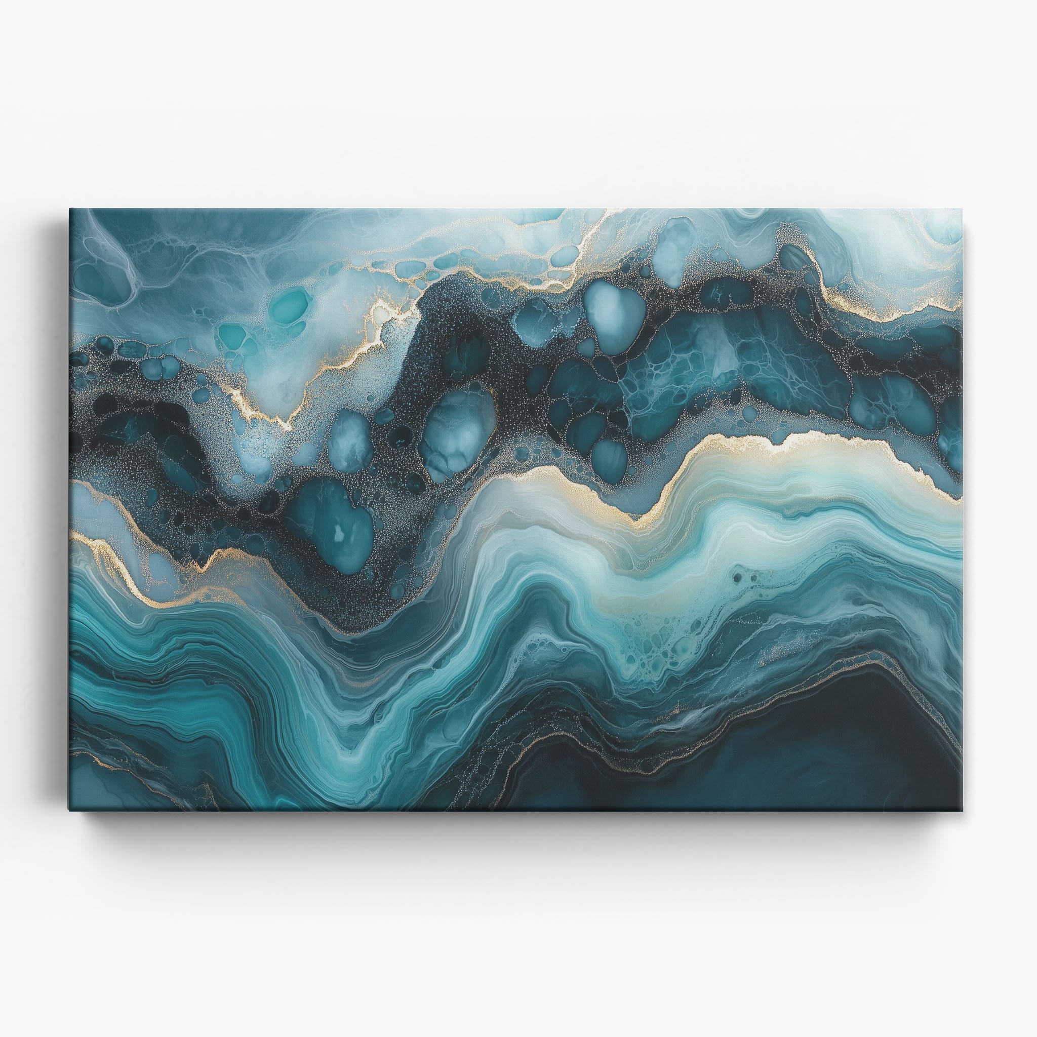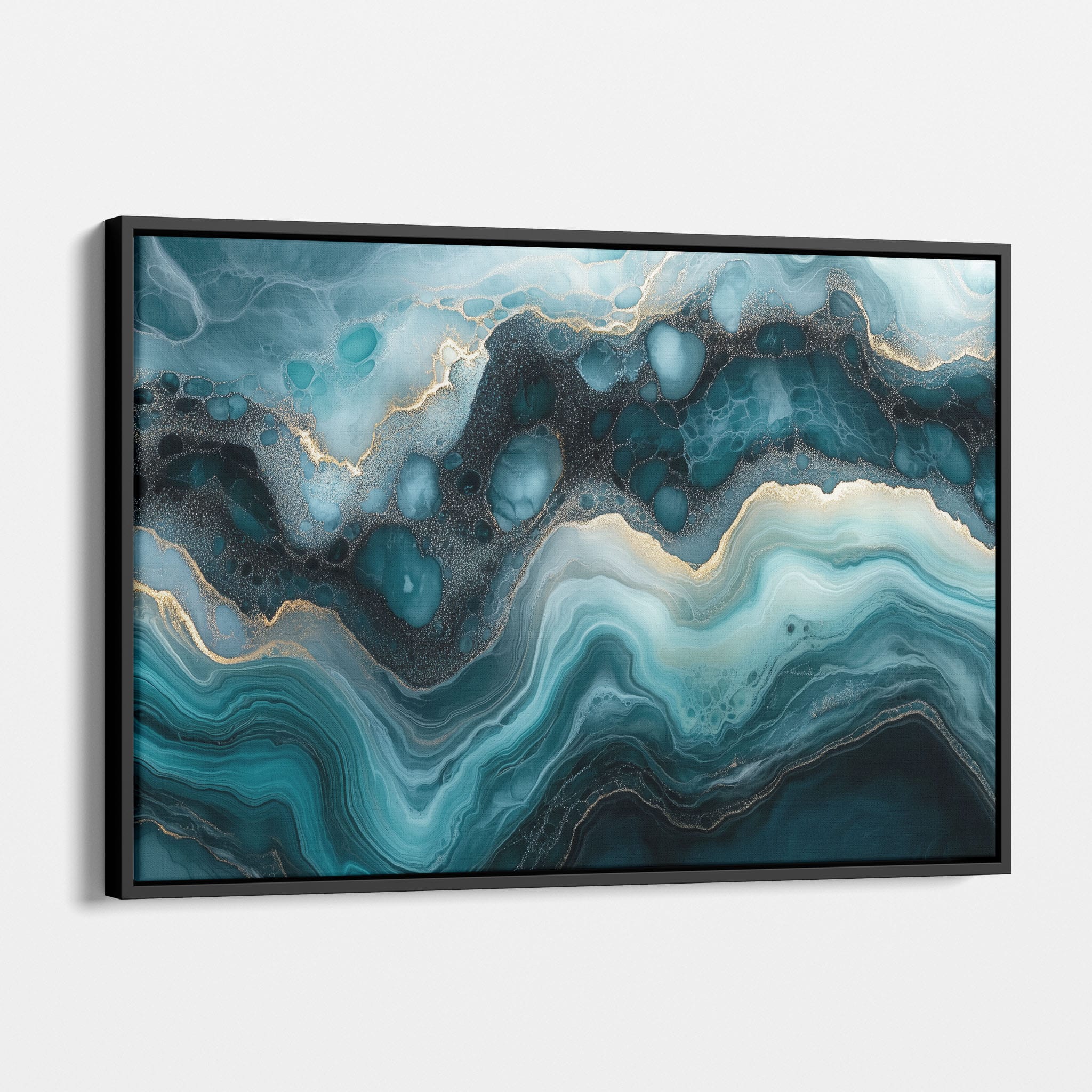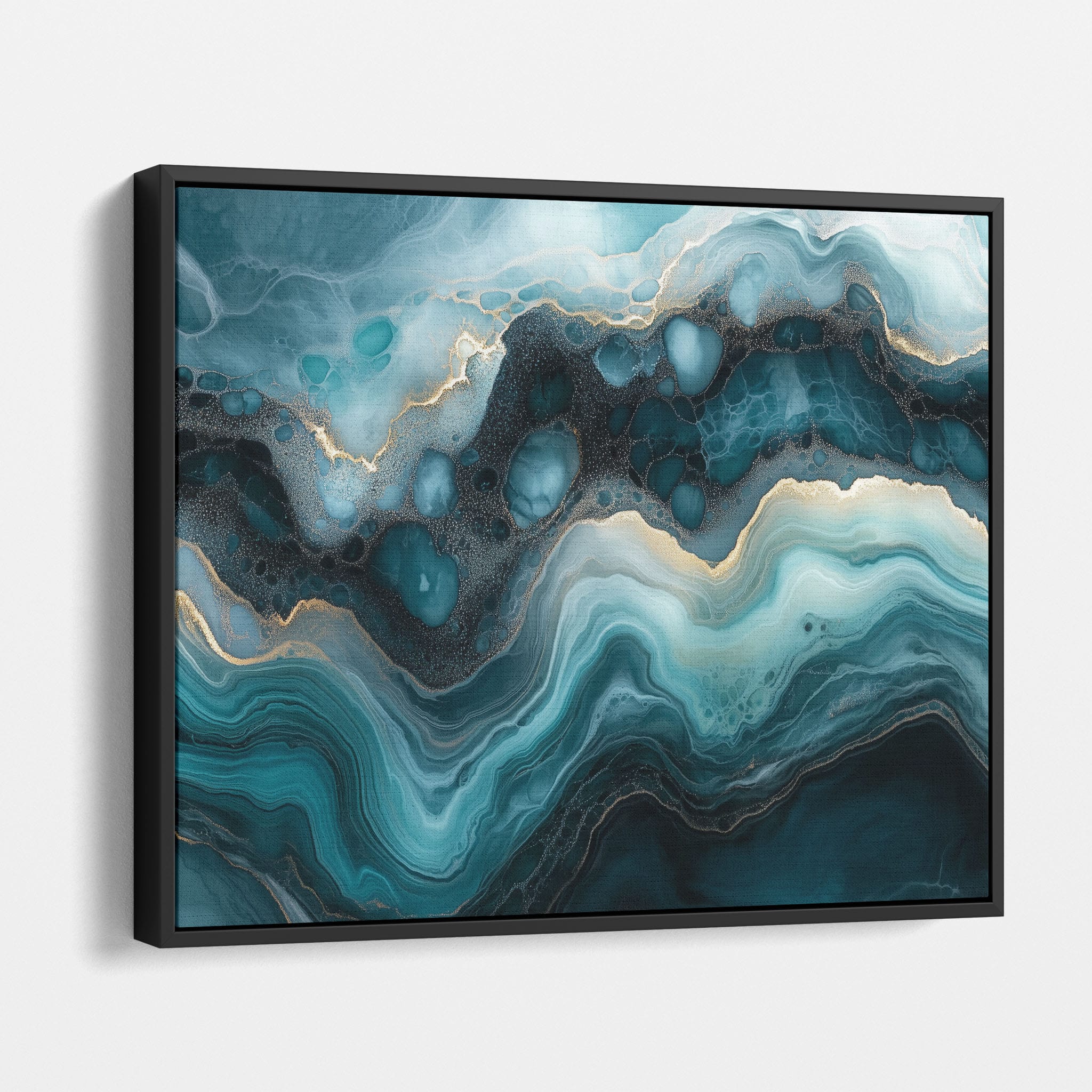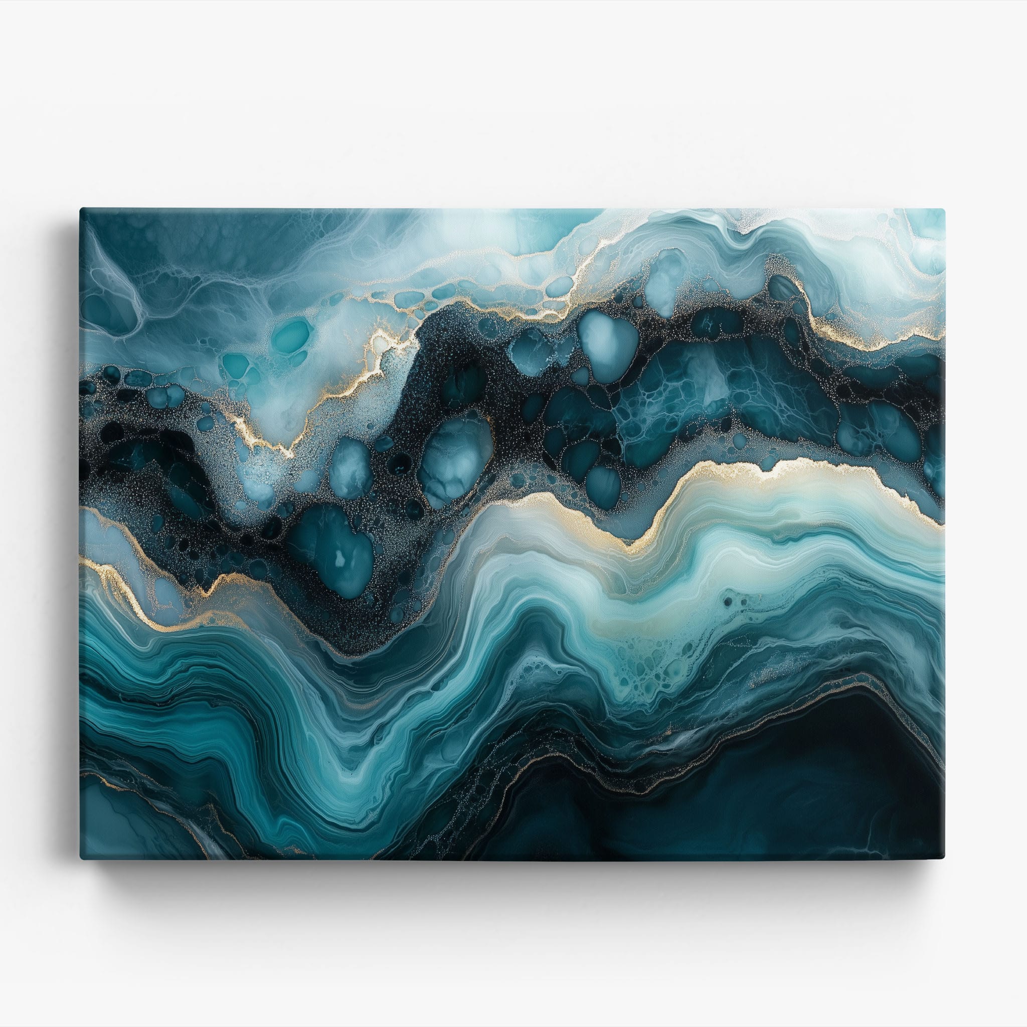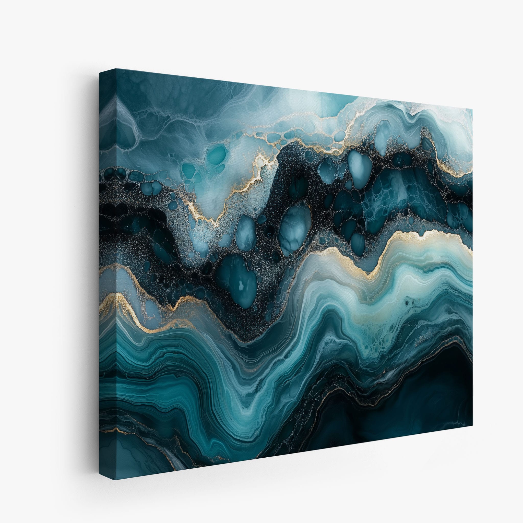 This stunning digital illustration captivates viewers with its ethereal swirls of teal and mysterious black depths, highlighted by delicate veins of gold. The artwork's intricacies evoke the sensations of diving into an undiscovered ocean or investigating the marbling of precious minerals. The cool, soothing palette makes this piece a perfect accent for spaces seeking a touch of refined tranquility. Bold yet peaceful, this work invites an introspective exploration suitable for any modern decor. Transform your room with this striking portrayal of abstract surrealism.