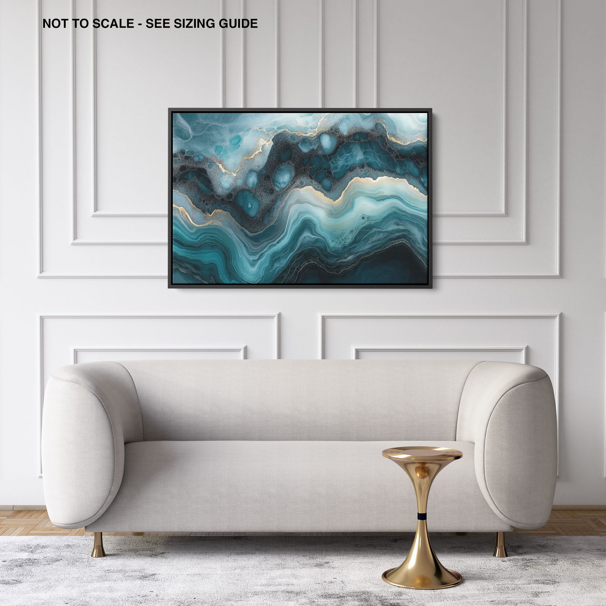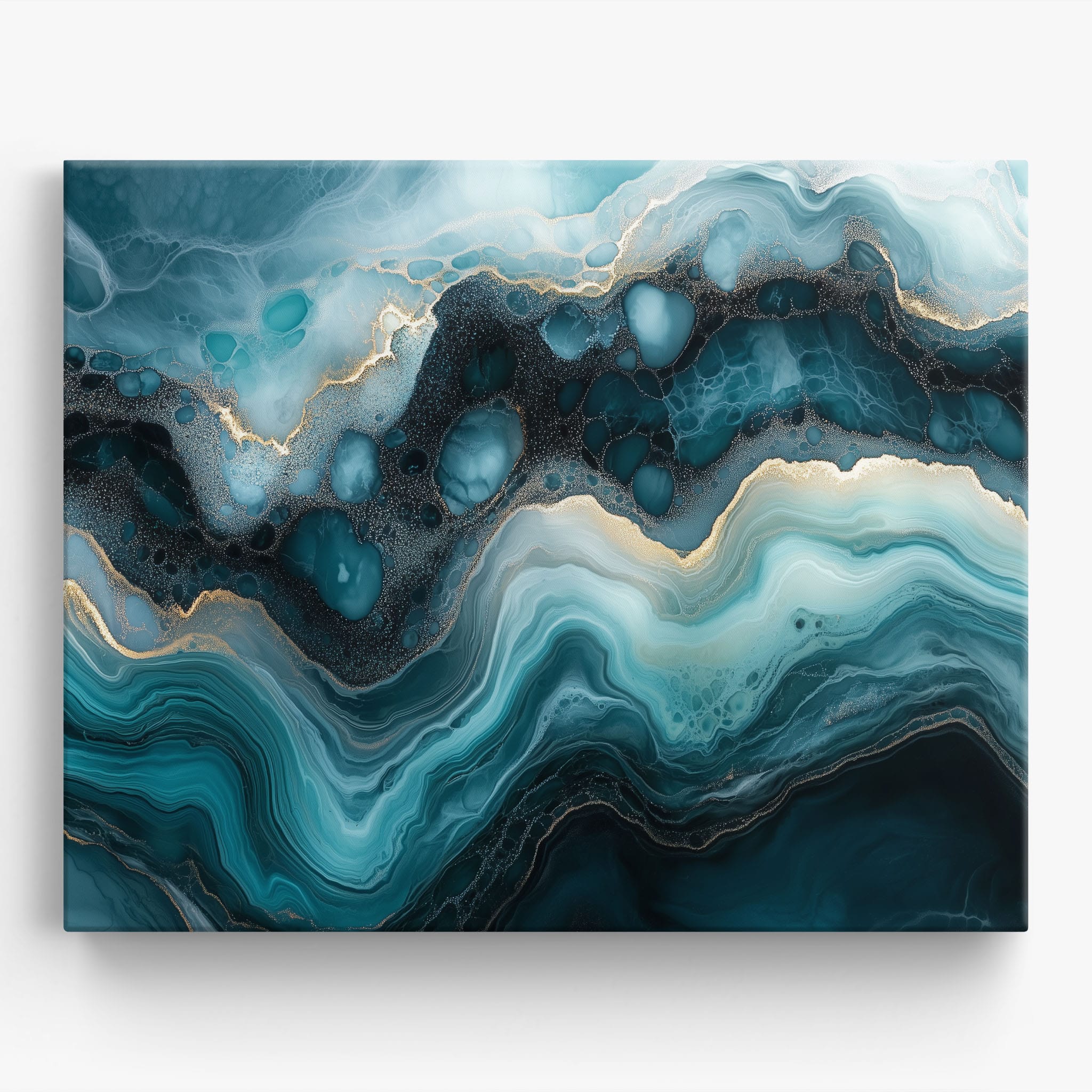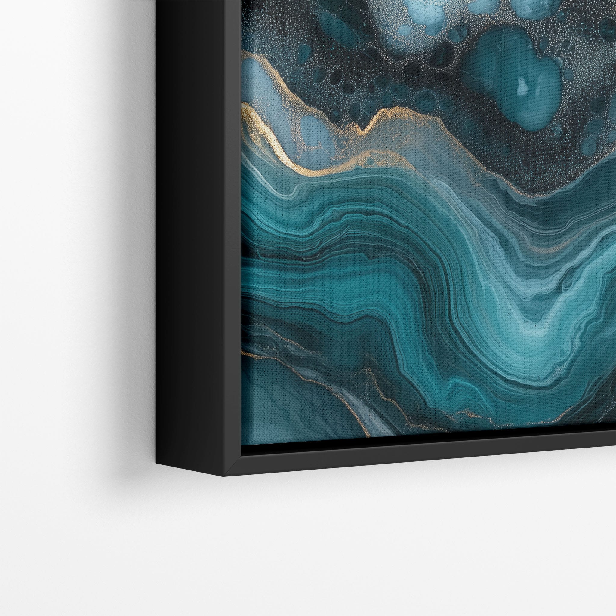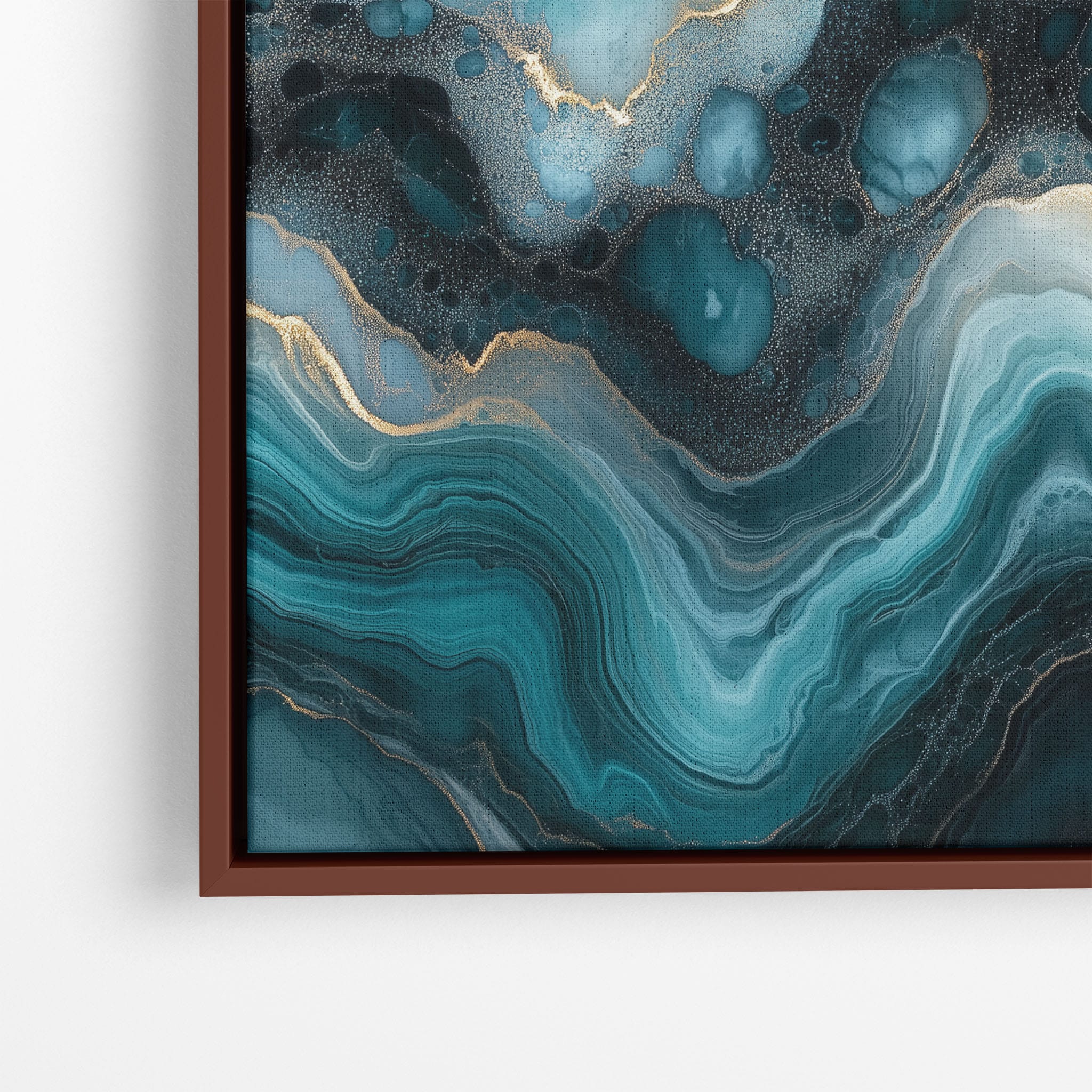 This stunning digital illustration captivates viewers with its ethereal swirls of teal and mysterious black depths, highlighted by delicate veins of gold. The artwork's intricacies evoke the sensations of diving into an undiscovered ocean or investigating the marbling of precious minerals. The cool, soothing palette makes this piece a perfect accent for spaces seeking a touch of refined tranquility. Bold yet peaceful, this work invites an introspective exploration suitable for any modern decor. Transform your room with this striking portrayal of abstract surrealism.