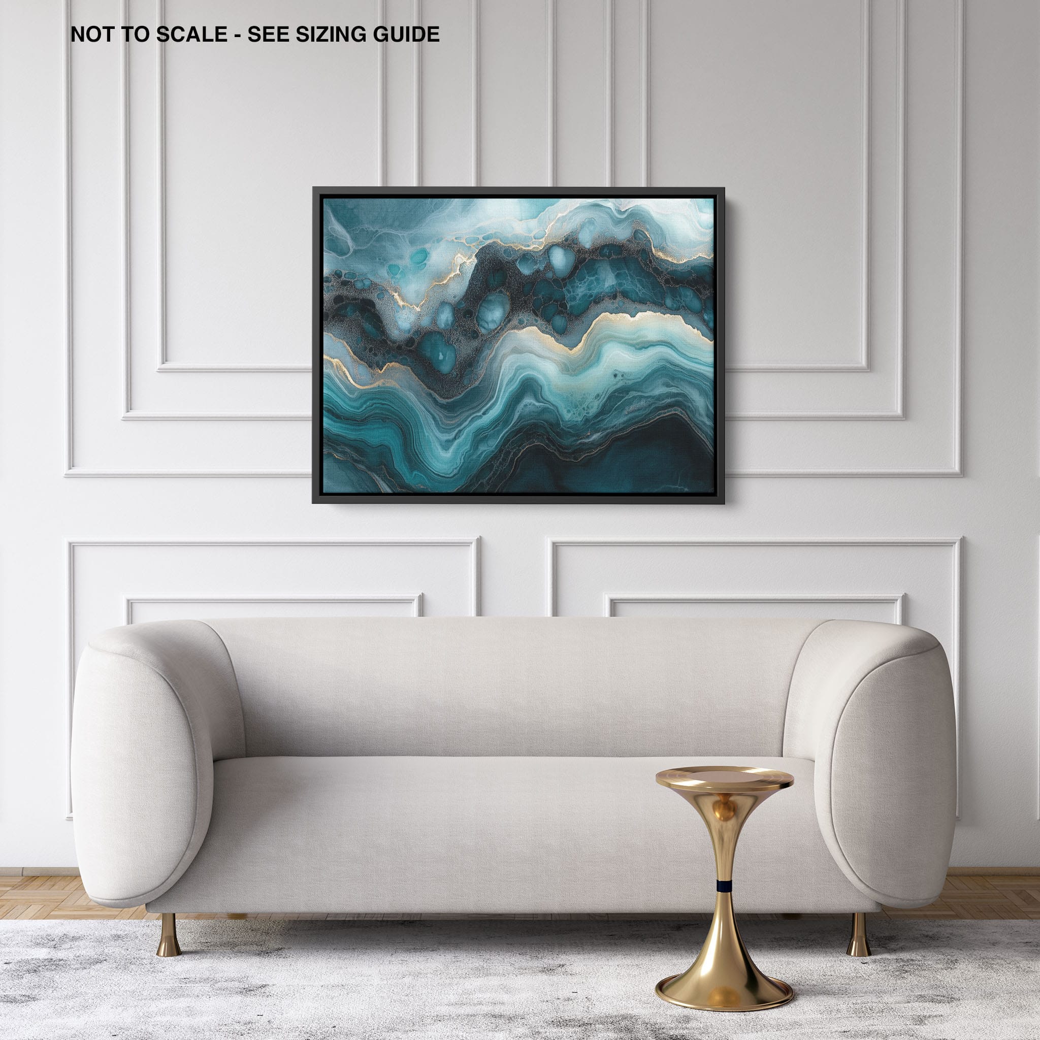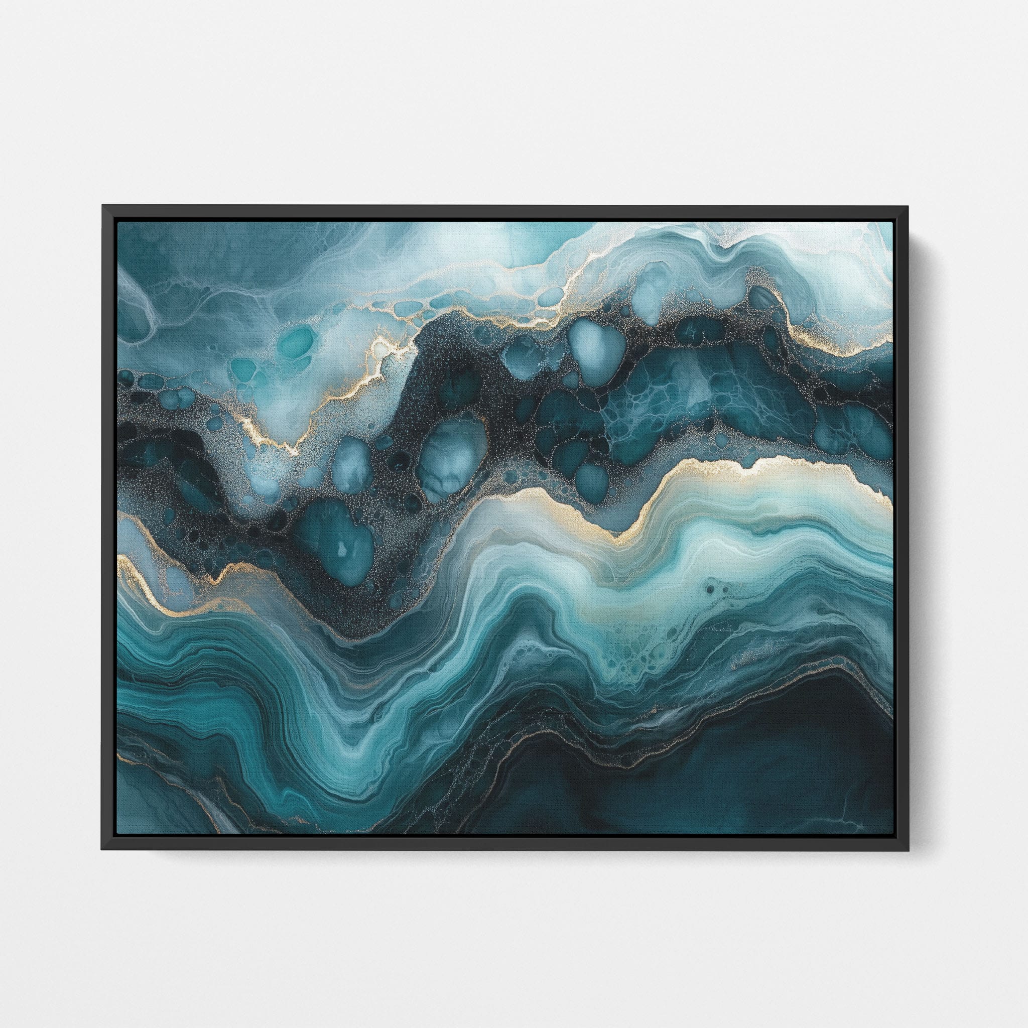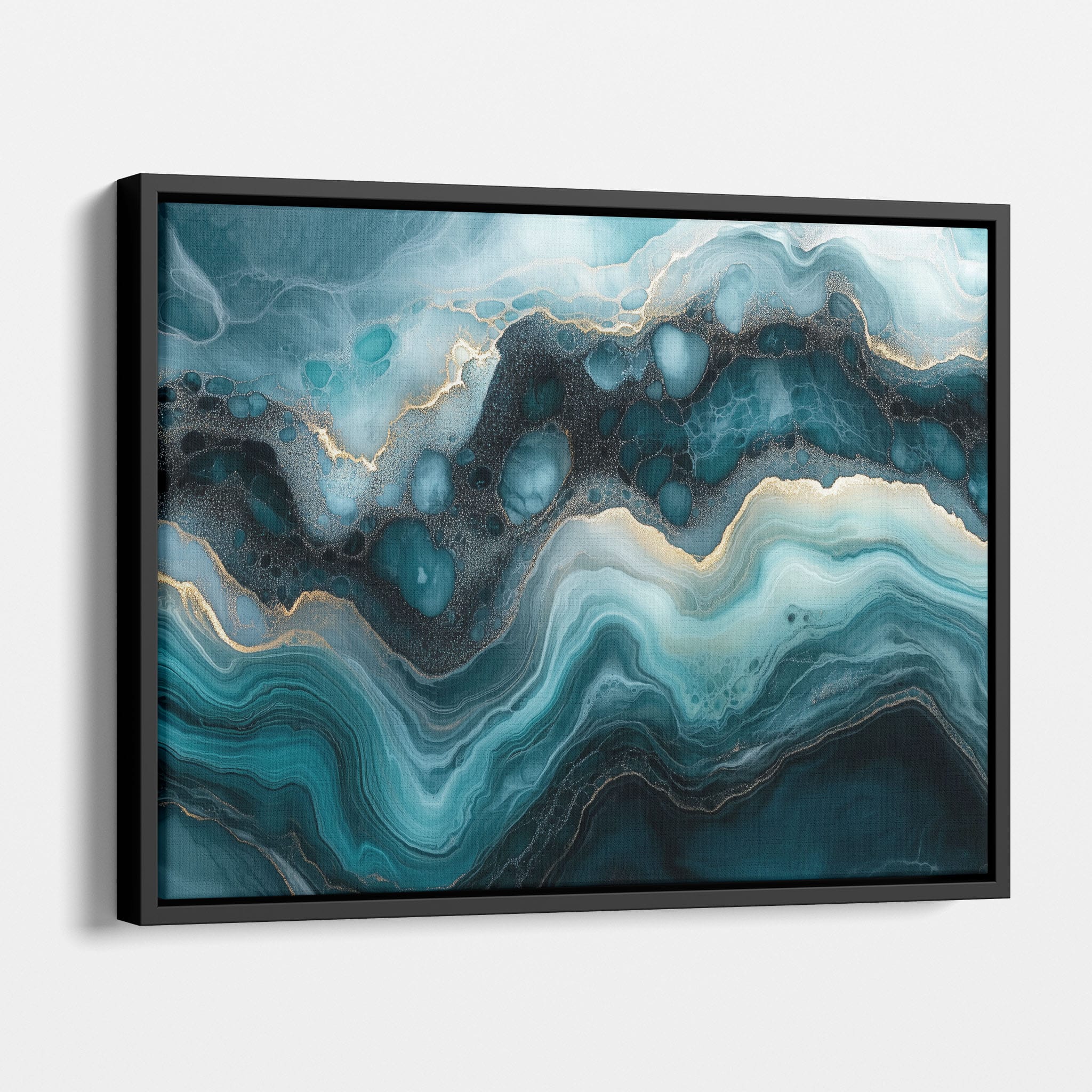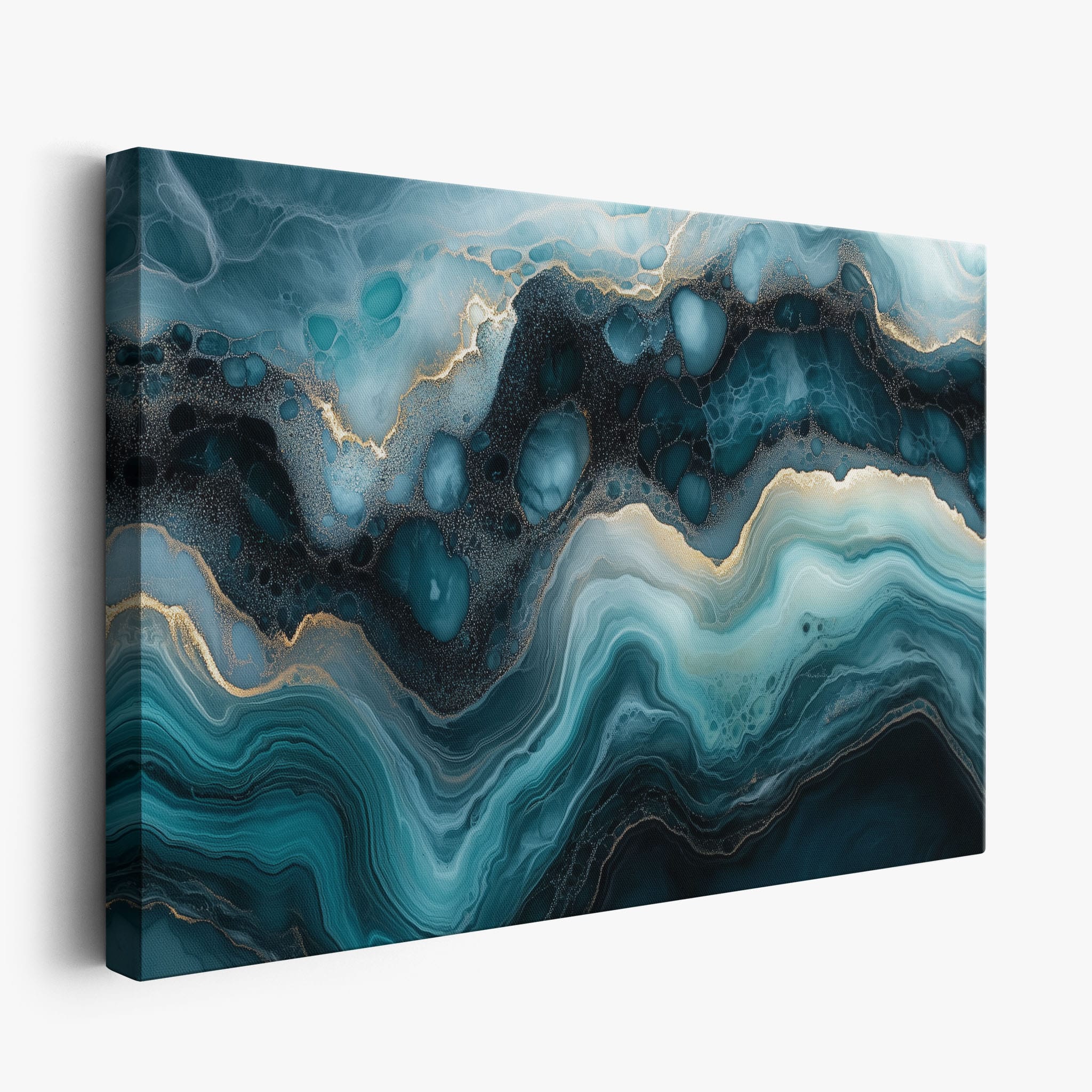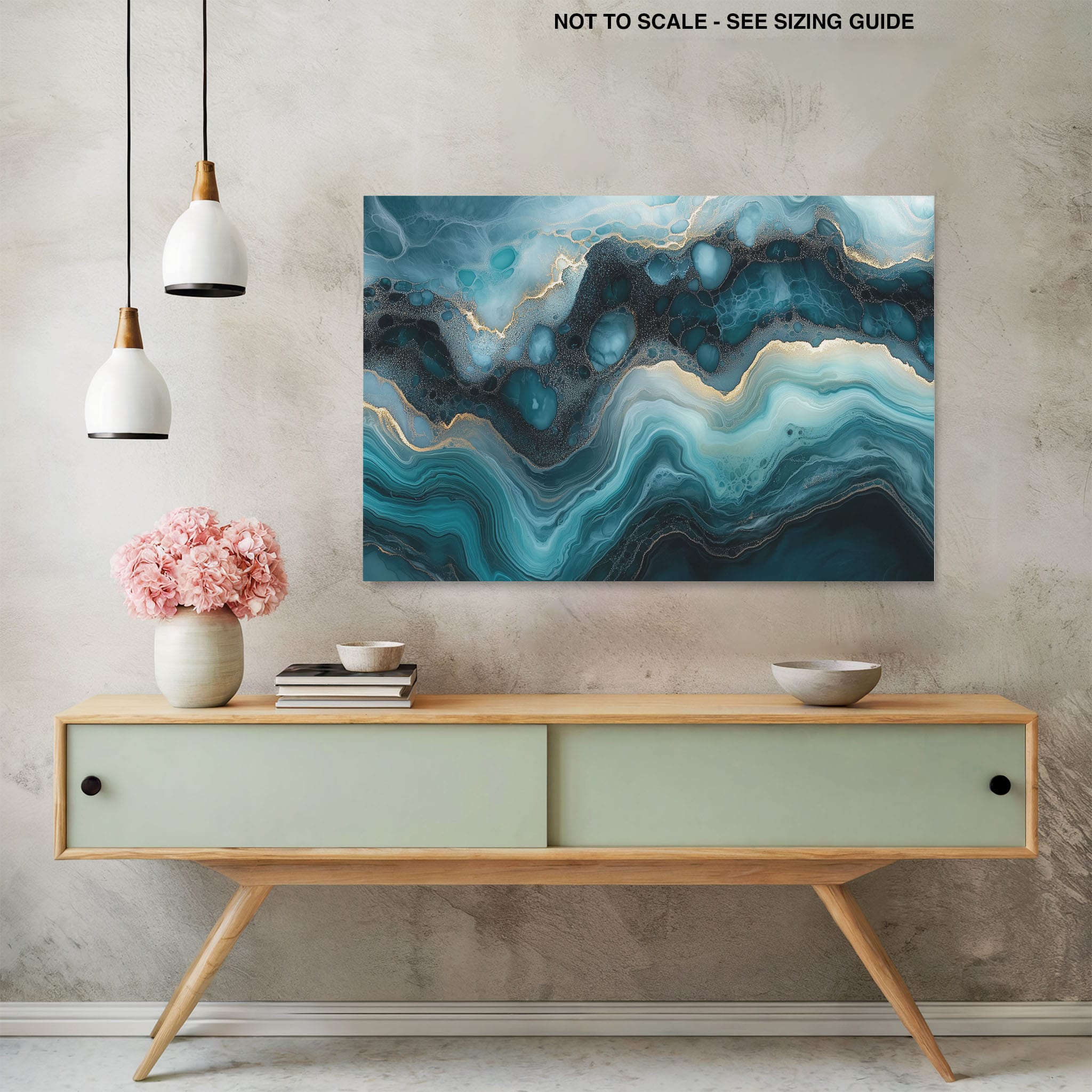 This stunning digital illustration captivates viewers with its ethereal swirls of teal and mysterious black depths, highlighted by delicate veins of gold. The artwork's intricacies evoke the sensations of diving into an undiscovered ocean or investigating the marbling of precious minerals. The cool, soothing palette makes this piece a perfect accent for spaces seeking a touch of refined tranquility. Bold yet peaceful, this work invites an introspective exploration suitable for any modern decor. Transform your room with this striking portrayal of abstract surrealism.