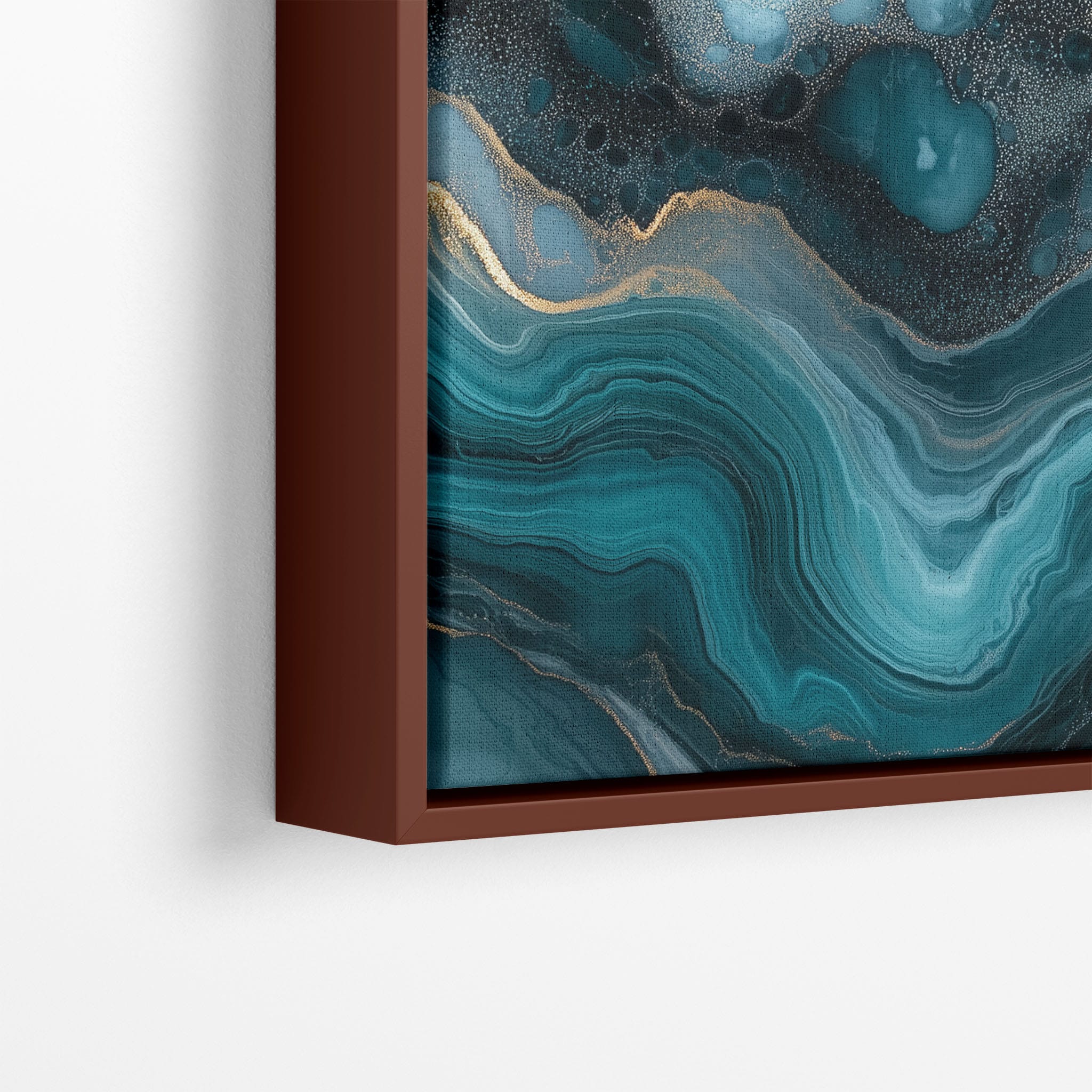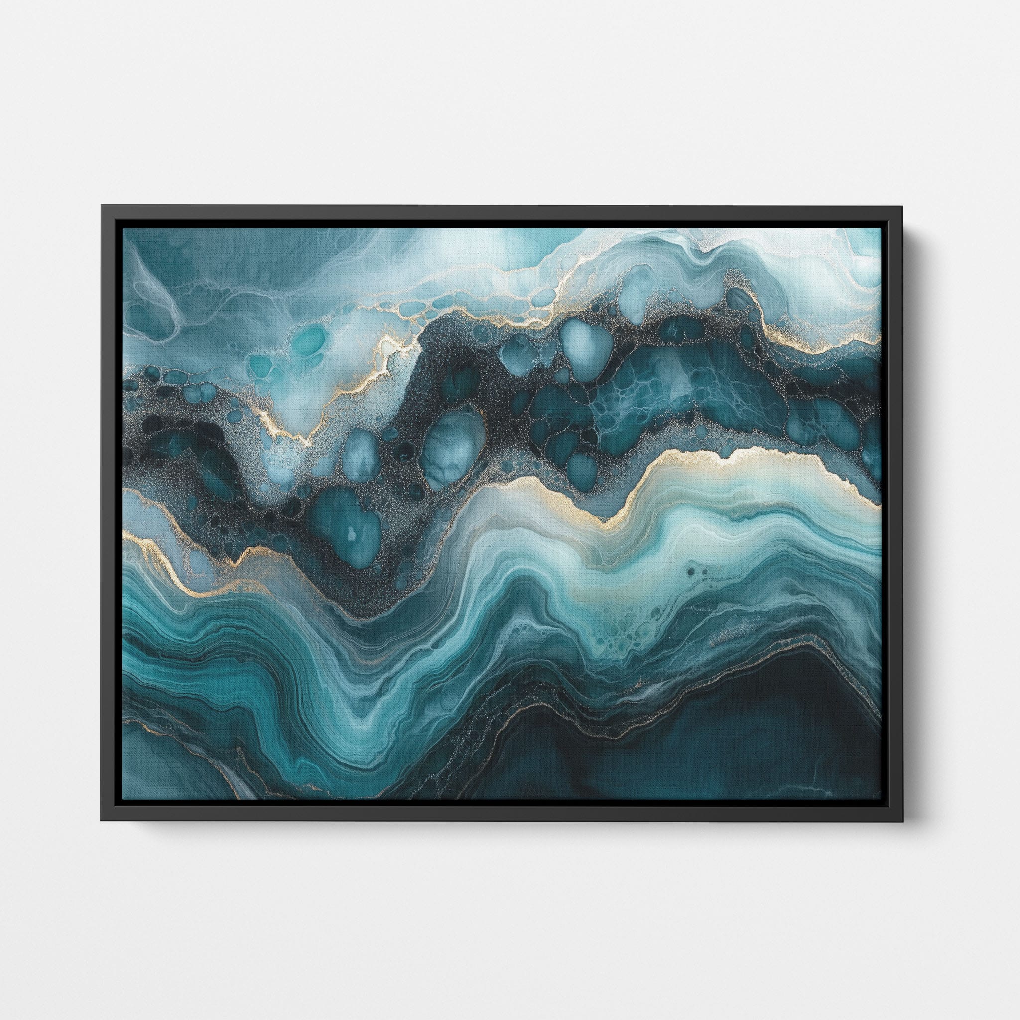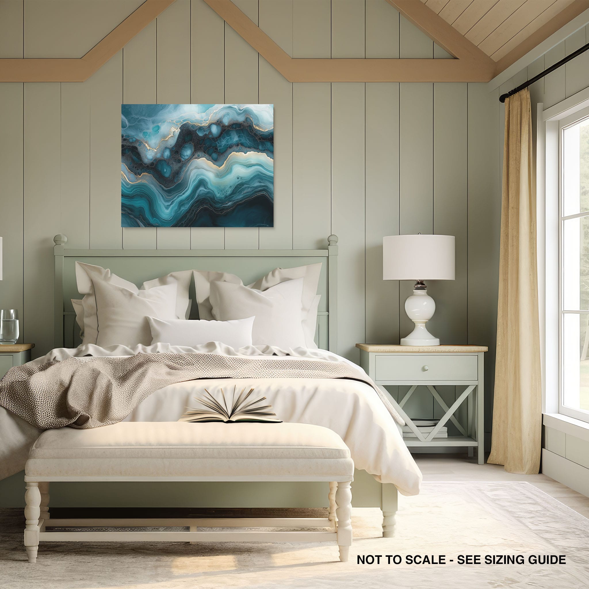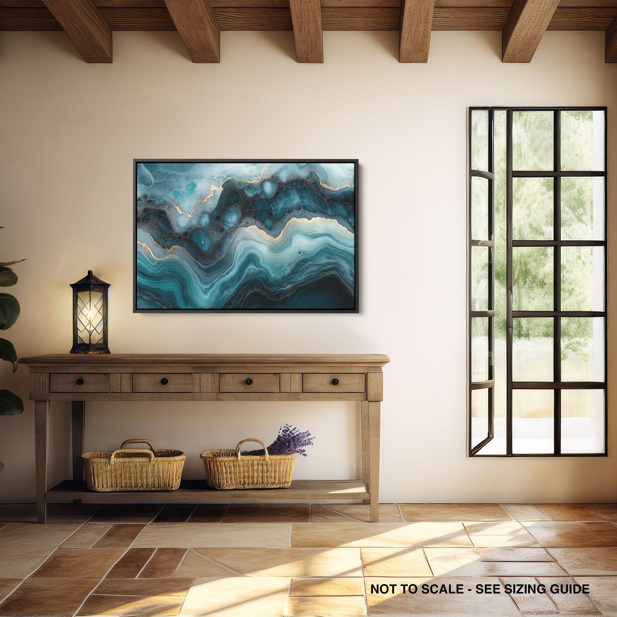 This stunning digital illustration captivates viewers with its ethereal swirls of teal and mysterious black depths, highlighted by delicate veins of gold. The artwork's intricacies evoke the sensations of diving into an undiscovered ocean or investigating the marbling of precious minerals. The cool, soothing palette makes this piece a perfect accent for spaces seeking a touch of refined tranquility. Bold yet peaceful, this work invites an introspective exploration suitable for any modern decor. Transform your room with this striking portrayal of abstract surrealism.
